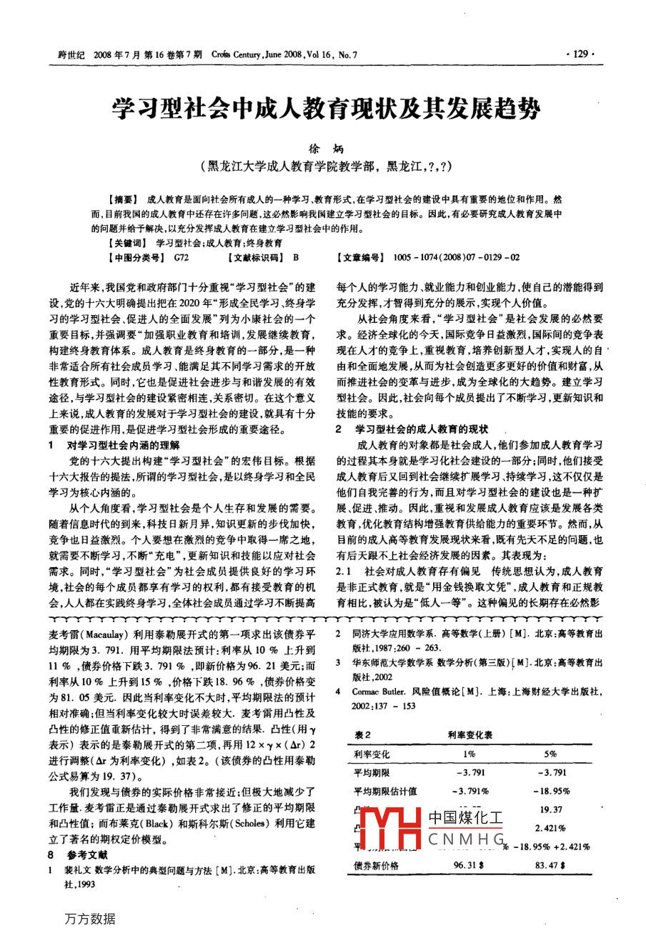 跨世紀(jì)2008年7月第16卷第7期 Cross Century,June2008,vol16,No.7127Taylor定理的應(yīng)用韋潔華(廣州南洋理工職業(yè)學(xué)院基礎(chǔ)部,廣西,貴港,510980)【摘要】本文通過實(shí)例介紹 Taylor定理在證明不等式、導(dǎo)數(shù)的中值估計(jì)行列式的計(jì)算、定積分的近似計(jì)算及定積分計(jì)算、關(guān)于界的估計(jì)、函數(shù)方程金融數(shù)學(xué)中的應(yīng)用?!娟P(guān)鍵詞】 Taylor定理;不等式;中值估計(jì);行列式;定積分;界;函數(shù)方程;AaR;債券中圖分類號】013【文獻(xiàn)標(biāo)識碼】B【文章編號】1005-1074(2008)06-0127-02Taylor定理:若∫"(x)在[a,b]上連續(xù)(x)在(a,b)x)2內(nèi)存在則Ⅴx,x∈[a,b],3在x與x之間,使得下式成立因此,fx)=f(x)+fx)++n/”()(x-)”+R(x),、(1) min ox,xe(0,),(x)=f(a)+f(a)f: (a)f(°(a)2!(x-a)2+A+證明原式等價(jià)于八(x)=mnx,nx-2>0,因(0)=f)(x-),=(0)=0(x)=sinx5mc2x-1)+ bsin xsec'r>0,根據(jù)行列式的性質(zhì),對于任何k∈N,有4=a(a-b),又故f(x)>0(當(dāng)x∈(0,0))原式獲證根據(jù)行列式求導(dǎo)法則,有fn(x)=mfn1(x),fn-(x)=(n-1)f2(x),A,2(x)=2f12導(dǎo)數(shù)的中值估計(jì)例2設(shè)f(x)二次可微,(0)=f(1)=0,maxf(x)(x),f1(x)=1,所以f(x)在x=a處的各階導(dǎo)數(shù)為f(a)=n(n-1)A(n2,試證mn(x)≤-16證明:因f(x)在[0,1]上連續(xù),有最大最小值,又因k+1)a(a-b)"k(k=1,2,A,n-1)f("(a)=n(nmaxf(x)=2,f(0)=f(1)=0,故最大值在(0,1)內(nèi)部達(dá)1)A2·1,從而到所以3x∈(0,1)使得fx)=a(a-b)“1+.(a-b)2(x-a)+D,1)a(af(x0)于是f(x)為極大值由 Fermat定理,有f(x)==0b叫("1)A2a(x-a)1+-1)21在x=x處按 Taylor公式展開,3v∈(0,1)使得:0=(0)=f(x)+()(0-x)2=2+f(x)x2若中國煤化工)b];0=(1)=(x)+1f(n)(1-x)2=2+fn)(1-若a≠CNMHG作者簡介:韋潔華(199~),女,廣西費(fèi)港市人,廣州南洋理工職業(yè)學(xué)院基礎(chǔ)部助教從事高等數(shù)學(xué)線性代數(shù)概率論等基礎(chǔ)課程的教學(xué)與研究。128跨世紀(jì)2009年7月第16卷第7期 Cross Century,June2008,vol16,No74定積分的近似計(jì)算及定積分計(jì)算式給出例4∫f(x+h)=ftx+h)此式兩端同時(shí)對h求導(dǎo),減去f1x),除以h,然后令h0取極解:原式=d=1(1-2+x2-A)d=1限即得(x)=0,(x)為二次函數(shù)7在金融數(shù)學(xué)中的應(yīng)用7.1在VaR計(jì)算中的應(yīng)用ⅤAR模型,自20世紀(jì)90年代被引人到風(fēng)險(xiǎn)管理中,已經(jīng)成例5求定積分bdx的近似值。為金融機(jī)構(gòu)和監(jiān)管當(dāng)局所廣泛采用的風(fēng)險(xiǎn)度量和管理工具。解:該被積函數(shù)的原函數(shù)不是初等函數(shù),故用牛頓一萊VaR模型的常見計(jì)算方法有參數(shù)法、歷史模擬法和蒙特卡羅布尼斂公式是無法求出其精確解的,考慮的泰勒展開,模擬法其中的參數(shù)法就是由資產(chǎn)價(jià)值函數(shù)的黍勒展開來計(jì)能方使的求出其近似數(shù)算,并且依據(jù)函數(shù)展開階數(shù)的不同,分為dela類方法和gamma類方法。考慮一個(gè)投資組合X=(x,x2,A,x)「其中X,isin( Axx21,2,A,n表示第i種資產(chǎn)的投資權(quán)重,t時(shí)刻所有資產(chǎn)的價(jià)7!3!5值向量V=(v1,2,A,,),組合X的價(jià)值為v=∑x,在下sin( ex一個(gè)時(shí)段內(nèi),組合價(jià)值變動(dòng)為4=△,假設(shè)每種所以資產(chǎn)價(jià)值都由K個(gè)市場因子確定,且這K個(gè)市場因子服從聯(lián)合正態(tài)分布,F=G1J2,Af),則AV按照一階泰勒展開得in( ex△=∑x洲(F,)、m(F,)因?yàn)?2(1,故;=d由此得出dla參數(shù)法;若將投資組合的價(jià)值變動(dòng)函數(shù)按照二階泰勒公式展開,則得 gamma參數(shù)法。9461,誤差R<1!;<0.5×10-37.2在債券定價(jià)中的應(yīng)用在債券的定價(jià)及投資組合風(fēng)險(xiǎn)值的計(jì)算中,平均期限是一個(gè)重要的概念,它衡量基礎(chǔ)產(chǎn)品價(jià)5關(guān)于界的估計(jì)格相對于基礎(chǔ)利率變化的幅度。一個(gè)20年期的債券也許只例6設(shè)f(x)在[0,1上有二階導(dǎo)數(shù),0≤x≤1時(shí)有17年的平均期限.這意味著,如果利率上升2%,該債券f(x)|k≤1,|f(x)|<2試證:當(dāng)0≤x≤1時(shí),|f(x)|≤3價(jià)格將下跌34%;而利率下跌1%時(shí),債券價(jià)格則上升17證明:1)=f(x)+(x)(1-x)+f)(1-x)2%,若每次用vaR模型來進(jìn)行計(jì)算,工作是十分煩瑣的.舉例來說現(xiàn)有一個(gè)5年期的票面金額為100美元的債券,年利f(0)=f(x)+f(x)(-x)+f(n)(-x)息為10美元計(jì)算當(dāng)利率從10%變化到11%或15%時(shí),債券的價(jià)格變化.如下表所以(1)-f0)=f(x)+(x)+)(t)(1-x)2-f(n)表1債券的價(jià)格變化x)≤|f(1)|+o)+31()(1-x)2+10%11%15%利息(s)10毒108紙n)kx2≤2+(1-x)2+x2≤2+1=31086函數(shù)方程中的應(yīng)用期限(t)5Sy例7設(shè)f(x)在(-∞,+∞)內(nèi)有連續(xù)三階導(dǎo)數(shù),且滿足方貼現(xiàn)因子Dn(0.62090.59880.4972f(x+h)=f(x)+hf(x+h),0<0<1(6和h無關(guān)).(1)試證:f(x)是一次或二次函數(shù)年金因子(-m3.7913.64733.3520證問題在于證明:f1x)=0或fTx)=0.為此將(1)式對h求導(dǎo)注意θ和h無關(guān),我們有零息票部分6209:59.88849.72f(x+h)=f(x+h)+h1x+h)(2)年金(-D)x)3791836.4733.528從而x+b)-(x)-(x+h)=6f(x+助h).令h→0取極中國煤化工9.36883248限,得;f(x)-6f1x)=f(x),f1x)=2ef1x)aYHCNMHG若6≠,由此知fx)=0,f(x)為一次函數(shù);若0=,(2)跨世紀(jì)2008年7月第16卷第7期 Crois Century,June2008,vol16,N.7129學(xué)習(xí)型社會中成人教育現(xiàn)狀及其發(fā)展趨勢徐炳(黑龍江大學(xué)成人教育學(xué)院教學(xué)部,黑龍江,?,?)【摘要】成人教育是面向社會所有成人的一種學(xué)習(xí)教育形式,在學(xu