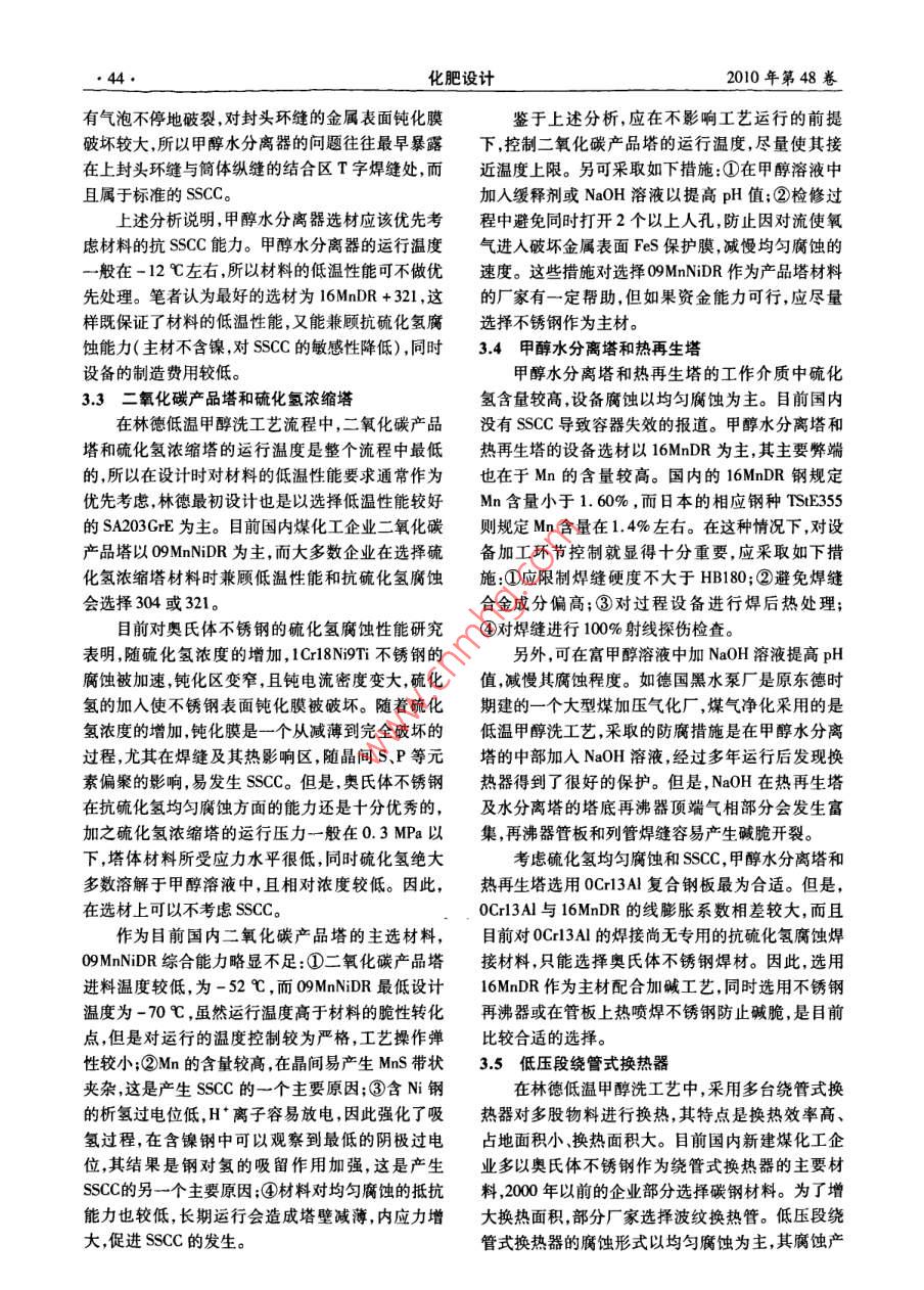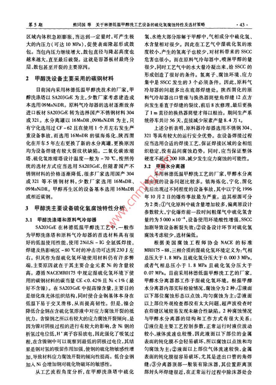 et.2010化肥設計第48卷第5期Chemical Fertilizer Design2010年10月關亍林德低溫甲醵洗工藝設備的硫化氨腐蝕特性及材策略熊同國,孫愷(神華包頭煤化工分公司,內蒙古包頭014010)摘要:介紹了硫化氬腐蝕機理;著重分析了林德低溫甲醇洗工藝中的甲醇洗滌塔等主要設備的硫化氫腐蝕特性;探討了應對硫化腐蝕的設備選材策略;提出了控制硫化氫腐蝕的工藝操作方案。關鍵詞:堿化氫;低溫甲醇洗設備;腐蝕;材料;SSCC(硫化物應力腐蝕開裂);分析中圖分類號:TQ546.5文獻標識碼:A文章編號:1004-8901(2010)05-0042-04Concerning H, S Corrosion Feature and Material Selection Strategy for Linde LowTemperature Methanol WashXIONG Tong-guo, SUN KaiShenhua Baotou Coal Chemical EngineeringSub-company, Baotou Inter-Mongolia 014110 China)Abstract: Author has introduced the H,S corrosion mechanism; has mainly analyzed the H, S corrosion characteristic of main equipment, such asmethanol scrubber etc, in Linde low temperature methanol wash process; has discussed the strategy of equipment material selection facing H,S corrosionhas presented the process operation scheme for controlling H,S corosion.Key words: hydrogen sulphide(H,S); low temperature methanol was equipment; corrosion; material; sece( sulphide stres corrosion crack1硫化氫腐蝕機理低溫甲醇洗系統(tǒng)最易腐蝕的部位,往往是有酸性氣通過的換熱器處。腐蝕的出現,主要是由于生H2S的分子量為34.08,密度為1539mg/m3,成羰基鐵特別是Fe(CO)5和含硫的羰基鐵,后者是一種無色、有臭雞蛋味的、易燃、易爆、有毒和腐是生成Fe(CO)過程中的中間產物。H2的存在會蝕性的酸性氣體。H2S在水中的溶解度很大水溶明顯地促進CO與Fe的反應。羰基鐵的生成對生液具有弱酸性。H1S在水的作用下電解電化學腐產十分不利,一方面造成了設備的腐蝕縮短了設蝕過程如下。備的使用年限和存在泄漏的危險性;另一方面,羰基產物在甲醇熱再生時出現分解,分解出包括單質陽極反應產物:Fe2++S2-→FeS硫硫化鐵等的固態(tài)沉淀,這些沉淀將引起設備及陰極:2H+2e→→H+H+2H→H2↑管線的堵塞。設備所用碳鋼在這種環(huán)境中,不僅會H得到電子以成為氫原子易在合金鋼中產生由于陽極反應而發(fā)生一般腐蝕,而且由于S在金屬氫脆降低合金鋼的強度,同時氫原子易在金屬材表面的吸附,對氫原子復合氫分子有阻礙作用從料有缺陷處產生聚集,使材料內應力增大,從而產而促進氫原子往金屬內滲透。氫的原子半徑很小,生氫制裂紋。濕H2S環(huán)境中腐蝕產生的氫原子滲能沿板材金屬的晶格間斷向壁內擴散。由于鋼材人鋼的內部固溶于晶格中,使鋼的脆性增加,在外軋制過程中,存在組織不均勻性和夾雜物,當擴散加拉應力或殘余應力作用下形成的開裂叫做硫化的氫原子遇到非金屬夾雜物或氣孔裂紋分層、晶物應力腐蝕開裂。工程上有時也把受拉應力的鋼格空隙等處時,隨著氫的持續(xù)擴散氫原子在此處及合金在濕H2S及其它硫化物腐蝕環(huán)境中產生的聚集成氫分子。隨著上述過程不斷進行在很小的脆性開裂統(tǒng)稱為 SSCC(硫化物應力腐蝕開裂)。通常發(fā)生在中高強度鋼中或焊縫及其熱影響區(qū)等硬者簡介:熊同國(1967年-),男湖南湘陰人,1989年畢業(yè)于北度較高的區(qū)域京化工大學化工機械專業(yè),工程師,從事化工設備生產技術管理作第5期熊同國等關于林德低溫甲醇洗工藝設備的硫化氫腐蝕特性及選材策略43區(qū)域內體積急劇膨脹,當達到一定量時,可產生極氫、水絕大部分溶解于甲醇中,氣相成分中硫化氫大的內壓力(可達10MPa),促使表面隆起形成鼓水含量相對很少。因此在工藝氣中濕硫化氫的濃包。當包內壓力繼續(xù)增大,鼓包直徑與隆起高度也度較小,產生的氫離子也較少,對材料帶來的SSCC越來越大,直至最后破裂。這就是容器板材最終分危害也很小。而在原料氣冷卻器中,噴淋甲醇的量層,鼓包甚至開裂的主要原因。很少,同時工藝氣中的水大量冷凝出來,給SSCC的2甲醇洗設備主要采用的碳鋼材料形成創(chuàng)造了很好的條件。氫離子、腐蝕環(huán)境、應力集中是SSC發(fā)生的3個必須條件。因此,原料氣目前國內釆用林德低溫甲醇洗技術的廠家,甲冷卻器的問題多出在底部焊縫處。陜西渭化的原醇洗滌塔以SA203GrE為主,少數廠家考慮建造成料氣冷卻器出口管座與換熱器筒壁角焊縫12點方本選用09 MnNiDR。原料氣冷卻器的選材逐漸放棄向發(fā)生垂直于焊縫的裂紋,前后8次修理,最后更換進口板材SA203GE轉為選擇國產不銹鋼材料304了1m直徑的換熱器筒壁才得以根治。期間生產系或321。水分離罐以16MnDR、09 MnNiDR為主,只統(tǒng)停車共計56天,直接減少尿素產量84萬t。有寧化選用過CF-62且在使用1個月左右發(fā)生嚴上述分析表明原料器冷卻器選用不銹鋼重設備事故,而選用16MnDR的鎮(zhèn)海煉化、陜西渭321等具有較大的運行安全優(yōu)勢。在設備焊接過程化在開車5年左右更換了新的水分離罐,更換原因應當選用合適的焊接工藝,保證焊接區(qū)域的金相組均為設備焊縫有較大裂紋狀缺陷。二氧化碳濃縮織穩(wěn)定,沒有晶間腐蝕趨勢。同時,應當保證整體塔、硫化氫濃縮塔設計溫度一般為-70℃,按照傳硬度不超過200HB,減少發(fā)生應力腐蝕的可能性。統(tǒng)的選材方式應當選用SA203GE,但隨著國產不3.2甲醇水分離器銹鋼材料的價格逐漸降低,很多廠家選用國產304采用林德低溫甲醇洗工藝的廠家,甲醇水分離或32l等不銹鋼材料,少數