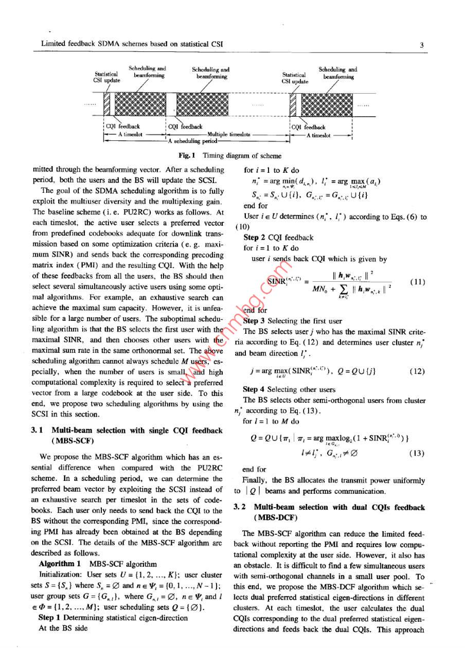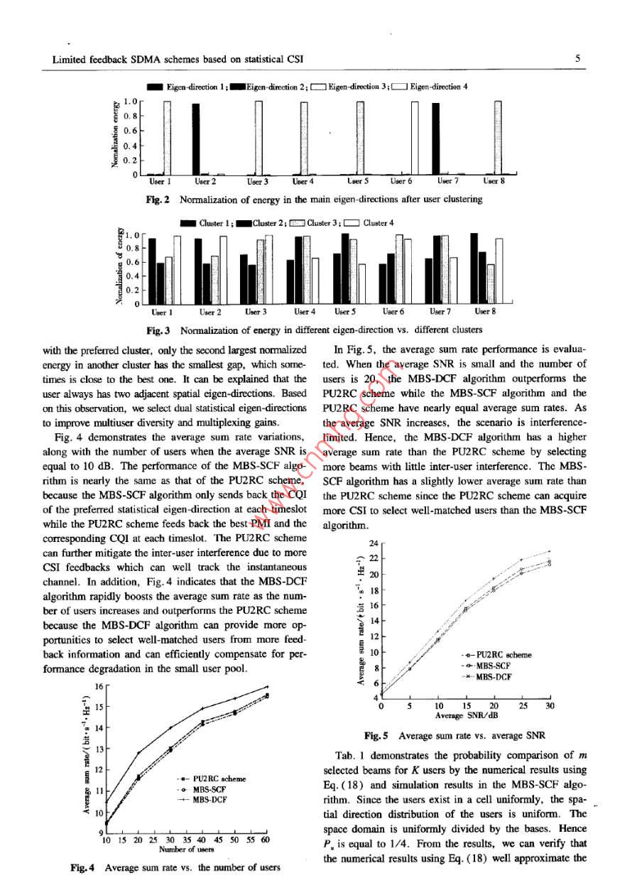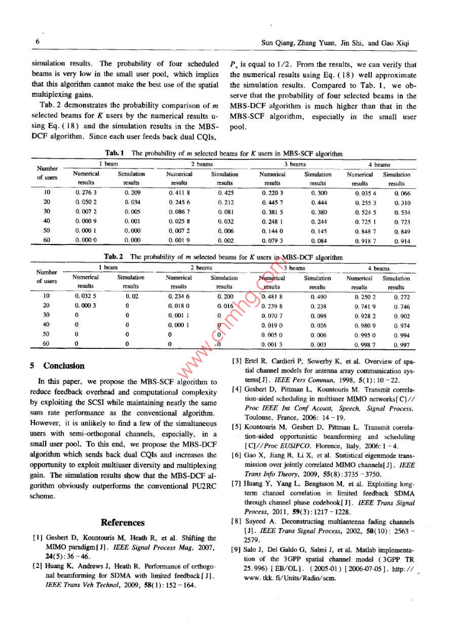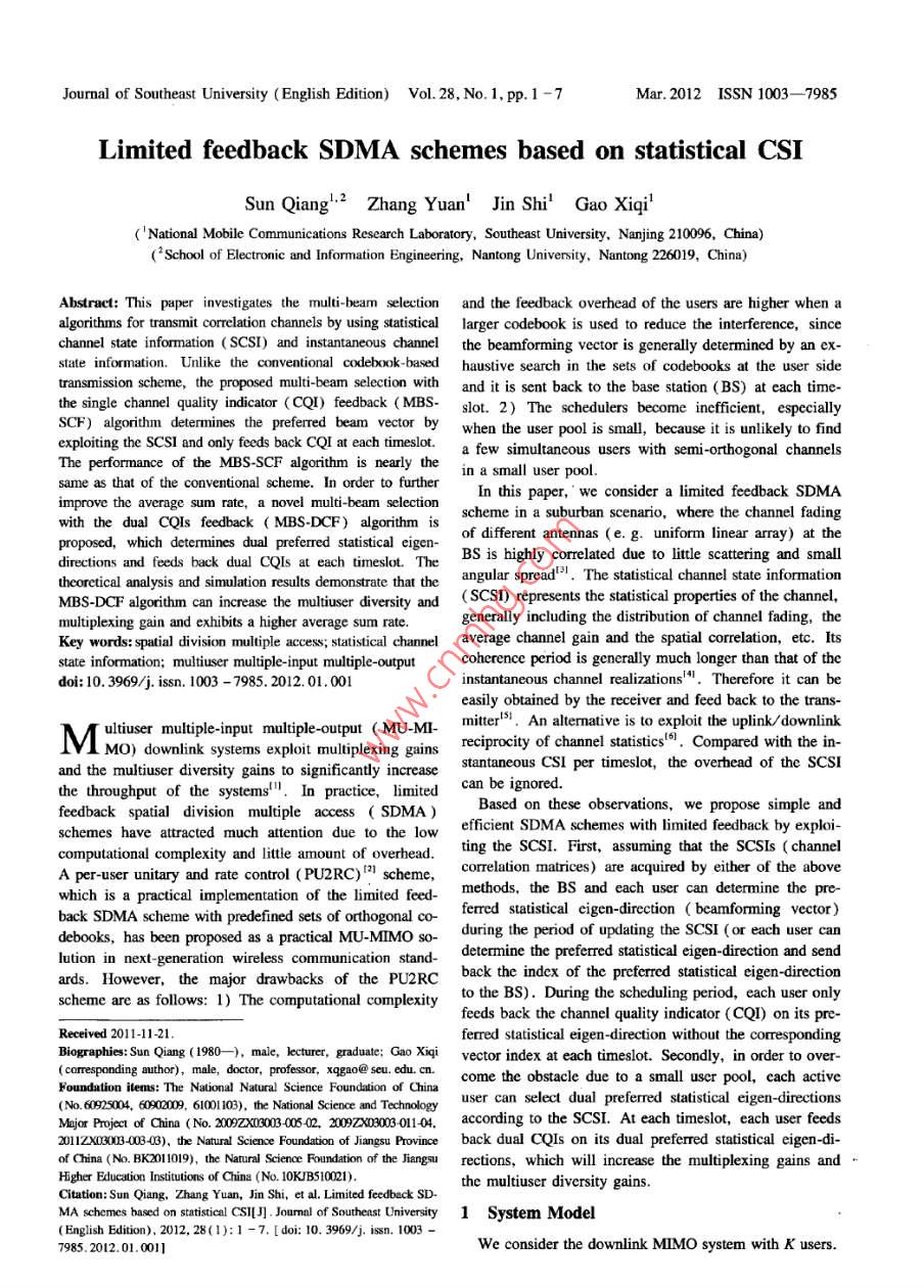 Journal of Southeast University( English Edition) VoL 28, No 1, pp 1-7Mar.2012ISSN1003-7985Limited feedback Sdma schemes based on statistical CSISun Qiang"- Zhang YJin Shi Gao xiqi(National Mobile Communications Research Laboratory, Southeast University, Nanjing 210096, China)School of Electronic and Information Engineering, Nantong University, Nantong 226019, ChinaAbstract: This paper investigates the multi-beam selection and the feedback overhead of the users are higher when aalgorithms for transmit correlation channels by using statistical larger codebook is used to reduce the interference, sincechannel state information( SCSI) and instantaneous channel the beamforming vector is generally determined by an erstate information. Unlike the conventional codebook-basehaustive search in the sets of codebooks at the user sidetransmission scheme, the proposed multi-beam selection with and it is sent back to the base station(BS) at each time-the single channel quality indicator( cQn) feedback(MBSslot. 2) The schedulers become inefficient, especiallySCF)algorithm determines the preferred beam vector by when the user pool is small, because it is unlikely to findexploiting the SCSI and only feeds back CQI at each timeslot. a few simultaneous users with semi-orthogonal channelsThe performance of the MBS-SCF algorithm is nearly then a small user poolsame as that of the conventional scheme. In order to further In this paper, we consider a limited feedback SDMAimprove the average sum rate, a novel multi-beam selectionwith the dual CQls feedback MBS-DCF)algorithm isscheme in a suburban scenario, where the channel fadingof different antennas(e. g. uniform linear array ) at thproposed, which determines dual preferred statistical eigen- BS is highly correlated due to little scattering and smalland simulation results demonstrate that the angular spread. The statistical channel state informationMBS-DCF algorithm can increase the multiuser diversity and (SCSI)represents the statistical properties of the channel.multiplexing gain and exhibits a higher average sum rate.generally including the distribution of channel fading, theKey words: spatial division multiple access; statistical channel average channel gain and the spatial correlation, etc. Itsstate information; multiuser multiple-input multiple-outputcoherence period is generally much longer than that of thedoi:10.3969/jiss.1003-7985.2012.01.001instantaneous channel realizations 4. Therefore it can beasily obtained by the receiver and feed back to the trans-Multiuser multiple-input multiple-output MU-MF. mitter, An altermative is to exploit the uplink/downlinkMO)downlink systems exploit multiplexing gains reciprocity of channel statistics. Compared with the in-and the multiuser diversity gains to significantly increase stantaneous CSI per timeslot, the overhead of the SCSIthe throughput of the systems". In practice,limitedcan befeedback spatial division multiple access SDMABased on these observations, we propose simple andefficient SDMA schemes with limited feedback by explA per-user unitary and rate control( PU2RC) scheme, correlation matrices)are acquired by either of the annelcomputational complexity and little amount of overhead. ting the SCSI. First, assuming that the SCSIs(channelwhich is a practical implementation of the limited feed. methods, the BS and each user can determine theback SDMA scheme with predefined sets of orthogonal co- ferred statistical cigen-direction beamforming vector)ebooks, has been proposed as a practical MU-MIMO so- during the period of updating the SCSI (or each user canlution in next-generation wireless communication stand. determine the preferred statistical eigen-direction and sendards.However, the major drawbacks of the pu2Rc back the index of the preferred statistical eigen-directiorscheme are as follows: 1)The computational complexity to the BS). During the scheduling period, each user onlyfeeds back the channel quality indicator( CQi)on its pre-Received 2011-11-21ferred statistical eigen-direction without the corespondingBiographies: Sun Qiang(1980-), male, lecturer, graduate; Gao Xiqi vector index at each timeslot. Secondly, in order to over-carresponding author), male, doctor, professor, xqgaoe seu. edu.cn.Foundation items: The National Natural Science Foundation of chinaome the obstacle due to a small user pool, cachlo, 608925004, 60002009, 6101 103). the National Science and Technology user can select dual preferred statistical eigen-direcMajor Project of China( No 2009ZX03003-005-02 2009ZX03003-011-04. according to the sCsI. At each timeslot, each user2011ZX0B0B-008-03), the Natural Science Foundation of Jiangsu Province back dual CQIs on its dual preferred statistical eigen-di-of China(No BK201 1019), the Natural Science Foundation of the Jiangsu rections, which will increase the multiplexing gains andHigher Education Institutions of China(No. 10KJBS10021)e multiuser diversity gainsCitation: Sun Qiang, Zhang Yuan, Jin Shi, et al. Limited feedback SDMA schemes based on statistical CSI[ J]. Joumal of Southeast University 1 System Model( English Edition),2012,28(1):1-7.Idoi:10.3969/j.isn.10037985.2012.01.0011We consider the downlink MIMO system with K users.Sun Qiang, Zhang Yuan, Jin Shi, and Gao xiqiThe Bs is exposed to little scattering and is equipped with of user i, the BS and user i determine user clustering anda uniform linear array (ULA)of M antennas, whereas the user's preferred statistical eigen-directions. The detailseach user is equipped with a single antenna, Since in a of clustering the user and determining the statistical eigentypical cellular system, the number of users is much grea- directions are described as followster than the number of transmit antennas(K>M).Ineach timeslot, the BS selects user sets Q(B=IQI