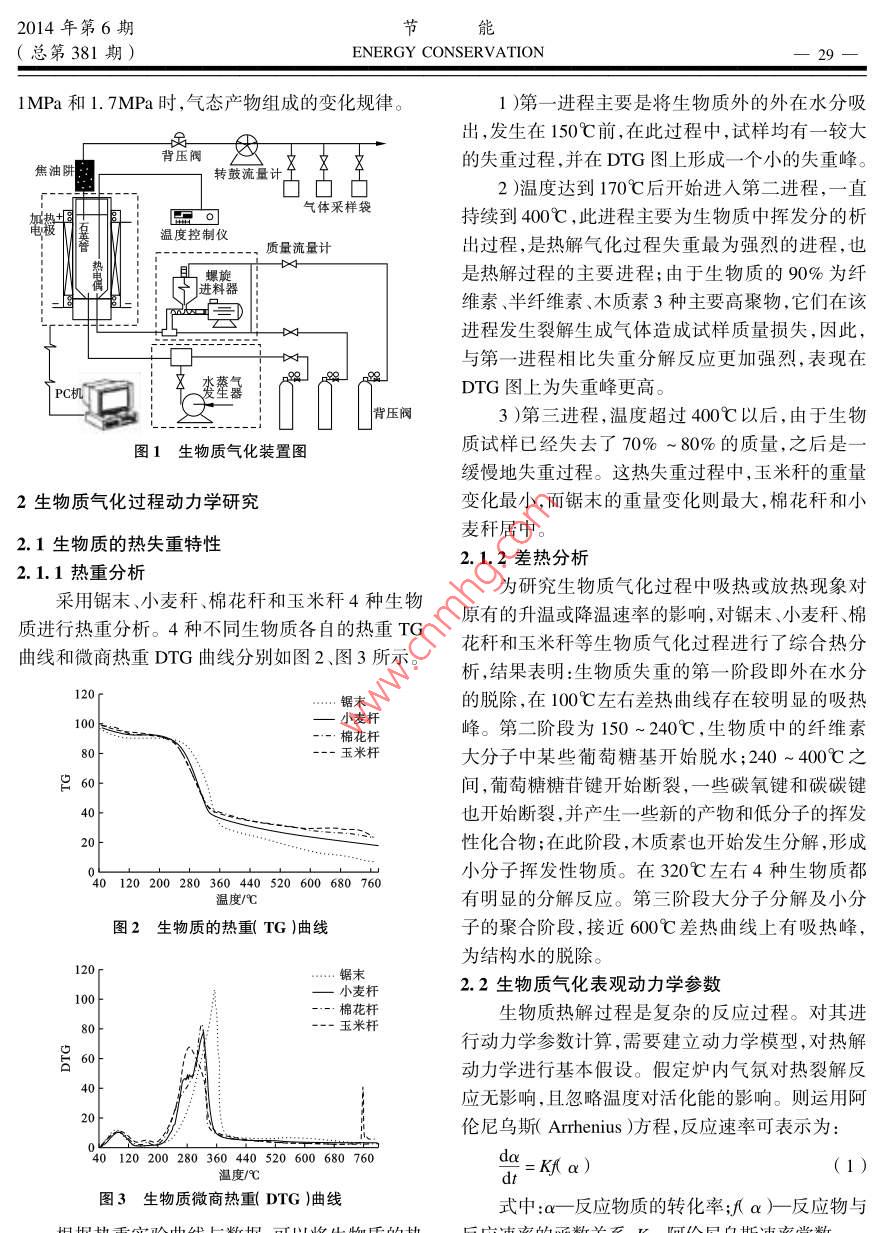 節(jié)能2014年第6期28 ENERGY CONSERVATION(總第381期)生物質(zhì)熱解氣化特性分析邱新紅(唐山市科技情報(bào)研究所,河北唐山063000)摘要:通過(guò)對(duì)玉米稈、小麥稈、棉花稈、稻草、松木屑等生物質(zhì)進(jìn)行熱重分析和差熱分析,分析了生物質(zhì)氣化過(guò)程的裂解機(jī)理。研究中采用松木屑作為氣化原料,得出了氣化溫度、壓力、水蒸氣加入量等反應(yīng)條件對(duì)氣化產(chǎn)物的產(chǎn)率、組成成分及焦油產(chǎn)率的影響規(guī)律,研究結(jié)果表明,溫度對(duì)生物質(zhì)氣化的影響最大,當(dāng)溫度為800℃時(shí)氣體的產(chǎn)率最高。關(guān)鍵詞:生物質(zhì)氣化;熱解特性;動(dòng)力學(xué)中圖分類號(hào):TK6文獻(xiàn)標(biāo)識(shí)碼:A文章編號(hào):104-7948(201406-0028-04doi:103969/j.issn.1004-7948.2014.06.007素分析儀測(cè)定。華北地區(qū)典型生物質(zhì)的元素分析引言結(jié)果如表2所示。在諸多生物質(zhì)利用方法中,生物質(zhì)氣化以其高表2生物質(zhì)元素分析及熱值效率、低成本、使用和運(yùn)輸方便等諸多優(yōu)點(diǎn)越來(lái)越 LHV受到人們的關(guān)注。由于氣化過(guò)程是復(fù)雜的物理和物料C/%H/%0/%/%/% /kJ.kg-I化學(xué)變化過(guò)程,生物質(zhì)原料的物理性質(zhì)、形狀的復(fù)7雜草48.246.0544.800.750.1616897雜性決定了生物質(zhì)在氣化過(guò)程中熱傳導(dǎo)和不完全松木屑51.016.0042.900.080.0119045燃燒過(guò)程的復(fù)雜多變。氣化過(guò)程的復(fù)雜性使得稻草48.305.3045.500.810.0917636玉米稈49.306.0243.870.690.1217746生物質(zhì)氣化技術(shù)的開(kāi)發(fā)、后續(xù)氣化設(shè)備設(shè)計(jì)和制造棉花稈49.825.6843.620.670.2118089等存在一定的困難。為深入研究生物質(zhì)氣化機(jī)理,小麥稈49.626.1143.590.620.0618563為生產(chǎn)和制造生物質(zhì)氣化設(shè)備提供參考,文中對(duì)我國(guó)典型生物質(zhì)的氣化特性進(jìn)行分析研究。1.2熱重-差熱實(shí)驗(yàn)實(shí)驗(yàn)前,將樣品在自然條件下風(fēng)干,然后用粉1實(shí)驗(yàn)內(nèi)容碎機(jī)粉碎。粉碎后的原料顆粒直徑小于20μm。1.1生物質(zhì)基本燃料特性分析實(shí)驗(yàn)所用的儀器是德國(guó)耐馳儀器制造有限公司生1.1.1工業(yè)分析產(chǎn)的STA499C型常壓熱重分析儀。實(shí)驗(yàn)用生物質(zhì)選擇我國(guó)華北地區(qū)主要的農(nóng)作1.3生物質(zhì)氣化實(shí)驗(yàn)物秸稈、木屑、雜草等為研究對(duì)象,各種生物質(zhì)工業(yè)實(shí)驗(yàn)原料采用粉碎機(jī)粉碎成小于10mm,在分析的結(jié)果如表1所示。105℃溫度下烘干2h后備用。生物質(zhì)氣化反應(yīng)器表1生物質(zhì)工業(yè)分析值%為實(shí)驗(yàn)室規(guī)模的加壓氣化裝置,如圖1所示。物料水分揮發(fā)分固定碳灰分實(shí)驗(yàn)前,先將鼓風(fēng)干燥箱中的溫度設(shè)定為雜草6.5265.1013.4514.93(105±2)℃,并將物料放入其中干燥2h實(shí)驗(yàn)過(guò)松木屑10.9276.4812.290.32程中,在氣化裝置達(dá)到設(shè)定的溫度和壓力后,進(jìn)料稻草5.7969.3815.389.45玉米稈6.1070.6517.825.43器開(kāi)始進(jìn)料。當(dāng)進(jìn)料相對(duì)平穩(wěn)后在反應(yīng)器出口處棉花稈5.8469.5518.256.36用氣袋收集氣體,此時(shí)的反應(yīng)參數(shù)等由計(jì)算機(jī)讀小麥稈7.1570.2717.145.44取。實(shí)驗(yàn)考察溫度在400~900℃對(duì)氣態(tài)產(chǎn)物組成11t的響0℃宜2014年第6期節(jié)能(總第381期) ENERGY CONSERVATION291MPa和1.7MPa時(shí),氣態(tài)產(chǎn)物組成的變化規(guī)律。1)第一進(jìn)程主要是將生物質(zhì)外的外在水分吸出,發(fā)生在150℃前,在此過(guò)程中,試樣均有一較大背壓閥焦油阱的失重過(guò)程,并在DTG圖上形成一個(gè)小的失重峰。轉(zhuǎn)鼓流量計(jì)2)溫度達(dá)到170℃后開(kāi)始進(jìn)入第二進(jìn)程,一直氣體采樣袋加熱持續(xù)到400℃,此進(jìn)程主要為生物質(zhì)中揮發(fā)分的析溫度控制儀質(zhì)量流量計(jì)出過(guò)程,是熱解氣化過(guò)程失重最為強(qiáng)烈的進(jìn)程,也螺旋是熱解過(guò)程的主要進(jìn)程;由于生物質(zhì)的90%為纖進(jìn)料器維素、半纖維素、木質(zhì)素3種主要高聚物,它們?cè)谠撨M(jìn)程發(fā)生裂解生成氣體造成試樣質(zhì)量損失,因此,與第一進(jìn)程相比失重分解反應(yīng)更加強(qiáng)烈,表現(xiàn)在T水蒸PC機(jī)發(fā)生器DTG圖上為失重峰更高。背壓閥3)第三進(jìn)程,溫度超過(guò)400℃以后,由于生物圖1生物質(zhì)氣化裝置圖質(zhì)試樣已經(jīng)失去了70%~80%的質(zhì)量,之后是一緩慢地失重過(guò)程。這熱失重過(guò)程中,玉米稈的重量2生物質(zhì)氣化過(guò)程動(dòng)力學(xué)研究變化最小,而鋸末的重量變化則最大,棉花稈和小麥稈居中。2.1生物質(zhì)的熱失重特性2.1.2差熱分析2.1.1熱重分析為研究生物質(zhì)氣化過(guò)程中吸熱或放熱現(xiàn)象對(duì)采用鋸末、小麥稈、棉花稈和玉米稈4種生物質(zhì)進(jìn)行熱重分析。4種不同生物質(zhì)各自的熱重TG原有的升溫或降溫速率的影響,對(duì)鋸末小麥稈、棉曲線和微商熱重DTG曲線分別如圖2、圖3所示?;ǘ捄陀衩锥挼壬镔|(zhì)氣化過(guò)程進(jìn)行了綜合熱分析,結(jié)果表明:生物質(zhì)失重的第一階段即外在水分120…鋸末的脫除,在100℃左右差熱曲線存在較明顯的吸熱100小麥桿一棉花桿峰。第二