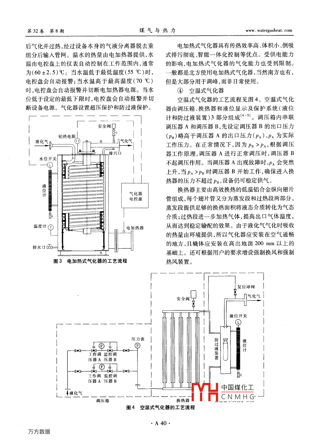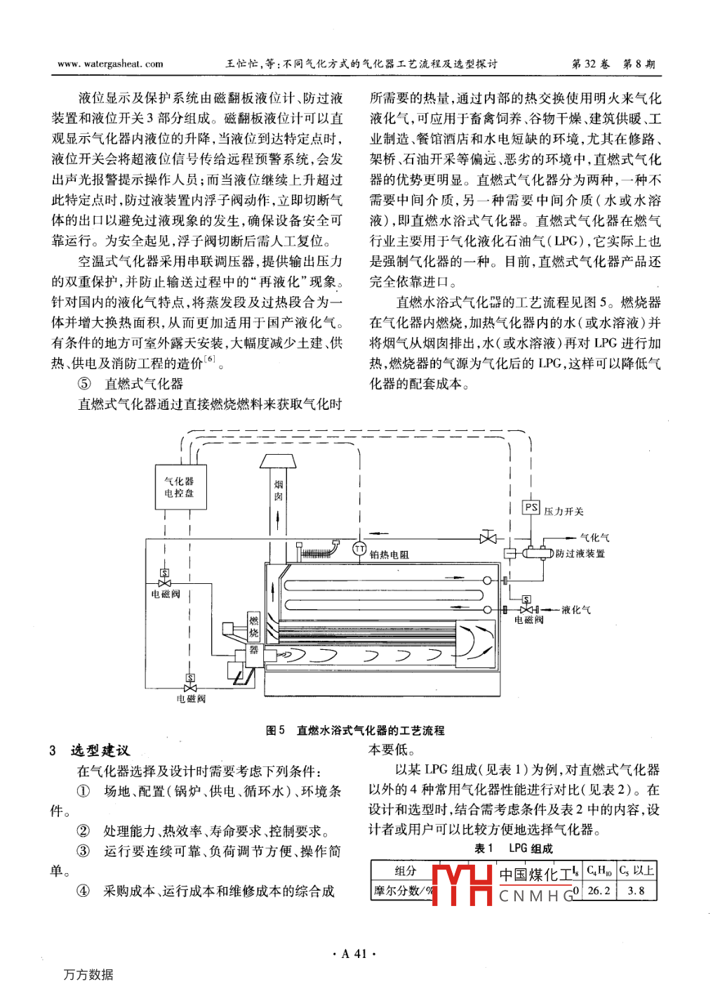 第32卷第8期煤氣與熱力Vol 32 No 82012年8月gas heatAug.2012不同氣化方式的氣化器工藝流程及選型探討王忙忙,王震,陳紹新(天津華邁燃?xì)庋b備股份有限公司,天津300384)摘要:介紹了5種氣化器(蒸汽加熱式氣化器、熱水式氣化器、電加熱式氣化器、空溫式氣化器、直燃式氣化器)的工藝流程及特點(diǎn)。結(jié)合工程實(shí)例,探討了氣化器的選型。關(guān)鍵詞:氣化器;蒸汽加熱式氣化器;熱水式氣化器;電加熱式氣化器;空溫式氣化器;直燃式氣化器中圖分類(lèi)號(hào):TU996文獻(xiàn)標(biāo)識(shí)碼:B文章編號(hào):1000-446(2012)08-0A38-05iscussion on Technological Processes of vaporizers with DifferentVaporization Modes and Type selectionWANG Mangmang, WANG Zhen, CHEN ShaoxinAbstract: The technological processes and characteristics of five types of vaporizers includingsteam heated vaporizer, hot water vaporizer, electrically-heated vaporizer, air-heated vaporizer and di-rect-fired vaporizer are introduced. The selection of vaporizer type is discussed with an engineering exam-Key words: vaporizer; steam heated vaporizer; hot water vaporizer; electrically-heated vaporizer; air-heated vaporizer; direct-fired vaporizer1概述種氣化器可用于LPG、LNG等的氣化。換熱設(shè)備是一種實(shí)現(xiàn)物料之間熱量傳遞的設(shè)2幾種氣化器的工藝流程及特點(diǎn)備,廣泛應(yīng)用于化工、冶金、電力、食品等行業(yè),其換①蒸汽加熱式氣化器熱狀況的好壞,直接影響著整個(gè)裝置的平穩(wěn)運(yùn)行及蒸汽加熱式氣化器的工藝流程見(jiàn)圖13。飽和綜合經(jīng)濟(jì)指標(biāo),對(duì)生產(chǎn)的安全、穩(wěn)定、長(zhǎng)期運(yùn)行起著蒸汽自下而上不斷送入蒸汽不銹鋼同軸列管,蒸汽重要的作用。在化工裝置中,換熱設(shè)備數(shù)量占設(shè)備不銹鋼同軸列管與液化氣之間有蒸汽冷凝腔,蒸汽總數(shù)量的40%左右,成本占總成本的35%在冷凝腔內(nèi)凝結(jié)成水。蒸汽對(duì)陸續(xù)凝結(jié)在冷凝腔內(nèi)46%口。氣化器作為換熱設(shè)備的一種,與普通換熱的水(即冷凝水)進(jìn)行加熱,冷凝水以相對(duì)溫和的方器的不同之處是它的工作過(guò)程包含工作介質(zhì)產(chǎn)生相式加熱氣化器內(nèi)的液化氣,并使其過(guò)熱。氣化氣經(jīng)變的過(guò)程液態(tài)介質(zhì)的氣化需要3個(gè)過(guò)程:預(yù)熱一蒸過(guò)氣化器內(nèi)的不銹鋼濾網(wǎng)除去重組分,輸入管網(wǎng)發(fā)一過(guò)熱,因此氣化器的設(shè)計(jì)與普通無(wú)相變換熱器在工作過(guò)程中,氣化器內(nèi)通常存有一定液位的液態(tài)相比更具有挑戰(zhàn)性2。另外,氣化器的氣化方式也介質(zhì),當(dāng)用氣量上升或下降時(shí),液位也會(huì)隨著上升或不盡相同。本文結(jié)合天津華邁燃?xì)庋b備股份有限公下降,以尋求合理的換熱面積來(lái)適應(yīng)氣化量的變化。司多年的工程實(shí)踐經(jīng)驗(yàn),對(duì)不同氣化方式的氣化器液化氣入口的電磁閥控制液化氣回路的通斷,蒸汽的工藝流程特點(diǎn)及選型進(jìn)行探討。本文中除空溫入口的溫控中國(guó)煤化工簍信號(hào)控制蒸汽式氣化器、直燃式氣化器一般用于LPG外,其他幾的進(jìn)入量CNMHGwww.watergasheat.com王忙忙,等:不同氣化方式的氣化器工藝流程及選型探討第32卷第8期安全閥囗氣化氣鉑熱電阻壓力表氣化器Q不銹鋼濾液位開(kāi)關(guān)電控盤(pán)液位計(jì)電磁閥腔液化氣過(guò)濾器凝結(jié)水出口線排污口冷凝腔溫度計(jì)疏水器知蒸汽排水口西蒸汽腔蒸汽溫控閥圖1蒸汽加熱式氣化器的工藝流程蒸汽加熱式氣化器平均溫差大、換熱效率高、工作時(shí)間長(zhǎng)、不受環(huán)境溫度影響、無(wú)需電能集中智能安全閥囗控制、使用安全方便,不銹鋼同軸列管套管換熱結(jié)構(gòu)鉑熱電阻保證在相對(duì)溫和的條件下氣化,可避免結(jié)焦。蒸汽加熱式氣化器廣泛應(yīng)用于各種場(chǎng)合,一般是作為空氣化器壓力溫式氣化器的備用設(shè)備,即天氣較冷、空溫式氣化器電控盤(pán)Q銹鋼濾網(wǎng)孩位開(kāi)關(guān)的氣化量達(dá)不到使用要求時(shí),將會(huì)啟動(dòng)蒸汽加熱式氣化器。②熱水式氣化器液位計(jì)一熱水式氣化器的工藝流程見(jiàn)圖2。與蒸汽加熱式氣化器不同,熱水式氣化器采用循環(huán)熱水作為加熱介質(zhì),熱水通常由外界熱水爐、循環(huán)泵及高位水箱液化氣電磁閥組成的熱水供給系統(tǒng)提供,并由自控儀表控制在用過(guò)濾器西排污口戶(hù)設(shè)定的工作范圍內(nèi)。另外,氣化器還具有壓力保溫度計(jì)護(hù)措施,當(dāng)氣化器內(nèi)壓力超過(guò)安全閥的設(shè)定壓力時(shí),安全閥自動(dòng)起跳。滅熱水熱水式氣化器具有較大的換熱面積,能更好地排水口適應(yīng)國(guó)產(chǎn)液化氣,實(shí)現(xiàn)全自動(dòng)控制及人機(jī)對(duì)話功能,世流程便于站房管理。但熱水式氣化器需要配置熱水供給中國(guó)煤化工圖3。液化氣從系統(tǒng)及控制系統(tǒng),向工程配置提出了更高要求。電加熱CNMHG吸收溫水熱量③電加熱式氣化器浸沒(méi)在溫第32卷第8期煤氣與熱力www.watergasheat.com后氣化并過(guò)熱,經(jīng)過(guò)設(shè)備本身的氣液分離器脫去重電加熱式氣化器具有傳熱效率高、體積小、倒吸組分后輸入管網(wǎng)。溫水的熱量由電加熱器提供,水式排污徹底、智能一體化控制等優(yōu)