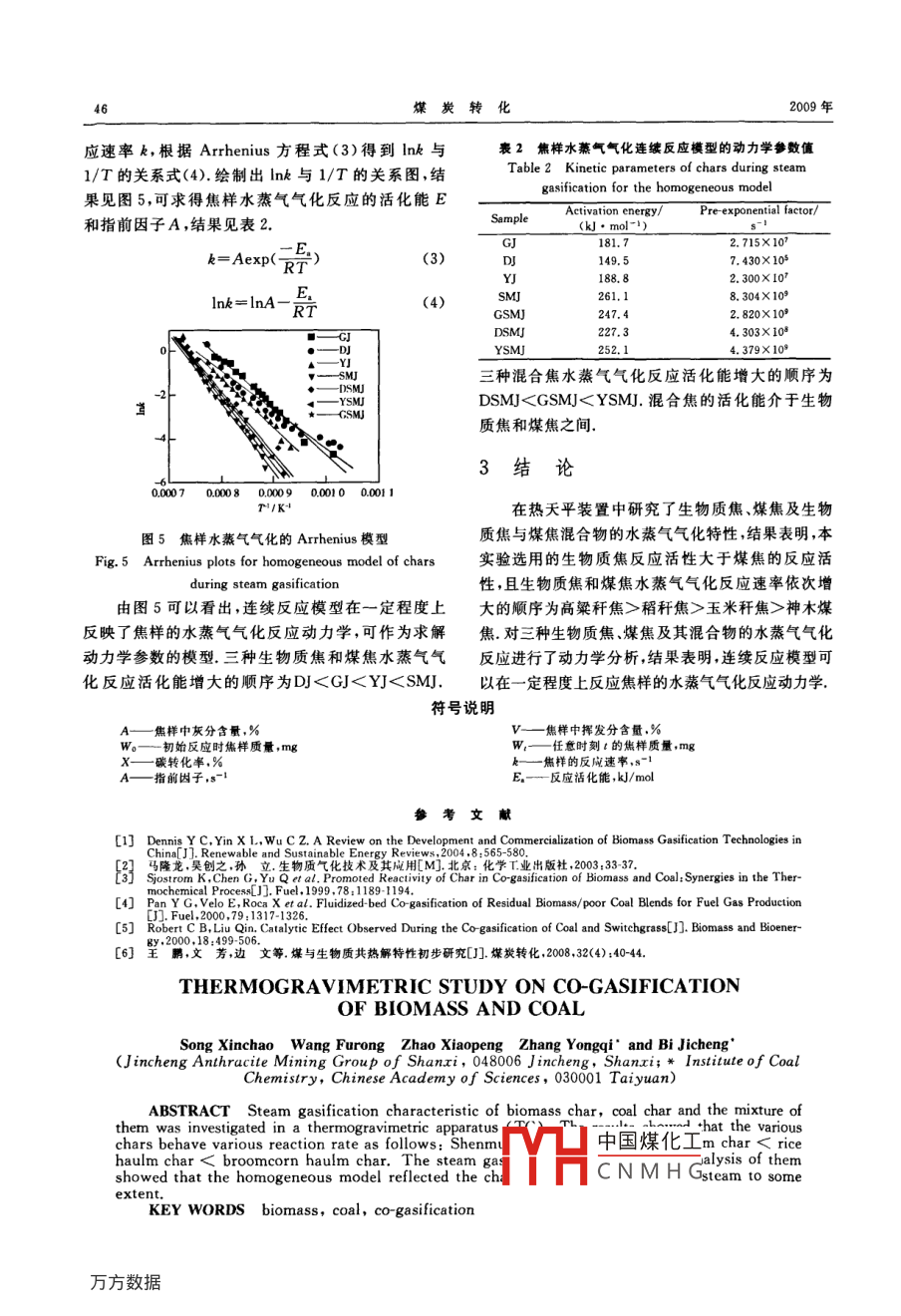 第32卷第4期煤炭轉(zhuǎn)化Vol 32 No 42009年10月COAL CONVERSION生物質(zhì)與煤共氣化特性研究宋新朝)王芙蓉趙霄鵬張永奇2)畢繼誠(chéng)?摘要在熱天平裝置中研究了生物質(zhì)焦、煤焦以及生物質(zhì)焦與煤焦混合物的水蒸氣氣化特采用程序升溫?zé)嶂胤▽?duì)生物質(zhì)焦(稻稈焦、高粱稈焦和玉米稈焦)、神木煤焦以及生物質(zhì)焦與煤焦混合物進(jìn)行了水蒸氣氣化實(shí)驗(yàn).結(jié)果表明,生物質(zhì)焦和煤焦在一定溫度下的氣化速率為:高梁焦>稻稈焦>玉米焦>神木煤焦.并對(duì)三種生物質(zhì)焦、煤焦、生物焦和煤焦混合物的水蒸氣氣化反應(yīng)進(jìn)行了動(dòng)力學(xué)分析,分析認(rèn)為,連續(xù)反應(yīng)模型可以在一定程度上反應(yīng)焦樣的水蒸氣氣化反應(yīng)動(dòng)力學(xué)關(guān)鍵詞生物質(zhì),煤,共氣化中圖分類號(hào)TQ5450引言稈焦和玉米稈焦)、煤焦及兩者混合物的水蒸氣氣化實(shí)驗(yàn).實(shí)驗(yàn)在上海天平儀器廠生產(chǎn)的ZRP一2P型熱生物質(zhì)作為一種可再生能源,其高效潔凈利用分析儀上進(jìn)行,在原熱天平上增加了水蒸氣發(fā)生器,日益受到人們的關(guān)注生物質(zhì)的熱解氣化是一種高裝置見圖1.將稻稈(D)、高粱稈(G)、玉米稈(Y)和效的能源利用方式,可以生產(chǎn)燃料氣或化學(xué)合成氣我國(guó)農(nóng)作物秸稈產(chǎn)量大,高效潔凈的大規(guī)模利用技術(shù)落后12,致使生物質(zhì)資源浪費(fèi)嚴(yán)重生物質(zhì)的能量密度低,單獨(dú)氣化溫度較低,氣化時(shí)生成較多的焦油,不僅降低了生物質(zhì)的利用效率,而且對(duì)氣化過程的穩(wěn)定運(yùn)行造成不利影響;此外,生物質(zhì)的供給受到季節(jié)的影響,使生物質(zhì)單獨(dú)氣化的規(guī)模受到限制.煤圖1熱天平裝置的氣化溫度高,生物質(zhì)與煤共氣化通過提高氣化溫Fig. I Schematic diagram of the thermogravimetric度,不僅可以提高生物質(zhì)的氣化效率減少焦油的生成,而且可以解決生物質(zhì)供給的季節(jié)性問題,為生物-Electric heater: 2-Nitrogeni 3--TG signal: 4質(zhì)的高效利用提供一條新的技術(shù)途徑已有研究表Steam generation: 5-Computer: 6--Sample明,生物質(zhì)與煤共氣化過程可能具有協(xié)同作用,神木煤(SM)分別放在帶有蓋子的器皿中放入馬弗主要是因?yàn)樯镔|(zhì)具有較高的揮發(fā)分含量、生物質(zhì)爐中,在900℃下恒溫放置7min左右,制得稻稈焦焦具有較高的反應(yīng)性以及生物質(zhì)灰中的堿金屬對(duì)煤(DJ)、高粱稈焦(G)、玉米稈焦(YJ)和神木煤焦焦氣化過程有很好的催化作用.56國(guó)內(nèi)外對(duì)生物(SMJ).焦樣經(jīng)研磨,取80目以下的樣品作為熱重實(shí)質(zhì)與煤的共氣化研究目前仍停留在實(shí)驗(yàn)室階段小型驗(yàn)用料.稻稈焦(DJ)高粱稈焦(G)、玉米稈焦(YJ)分中試階段本文采用熱天平考察了三種農(nóng)作物秸稈別與神木煤焦(SM)以1:4的質(zhì)量比混合均勻,樣焦和一種煤焦及其混合物的水蒸氣氣化特性,旨為品分別記作DSM,GSM和YSM,作為混合物共氣生物質(zhì)與煤混合物的流化床氣化提供一些基礎(chǔ)化原料樣品的工業(yè)分析和元素分析見第45頁表1數(shù)據(jù)2結(jié)果與討論實(shí)驗(yàn)部分為了考察不同生物質(zhì)及生物質(zhì)與煤混合物的氣2.1生物質(zhì)焦和煤焦的單獨(dú)氣化化特性,在熱天平上進(jìn)行了生物質(zhì)焦(稻稈焦、高粱中國(guó)煤化工進(jìn)行,每次放樣約CNMHG國(guó)家高技術(shù)研究發(fā)展計(jì)劃(863)項(xiàng)日(2007AA05Z327)1)碩士山西晉城無煙煤礦業(yè)集團(tuán)有限責(zé)任公司,048006山西晉城;2)教授,中國(guó)科學(xué)院山西煤炭化學(xué)研究所,030001太原收稿日期:200907-10;修回日期:20090830第4期宋新朝等生物質(zhì)與煤共氣化特性研究4表1生物質(zhì)和煤及其焦樣的工業(yè)分析和元素分析(%,adTable 1 Proximate and ultimate analysis of biomassand coal and their char(%.,ad)Proximate analysiUltimate analysisY6.676.1469.5617.6342.304.6638.521.130.58D5.5812.0665.2317.1338.614.2837.741.080.65SM8.765.5832.4153.2573.084.524.580.980.3000是是時(shí)上00750800850900950100010501100GJ1.1231.874.3262.6953.900.4010.781.100.83Y0.9725.832.6170.5966.230.354.521.230.87D0.8941.322.2355.5651.220.493.881.111.10圖3焦樣反應(yīng)速率溫度關(guān)系SM0.879.141.49865087.070.400.26.410.8Fig 3 Relationship between char reactionPercent of weight10mg,水蒸氣流量為25mL/min,氮?dú)饬髁繛橐来卧龃蟮捻樞驗(yàn)镚J>D>YJ.生物質(zhì)因其種類75mL/min實(shí)驗(yàn)在室溫到1200℃之間進(jìn)行,升溫不同,其所含纖維素、半纖維素及木質(zhì)素的量和結(jié)構(gòu)速率20℃/min.根據(jù)熱重儀得出的相關(guān)原始數(shù)據(jù),也不同,所含礦物質(zhì)的種類和量也不同,都將導(dǎo)致氣由式(1)計(jì)算焦樣-水蒸氣氣化碳轉(zhuǎn)化率X,繪出碳化反應(yīng)速率的不同轉(zhuǎn)化率溫度關(guān)系圖(見圖2)由連續(xù)反應(yīng)模型方程2.2生物質(zhì)焦與煤焦的共氣化式(2)計(jì)算焦樣的反應(yīng)速率k,繪出反應(yīng)速率溫度關(guān)系圖(見圖3)在生物質(zhì)焦與煤焦共氣化時(shí),采用生物質(zhì)焦與煤焦的質(zhì)量比為1:4,實(shí)驗(yàn)條件與單獨(dú)氣化的條件100%(1)相同.由式(1)計(jì)算焦樣水蒸氣氣化碳轉(zhuǎn)化率X結(jié)果見圖4.由圖4可以看出,三種生物質(zhì)焦與煤焦混▲-DSMI圖2顯示出三種生物質(zhì)焦和