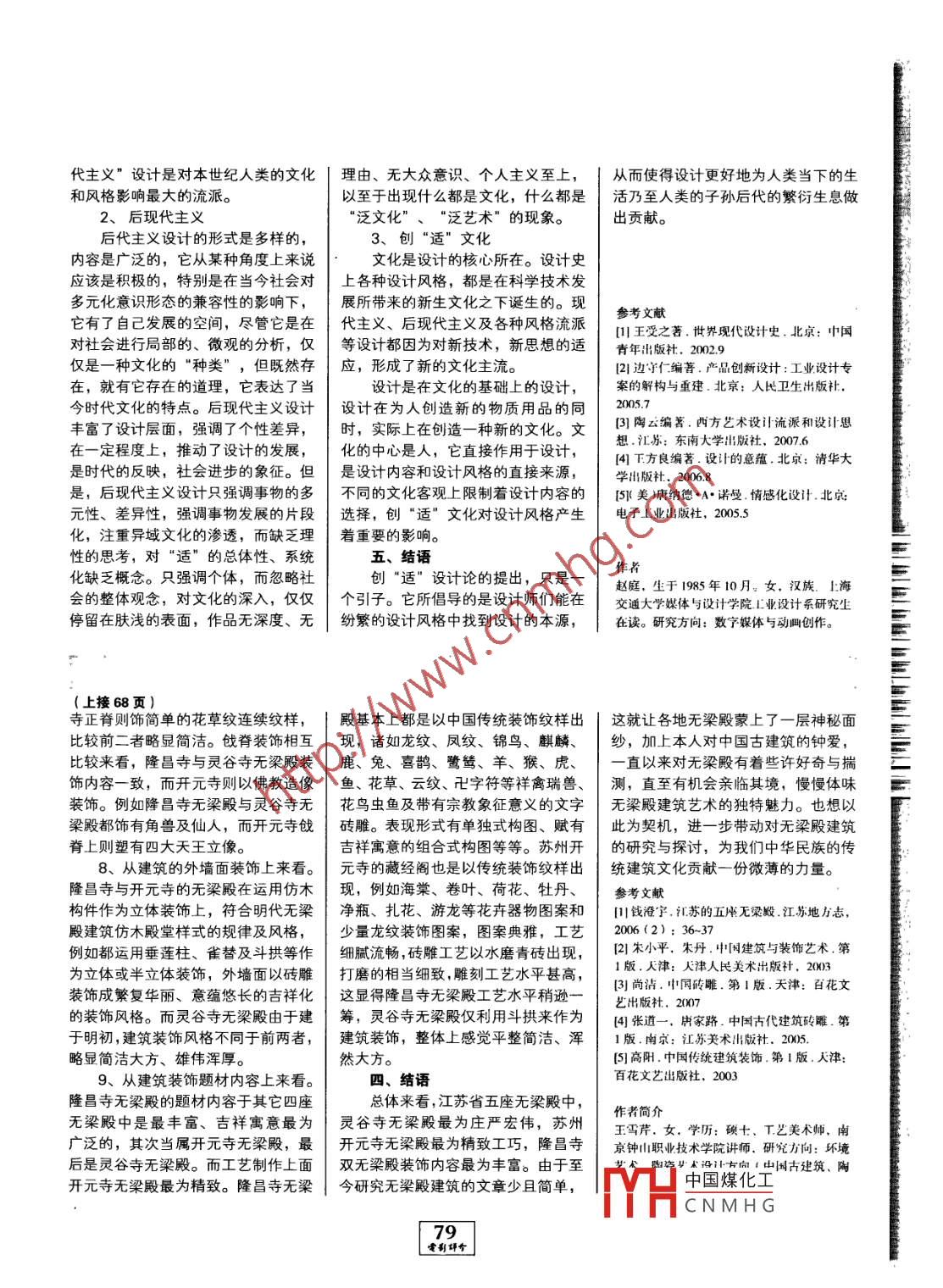 視覺殿堂ncvicw坪個上海交通大學(xué)|趙庭創(chuàng)“適”設(shè)計說[摘要]創(chuàng)新是當(dāng)下非常時髦的詞匯,觀點要創(chuàng)新,技術(shù)要創(chuàng)新,策略要創(chuàng)新,設(shè)計自然也應(yīng)當(dāng)跟上步伐,走創(chuàng)新道路??墒菑默F(xiàn)代主義的衰落到如今各種后現(xiàn)代風(fēng)格的興起,讓我們不斷思考一個問題,在創(chuàng)新的大旗引領(lǐng)下,設(shè)計是不是已經(jīng)迷失了自己的方向?探索設(shè)計應(yīng)當(dāng)回歸設(shè)計的本質(zhì),即是以人我本,創(chuàng)造合理的生活方式,即創(chuàng)“適”。創(chuàng)“適”順應(yīng)了一定的文化,同時也在創(chuàng)造著新的創(chuàng)“適”文化。[關(guān)鍵詞] 創(chuàng)新適應(yīng)性理論 創(chuàng)“適”設(shè)計doi:10.3969/j.ssn.1002- 6916.201 1.23.035一、創(chuàng)新概述強(qiáng)調(diào)個性化而導(dǎo)致的負(fù)面效應(yīng):“如|存方式, 全面提升人的生存質(zhì)量。""尊不可否認(rèn),創(chuàng)新為人類社會的進(jìn).果某一廠家己經(jīng)生產(chǎn)出完美的產(chǎn)品,重人、關(guān)心人、-切以人的生命存步和發(fā)展做出了巨大的貢獻(xiàn)。正因為其他廠家為了促銷,也不得不把原本|在 和生命活動為中心,就必然成為設(shè)創(chuàng)新,我們才有機(jī)會看到鳥巢體育館,完美的設(shè)計加以改變,結(jié)果生產(chǎn)出并計蒞臨和創(chuàng)作的最根本、最重要的原看到IPHONE,看到<2012>.-方面,不讓人滿意的產(chǎn)品。”有人曾辛辣地|則。"我們感嘆人類無窮的創(chuàng)造力;另一方諷刺道:“每-個設(shè)計師都被鼓勵去2、設(shè)計脫離了生活注定失敗面我們卻遇到這樣情況,太多新鮮事發(fā)現(xiàn)一個輪子,要能滾動,但卻不是在唐納德.諾曼的<設(shè)計心理學(xué)>物的誕生,使得我們開始對生活感到圓的。 ”這就是對所謂“ 創(chuàng)造性”-書中有這樣- -個例子: 有些新型水陌生的最大嘲諷。.龍頭的外觀確實很漂亮、光潔、典雅創(chuàng)新是設(shè)計的靈魂。的確,創(chuàng)新二、設(shè)計與生活并榮獲過設(shè)計大獎,但卻不易使用。的側(cè)重點是在于“新”,但并非“新”變了味的創(chuàng)新設(shè)計使設(shè)計與生活|這種設(shè)計存在兩個問題。 第一,為了的就是好的,特別是把“新”理解為過度分裂,使人們忘卻了生活與設(shè)計|美觀, 設(shè)計人員將控制開關(guān)隱藏在水單純的“求異”或“流行性”,都遠(yuǎn)的本然的聯(lián)系。設(shè)計不再是為了生活|龍頭的內(nèi)部結(jié)構(gòu)中, 用戶幾乎找不到離了設(shè)計的本質(zhì)。-個全新的設(shè)計,的需求,設(shè)計師們過熱地追捧表面上|在哪兒, 也不會知道如何操作。第二,全新的體驗方式固然是好的。但是如的 “創(chuàng)新"而未進(jìn)行深入的價值思考。|為 了產(chǎn)品的新穎性,設(shè)計人員沒有遵果只是為了“創(chuàng)新”而“創(chuàng)新”,那1、設(shè)計的本質(zhì)循操作使用的慣例,設(shè)計與生活割裂么只會流于形式主義的虛無之中。.現(xiàn)代主義之初一批關(guān)心社會的有|開來。1、視覺化設(shè)計志青年希望通過設(shè)計改善平民住房、三、創(chuàng)“適”設(shè)計有些設(shè)計師認(rèn)為現(xiàn)代主義的基本生活。他們對8常生活和普通人的關(guān)1、創(chuàng)“適”特點就是簡潔、純凈、取消裝飾、強(qiáng)注,改變了長久以來設(shè)計只為社會權(quán)"適”,通“適”,本義是“到調(diào)材料和工藝特性。于是,他們就以貴服務(wù)的局面,“ 使設(shè)計能夠第一次....去”,〈爾雅》解釋說“適,往也"。此作為自己的設(shè)計標(biāo)準(zhǔn),開始設(shè)計-為廣大的人民大眾服務(wù)”。正是這種| <莊子●逍遙游》 “適百里者,宿春糧;系列方方正正的、簡潔的"現(xiàn)代主義"思想,才使得現(xiàn)代主義運(yùn)動歷經(jīng)近一適千里者,三月聚糧"用的就是本義。產(chǎn)品。他們推崇美觀和藝術(shù)風(fēng)格,為|個世紀(jì), 長久不衰。而現(xiàn)代主義之后|此外。 "適" 另外還有個引申義為“符此而對自己所創(chuàng)造的具有現(xiàn)代感的作的許多設(shè)計運(yùn)動,脫離了B常生活,合”,如《詩●鄭風(fēng)。野有蔓草》“適品沾沾自喜。然而,一些具有“現(xiàn)代只是玩弄新穎的形式,追求某種特殊我愿兮” ,《玉臺新詠. 古詩為焦仲感”的產(chǎn)品有時除了給我們帶來視覺的視覺效果,逐漸脫離了原來的軌道,卿妻作》 “處分適兄意,那得自任?!?。上的沖擊之外,也給我們的生活帶來遠(yuǎn)離了日常生活本身,逐漸與商業(yè)結(jié)在創(chuàng)"適”中,由于“創(chuàng)”本身了許多的不便。合,變成了一種追求視覺化的“國際”|就包含 了“前所未有”的含義,因此2、個性化設(shè)計主義式樣,忘卻了設(shè)計對于提升人們|本文中創(chuàng) “適"表達(dá)了創(chuàng)造符合人類有些設(shè)計師崇尚后現(xiàn)代主義風(fēng)生存質(zhì)量的作用,甚至忘卻了設(shè)計產(chǎn)|生活需要, 符合可持續(xù)發(fā)展,符合生格,強(qiáng)調(diào)個性化,差異性。美國認(rèn)知品 基本功能。態(tài)環(huán)培需求的新的思相_策略和產(chǎn)品心理學(xué)家唐納德.諾曼這樣點評過分|“設(shè)計的本質(zhì)是創(chuàng)造更合理的生中國煤化工YHCNMHG77電影評分2、適應(yīng)性理論論,它