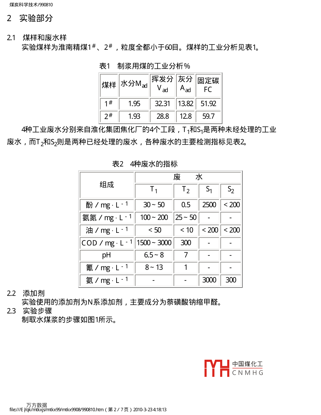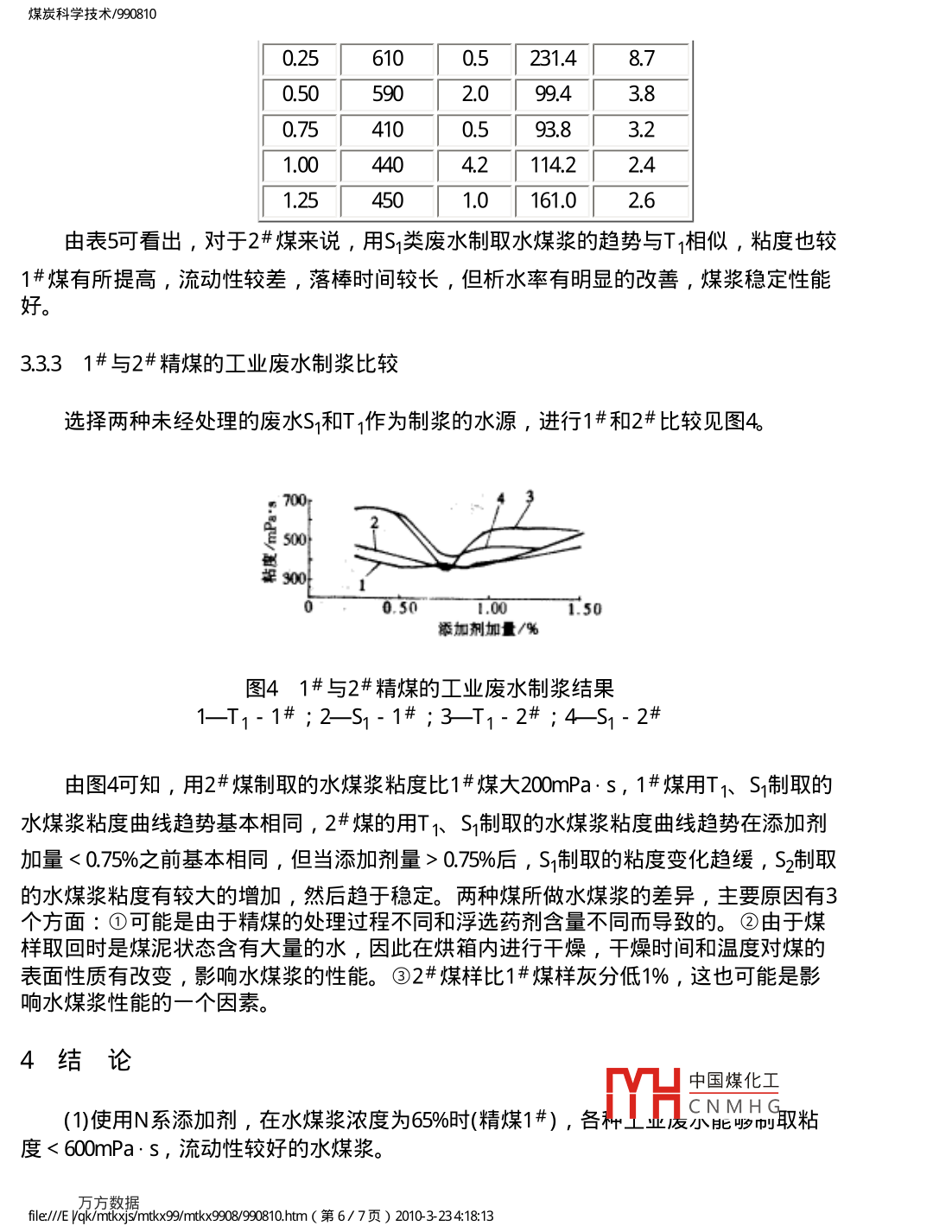 煤炭科學技術/990810煤炭科學技術舊萬數(shù)據資源系統(tǒng)COAL SCIENCE AND TECHNOLOGY數(shù)化期刊WANFANG DAT▲( CHINAINFO1999年第27卷第8期Vol.27No.8199DIGITIZED PERIODICAL焦化廠工業(yè)廢水對水煤漿性能的影響李寒旭李輝帥應泉李軍摘要對蒸餾水、去離子水、自來水和淮化集團焦化廠4種工業(yè)廢水制取水煤漿的性能進行了探討,得岀水質是影響水煤漿性能的一個不可忽略的因素,所選的工業(yè)廢水可以制岀性能較好的水煤漿,特別是在穩(wěn)定性方面比去離子水和自來水還好。關鍵詞水煤漿工業(yè)廢水水質Industrial Waste Water from Coking plantAffected to Features of Coal Water mixtureThis paper has discussion on distilled water, ion removing water, tap water andindustrial waste water from coking plant affected to the features of coal water mixture. Theresults shown that a water quality is a disneglected factor affected to the features of caolwater mixture. The industrial waste water from the coking plant can prepare coal watermixture with good features, especially the stability better than ion removing water and tapwater1概論為了提高水煤漿的性能,研究人員對不同煤種的濃度、粒度、添加劑進行了探討,且得岀了好的制漿條件。隨著工業(yè)的發(fā)展,工業(yè)對環(huán)境造成的污染已漸漸成為影響人們生活質量的重要因素之一。工業(yè)污染中很重要一項就是水質污染,這些污染大部分是由于工業(yè)廢水未加處理排放的結果。工業(yè)廢水的處理增加了生產成本,降低了生產效益。如果用工業(yè)廢水能制取性能良好的水煤漿則既可以減少環(huán)境污染又可以增加制造水煤漿用水來源,具有良好的社會效益和經濟效益。雖然人們對水煤漿進行了廣泛研究,但是專門研究水質影響的文章不多,因為水煤漿是由大約70%煤、29%水和1%左右的添加劑制備的煤、固液分散體系,其中29%6的水是影響水煤漿性能的不可忽略的因素。大多數(shù)專家對水煤漿研究是在蒸餾水或去離子水存在的條件下進行的,而實際生產中不可能用如此多的蒸餾水和去離子水來制備水煤漿。水有地表水、地下水、工業(yè)廢水等各種水質,這些水含有的離子不同、膠體含量不同、水的硬度不同、pH值不同,研究各種水質對水煤漿性能的影響可以為工業(yè)應用尋找合適的水源。工業(yè)廢水種類繁多,本文著重研究了淮化集團公司焦化冂中國煤化工K煤漿性能的影響。YHCNMHGfle∥/ E yak/mtkxjs/mtx9mk×9908990810hm(第1/7頁)2010324:1813煤炭科學技術/9908102實驗部分2.1煤樣和廢水樣實驗煤樣為淮南精煤1#、2#,粒度全都小于60目。煤樣的工業(yè)分析見表1。表1制漿用煤的工業(yè)分析%揮發(fā)分灰分固定碳煤樣水分 Mad v ad Aad FC1#1.9532.31138251922#1932881285974種工業(yè)廢水分別來自淮化集團焦化廠的4個工段,T1和S1是兩種未經處理的工業(yè)廢水,而Tz和S2則是兩種已經處理的廢水,各種廢水的主要檢測指標見表2表24種廢水的指標廢水組成T酚/mg:L130-50052500<200氨氮/mg:L1100025-50油/mg:L1<50<10<200<200COD/mg·L-11500-300030065~87氰/mgL18-13氨/mg:L130003002.2添加劑實驗使用的添加劑為N系添加劑,主要成分為萘磺酸鈉縮甲醛。23實驗步驟制取水煤漿的步驟如圖1所示。中國煤化工CNMHGfle∥/ E yak/mtkxjs/mtx9mk×9908990810hm(第2/7頁)2010324:1813煤炭科學技術/990810稱取添加劑稱取爆樣制溶液屬合攪拌測帖度了[測流動性裝人試管測析水高度落幕實驗圖1水煤漿制取步驟2.4實驗指標(1)粘度:用ND」-刀9型旋轉式粘度計測定。(2)流動性∶在同一漏斗中裝入一定高度的水煤漿記下從開始到滴落完的時間。3)落棒時間:靜置d后的水煤漿,用長26cm質量為37.3g的玻璃棒從液面上落下所測時間即為落棒時間。3結果與討論3.1添加劑加量對廢水制取水煤漿性能的影響為討論其制漿性能,首先探討了不同添加劑加量制取水煤漿的性能,添加劑為N系添加劑,所用煤為洗精煤末1#,粒度小于60目,制取的水煤漿濃度為65%,見圖2。600bx0。06了添加劑加量/%圖2各種工業(yè)廢水對水煤漿粘度的影響1-S2;2—去離子水;3-T1:4-T2;5S1中國煤化工從圖中可以看出,使用N系添加劑,對各種工業(yè)廢水即使在小八0%的情況下,能夠制取粘度<600mPa·s,流動性較好的水煤漿。從圖中可以看岀隨添加劑添fle∥/ E yak/mtkxjs/mtx9mtkx9g8990810hm(第3/7頁)2010323418:13煤炭科學技術/990810加量的增大,各類水制取的水煤漿粘度呈現(xiàn)下降的趨勢,在添加量為0.75%時達到最低,隨后添加劑量的增加粘度又略有上升。各種工業(yè)廢水制取的水煤漿在添加劑加量相同的情況下都比去離子水制取的水煤漿粘度為低,尤以∑2T2為明顯,其中S2與S的粘度曲線變化趨勢基本相同,但S2較之S的粘度有較大的降低,見圖30.200400.600.801001:20添加劑加量/%圖3不同水質對水煤漿析水率的影響一去離子水;2-T1;3-T2:4S2從圖中可以看出,幾種水制取的水煤漿析水率都較高,其中以去離子水的析水率最高,使用廢水后,水煤漿的析水率有不同程度的降低。去離子水的析水率隨添加劑量的增加到一最低點后,又隨添加劑量的進一步增大而略有回升到一穩(wěn)定值。S2廢水與去離子水析水率曲線有相同之處,T1,T2類廢水則是添加劑量的增大開始時變化不大,在添加劑量達到0.5%后則成下降趨勢。這可能是由于工業(yè)廢水中的某些有機物在起作用,也有可能是礦物質在起作用,1#煤中含有某些浮選藥劑,這也可能是造成差別的原因之3.2各種水質制取水煤漿的對比試驗實驗中使用的N系