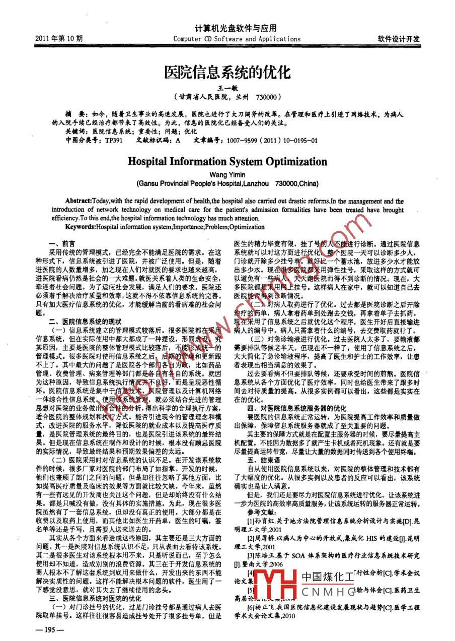 計(jì)算機(jī)光盤(pán)軟件與應(yīng)用2011 年第10期Computer CD Software and Applicat ions軟件設(shè)計(jì)開(kāi)發(fā)醫(yī)院信息系統(tǒng)的優(yōu)化王一教(甘肅省人民醫(yī)院,蘭州730000)捕要:如今,隨著衛(wèi)生事業(yè)的高速發(fā)展,醫(yī)院也進(jìn)行了大刀闊斧的改革。在管理和醫(yī)療上引進(jìn)了網(wǎng)絡(luò)技術(shù),為病人的入院手續(xù)已經(jīng)治療都帶來(lái)了高效性。為此,信息的醫(yī)院化已經(jīng)備受人們的關(guān)注。關(guān)鍵詞:醫(yī)院信息系統(tǒng);重要性;問(wèn)題;優(yōu)化中圍分類號(hào): TP391文獻(xiàn)標(biāo)識(shí)碼: A文章編號(hào): 1007-9599 ( 2011) 10-0195-01Hospital Information System OptimizationWang Yimin(Gansu Provincial People's Hospital,Lanzhou 730000,China)Abstract:Today,with the rapid development of healh,the bospital also carried out drastic reforms.In the management and theintroduction of network technology on medical care for the patien's admission formalities have been treated have broughtefficiency.To this end,the hospital information technology has much attention.Keywords:Hospital information system;lmportance;Problem;Optimization一。前言醫(yī)生的精力畢竟有限,掛了號(hào)的人不能進(jìn)行診斷。通過(guò)醫(yī)院信息采用傳統(tǒng)的管理模式,已經(jīng)完全不能滿足醫(yī)院的需求。在這系統(tǒng)就可以對(duì)這方面進(jìn)行優(yōu)化, 整個(gè)醫(yī)院-一天可以診斷多少人,種形式下,信息系統(tǒng)被引進(jìn)了醫(yī)院,并被廣泛使用。但是,隨著門(mén)診就開(kāi)除多少掛號(hào)單。 就好比一一個(gè)蓄水池,放進(jìn)多少水才能放進(jìn)醫(yī)院的人數(shù)量增多,加之現(xiàn)在人們對(duì)就醫(yī)的要求也越來(lái)越高,出多少水。 現(xiàn)在很多醫(yī)院都采用彈性掛號(hào),采取這樣的方式就可進(jìn)醫(yī)院看病仍然是社會(huì)的一-大難題。就醫(yī)關(guān)系著人類的生命安全,以避免有一些病人,天天跑醫(yī)院而得不到診斷的情況?,F(xiàn)在,大牽連著社會(huì)問(wèn)題。為了適應(yīng)社會(huì)發(fā)展,滿足人們的要求。醫(yī)院還多醫(yī)院都是采用網(wǎng) 上掛號(hào)。這樣病人在家中,就可以知道自己去必須著手解決治療質(zhì)量和效率,這就不得不依靠信息系統(tǒng)的完善。醫(yī) 院能否得到診斷情況。只有加大醫(yī)療信息系統(tǒng)的優(yōu)化,才能緩解當(dāng)前的看病難的社會(huì)問(wèn)(二)對(duì)病人取藥進(jìn)行了優(yōu)化。過(guò)去都是醫(yī)院診斷之后開(kāi)除題.治療的藥單,病人拿著藥單到處跑去交錢(qián),再拿著單子去抓藥。二、醫(yī)院信息系統(tǒng)的現(xiàn)狀現(xiàn)在采用了信息系統(tǒng)之后就優(yōu)化這個(gè)程序,醫(yī)生開(kāi)好后直接輸進(jìn)(一)信息系統(tǒng)建立的管理模式較落后。很多醫(yī)院都在采用病人的編號(hào)中。 病人只需拿著什么的編號(hào),去交費(fèi)取藥就行了。信息系統(tǒng),但在實(shí)際使用中都大都成了一一種擺設(shè),形同虛設(shè)。究(三)對(duì)急診輸液進(jìn)行優(yōu)化。過(guò)去醫(yī)院人太多了,要輸液都其原因,主要是醫(yī)院的整體管理模式比較落后,不能形成統(tǒng)一] 需要排隊(duì)等候老半天。但現(xiàn)在不一樣了,使用了信息系統(tǒng)之后,管理模式。很多醫(yī)院對(duì)使用信息系統(tǒng)之后,后期的管理和更新跟大大簡(jiǎn)化了 急診輸液程序,提高了醫(yī)生和護(hù)士的工作效率,讓患不上了。其中最大的問(wèn)題了是醫(yī)院各個(gè)部門(mén)各自為政,比如藥品者表現(xiàn) 出相當(dāng)滿意的效果了。管理、收費(fèi)管理、病案管理等部門(mén)都是各自有各自的系統(tǒng)。就因過(guò)去要看病不但要排隊(duì)等候,還要承受時(shí)間的煎熬。醫(yī)院信為這種原因,導(dǎo)致信息系統(tǒng)執(zhí)行情況并不良好,而是呈現(xiàn)惡性循息系統(tǒng)從各 個(gè)方面優(yōu)化了醫(yī)療效率,同時(shí)也給醫(yī)生帶來(lái)了跟多時(shí)環(huán)。醫(yī)院信息系統(tǒng)是集中于信息技術(shù)、醫(yī)院管理以及計(jì)算機(jī)網(wǎng)絡(luò)間去對(duì)待 質(zhì)量的提高。從很多實(shí)例都可以看出,這些都是實(shí)實(shí)在一體綜合性信 息系統(tǒng)。使用該系統(tǒng)管理,就必須結(jié)合先進(jìn)的管理在的優(yōu)化。思想對(duì)醫(yī)院的業(yè)務(wù)做出綜合性的分析,得出科學(xué)的合理執(zhí)行方案,四、對(duì)醫(yī)院信息系統(tǒng)服務(wù)器的優(yōu)化適合醫(yī)院的整體規(guī)劃和執(zhí)行方式。能否引進(jìn)現(xiàn)今的管理理念和模要醫(yī)院的信息系統(tǒng)正常運(yùn)轉(zhuǎn),為醫(yī)院提高工作效率和質(zhì)量做式,改進(jìn)醫(yī)院的服務(wù)水平,降低醫(yī)院的就業(yè)成本以及提高醫(yī)療質(zhì)出保障, 保障信息系統(tǒng)服務(wù)器就成了至關(guān)重要的問(wèn)題。量,是醫(yī)院管理系統(tǒng)的最終目的,也是醫(yī)院引進(jìn)該系統(tǒng)的最終結(jié)其主要的保障方式就是在配置主服務(wù)器的時(shí)候,要盡量提高主果。但是現(xiàn)在信息系統(tǒng)在制作和設(shè)計(jì)的時(shí)候,根本沒(méi)有顧忌醫(yī)院機(jī)配置。 不能因?yàn)閿?shù)據(jù)多了就產(chǎn)生卡機(jī)或者死機(jī)現(xiàn)象。還有就是要的實(shí)際情況,導(dǎo)致最終結(jié)果