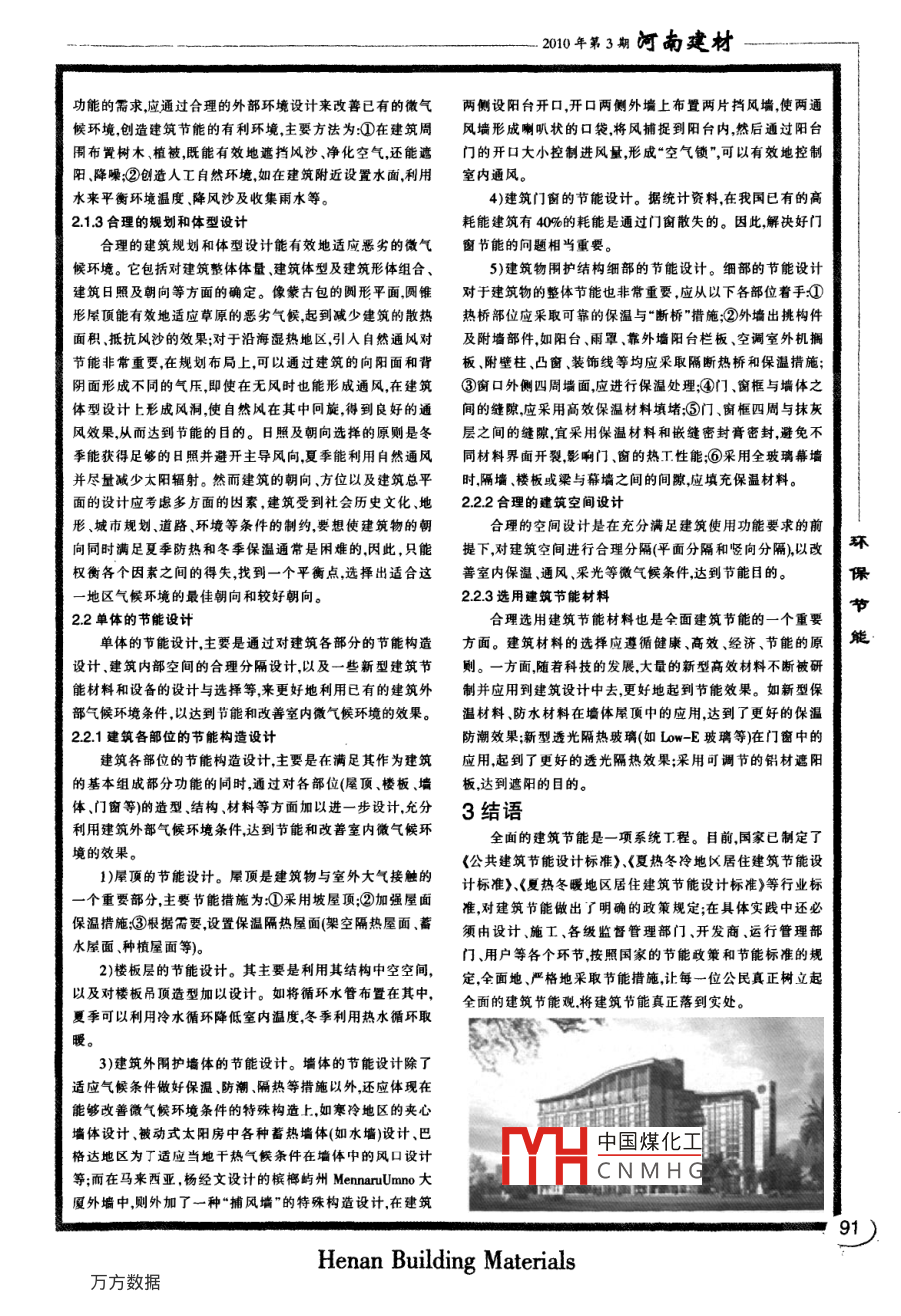河南建樹010年第3期建筑節(jié)能的重要性及建筑的節(jié)能設計常婧瑩遼寧地質工程職業(yè)學院(18008)要:本丈從建筑節(jié)能的基礎出發(fā),對建筑節(jié)能設計方面進行了探索。關鍵詞;建筑節(jié)能;建筑節(jié)能設計;重要性0引言料生產能耗約13%,建筑總能耗已達全國能源總消耗量的建筑節(jié)能是整個建筑全壽命過程中每一個環(huán)節(jié)節(jié)能的45%。我國現有建筑面積為400多億平米絕大部分為高能總和。它是指建筑在選址、規(guī)劃、設計、建造和使用過程中通耗建筑且每年新建建筑近20億平米其中95%以上仍是高過合理的規(guī)劃設計釆用節(jié)能型的建筑材料、產品和設備,執(zhí)能耗建筑。如果繼續(xù)執(zhí)行節(jié)能水平較低的設計標準將留下行建筑節(jié)能標準加強建筑物節(jié)能設備的運行管理合理設很重的能耗負擔和治理困難。龐大的建筑能耗已經成為國計建筑圍護結構的熱工性能提高采暖、制冷、照明、通風、給民經濟的巨大負擔。因此建筑行業(yè)全面節(jié)能勢在必行。排水和管道系統(tǒng)的運行效率,以及利用可再生能源在保證2建筑節(jié)能設計的重要性建筑物使用功能和室內熱環(huán)境質量的前提下降低建筑能源建筑節(jié)能設計是全面的建筑節(jié)能中一個很重要的環(huán)節(jié),消耗合理、有效地利用能源。有利于從源頭上杜絕能源的浪費環(huán)1建筑節(jié)能的重要性2.1整體及外部環(huán)境的節(jié)能設計目前世界范圍內石油、煤炭、天然氣三種傳統(tǒng)能源日趨建筑整體及外部環(huán)境設計是在分析建筑周圍氣候環(huán)境枯竭人類將不得不轉向成本較高的生物能、水利、地熱、風條件的基礎上,通過選址、規(guī)劃、外部環(huán)境和體型朝向等設力、太陽能、核能而我國的能源問題更加嚴重計,使建筑獲得一個良好的外部微氣候環(huán)境達到節(jié)能的目能我國能源發(fā)展主要存在四大問題①人均能源擁有量低的儲備量低②能源結構依然以煤為主約占75%全國年耗煤211合理選址量已超過13億噸③能源資源分布不均主要表現在經濟發(fā)建筑選址主要是根據當地的氣候、土質、水質地形及周達地區(qū)能源短缺和農村商業(yè)能源供應不足造成北煤南運、西圍環(huán)境條件等因素的綜合狀況來確定。建筑設計中既要使氣東送、西電東送④能源利用效率低能源終端利用效率僅建筑在其整個生命周期中保持適宜的微氣候環(huán)境為建筑節(jié)為33%,比發(fā)達國家低10%。能創(chuàng)造條件同時又要不破壞整體生態(tài)環(huán)境的平衡。隨著城市建設的高速發(fā)展我國的建筑能耗逐年大幅度21.2合理的外部環(huán)境設計上升已達全社會能源消耗量的32%加上每年房屋建筑材在建筑位置確定之后應研究其微氣候特征。根據建筑4廢棄鋼材、鋼筋及廢金屬材料再利用在建筑垃圾再生利用上的經驗,加強政策上的引導和鼓勵,或回爐加工積極地進行科學試驗研究,尋求符合國情的建筑垃圾再生用模式。將廢棄的鋼材、鋼筋等金屬材料從建筑垃圾中分離出來,直接用于小型或臨時的建筑設施也可以回爐后加工生參考文獻:產新產品。秦健,趙建新建筑垃規(guī)渣土在世博園區(qū)道略工程中的應5生產再生磚用中國市政工程20903隨著清潔燃燒技術的推廣,高硫石油焦渣作為循環(huán)流以]丁樹謙建筑垃規(guī)循環(huán)利用現狀及基本途徑門環(huán)境與可化床鍋爐(CFB燃燒產物,產量逐漸增加。將廢舊建筑物磚瓦持續(xù)發(fā)展,2009,03(如墻體、屋頂等)和混凝土(如道路、大型建筑物中的基礎、③]張晨霞淺談建筑垃圾的再生利用圓內蒙古科技與經濟,梁、板、柱等)收集、破碎至粒徑<8mm的顆粒作為再生磚的2009,No.14骨料,以高硫石油焦渣、粉煤灰等工業(yè)廢渣為膠結材料,制{4夏慧慧,王堅李巍建筑垃圾在路基處理中的應用城備高性能再生磚中國煤化工16小結]孫焦渣和建筑垃圾制CNMH建筑垃圾的再生利用還處于起步階段各地區(qū)也出現了建筑垃圾循環(huán)利用的工程試點但還需要積極吸取發(fā)達國家lenan Building Materials2010年第3期河劫建材功能的需求應通過合理的外部環(huán)境設計來改善已有的微氣兩側設陽臺開口,開口兩側外墻上布置兩片擋風墻使兩通候環(huán)境創(chuàng)造建筑節(jié)能的有利環(huán)境,主要方法為①在建筑周墻形成喇叭狀的口袋將風捕捉到陽臺內然后通過陽臺圍布置樹木、植被既能有效地遮擋風沙、凈化空氣還能遮門的開口大小控制進風量形成“空氣鎖”,可以有效地控制陽、降噪②創(chuàng)造人工自然環(huán)境如在建筑附近設置水面利用室內通風水來平衡環(huán)境溫度、降風沙及收集雨水等4)建筑門窗的節(jié)能設計。據統(tǒng)計資料在我國已有的高21.3合理的規(guī)劃和體型設計耗能建筑有40%的耗能是通過門窗散失的。因此解決好門合理的建筑規(guī)劃和體型設計能有效地適應惡劣的微氣窗節(jié)能的問題相當重要。候環(huán)境。它包括對建筑整體體量、建筑體型及建筑形體組合、5)建筑物圍護結構細部的節(jié)能設計。細部的節(jié)能設計建筑日照及朝向等方面的確定。像蒙古包的圓形平面圓錐對于建筑物的整體節(jié)能也非常重要,應從以下各部位著手①形屋頂能有效地適應草原的惡劣氣候起到減少建筑的散熱熱橋部位應采取可靠