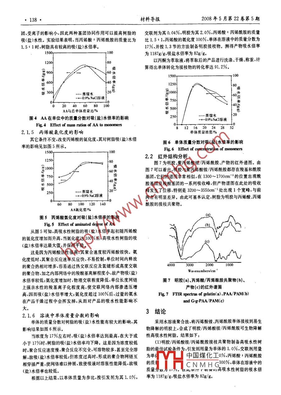 136·材料導(dǎo)報2008年5月第22卷第5期明膠接枝共聚丙烯酸銨-丙烯酰胺董奮強1,崔英德2,胡軍楚],李妮妮,何春林廣東工業(yè)大學(xué)輕工化工學(xué)院,廣州510006;2仲愷農(nóng)業(yè)技術(shù)學(xué)院化學(xué)與化工系,廣州510225)摘要研究了溶液聚合法制備明膠-聚〔丙烯酸銨丙烯酰胺)( G-g-PAA/PAM)可降解高水性樹脂的方法。對明膠/單體及丙烯酸銨/丙烯酰胺質(zhì)量比、丙烯酸中和度、單體濃度及N,N-亞甲基雙丙烯酰胺和過硫酸鉀相對含量影響產(chǎn)品吸(鹽)水性能的情況進行測試,從中優(yōu)選出較合適的反應(yīng)條件,并用紅外光譜對產(chǎn)物進行表征。該高吸水性樹脂的吸水倍率達1187g/g,吸鹽水倍率達82g/g。FTIR分析表明,反應(yīng)產(chǎn)物為明膠與丙烯銨、丙烯酰胺的接枝共聚物關(guān)鍵詞明膠丙烯酸銨丙烯酰胺接枝高吸水性樹脂可生物降解Preparation of Biodegradable Gelatin-g-Poly(AmmoniumAcrylate-co-AcrylamideDONG Fenqiang, CUI Yingde, HU Junchu, LI Nini, HE Chunlin(1 Faculty of Light Industry and Chemical Engineering, Guangdong University of Technology, Guangzhou 510006;2 Department of Chemistry and Chemincal Engneering, Zhongkai University of Agriculture and Technology, Guangzhou 510225)Abstract Poly( ammonium acrylate-co-acrylamide) grafted gelatin with high water absorbency and biodegradability is synthesized. The suitable condition of synthesis is chosed by estimating the effects of the mass ratio of gelatinto monomers and ammonium acrylate to acrlyamide degree of neutralization of acrylic acid, the concentration of mono-mers in solution and relative mass of N, N-methylene bis acrylamide or potassium persulphate to monomers on the wa-ter absorbency of products. The experimental results show that the product would be provided with the most water alsorbency of 1187g/g and 0. 9%NaCl solution of 82g/g. FtiR spectrum of the product indicates that it is gelatin-g-poly(ammonium acrylate-coracrylamide)Key word gelatin, ammonium acrylate, acrylamide, graft, superabsorbent resin, biodegradable高吸水性樹脂作為一種功能性高分子材料已廣泛應(yīng)用于醫(yī)餾)明膠(化學(xué)純青島明膠廠,105℃烘箱中干燥至恒重),25%疔衛(wèi)生農(nóng)林建筑環(huán)境等領(lǐng)域中。其中丙烯酸系高吸水性樹脂因氨水(分析純,廣東光華化學(xué)廠有限公司),過硫酸鉀(分析純,廣其吸水倍率高且成本低而受到廣泛的關(guān)注但其生物降解性差目州化學(xué)試劑廠),丙酮(分析純,天津市紅巖化學(xué)試劑廠),氯化鈉前研究較多的為丙烯酸接枝共聚物如淀粉纖維素殼聚糖海藻(分析純成都市聯(lián)合化工試劑研究所),鄰苯二甲酸氫鉀(分析酸等接枝丙烯酸制備高吸水性樹脂1-。聚谷氨酸雖然具有非常純,成都化學(xué)試劑廠),N,N-亞甲基雙丙烯酰胺(分析純天津高的吸水性能和可完全生物降解性但成本太高市新純化學(xué)試劑研究所)。明膠是一種具有蛋白質(zhì)結(jié)構(gòu)的兩性高分子聚電解質(zhì)具有1.2實驗儀器優(yōu)良的生物降解性能在感光材料、醫(yī)藥、食品、紡織涂料、建C86型電熱恒溫水浴鍋(廣州越秀醫(yī)療器械廠),FA2104材染料電子工業(yè)化妝品等領(lǐng)域得到廣泛應(yīng)用,其接枝共聚型電子天平(上海良平儀器儀表有限公司),JB50D型增力電動研究也很多1,但以明膠接枝共聚丙烯酸銨丙烯酰胺制備攪拌器(江蘇榮華),101-2型電熱鼓風(fēng)干燥箱(上海盧南科學(xué)化高吸水性樹脂的研究還未見報道。工聯(lián)營廠), Nicolet380FTR紅外光譜儀( Thermo Electron公本研究擬通過制備這種高吸水性樹脂,在賦予產(chǎn)品可生物司),SHzⅢ型真空泵(廣東真空設(shè)備廠)。降解性能的同時,引入具有肥效性的氮元素使之在農(nóng)林業(yè)保1.3明膠接枝產(chǎn)物的制備水應(yīng)用方面也有較好的前景。在50mL燒杯中加入一定量的明膠及少量水,加熱使明膠實驗溶解冷卻至室溫。按照實驗條件加人適量丙烯酸,在冰水浴中邊攪拌邊緩慢加入一定量氨水溶液丙烯酰胺、交聯(lián)劑和水最1.1實驗試劑后加入引發(fā)劑,然后放進烘箱控制反應(yīng)溫度為60℃,持續(xù)4h,丙烯酰胺(AM分析純,海凌峰化學(xué)試劑有限公司),丙烯再于1中國煤化工色粉狀粗產(chǎn)品酸(AA,化學(xué)純天津市科密歐化學(xué)試劑開發(fā)中心,經(jīng)減壓蒸二分離24h,洗去反應(yīng)產(chǎn)CNMHG國家自然科學(xué)基金(20376087);廣東省自然科學(xué)基金(033307)董奮強:男,1963年生,副高,碩士,主要從事高分子材料研究Tel:020-3932239E-mail:dfg@gdut.edu.cn明膠接枝共聚丙烯酸銨丙烯酰胺/重奮強等·137·物中殘留的試劑、寡聚體等,40℃真空干燥至恒重得到純化的當(dāng)交聯(lián)劑用量為單體用量的0.005%~0.05%時,產(chǎn)品的接枝共聚物。吸水能力很大,繼續(xù)增大時,吸水倍率快速降低。但吸鹽水率在單體接枝共聚到明膠上的轉(zhuǎn)化率按式(1)計算整個實驗范圍內(nèi)隨交聯(lián)劑增加而降低。這是因為隨交聯(lián)劑用單體轉(zhuǎn)化率=純化產(chǎn)品質(zhì)量。原明膠質(zhì)量×109%量的增加案合物通過交聯(lián)形成的網(wǎng)絡(luò)結(jié)構(gòu)趨于完善可溶性鏈段逐漸減少,但彈性收縮壓卻逐漸增加,導(dǎo)致交聯(lián)劑在0.04%時樹脂的吸水率最大。而鹽水因為在降低滲透壓的同時增加了1.4性能測試網(wǎng)絡(luò)的彈性收縮壓使樹脂在較本實驗交聯(lián)劑用量更低時才可1.4.1吸水倍率能出現(xiàn)極高吸鹽水倍率因而在本實驗范圍內(nèi),隨交聯(lián)劑