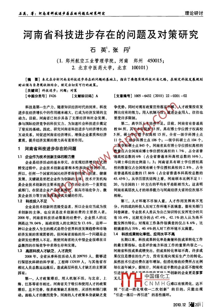 石美,等:河南省科技進步存在的問題及對策研究理論研討河南省科技進步存在的問題及對策研究石英,張丹(1.鄭州航空工業(yè)管理學院,河南鄭州450015;2.北京中醫(yī)藥大學,北京100101)[摘要]本文在分析河南省科技進步存在的問題的基礎上,指出了要想實現(xiàn)科技興省之路,在制定科技發(fā)展規(guī)劃時必須與自身現(xiàn)狀相結合,制定出切實可行的政策。[關鍵詞]科技進步;問題;對策[中圖分類號] F426[文獻標識碼] A[文章編號] 1005 -6432 (2010) 22 -0201 -02科技是第一-生產力,隨著知識經濟時代的到來,科技爭優(yōu)勢。同時對現(xiàn)有政策宣傳落實不夠,人才政策沒有發(fā)進步在經濟增長中的作用越來越大,已成為經濟發(fā)展的主揮出應有的效力。用人機制不活,就連企業(yè)用人,往往也動力。目前,河南省已初步具備了支撐經濟和社會發(fā)展、要受許多限制。參與國際經濟競爭的科技實力,為加速社會科技進步奠定第二,高學歷人才培養(yǎng)不足。目前,河南省有普通高了堅實的基礎。因此,研究河南省科技進步與經濟增長的校84所,其中本科院校33所,具有博士學位授予權高?;雨P系,對促進河南省經濟增長,增強企業(yè)素質和經濟5所,碩士學位授予權高校15所。全省- -級學科博士點素質,提升經濟發(fā)展的潛力具有重要作用。11個,二級學科博士點106個;一級學科碩士點104個,二級學科碩士點845個。河南省具有博士學位授權高校的1河南省科技進步存在的問題數(shù)量僅占全國現(xiàn)有博士學位授權高校的1.7%,占全省普1.1 企業(yè)作為技術創(chuàng)新主體的能力差通高校總數(shù)的6% (占全省普通本科高??倲?shù)的16%),企業(yè)是經濟活動的基本單元,在實現(xiàn)經濟增長方式的與碩士單位的比例是1: 3;河南省具有碩士學位授權高轉變過程中,企業(yè)技術創(chuàng)新起著根本性和決定性的作用。校的數(shù)量僅占全國現(xiàn)有碩士學位授權高校的2.8%,占全所以,任何一個國家的國民經濟要保持持續(xù)、快速、健康省普通高??倲?shù)的17. 86% (占全省普通本科高校總數(shù)的發(fā)展,關鍵就是要把企業(yè)作為創(chuàng)新的主體。技術開發(fā)機構45. 45%)。從學歷層次結構上看,河南碩本比例不足1:是企業(yè)技術創(chuàng)新的主要承擔者,它作為企業(yè)的- -個重要組20,與全國的1: 10 左右的平均水平差距相當大。這表明成部門,在促進企業(yè)產品更新?lián)Q代、提高市場競爭力、激河南省高層次人才的培養(yǎng)能力與河南經濟大省的位次很不發(fā)企業(yè)活力等方面發(fā)揮著極其關鍵的作用。相稱。1.2科技投入不足第三,人才環(huán)境不盡如人意,人才作用發(fā)揮尚不充企業(yè)是技術創(chuàng)新的直接受益者,所以企業(yè)應當成為技分。約四成的科技人員對工作環(huán)境不甚滿意。據(jù)有關部門術創(chuàng)新的主體,也應該是技術創(chuàng)新經費的主要投人者。問卷調查,專業(yè)技術人員認為自己知識特長發(fā)揮充分的只2008年,河南省科技活動籌集的經費中,企業(yè)投入的比有10.4%,比較充分的占47.4%, 42. 1%的人認為尚不例高達79. 04%,而政府投入的比例僅為13.6%,這樣- -能發(fā)揮出特長;對現(xiàn)有工作條件很滿意的僅占8.6%,比種以企業(yè)投人為主的模式是符合世界科技發(fā)展趨勢和市場較滿意的占5|% , 40. 4%的人對T作環(huán)境不太滿意。經濟發(fā)展的客觀需要的。但河南省面臨的另-一個問題是企1.4 科技成果轉化率低、應用水平不高業(yè)研發(fā)經費投人不足,致使河南省的大中型企業(yè)很難在日長期以來,科技成果轉化率是衡量科技成果轉化工作益激烈的市場競爭中求得生存和發(fā)展。的最主要指標,也是評價地方科技工作的重要內容之- -。1.3高層科技人才缺乏, 人才流失河南省科技成果成績突出,但成果轉化率卻不高,許多成2008年,全省從事科技活動人員209793人,能夠進果僅僅是潛在的生產力,沒有實現(xiàn)向現(xiàn)實生產力的轉化。行深層次科研的科學家、工程師132939 人,與其他省市雖然技術引進經費在逐年增加,但消化吸收經費所占比例相比人員總數(shù)遠遠落后。造成高層科技人才缺乏的主要原卻在逐年減少。據(jù)統(tǒng)計,河南有近半數(shù)的企業(yè)還不能吸收因有:手創(chuàng)新的企業(yè)更是寥寥中國煤化工第一,人才政策滯后,用人機制不活。與北京、上無幾海、江蘇等省市相比,河南省關于吸引和使用人才的政策YHCN M H G難以有效消化,達不滯后,且不完善,很多政策缺乏系統(tǒng)性、靈活性和部門聯(lián)到“引進一-消化吸收-二次創(chuàng)新”的目的,只能出現(xiàn)動。面臨人才的激烈競爭,河南的人才政策本身就缺乏競“引進- 落后一再引進"的惡性循環(huán)。2010.12 [M201]理論研討中國市場2010年第48期 (總第607期)2.4營造良好的科技環(huán)境和條件2對策科研體制的改革要適應以下“三個轉變”:“ 創(chuàng)新主2.1拓寬科技投入渠道, 建立多元化的科技投入體系體多元化”一實現(xiàn)創(chuàng)新主體由單 - -科研部門向多元化財政科研投人要爭取達到國家有關規(guī)定。政府要選擇轉變,尤其要突出企業(yè)這一市場主體的核心作用;“創(chuàng)新一批關系河南省經濟結構調整的重大科技攻關項目實行財過程集成化" -實現(xiàn)創(chuàng)新過程 由發(fā)明研究的“ 線型模政重點扶持。改變政府資金