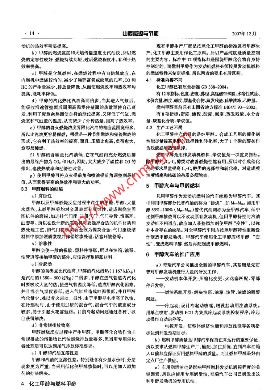 山西能源與節(jié)能2007年第4期(總第47期)SHANXI ENERGY AND CONSERVATION2007年12月出版甲醇汽車與甲醇燃料錢新榮(中國(guó)科學(xué)院山西煤炭化學(xué)研究所,山西太原030001)摘要:甲醇是含氧燃料之一,它同傳統(tǒng)的汽油存在一定的差別,因此設(shè)計(jì)制造甲醇發(fā)動(dòng)機(jī)和甲醇汽車都應(yīng)考慮甲醇的特性,同時(shí)甲醇汽車所使用的燃料必須符合燃料甲醇質(zhì)量標(biāo)準(zhǔn),以保證發(fā)動(dòng)機(jī)的正常運(yùn)行。關(guān)鍵詞:汽車;燃料;甲醇;汽油中圖分類號(hào):TQ223.12*1文獻(xiàn)標(biāo)志碼:A汽油的特性進(jìn)行的。汽油是Ce-Cu的烴類混合物,其沸程范1奇瑞甲醇一 -汽油燃料轎 車的成功開發(fā)圍寬達(dá)35 C~ 200 e,甲醇是單- -沸點(diǎn)(65 C )的化合物,奇瑞汽車有限公司對(duì)國(guó)內(nèi)外甲醇汽車研制開發(fā)狀況進(jìn)兩者的物理化學(xué)性質(zhì)比較如表1所示。行大量的前期調(diào)研工作,接著又投入了1 600萬(wàn)元資金進(jìn)行表1甲醇和汽油的物理化學(xué)性質(zhì)發(fā)動(dòng)機(jī)和整車的研制,經(jīng)過(guò)不斷努力,終于成功開發(fā)了擁有性質(zhì)甲醇汽油自主知識(shí)產(chǎn)權(quán)的奇瑞一新旗云牌甲醇- -汽油燃料轎車。此前|分子式CH,0H Cr C。的碳?xì)浠衔镂覈?guó)甲醇汽車的研究示范工作重點(diǎn)是在各種比例甲醇的摻相對(duì)分子質(zhì)量32.04約100燒以及“在用車”的改裝上,這次奇瑞公司推出的甲醇轎車元素質(zhì)量組成1%填補(bǔ)了我國(guó)自主生產(chǎn)甲醇汽車的空白,開創(chuàng)了我國(guó)推廣應(yīng)C9。碳?xì)浠衔镉眉状计嚨男戮置妗?75奇瑞公司在山西太原對(duì)新車進(jìn)行為期數(shù)月的道路行車試(密度( 20C )/(kgL)0.7920.73驗(yàn),取得了滿意的試驗(yàn)結(jié)果。2007年6月11日在太原市召開了| 冰點(diǎn)C-96.0<-60山西評(píng)價(jià)會(huì)受到與會(huì)的國(guó)家發(fā)改委,國(guó)內(nèi)汽車行業(yè)及醇汽部門|沸點(diǎn)心64.727-225的領(lǐng)導(dǎo)、專家們的高度評(píng)價(jià),并建議今后繼續(xù)擴(kuò)大試驗(yàn)規(guī)模,為| 汽化熱/( kJkg)1167293-841甲醇汽車的批量生產(chǎn)和產(chǎn)業(yè)化積累更多的經(jīng)驗(yàn)和技術(shù)依據(jù)。燃燒熱/(kJ/kg)19930430302汽車與燃料| 蒸汽壓( 38C )mmHg239362~77519世紀(jì)人們根據(jù)熱力學(xué)熱能功轉(zhuǎn)化定律發(fā)明了內(nèi)燃水中溶解度1( m/L)互溶100-200機(jī),其中汽油機(jī)的“奧托(otto )循環(huán)”是內(nèi)燃機(jī)的循環(huán)之一,| 閃點(diǎn)rC .26.亦即利用液體或氣體燃料,直接在氣缸中燃燒爆震,產(chǎn)生巨蒸汽密度( 101325kPa1OC )(@/L).42-5大的壓力,推動(dòng)活塞往復(fù)運(yùn)動(dòng),再由曲軸轉(zhuǎn)化為平面移動(dòng)作I燃燒上限功,內(nèi)燃機(jī)是汽車的“心臟”,而燃料則是產(chǎn)生“能量"的“血體積分?jǐn)?shù)1%36.57.6溫度心C43-13--12液”,兩者是相互依存而密不可分的。柴油機(jī)是依據(jù)"Diesel循環(huán)”也是利用燃料燃燒產(chǎn)生的燃燒下限體積分?jǐn)?shù)/%5.014能量轉(zhuǎn)化為對(duì)外作功,不論是汽油機(jī)還是柴油機(jī)都要依據(jù)所溫度心7用燃料的特性如沸程、蒸汽壓抗爆性等選擇合理的參數(shù)進(jìn)自然溫度rC500456行內(nèi)燃機(jī)各部件的設(shè)計(jì)。| 辛烷值112(RON) 70-90( MON)| 理論混合氣進(jìn)氣溫度心122.421.63汽油與甲醇| 理論混合氣熱值(kJhg)265027803.1汽油和甲醇的物理化學(xué)性質(zhì)比較| 理論空燃比1(kgkg).514.8汽油是發(fā)動(dòng)機(jī)的傳統(tǒng)燃料,發(fā)動(dòng)機(jī)的設(shè)計(jì)制造都是按|層流燃燒速度1( m/s )523收稿日期:2007-07-25作者簡(jiǎn)介:錢新榮(1934- ),男 ,江蘇無(wú)錫人,1956年畢業(yè)3.2 甲醇的特點(diǎn)a)辛烷值比汽油高,因此可以提高發(fā)動(dòng)機(jī)的壓縮比,發(fā)于天津大學(xué)化工系,研究員?!?4●山西能源與節(jié)能2007年12月動(dòng)機(jī)的熱效率明顯提高。現(xiàn)有甲醇生產(chǎn)廠都是按照化工甲醇的標(biāo)準(zhǔn)進(jìn)行甲醇生b)甲醇的燃燒速度和火焰?zhèn)鞑ニ俣缺绕涂?所以燃產(chǎn),化工甲醇主要用作化工原料。所以產(chǎn)品純度是質(zhì)量控制燒的定容性較好,燃燒持續(xù)期短,過(guò)后燃燒程度小,有利于熱的主要內(nèi)容,標(biāo)準(zhǔn)中12項(xiàng)指標(biāo)都是圍繞甲醇化合物自身特效率提高。性制定的。而燃料甲醇作為發(fā)動(dòng)機(jī)燃料必須按照發(fā)動(dòng)機(jī)燃料c)甲醇是含氧燃料,在燃燒過(guò)程中有自供氧效應(yīng),在的燃燒特性來(lái)制定標(biāo)準(zhǔn),所以兩者的要求有所區(qū)別。內(nèi)燃機(jī)中燃燒較均勻,減少了局部富氧或缺氧的幾率,CO和4.1 標(biāo)準(zhǔn)內(nèi)容不同HC的產(chǎn)生量減少,排放量降低,從而使燃燒效率和熱效率均化工甲醇已有質(zhì)量標(biāo)準(zhǔn)GB 338- -2004。提高,能耗率降低。有12項(xiàng)指標(biāo):色度、密度沸程高錳酸鉀試驗(yàn)水溶性試驗(yàn)、d)甲醇的汽化熱比汽油高兩倍多,當(dāng)其進(jìn)入氣缸后,水份含量、酸度堿度羰基化合物蒸發(fā)殘?jiān)蛩嵯礈臁⒁掖剂?。能吸收沿途管壁面后周圍高溫零件壁面的熱量而使自己蒸燃料甲醇目前只有山西省地方?biāo)準(zhǔn)DBI4/T 93- 2002。發(fā),利用了廢熱余熱而使自身的能位提高,又降低了氣缸、燃有8項(xiàng)