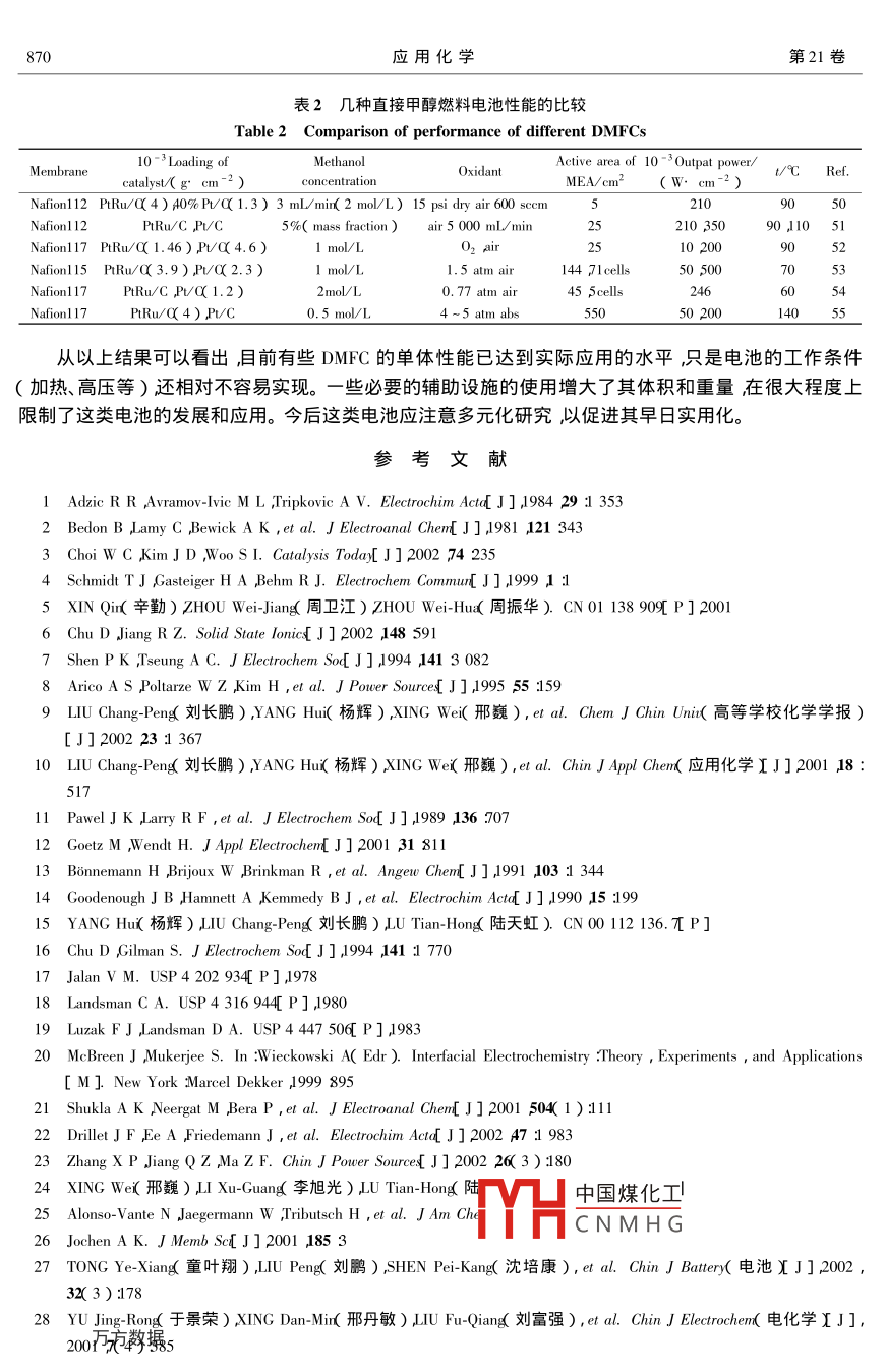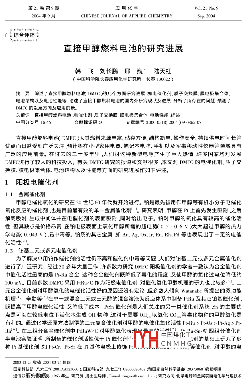 第21卷第9期應用化學Vol 21 No 92004年9月CHINESE JOURNAL OF APPLIED CHEMISTRYsep.2004f綜合評述直接甲醇燃料電池的研究進展韓飛劉長鵬邢巍′陸天虹中國科學院長春應用化學研究所長春130022)摘要綜述了直接甲醇燃料電池DMFC)的幾個方面研究進展如電催化劑、質子交換膜、膜電極集合體電池結構以及電池性能等論述了直接甲醇燃料電池的國內外研究現(xiàn)狀及進展分析了所存在的問題預測了DMFC的發(fā)展方向及應用前景關鍵詞直接甲醇燃料電池虍催化劑質子交換膜膜電極集合體電池性能綜述中圖分類號646文獻標識碼∶文章編號】0000518(2004)9086507直接甲醇燃料電池DMFC)以其燃料來源豐富、儲存方便、結構簡單、操作安全、持續(xù)供電時間長等優(yōu)點而日益受到廣泛關注預計將在小型家用電器、筆記本電腦、手機以及軍事移動性儀器等領域具有廣泛的應用前景。在過去的二十多年里,人們對這種新型電源產生了巨大熱情,許多國家均對發(fā)展DMFC進行了較大的科技投入。有關DMFC研究的報道和文獻很多本文對DMFC的電催化劑、質子交換膜、膜電極集合體、電池結構以及性能等方面的研究進展作如下評述。1陽極電催化劑1.1金屬催化劑甲醇電催化氧化的研究在20世紀60年代就開始進行。鉑是最先被用作甲醇等有機小分子電催化氧化反應的催化劑也是目前最有效的單一金屬催化劑。研究表明甲醇在Pt上首先發(fā)生吸附之后解離吸附生成中間體并在電催化劑的表面吸附同時給出電子。鉑對甲醇的氧化具有較高的催化活性但其缺點是價格昂貴在鉑電極表面上氧化甲醇所需的超電教(0.5~0.6ⅴ)大大超過甲醇的熱力學電(0.043V)易中毒等。鉑系的其它金屬如Au、Ag、Os、Ir、Ru、Rh、Pd等也表現(xiàn)出了一定的電催化活性1.2鉑基二元或多元電催化劑為了解決單用鉑作催化劑的活性仍不高和催化劑中毒等問題人們對鉑基二元或多元金屬催化劑進行了廣泛研究。經(jīng)過30多年大量工作許多致力研究DMFC陽極催化劑的學者一致認為合金催化劑中催化活性最高的是P-lu合金這種合金催化劑既降低了毒化的程度又使甲醇的氧化過電位降低約100mV。目前多數(shù)DMFC采用PRu/C作為陽極電催化劑對催化氧化甲醇機理的研究也比較多3。元合金催化劑對甲醇氧化的電催化活性好的原因還沒有定論但多數(shù)人傾向 Watanabe所提出的雙功能機理4。辛勤等3在單一或混合二元或三元醇的混合溶液為反應體系中制備PRu及其它鉑基催化劑,既提高了甲醇電催化活性又降低了成本。PSn催化劑是人們關注的另一類催化劑系統(tǒng)Sn的主要優(yōu)點是可以在較低電位下活化水生成OH物種這對于需要OH以氧化CO…等毒化物種的甲醇氧化是有利的。通過化學還原方法制得的二元復合催化劑對甲醇的電催化氧化活性PtRu>PtOs>Pt-Ag>PtR6。在三組分合金催化劑中 PtRuW/c對甲醇氧化表出是亨竹汗1PuSn-W四組分催化劑半電池實驗證明所制備的催化劑活性優(yōu)于P催化劑中國煤化工劑的基礎上研究了多種P基催化劑如Pt-Cr、PtSr在T基體電極上修飾PCNMH等催化劑對甲醇的電2003-12-23收稿200403-25修回國家科技部八六三"(2001AA323060)國家科技部九七三"(G200006408)和國家自然科學基金(20373068)資助項目通訊聯(lián)系店男1963年生研究員博士生導師;E- mail xingweic@ciac.cm;研究方向北學電源和金屬表面電化學處理技術866應用化學第21卷催化氧化都表現(xiàn)出了比Pt催化劑高的活性。1.3其它催化劑用金屬或金屬氧化物修飾的鉑催化劑存在的問題之一就是表面生成的氧化物導電性低含稀土元素的鈣鈦礦型ABO3氧化物導電性能較好表面富氧對甲醇及其中間產物的氧化有一定活性。在ABO3氧化物中A為Sr、Ce、Sm、P、Ia等B為Co、、F、Ru等1。過渡金屬卟啉類化合物作為CO電催化氧化的催化劑也有過一些研究如負載在活性炭上的阽h、Ir卟啉化合物在酸性介質中對CO電催化氧化有很好的活性。從過渡金屬絡合物作為氧還原催化劑中得到啟發(fā)認為金屬大環(huán)絡合物高溫熱解后,金屬仍以較高價態(tài)穩(wěn)定存在的性質會提高P在甲醇氧化中的催化活性。實驗證明這類催化劑對于甲醇的催化活性都大于Pt。從目前的研究結果來看由于催化劑的制備方法影響催化劑的表面積、結晶狀態(tài)和分散度等因而可以通過改進制備方法來優(yōu)化催化劑。以PRu合金催化劑為例制備方法可歸為兩大類即膠體化學法和共沉淀法艸。此外邢巍等已經(jīng)申請化學還原和溶膠凝膠法等制備催化劑方法的專利均能夠有效控制催化劑的粒徑獲得性能較好的催化劑。2陰極電催化劑隨著DMFC越來越受到重視并開始向實用化方向發(fā)展研制具有耐甲醇能力的陰極電催化劑就更加必要。利用不同方法制備不同類型的本體或負載型P合金催化劑綜合研究其催化氧還原活性和耐甲醇能力并通過各種表征手段研究和分析其合金效應探求性能優(yōu)越的DMFC陰極電催化劑。這里介紹DMFC陰極電催化劑的發(fā)展歷史和最新研究進展。2.1鉑催化劑對于氧陰極還原催化劑的研究遠沒有陽極的那樣活躍。這主要是因為PL/C是目前DMFC主要使用的陰極電催化劑盡管在動力學上氧的還原還是較慢的步驟以及易于被甲醇所毒化但因為其催化氧還原的活性和穩(wěn)定性較高所以在已有的關于DMFC性能的報道中絕大部分使用的陰極催化劑都是PL/C。與陽極催化劑的發(fā)展相似最初所采