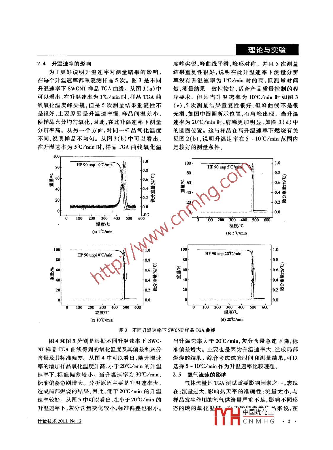 理論與實(shí)驗(yàn)單壁碳納米管純度準(zhǔn)確測量中熱重分析的有效測量任玲玲(中國計(jì)量科學(xué)研究院,北京100013)摘要單壁碳納米管純度的準(zhǔn)確測量在其國際貿(mào)易中具有直接的決定作用。單壁碳納米管純度測量中的熱重分析有效測量與儀器校準(zhǔn)、氧化溫度定義以及其他測量條件密切相關(guān)。其有效程序?yàn)?采用居里點(diǎn)標(biāo)準(zhǔn)樣品和標(biāo)準(zhǔn)砝碼校準(zhǔn)熱重分析儀的溫度和重量;定義氧化溫度為失重最大時(shí)的溫度;升溫速率為5~10℃/min;氧氣流速為10-15mL/min;樣品重量約4mg,壓實(shí)放在樣品槽中。關(guān)鍵詞單壁碳納米管;熱重分析;校準(zhǔn);標(biāo)準(zhǔn)樣品;氧化溫度DOI:10.3969/issn.1000-0771.201.12.0010引言TGA準(zhǔn)確測量需要對儀器溫度和重量進(jìn)行校準(zhǔn)。TGA分析是隨著線性升溫發(fā)生的氧化反應(yīng)分析,可碳納米管作為一維納米材料,由于其特殊的機(jī)以直接給出灰分重量,通過曲線可以推算氧化溫度械性能和光電性能,使其在傳感器、納電子器件、掃和失重重量。描探針顯微鏡、平板顯示器、靶向藥物等方面具有本文重點(diǎn)研究了TGA的校準(zhǔn)以及TGA分析技廣泛的應(yīng)用前景1-3,日前成為屈指可數(shù)的已工業(yè)術(shù)在單壁碳納米管純度測量中灰分測量和氧化溫化生產(chǎn)的納米材料。在產(chǎn)品交易過程中,單壁碳納度測量的準(zhǔn)確性以及單壁碳納米管純度測量中米管(SWc)標(biāo)簽上都標(biāo)注純度的百分含量,認(rèn)為TGA的有效測量程序,為用戶和生產(chǎn)廠家提供產(chǎn)品碳納米管純度測量已經(jīng)很規(guī)范了但實(shí)際上大部分質(zhì)量的評估程序。產(chǎn)品標(biāo)示的純度過高6,因此需要研究測量量值可比且國際互認(rèn)的單壁碳納米管純度有效測量程序,1實(shí)驗(yàn)部分為產(chǎn)品貿(mào)易提供技術(shù)支持8。雖然目前單壁碳納1.1儀器與試劑米管純度的測量方法研究較多,但是有效測量程序的研究還很少報(bào)道。掃描電鏡(SEM)、透射電鏡單壁碳納米管(C≥90%,西格瑪公司),熱重分(TEM)、紫外-可見-近紅外光譜(UV-vis析儀(TGA, Thermofisher公司)。NIR)、熱重分析(TGA)、拉曼光譜( Raman)、光吸收實(shí)驗(yàn)方法光譜等分析技術(shù)單獨(dú)或者組合用來測量單壁碳納米2.1TGA儀器校準(zhǔn)管的純度92,但是這些測量技術(shù)都沒有溯源至各在 Default文件下采用氮?dú)鈿夥辗謩e測量校準(zhǔn)類標(biāo)準(zhǔn),測量結(jié)果沒有可比性。要準(zhǔn)確測量單壁和多樣品 Perkalloy(多合金)和Ion(鐵)的居里點(diǎn)溫度壁碳納米管及其中金屬雜質(zhì),需要透射電鏡(TEM)( onset點(diǎn)的溫度),在相同條件下測量5次,采用5掃描電鏡(SEM)以及熱重(TCA)等分析技術(shù)。TCA次的平均值與校準(zhǔn)樣品溫度比較來校準(zhǔn)TGA儀器,是準(zhǔn)確測量碳納米管中金屬雜質(zhì)最有效的方法1。得到校準(zhǔn)文件。測量條件為升溫速率:10℃/min,氧TGA測量碳納米管的原理是在測量過程中發(fā)氣流速:10mL/mn生如下化學(xué)反應(yīng)C+O2→CO2+E1M+O2→MO+2.2.2TGA測量單壁碳納米管條件研究E2。從TGA測量原理可以看出,TGA測量量值包括在校準(zhǔn)文件下,分別在不同的氧氣流速(5mL重量和熱量兩部分,重量是大氣氣氛中碳氧化成二min,15m/min,35mL/min)和不同升溫速率(1℃/氧化碳?xì)怏w的重量損失和金屬催化劑氧化成金屬min,25℃/min,5℃/min,10℃/min,20℃/min,30℃/氧化物的灰分重量,熱量以氧化溫度顯示。因此,min)下測量了兩種不同單辟磁納來管的鱺化溫度。中國煤化工計(jì)量技術(shù)2011No12CNMHG理論與實(shí)驗(yàn)2結(jié)果與討論表1居里點(diǎn)校準(zhǔn)樣品的TGA測量結(jié)果測量次數(shù)多合金居里點(diǎn)鐵居里點(diǎn)2.1TGA分析測量值℃測量值℃圖1是單壁碳納米管的熱重曲線。通過圖1熱6006790.13重曲線可以確定樣品的氧化溫度。氧化溫度有兩602.1789.50種確定方法,一種是最大失重率時(shí)的溫度T(dw601.36785.64dT);另一種是開始失重時(shí)的溫度Tm。從圖3中可以看出,Tm比T有更多的主觀性,引入的誤300.84800.99差較大。在碳納米管TGA測量過程中采用T表示平均值T(℃)601.7493.03氧化溫度。標(biāo)準(zhǔn)偏差s(℃)1.256.584519℃居里點(diǎn)參考值(℃)469.1誤差(℃)5.7413.03從表1可以看出,校準(zhǔn)樣品測量結(jié)果比廠家給04出的量值偏高,但在600℃的標(biāo)準(zhǔn)偏差只有1.25℃,說明在此溫度范圍測量重復(fù)性較好。在800℃在右標(biāo)準(zhǔn)偏差6.58℃,相對較大。 SWCNT的氧化溫度100200300400500600在500℃左右,所以采用TGA測量的標(biāo)準(zhǔn)偏差較小,比較適用。圖1 SWCNT的TGA曲線2.3燃燒影響2.2TGA校準(zhǔn)在TGA測量 SWCNT過程中,經(jīng)常會出現(xiàn)一些為了使測量結(jié)果準(zhǔn)確可靠,必須對儀器進(jìn)行校特殊情況,如圖2所示,圖中(a)的時(shí)間曲線上出現(xiàn)準(zhǔn)。TGA溫度采用標(biāo)準(zhǔn)樣品進(jìn)行校準(zhǔn),表1是采用個(gè)尖刺,這在升溫速率10~20℃/min情況下都會居里點(diǎn)標(biāo)準(zhǔn)樣品校準(zhǔn)TGA溫度的結(jié)果。由于校準(zhǔn)出現(xiàn)。圖中(b)在氧化后期,曲線向后折回,然后繼樣品 Perkalloy和Iron的居里點(diǎn)溫度量值中沒有給續(xù)向前。這些都是樣品燃燒的信號,可以解釋為樣出不確定度,因此,采用參考樣品校準(zhǔn)儀器后,在校品開始燃燒,迅速釋放