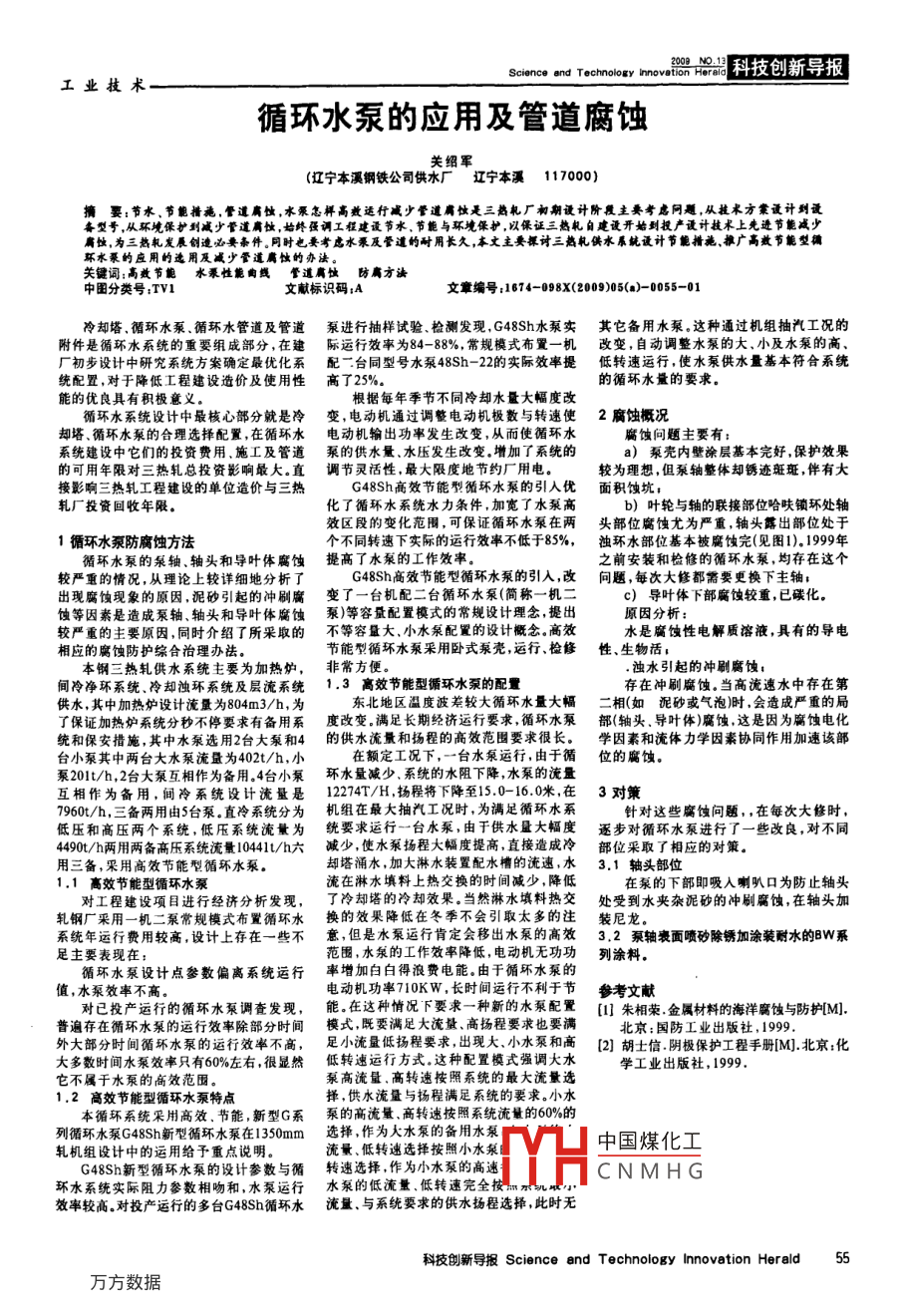 Science and technology innovation herald科技創(chuàng)新導報工業(yè)技術循環(huán)水泵的應用及管道腐蝕關紹軍遼寧本溪鋼鐵公司供水廠遼寧本溪117000擁宴:節(jié)水、節(jié)能措施,道肩蝕水泵怎秤高煎適行減少管道肩飲是三熱機廠初期設計階覆主要岢慮問題從技術方蒙設計到設舂型誓,從環(huán)境保擴到減少菅道肩蝕,始終強調工程建謾節(jié)水,節(jié)能與環(huán)境保護,以保證三熱札自建設開始到投產設計技術上先透節(jié)能減少肩蝕,為三熱軋發(fā)展創(chuàng)遭必要條件。同時也要考慮水泵及督道的耐用長久,本文主要探討三熱札供水系統(tǒng)設計節(jié)能措施推廣高效節(jié)能型環(huán)水泵的應用的選用及減少管道高的辦法關鍵詞:高效節(jié)能水系性能向線管道肩蝕防高方中圖分類號:TvI文獻標識碼;A文章編號:1874-098X(2009)05(a)005-01冷卻塔,循環(huán)水泵、循環(huán)水管道及管道泵進行抽樣試驗檢測發(fā)現(xiàn)G48h水泵實其它備用水泵這種通過機組抽汽工況的附件是循環(huán)水系統(tǒng)的重要組成部分,在建際運行效率為84-88%,常規(guī)模式布置一機改變,自動調整水泵的大小及水泵的高、廠初步設計中研究系統(tǒng)方案確定最優(yōu)化系配二臺同型號水泵48h-22的實際效率提低轉速運行,使水泵供水量基本符合系統(tǒng)統(tǒng)配置,對于降低工程建設造價及使用性高了25%的循環(huán)水量的要求。能的優(yōu)良具有積極意義。根據(jù)每年季節(jié)不同冷卻水量大幅度改循環(huán)水系統(tǒng)設計中最核心部分就是冷變,電動機通過調整電動機極數(shù)與轉速使2腐蝕概況卻塔、循環(huán)水泵的合理選擇配置,在循環(huán)水電動機輸出功率發(fā)生改變,從而使循環(huán)水腐蝕問題主要有:系統(tǒng)建設中它們的投資費用、施工及管道泵的供水量、水壓發(fā)生改變,增加了系統(tǒng)的a)泵殼內壁涂層基本完好,保護效果的可用年限對三熱軋總投資影響最大。直調節(jié)靈活性,最大限度地節(jié)約廠用電。較為理想,但泵軸整體卻銹跡斑斑,伴有大接影響三熱軋工程建設的單位造價與三熱G48Sh高效節(jié)能型循環(huán)水泵的引入優(yōu)面積蝕坑;軋廠投資回收年限化了循環(huán)水系統(tǒng)水力條件,加寬了水泵高b)葉輪與軸的聯(lián)接部位哈呋鎖環(huán)處軸效區(qū)段的變化范圍,可保證循環(huán)水泵在兩頭部位腐蝕尤為嚴重,軸頭露出部位處于1循環(huán)水泵防腐蝕方法個不同轉速下實際的運行效率不低于85%,濁環(huán)水部位基本被腐蝕完(見圖1).1999年循環(huán)水泵的泵軸、軸頭和導葉體腐蝕提高了水泵的工作效率之前安裝和檢修的循環(huán)水泵,均存在這個較嚴重的情況,從理論上較詳細地分析了G48h高效節(jié)能型循環(huán)水泵的引人改問題,每次大修都需要更換下主軸出現(xiàn)腐蝕現(xiàn)象的原因,泥砂引起的沖刷腐變了一臺機配二臺循環(huán)水泵(簡稱一機二c)導葉體下部腐蝕較重,已碳化蝕等因素是造成泵軸軸頭和導葉體腐蝕泵)等容量配置模式的常規(guī)設計理念,提出原因分析較嚴重的主要原因,同時介紹了所采取的不等容量大小水泵配置的設計概念高效水是腐蝕性電解質溶液,具有的導電相應的腐蝕防護綜合治理辦法。節(jié)能型循環(huán)水泵采用臥式泵殼,運行、檢修性、生物活本鋼三熱軋供水系統(tǒng)主要為加熱爐,非常方便。濁水引起的沖刷腐蝕間冷凈環(huán)系統(tǒng)、冷卻濁環(huán)系統(tǒng)及層流系統(tǒng)1.3高效節(jié)能型循環(huán)水泵的配置存在沖刷腐蝕。當高流速水中存在第供水,其中加熱爐設計流量為804m3/h,為東北地區(qū)溫度波差較大循環(huán)水量大幅二相(如泥砂或氣泡)時,會造成嚴重的局了保證加熱爐系統(tǒng)分秒不停要求有備用系度改變滿足長期經(jīng)濟運行要求,循環(huán)水泵部(軸頭、導葉體)腐蝕這是因為腐蝕電化統(tǒng)和保安措施,其中水泵選用2臺大泵和4的供水流量和揚程的高效范圍要求很長。學因素和流體力學因素協(xié)同作用加速該部臺小泵其中兩臺大水泵流量為402t/h,小在額定工況下,一臺水泵運行,由于循位的腐蝕。泵20It/h,2臺大泵互相作為備用4臺小泵環(huán)水量減少系統(tǒng)的水阻下降,水泵的流量互相作為備用,間冷系統(tǒng)設計流量是12274T/H,揚程將下降至15.0-16.0米,在3對策7960/h,三備兩用由5臺泵。直冷系統(tǒng)分為機組在最大抽汽工況時,為滿足循環(huán)水系針對這些腐蝕問題,,在每次大修時低壓和高壓兩個系統(tǒng),低壓系統(tǒng)流量為統(tǒng)要求運行一臺水泵,由于供水量大幅度逐步對循環(huán)水泵進行了一些改良,對不同4490/h兩用兩備高壓系統(tǒng)流量10441/l六減少,使水泵揚程大幅度提高,直接造成冷部位采取了相應的對策用三備,采用高效節(jié)能型循環(huán)水泵。卻塔涌水,加大淋水裝置配水槽的流速,水3.1軸頭部位1.1高效節(jié)能型循環(huán)水泵流在淋水填料上熱交換的時間減少,降低在泵的下部即吸入喇叭口為防止軸頭對工程建設項目進行經(jīng)濟分析發(fā)現(xiàn),了冷卻塔的冷卻效果。當然淋水填料熱交處受到水夾雜泥砂的沖刷腐蝕在軸頭加軋鋼廠采用一機二泵常規(guī)模式布置循環(huán)水換的效果降低在冬季不會引取太多的注裝尼龍。系統(tǒng)年運行費用較高,設計上存在一些不意但是水泵運行肯定會移出水泵的高效3.2