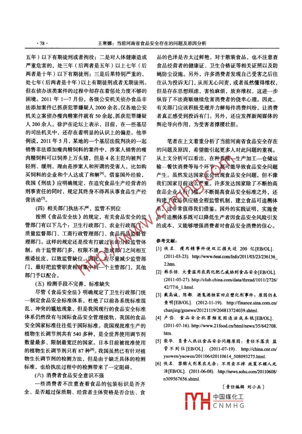 第2第6期天中學(xué)刊Vol. 28 No. 62013年12月Jourmal ofTianzhongDec. 2013當(dāng)前河南省食品安全存在的問題及原因分析王寒娜(河南工程學(xué)院學(xué)報(bào)編輯部,河南鄭州451191 )摘要: 近些年來, 河南省食品安全問題日趨嚴(yán)重, 2011年更是河南省食品企業(yè)的多事之秋, 雙匯、思念、三全等知名企業(yè)相繼被爆出質(zhì)量丑聞,導(dǎo)致企業(yè)聲譽(yù)嚴(yán)重受損。河南省是人口大省,食品安全問題更是不容忽視。因此,研究分析河南省食品安全存在的問題及原因具有重要的現(xiàn)實(shí)意義。關(guān)鍵詞:河南省;食品安全;問題;原因中圖分類號(hào): D92文獻(xiàn)標(biāo)志碼: A文章編號(hào): 1006-5261(2013)06-0076-032011年央視了.15特別行動(dòng)一《“健美豬” 真剖析當(dāng)前河南省食品安全存在的問題,分析產(chǎn)生這些相》曝光了用瘦肉精喂養(yǎng)的“健美豬”最終流人河南問題的原因,具有重要的現(xiàn)實(shí)意義。雙匯肉制品廠一事。該節(jié)目播出后馬上引起了市民的-.、當(dāng)前河南省食品安全存在的問題強(qiáng)烈反響。雙匯集團(tuán)號(hào)稱的“十八道檢驗(yàn)”為何管不了“健美豬”?從一系列的后續(xù)追蹤來看,企業(yè)執(zhí)行(一)生產(chǎn)過程中的食品不安全因素國(guó)家有關(guān)檢驗(yàn)的硬性規(guī)定不力,以“抽查”取代“普河南省的食品安全從原料開始便受到了嚴(yán)重的威查”,才是導(dǎo)致“健美豬”暢通無阻的原因。這次瘦肉脅。由于文化素質(zhì)普遍偏低,加之出于單純追求經(jīng)濟(jì)精事件對(duì)雙匯的影響很大,不僅造成公司股票大跌,利益的考慮,絕大多數(shù)生產(chǎn)者在種植農(nóng)作物和飼養(yǎng)家而且使雙匯的聲譽(yù)嚴(yán)重受損,直接損失和間接損失近禽的過程中濫用農(nóng)藥、化肥、動(dòng)植物激素、獸藥等,200億元。河南系速凍食品在全國(guó)相當(dāng)有名,不僅除直接導(dǎo)致動(dòng)植物食物中的化學(xué)品殘留物過多或畸形有思念、三全、科迪等龍頭企業(yè),也有笑臉、億星、之外,還使農(nóng)業(yè)及農(nóng)村環(huán)境污染加劇。以膨大劑為例,胖哥等生力軍品牌。2011 年河南速凍食品的銷售額在其已被廣泛應(yīng)用于瓜果的種植,如西瓜、梨、草莓、300億元左右,占據(jù)全國(guó)市場(chǎng)70%的份額,但2011年柿子、甜瓜、苦瓜、葡萄、番茄、土豆等。以下的一也是河南速凍企業(yè)的多事之秋。2011年10月19日思組統(tǒng)計(jì)數(shù)字更是讓人觸目驚心:目前我國(guó)化肥的平均念三鮮水餃被檢出金黃色葡萄球菌,同年11 月7日,施用量是發(fā)達(dá)國(guó)家化肥安全施用上限的2倍,但平均三全白菜豬肉水餃也被檢出金黃色葡萄球菌。金黃色利用率僅40%左右;我國(guó)農(nóng)藥年產(chǎn)約170萬噸,平均葡萄球菌事件讓思念和三全的聲譽(yù)和銷售大受影響。每畝農(nóng)田需要近兩斤;我國(guó)每年約有50萬噸農(nóng)膜殘留雙匯、思念、三全都是河南知名的食品企業(yè),它們的于土壤中,殘膜率達(dá)40%2]。食品質(zhì)量尚不能完全保證,那么生產(chǎn)衛(wèi)生條件簡(jiǎn)陋的(二)加工過程中的食品不安全因素小食品企業(yè)的食品質(zhì)量就更讓人堪憂。在食品生產(chǎn)加工環(huán)節(jié)可能出現(xiàn)如下幾個(gè)方面的不俗話說“民以食為天”,食品安全大如天。食品安安全因素: -是濫用食品添加劑,甚至濫用工業(yè)添加全存在種種問題,不僅給人民群眾的身體健康帶來了劑。比如在豆制品中添加吊白塊,火腿生產(chǎn)中使用敵損害,也引發(fā)了人民群眾對(duì)不良食品生產(chǎn)經(jīng)營(yíng)者的譴敵畏,在水發(fā)產(chǎn)品中添加甲醛,在辣椒制品中添加蘇責(zé)和對(duì)政府監(jiān)管部門的不滿。盡管該類事件不斷地向丹紅等。二是加工設(shè)備不衛(wèi)生,容易滋生造成食物中我們敲響警鐘,但為什么還是屢禁不絕呢?河南省是毒的病原微生物, 如致病性大腸桿菌、金黃色葡萄球人口大省,對(duì)食品安全問題更是不能掉以輕心。因此,菌、沙門氏菌等。在氣溫較高的夏、秋季節(jié)比較容易中國(guó)煤化工收稿日期: 2013-02-27基金項(xiàng)目:河南省政府決策研究招標(biāo)課題( 2012B177)MHCNM HG作者簡(jiǎn)介:王寒娜(1981-),女,河南沈丘人,編輯,碩士。.王寒娜:當(dāng)前河南省食品安全存在的問題及原因分析.77●發(fā)生病原微生物引發(fā)的中毒事件。三是采用質(zhì)量差、勵(lì)政策,鼓勵(lì)務(wù)農(nóng)人員主動(dòng)接受培訓(xùn),使之科學(xué)掌握劣的食品原料。如使用已霉變的大米加工米制品,使和應(yīng)用現(xiàn)代農(nóng)業(yè)生產(chǎn)技術(shù)。另外,食品企業(yè)進(jìn)入門檻用病死的畜、禽加工熟肉制品,飯店違規(guī)使用“地溝過低,造成河南省食品企業(yè)規(guī)模小、分布散、管理混油”加工食品等。亂的現(xiàn)象,除此之外,還存在大量的無證小企業(yè)、小(三)包裝容器對(duì)食物的污染作坊。這些小企業(yè)、小作坊一味追求經(jīng)濟(jì)效益,無視包裝容器本身的不衛(wèi)生也可能造成食品的不安食品安全,違法使用添加劑,摻雜使假,虛假宣傳和全?!跋匏芰睢币言谌珖?guó)范圍內(nèi)施行多年,但是在河南不當(dāng)競(jìng)爭(zhēng),造成惡性食品安全事件頻頻出現(xiàn)。因此,各地的農(nóng)貿(mào)市場(chǎn
