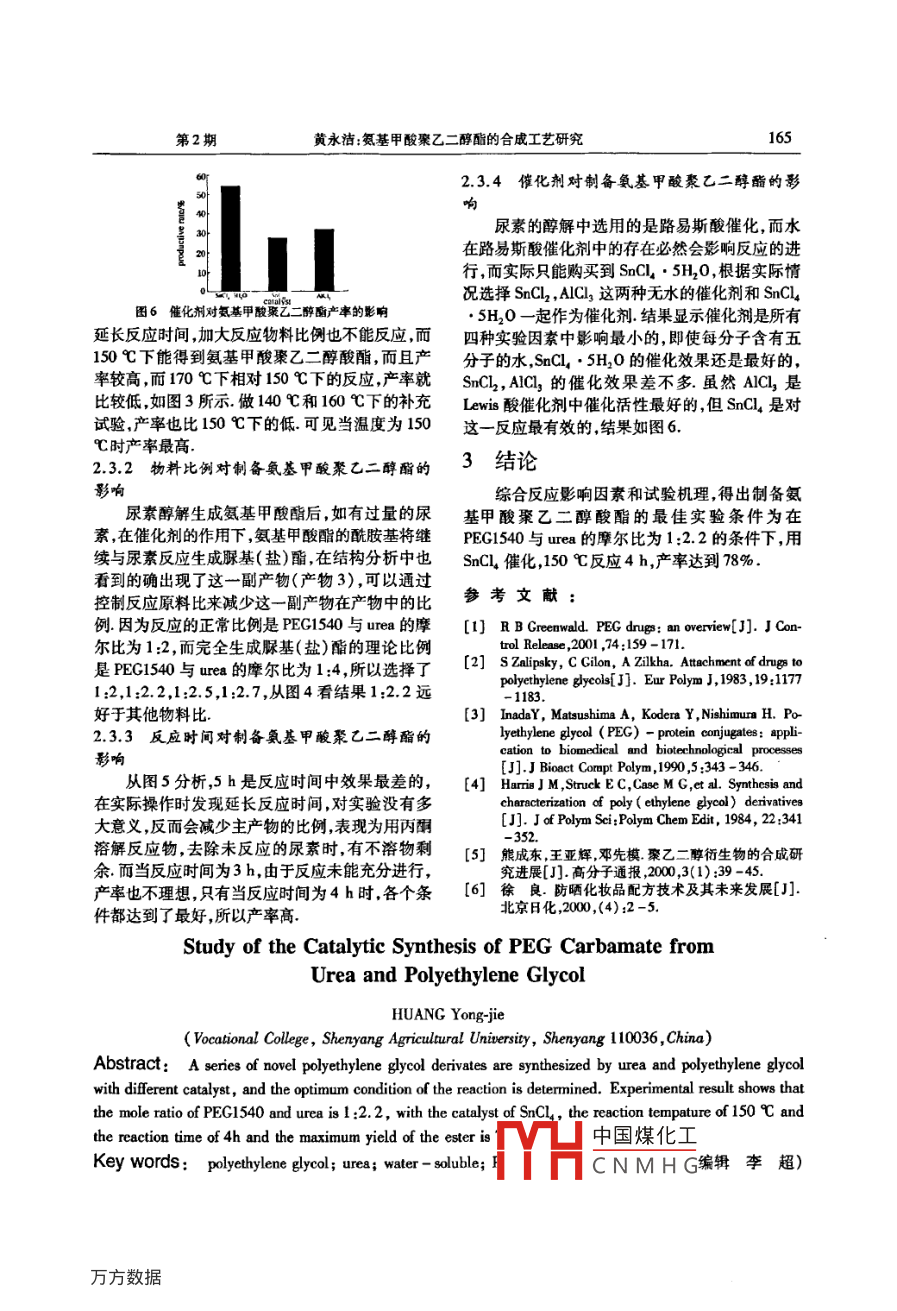 遼寧大學學報JOURNAL OF LIAONING UNIVERSITI自然科學版Natural Sciences edition第陣4卷第2期2007年vol.34No.22007氨基甲酸聚乙二醇酯的合成工藝研究黃永潔(沈陽農業(yè)大學高職院,遼寧沈陽110122)摘要:采用聚乙二醇與尿素在不同催化劑的條件下合成了氨基甲酸聚乙二醇酯,并得出了最佳合成工藝制備氨基聚乙二醇酸(鹽)酯的最佳實驗條件為在PEG1540和uea的摩爾比為1:22的條件下,用snCl催化,150℃反應4h,產率為78%關鍵詞:聚乙二醇;尿素;水溶型;氨基甲酸聚乙二醇酯中圖分類號:063311文獻標識碼:A文章編號:10005846(2007)02016303聚乙二醇(PEG)是一種用途極為廣泛的聚醚1.3氨基甲酸聚乙二醇酯的合成類高分子化合物它的水溶性和適配性好,低毒且在裝有回流冷凝管,磁力攪拌,通N2裝置的無刺激性在實際應用中,PEG末端羥基,其他反三口燒瓶中加入100g分子量為1540的聚乙二應性更強的功能化基團亦可以被引人到PEG鏈醇,0.2 g SnCI4·5H2O,9.75g尿素,劇烈攪拌下的兩端.這些功能化基團的引入擴大了聚乙慢慢升溫至150℃,通N2鼓泡帶出所生成的二醇的應用范圍,使它在有機合成、多肽合成高NH3,在此溫度下反應4h,降至室溫加入130mL分子合成及藥物的緩釋控釋靶向施藥、日用化丙酮充分溶解,過濾蒸出丙酮,冷卻后得到蠟狀工3等多方面均具有廣闊的應用前景本文通固體過分子設計,采用尿素與不同分子量的聚乙二醇反應,得到端基含有可反應氨基的聚乙二醇衍生2結果與討論2.1氨基甲酸聚乙二醇酯的合成1實驗部分做為一種全酰胺,尿素與酰氯,酸酐等羧酸衍生物的化學性質類似,但是親核取代反應活性遠1.1實驗原料低于酰氯本文以尿素和PEC為原料合成氨基甲PEC400,PEG60,PEC1000,PEG1540,酸聚乙二醇酯,用于該反應體系的催化劑大多是PEG2000化學純,天津石英鐘廠霸州市化工分有機錫化合物或堿金屬化合物,反應的收率一般廠;尿素,SnCl4·5H2O,SnCl2,ACl3,丙酮分析純,都比較高由于尿素中的羰基與氨基相連,氨基氮沈陽市試劑一廠上的孤電子對與羰基共軛,電子的均勻化使C-N1.2性能測試較其他羧酸衍生物更難發(fā)生親核取代反應,所以FT-IR測試是在 Nicolet-20DXB型紅外光我們選擇了一系列強而且容易獲取的酸性催化譜儀上,采用KBr壓片法測試劑H-NMR測試采用FX-90Q型核磁共振儀原料和催化劑在150℃下反應4h基本能充測定,以CDCL-d1為溶劑,TMS為內標測得分反應,反應時間過長,產率也沒有顯著提高因中國煤化工·作者簡介:黃永潔(1972-),女沈陽人講師從事生物材料研究收稿日期:200610-23CNMHG164遼寧大學學報自然科學版007年為尿素不溶于丙酮,反應后用丙酮充分溶解可以主產物,HNMR8(pm)5.38(s,2H,端氨基的除去未反應的尿素然后再除去丙酮得到淡黃色H),4.03(t,2H,與甲酸酯相連的亞甲基的H),的產物根據(jù)PEG分子量的不同產物的狀態(tài)不3.58(t,2H,靠近酯基且與聚乙二醇相連亞甲基同,PEG分子量為400,600時為粘稠液體,PEG的H),3.53(s,4H,聚乙二醇亞甲基上的H)分子量更高時為蠟狀固體色澤越來越淺反應方另外,在核磁譜圖上還可以看到副產物的峰H程式如下:NMR8(ppm)8.58(s,1H,NH)(i),6.63(8,2H,N—H)(g),6.22(s,2H,N一H)(f,4.49(s,2H,C-H)(k),3.49(t,2H,C-H)(n),36-0嗎概42(s,2H,C—H)(p)2.3氨基甲酸聚乙二醇酯(產物1)的合成工藝2.3.1溫度的影響隨著PEG分子量的提高,端羥基對尿素酰胺基團的親核取代活性將降低提高溫度可以增強2氨基甲酸聚乙二醇酯的結構表征反應物的活性,特別是可以使PEG鏈段柔順性更好,與脲酰胺的接觸幾率更大,更有利于反應在130℃,對于分子量為1540的聚乙二醇來說,即使圖1氨基甲酸聚乙二醇酯的紅外譜圖155I6s10圖3溫度對氨基甲酸聚乙二醇酯產率的影響圖2氨基甲酸聚乙二醇酚的氫譜圖圖1和圖2分別是氨基甲酸聚乙二醇(400酯的FT-IR和H-NMR譜圖,由圖1可知1104cm處的寬峰是醚C-0C的特征吸收峰,同時也可能是酯C—0—C的特征吸收峰;1720cm1圖4原料比對氨基甲酸聚乙二醇酯產率的影響是氨基甲酸酯中C=0的伸縮振動特征吸收峰,證明了酯的形成;2873cm是PEG(CH2CH20-)。中C-H的特征吸收峰;3348cm-2,1619cm是端氨基(NH2)的特征吸收峰,1404cm-是氨基甲酸酯中N-C-0的特征吸收峰3354.4s由圖2,我們判斷產物中存在三種成分,分別中國煤化工率的影響是產物(1)、(2)和(3),其中(1)是主產物對于CNMHG第2期黃永潔:氨基甲酸聚乙二醇酯的合成工藝研究1652.3.4催化劑對制備氫基甲酸聚乙二醇酯的影尿素的醇解中選用的是路易斯酸催化,而水在路易斯酸催化劑中的存在必然會影響反應的進行,而實際只能購買到SnCl4·5H2O,根據(jù)實際情況選擇SnCl2,AlCl2這兩種無水的催化劑和SnCl4圖6催化劑對氨基甲酸聚乙二醇豳產率的影響·5H2O一起作為催化劑結果顯示催化劑是所有延長反應時間加大反應物料比例也不能反應,而四種實驗因素中影響最小的,即使每分子含有五150℃下能得到氨基甲酸聚乙二醇酸酯,而且產分子的水,SnCL4·5H2O的催化效果還是最好的,率較高,而170℃下相對150℃下的反應產率就SnCl2,AlC2的催化效果差不多雖然ACl4是比較低如圖3所示做140℃和160℃下的補充 Lewis酸催化劑中催化活性最好的,但SnCl4是對試驗產率也比150℃下的低可見當溫度為150這一反應最有效的,結果如圖6.23:2物料比例對制備氨基甲酸聚乙二醇酯的3結論影響綜合反應影響因素和試驗機理,得出制備氨尿素醇解生成氨基甲酸酯后,如有過量的尿基甲酸聚乙二醇酸酯的最佳實驗條件為在素,在催化劑的作用下氨基甲酸酯的酰胺基將繼PEG1540與urea的