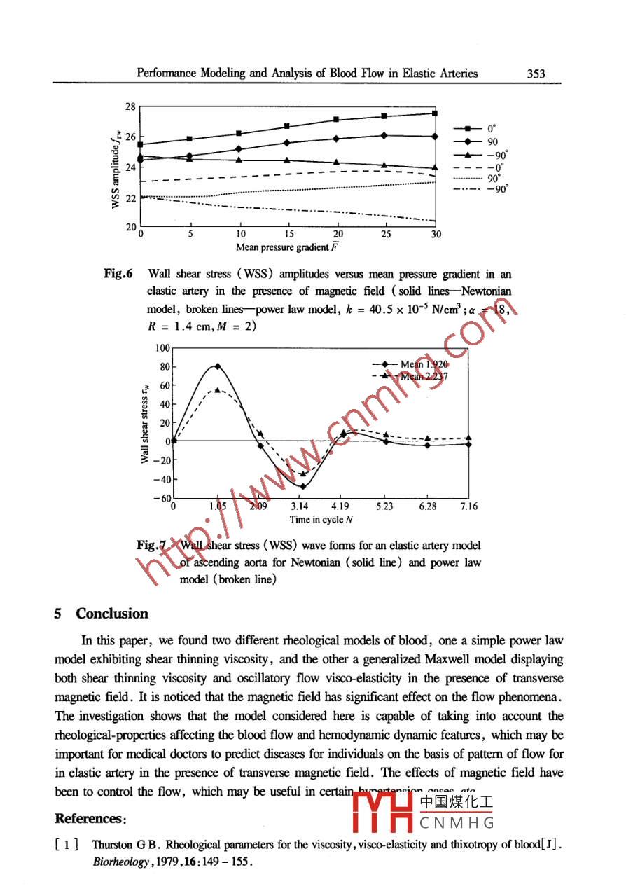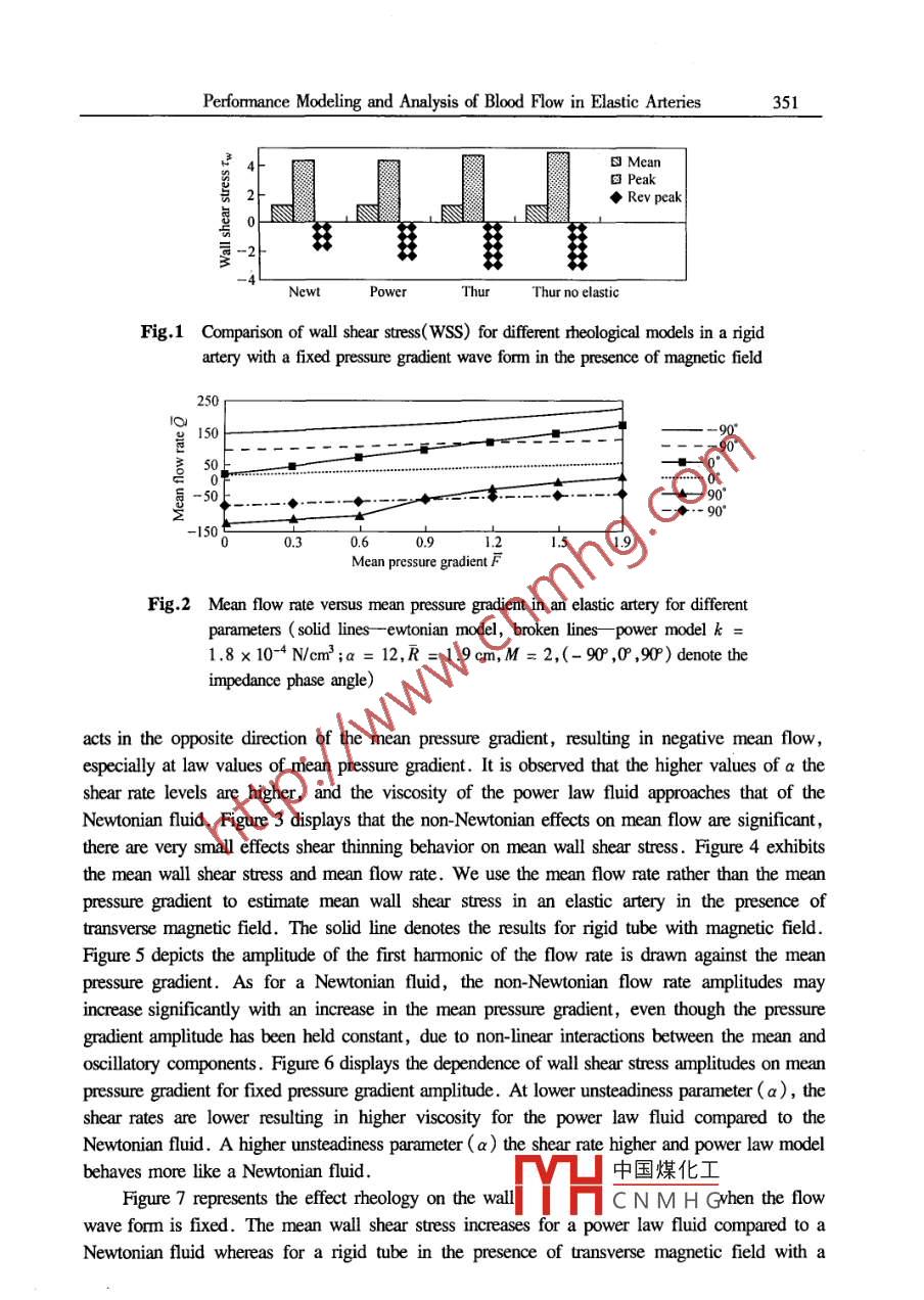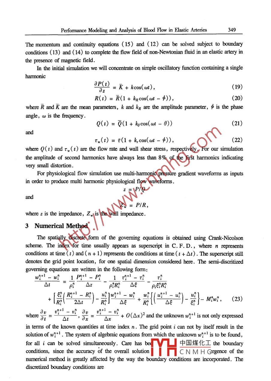 Applied Mathematics and MechanicsPublished by Shanghai University,(English Edition) Vol. 26 No.3 Mar.2005Shanghai, ChinaCEditorial Conite of Appl. Math. Mech. ,ISSN 0253 4827Article ID: 0253-4827(2005)03-0345-10PERFORMANCE MODELING AND ANALYSIS OF BLOODFLOVIN ELASTIC ARTERIES *。Anil Kumar',C.L. Varshney',G. C. Sharma?(1. Department of Post- Graduate Studies and Research in Mathematics &Computer Science, S.Varshney College, Aligath-202001, India;2. Institute of Basic Science, Khandari, Agra-282002, India)(Communicated by zHOU Zhe-wei)Abstract: Two different non-Newtonian models for blood flow are considered, first a simplepower law model displaying shear thinning viscosity, and second a generalized Maxwellmodel displaying both shear thinning viscosity and oscillating flow viscous-elasticity .Thesemodels are used along with a Newtonian model to study sinusoidal flow of blood in rigid andelastic straight arteries in the presence of magnetic feld. The elasticity of blood does notappear to influence its flow behavior under physiological conditions in the large arteries,purely viscous shear thinning model should be quite realistic for simulating blood flow underthese conditions. On using the power law model with high shear rate for sinusoidal flowsimulation in elastic arteries, the mean and amplitude of the flow rate were found to be lowerfor a power law fluid compared to Newtonian fluid for the same pressure gradient. Thegoveming equations have been solved by Crank- Niclson scheme . The results are interpreted inthe context of blood in the elastic arteries keeping the magnetic effects in view. Forphysiological flow simulation in the aorta, an increase in mean wall shear stress, but areduction in peak wall shear stress were observed for power law model compared to aNewtonian fluid model for matched flow rate wave fomn. Blood flow in the presence oftransverse magnetic field in an elastic artery is investigated and the influence of factors suchas morphology and surface iregularity is evaluated.Key words: elastic artery model; Crank Niclson scheme; non-Newtonian fluid; wall shearstressChinese Library Classification; 0242.1; 0357.1; R318.01Document code: A2000 Mathematics Subject Classification: 92C10; 76A05Nomenclaturewall shear stressnon-Newtonian indexshear rateshear stress of the pth elementyield stressangular velocityCasson viscosity中國煤化工the consistency indexYHCNMHG* Received 0ct. 17 ,2003345346Anil Kumar, C.L. Varshney and G. C. SharmaMmagneticparameter ( Hartmannunsteadiness parameternumber)k,R mean parametersu,w velocity component in the r andTp relaxation time of the pth element若directions, respectivelydensityPpressureIntroductionThe importance to. atherogenesis of arterial flow phenomena such as flow separation,recirculation and stagnation secondary flow motion low and oscillatory wall shear stress and longparticle residence times, have become more and more evident during the past few decades. Thehemodynamics of flows through atherosclerotic vessels is of great interest, because these vesselspresent a substantial health risk and are major causes of mortality and morbidity in theindustrialized world. Some of the studies on the arterial flows are as narrated below. Thurston!11attempted to investigate all of the rheological properties of blood with a model including non-Newtonian viscosity, viscoelasticity and thixotropy. Liepsch and Moraveel21 investigated the flowof a shear thining blood, analog fluid in pulsatile flow through arterial branch model and observedlarge differences in velocity profles relative to these measured with Newtonian fluids having thehigh shear rate viscosity of the analog fluid. Rindt et al . L3J considered both experimentally andnumerically the two-dimensional steady and pulsatile flow. Nazemi et al .41 made importantcontributions to the identification of atherogenic sites. Rodkiewicz et al . [5] used several differentnon-Newtonian models for blood for simulation of blood flow in large arteries and they observedthat there is no effect of the yield stress of blood on either the velocity profiles or the wall shearstress. Boesiger et al.l6J used magnetic resonance imaging ( MRI ) to study arterialHemodynamics. Perktold et al.7J modeled the flow in stenotic vessels as that of anincompressible Newtonian fluid in the rigid vessels . Sharma and Kapoor-8J made a mathematicalanalysis of blood flow through arteries using finite element method. Dutta and Tarblll9] studiedthe two different rheological models of blood displaying shearing thining viscosity and oscillatoryflow visco- elasticity. Lee and Libby1o] made a study of vulnerable atherosclerotic plaquecontaining a large necrotic core, and covered by his fibrous cap.Korenage et al . l 1 considered biochemical factors such as gene expression and albumintransport in atherogenessis and in plaque rupture these have been shown to be activated byhemodynamic factors in wall shear stress. Rachev et al.12J have considered a model forgeometric and mechanical adaptation of arteries. Rees ane Thompson' 13] studied a simple modelderived from laminar boundary layer theory to investigate the flow of blood in arterial stenoses upto Reynolds oumbers of 1 000. Tang et al .[14]analysed triggering events are bemieved to beprimarily Hemo-dynamics including cap tension, bending of torsion of the artery. Zendehbudi andMoayary-15] made a comparison of physiological and simple pulsatile flows through stenosedarteries .Berger and Jou'e measured wall shear stress down stream of axi-symmetric stenoses in thepresence of hemodynamics forces acting on the plaque中國煤化工le for plaque!rupture. Botnar et al. l17] based on the correspondence|Y片C N M H Gsurements andnumerical simulations used two approaches to study in detail the role of diferent flow patterms forthe initiation and amplification of atherosclerotic plaque sedimentation. Stroud et al. [18] foundedPerformance Modeling and Analysis of Blood Flow in Elastic Arteries347the 