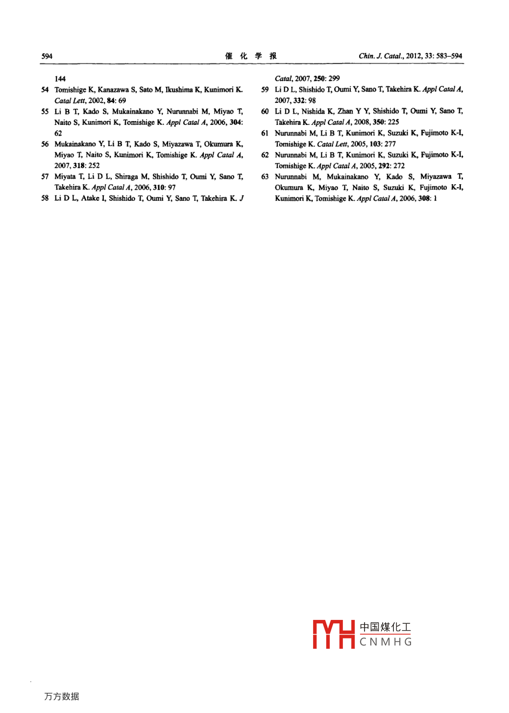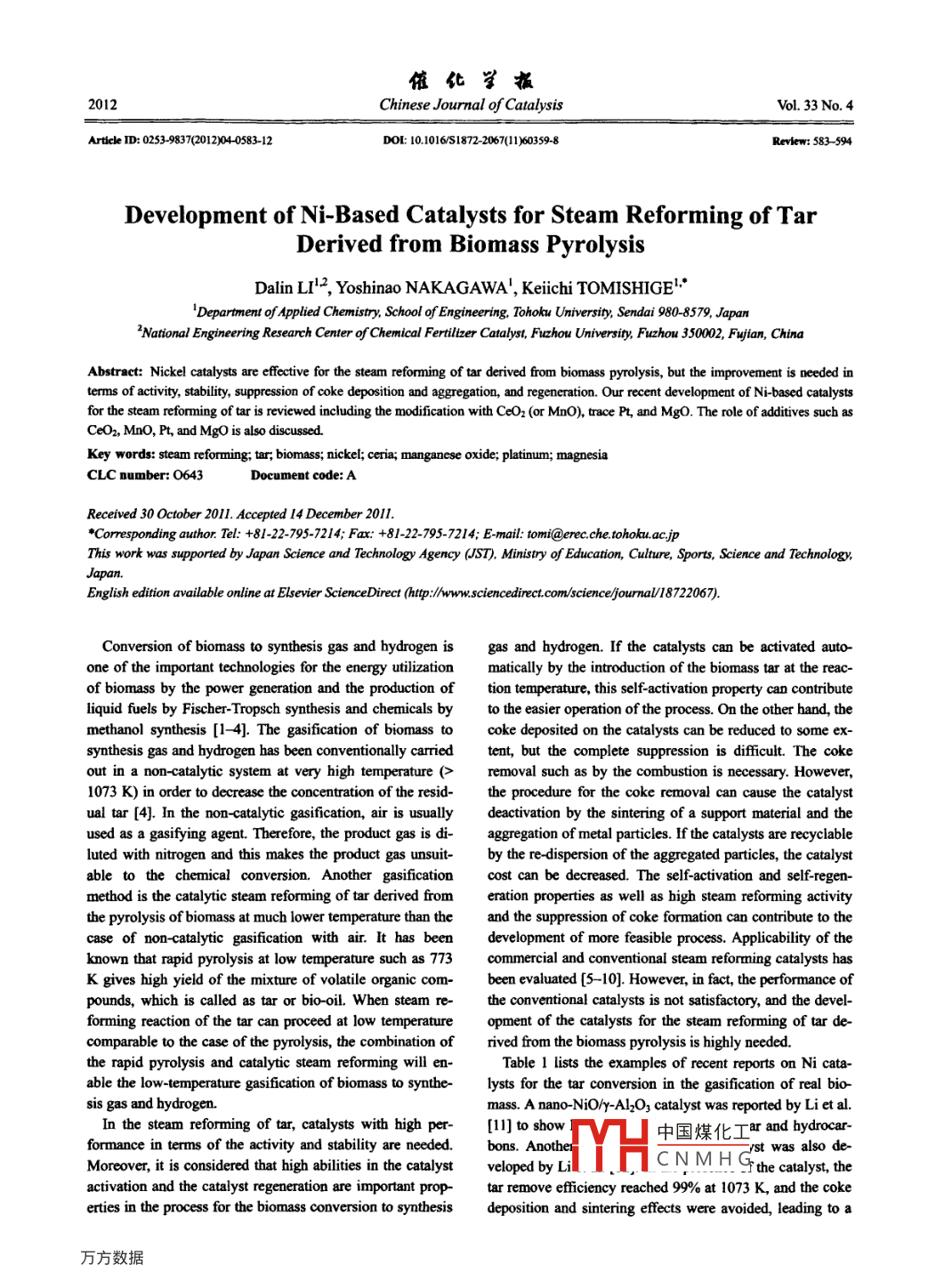 催化學報2012Chinese Journal of CatalysisVoL. 33 No.4Article ID: 0253-9837(2012)04 0583-12DOL: 10.1016/S1872 206711)60359-8Reriew:583 -594Development of Ni-Based Catalysts for Steam Reforming of TarDerived from Biomass PyrolysisDalin LI2, Yoshinao NAKAGAWA', Keiichi TOMISHIGE''Department of Applied Chemistry, School of Engineering, Tohoku Universit, Sendai 980-8579, JapanNational Engineering Research Center of Chemical Fertilzer Catalyst, Fuzhou Universiny, Fuzhou 30002, Fujian, ChinaAbstract: Nickel catalysts are efctive for the steam reforming of tar derived from biomass pyrolysis, but the improverment is needed interms of actity, stability, suppression of coke deposition and aggregation, and regencration. Our recent development of Ni-based catalystsfor the steam reformning of tar is revicwed including the modification with CeO2 (or MnO), trace Pt, and MgO. The role of additives such asCeO2, MnO, Pt, and MgO is also discussed.Key words: steam reforming; tar, biomass; nickel; ceria; manganese oxide; platinum; magnesiaCLC number: 0643Document code: AReceived 30 October 2011. Accepted 14 December 2011.*Corresponding anuthor Tel: +81-22-795-7214; Fax: +81-22-795-7214; E-mai!: tomi@erec.che toholku.acjpThis work was supported by Japan Science and Technology Agency (JST, Ministry of Education, Culture, Sports, Science and Technology,Japan.English edition available online at Elsevier ScienceDirect (tpt:/ww.cecdirec.comscience/jourmal18722067).Conversion of biomass to synthesis gas and bydrogen isgas and hydrogen. If the catalysts can be activated auto-one of the important technologies for the energy utilizationmatically by the introduction of the biomass tar at the reac-of biomass by the power generation and the production oftion temperature, this self- activation property can contributeliquid fuels by Fischer-Tropsch synthesis and chemicals byto the easier operation of the process. On the other hand, themethanol synthesis [1- 4]. The gasification of biomass tocoke deposited on the catalysts can be reduced to some ex-synthesis gas and hydrogen has been conventionally carriedent, but the complete suppression is difficult. The cokeout in a non-catalytic system at very high temperature (>removal such as by the combustion is necessary. However,1073 K) in order to decrease the concentration of the resid-the procedure for the coke removal can cause the catalystual tar [4]. In the non-calytic gasification, air is usuallydeactivation by the sintering of a support material and theused as a gasifying ageat. Therefore, the product gas is di-aggregation of metal particles. If the catalysts are recyclableluted with nitrogen and this makes the product gas unsuit-by the re- dispersion of the aggregated particles, the catalystable to the chemical conversion. Another gasificationcost can be decreased. The self-activation and self-regen-method is the catalytic steam reforming of tar derived fromeration properties as well as high steam reforming activitythe pyrolysis of biomass at much lower temperature than theand the suppression of coke formation can contribute to thecase of non-catalytic gasification with air. It has beendevelopment of more feasible process. Applicability of theknown that rapid pyrolysis at low temperature such as 773commercial and conventional steam reforming catalysts hasK gives high yield of the mixture of volatile organic com-been evaluated [5-10]. However, in fact, the performance ofpounds, which is called as tar or bio-oil. When steam re-the conventional catalysts is not satisfactory, and the devel-forming reaction of the tar can proceed at low temperatureopment of the catalysts for the steam reforming of tar de-comparable to the case of the pyrolysis, the combination ofrived from the biomass pyrolysis is highly needed.the rapid pyrolysis and catalytic steam reforming will en-Table 1 lists the examples of recent reports on Ni cata-able the low-temperature gasification of biomass to synthe-lysts for the tar conversion in the gasification of real bio-sis gas and hydrogen.mass. A nano-NiO/y-AI2O3 catalyst was reported by Li et al.In the steam reforming of tar, catalysts with high per-[11] to show中國煤化Tar and bhydrocar-formance in terms of the activity and stability are needed.bons. AnotheFyst was also de-Moreover, it is considered that high abilities in the catalystveloped by LYHCN M H Ghecalyst, theactivation and the catalyst regeneration are important prop-tar remove efficiency reached 99% at 1073 K, and the cokeerties in the process for the biomass conversion to synthesisdeposition and sintering effects were avoided, leading to a催化學報Chin. J. Catal, 2012, 33: 583- -594Table 1 Recent reports on Ni catalysts for biomass gasificationNi contentCatalystReactorBiomassRef.(w%)amount (8)___ (diameter x height, mm)Rice huskNiO/y-Al2O3121000fixed-bed (88 x 1200)1]SawdustNiO/q-Al2O,Ni-La-Fe/y-AIl.O38.6[12]Pine sawdustNiO-MgO19.52fuidized-bed (20x 800) [13]Ni/MgO192(fluidized-bed (20 x 800)I3]Niog.oMg.sr0O420fuidized-bed (20 x 800)Red pineNi/Al2O34:fixed-bed (53.5 x 610)[14]Ni/AlLO310[15]Nicoal char9[14,15]Ni/wood chars -2018fixed-bed (25 x 610)[16]5- -20Eucalyptus twig sawdustNiO/dolomite0.4 4.3fixed-bed (22 x 700)[17]CedarNi/oxide (oxide: Al;O, ZrO2, TiO2, CeO2, MgO)fixed-bed(10 x 290)Ni/CeO2/Al2O34,12fixed-bed (10 x 290)[27,28]edarM-N/CeO/Al2O3 M= Pr, Pd, Rh, R)4, 12[29,30]PVNi/CeO/Mg0/Al2O3[31]NiMnO/Al2O332]long lifetime of catalysts. Wang et al. [13] reported acally active site, and the amount of the interface hbas aNiO-MgO catalyst exhibiting high stable activity for themaximum with respect to the additive amount of the modi-reforming of raw fuel gas from gasifier. The highly stablefer, such as Rh-MMgO (M = Co, Ni, Fe) catalysts for theactivity was attibuted to the high dispersion of Ni particlescatalytic partial oxidation of methane [35 -37], Rh-MOx (Min the NiO-MgO solid solution structure and the promotion= Mo,Re) catalysts for the hydrogenolysis of bio-by catalyst reduci