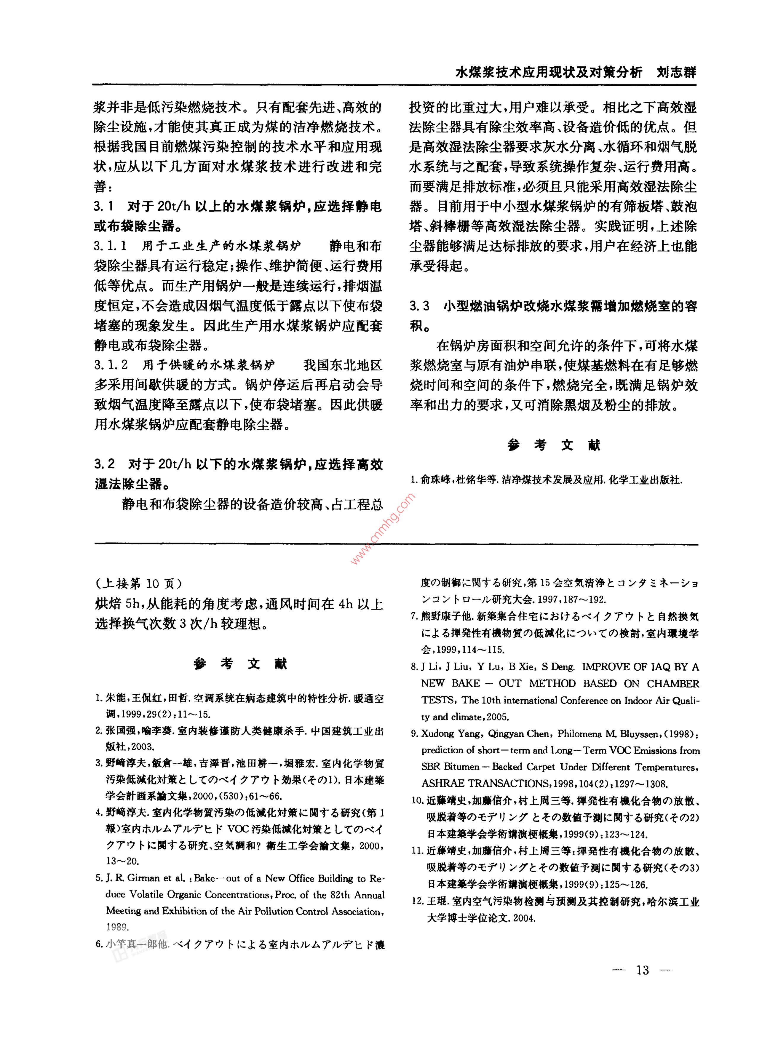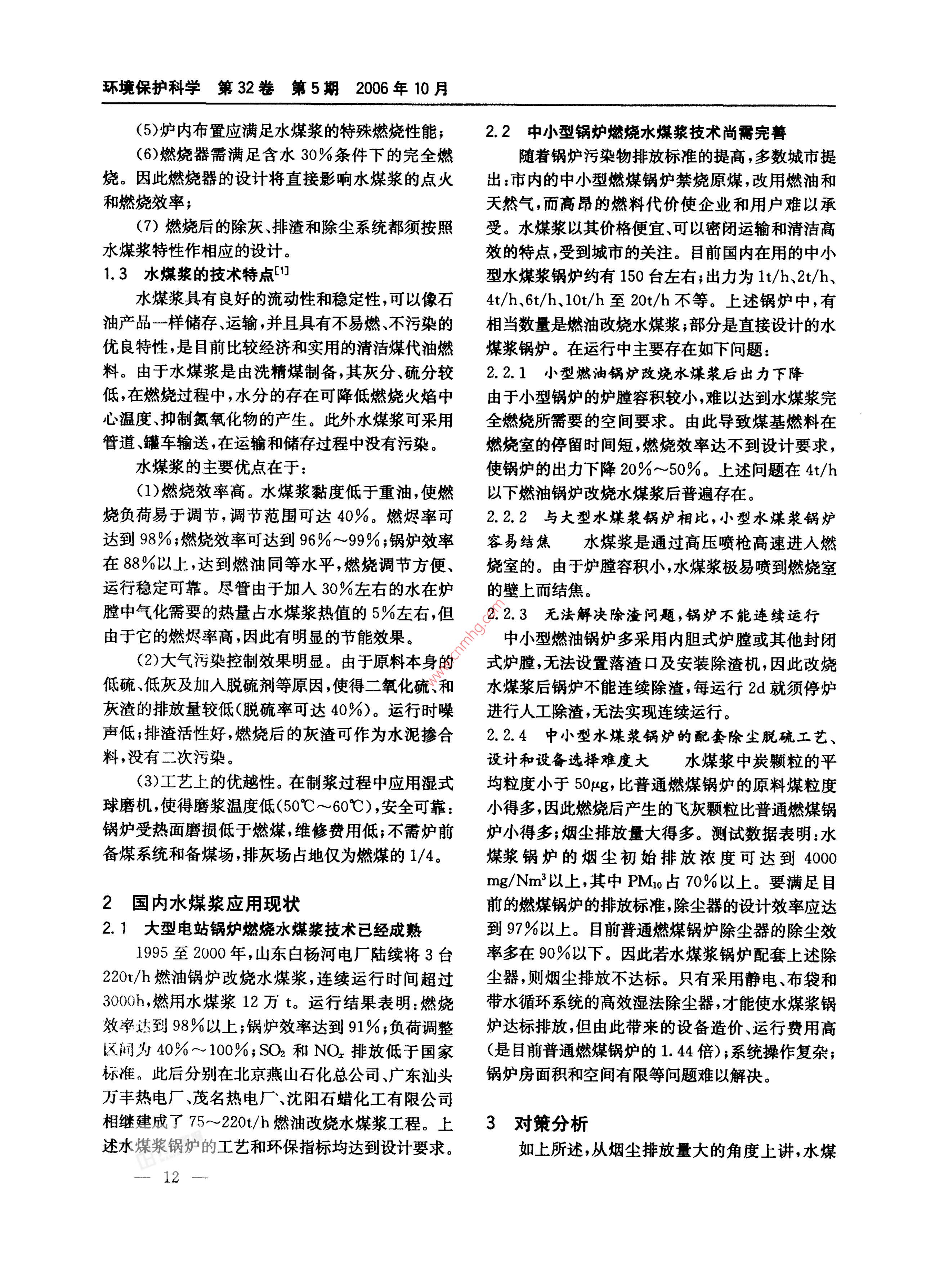 水煤漿技術(shù)應(yīng)用現(xiàn)狀及對(duì)策分析劉志群水煤漿技術(shù)應(yīng)用現(xiàn)狀及對(duì)策分析Application Status and countermeasureAnalysis on the Technology of Coal Water Mixture劉志群(沈陽環(huán)境科學(xué)研究院沈陽110016)摘要文章對(duì)水煤漿技術(shù)在工業(yè)化應(yīng)用過程中出現(xiàn)的技術(shù)問題進(jìn)行了分析并提出了相應(yīng)的對(duì)策。關(guān)鍵詞水煤漿鍋爐除塵器Abstract The technical problems of coal water mixture in utilization are studied and the correspondent measures are putforwardKey words Coal Water Mixture Boiler Dust Remover我國(guó)是世界上最大的煤炭生產(chǎn)國(guó)和消費(fèi)國(guó),也30%~35%的水和約1%的添加劑制成的混合物是世界上少數(shù)幾個(gè)以煤為主要能源的國(guó)家之一。合格的水煤漿應(yīng)達(dá)到如下技術(shù)要求見表1。到本世紀(jì)中葉,以煤為主的能源結(jié)構(gòu)將不會(huì)改變。表1水煤漿技術(shù)指標(biāo)2003年我國(guó)的煤炭消費(fèi)量已超過17億t,占能源項(xiàng)目技術(shù)指標(biāo)消費(fèi)比例的70%以上;而石油、天然氣則分別只占濃度66%~70%±1%172%和3.2%,其中進(jìn)口原油占25%已超過份30%左右7000萬t。由于海灣地區(qū)持續(xù)不斷的戰(zhàn)爭(zhēng),引發(fā)的黏度1士0.2Pa·s25℃,100s1時(shí)9yAm最大粒徑<300m平均粒度<50國(guó)際市場(chǎng)原油價(jià)格持續(xù)上漲,導(dǎo)致國(guó)家所面臨的外灰分硫分0.3‰~0.5%匯負(fù)擔(dān)和能源安全危機(jī)前所未見。因此根據(jù)我國(guó)發(fā)熱量18.8%~20.1/M·kg1能源以煤為主的國(guó)情,結(jié)合資源、技術(shù)和經(jīng)濟(jì)條件,穩(wěn)定性1~3個(gè)月研究和開發(fā)技術(shù)可靠經(jīng)濟(jì)可行的以煤代油技術(shù),12水煤漿燃燒的技術(shù)要求以便應(yīng)對(duì)日趨嚴(yán)峻的國(guó)際石油市場(chǎng),保證能源與環(huán)水煤漿的燃燒過程與原理與燃油鍋爐類似,但境的安全和可持續(xù)發(fā)展,是當(dāng)前所面臨的重要課是由于水煤漿燃料相對(duì)原煤、油、天然氣等原料的題不同物理化學(xué)特性,燃燒系統(tǒng)必須作特殊的設(shè)計(jì),水煤漿作為煤的潔凈燃燒和以煤代油技術(shù)的制備好的水煤漿在鍋爐的燃燒系統(tǒng)應(yīng)經(jīng)過下列重新產(chǎn)品近年來得到人們的高度重視,并在某些行業(yè)要過程:得到工業(yè)化應(yīng)用,但在實(shí)際運(yùn)行過程中暴露出的技(1)防止沉淀發(fā)生的爐前攪拌系統(tǒng);術(shù)問題需要解決。本文對(duì)上述問題產(chǎn)生的原因和2)防止堵塞的爐前過濾系統(tǒng)(在線過濾器)。解決的方法進(jìn)行了分析和討論。過濾器需具有承壓、密封和清洗等功能;(3)具有連續(xù)穩(wěn)定調(diào)節(jié)能力的供漿系統(tǒng)1水煤漿的技術(shù)要求及特點(diǎn)(4)霧化系統(tǒng)以壓縮空氣或蒸汽為介質(zhì)進(jìn)行霧1.1水煤漿制備的技術(shù)要求化,霧化噴嘴的設(shè)計(jì)好壞將直接影響水煤漿的點(diǎn)火水煤漿是由65%~70%不同粒度分布的煤、和燃燒效率;收稿日期:2005-08-17修回日期:2005-08-2作者簡(jiǎn)介:劉志群(1958-),男,遼寧海城人,高級(jí)工程師。環(huán)境保護(hù)科學(xué)第32卷第5期206年10月(5)爐內(nèi)布置應(yīng)滿足水煤漿的特殊燃燒性能;2.2中小型鍋爐燃燒水煤漿技術(shù)尚需完善(6)燃燒器需滿足含水30%條件下的完全燃隨著鍋爐污染物排放標(biāo)準(zhǔn)的提高,多數(shù)城市提燒。因此燃燒器的設(shè)計(jì)將直接影響水煤漿的點(diǎn)火出:市內(nèi)的中小型燃煤鍋爐禁燒原煤,改用燃油和和燃燒效率天然氣,而高昂的燃料代價(jià)使企業(yè)和用戶難以承(7)燃燒后的除灰排渣和除塵系統(tǒng)都須按照受。水煤漿以其價(jià)格便宜可以密閉運(yùn)輸和清潔高水煤漿特性作相應(yīng)的設(shè)計(jì)效的特點(diǎn),受到城市的關(guān)注。目前國(guó)內(nèi)在用的中小1.3水煤漿的技術(shù)特點(diǎn)型水煤漿鍋爐約有150臺(tái)左右出力為1t/h、2t/h水煤漿具有良好的流動(dòng)性和穩(wěn)定性可以像石4t/h、6/h、10/h至20t/h不等。上述鍋爐中,有油產(chǎn)品一樣儲(chǔ)存、運(yùn)輸,并且具有不易燃、不污染的相當(dāng)數(shù)量是燃油改燒水煤漿;部分是直接設(shè)計(jì)的水優(yōu)良特性是目前比較經(jīng)濟(jì)和實(shí)用的清潔煤代油燃煤漿鍋爐。在運(yùn)行中主要存在如下問題料。由于水煤漿是由洗精煤制備,其灰分硫分較2.2.1小型燃油鍋爐改燒水煤漿后出力下降低,在燃燒過程中,水分的存在可降低燃燒火焰中由于小型鍋爐的爐膛容積較小,難以達(dá)到水煤漿完心溫度、抑制氮氧化物的產(chǎn)生。此外水煤漿可采用全燃燒所需要的空間要求。由此導(dǎo)致煤基燃料在管道、罐車輸送,在運(yùn)輸和儲(chǔ)存過程中沒有污染。燃燒室的停留時(shí)間短,燃燒效率達(dá)不到設(shè)計(jì)要求,水煤漿的主要優(yōu)點(diǎn)在于:使鍋爐的出力下降20%~50%。上述問題在4t/h(1)燃燒效率高。水煤漿黏度低于重油使燃以下燃油鍋爐改燒水煤漿后普遍存在。燒負(fù)荷易于調(diào)節(jié)調(diào)節(jié)范圍可達(dá)40%燃燼率可2.2.2與大型水煤漿鍋爐相比,小型水煤漿鍋爐達(dá)到98%;燃燒效率可達(dá)到96%~99%;鍋爐效率容易結(jié)焦水煤漿是通過高壓噴槍高速進(jìn)入燃在88%以上,達(dá)到燃油同等水平,燃燒