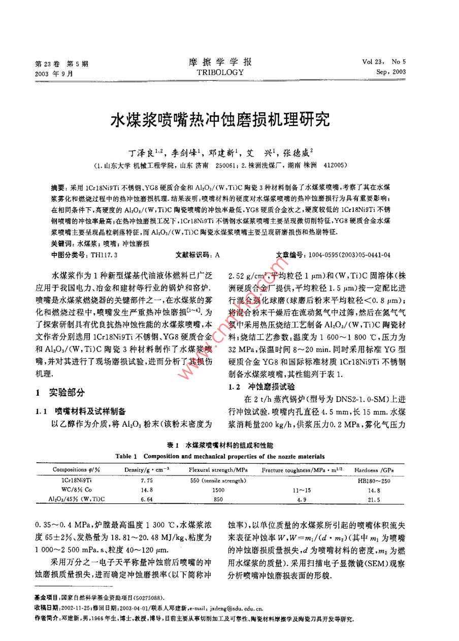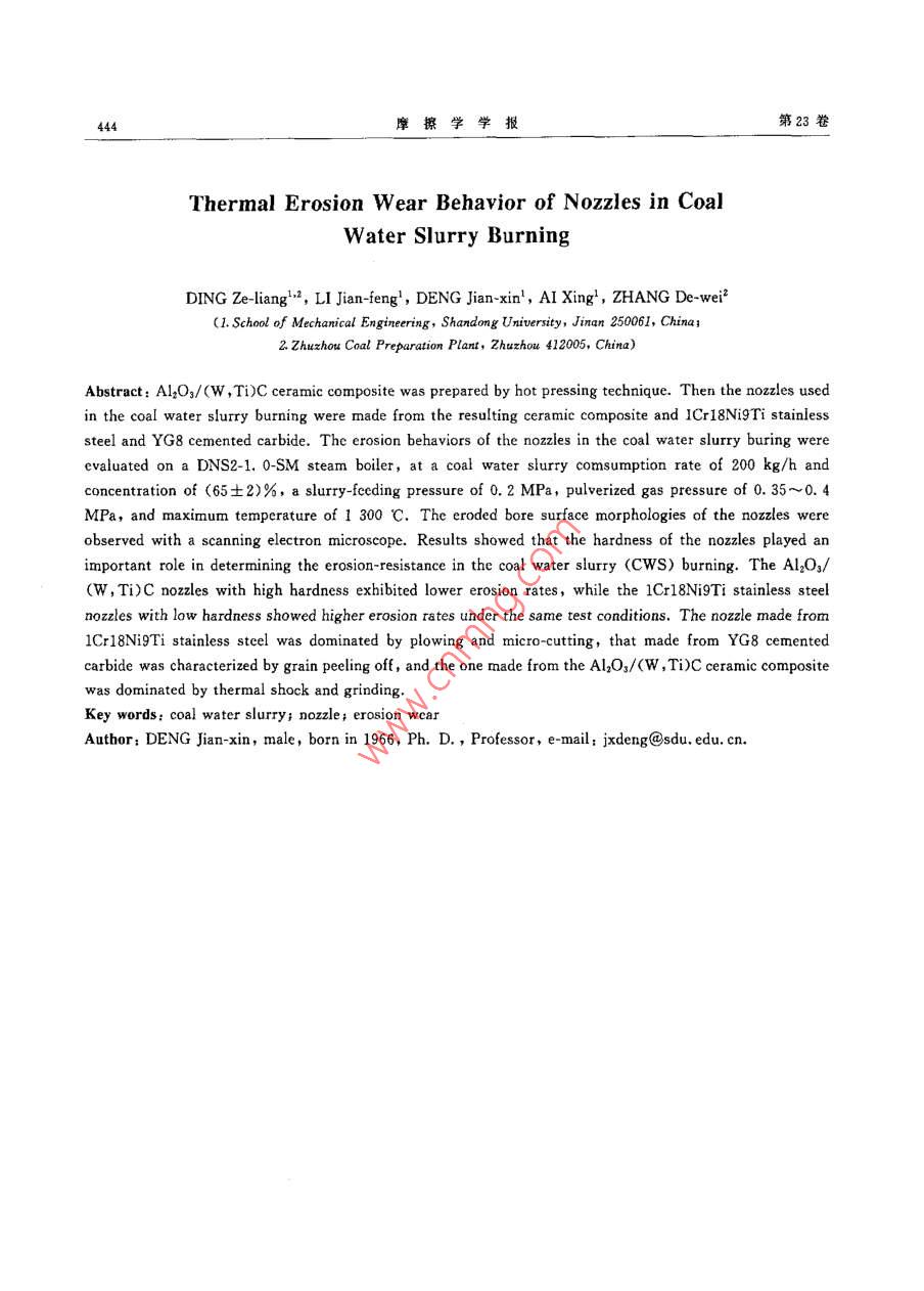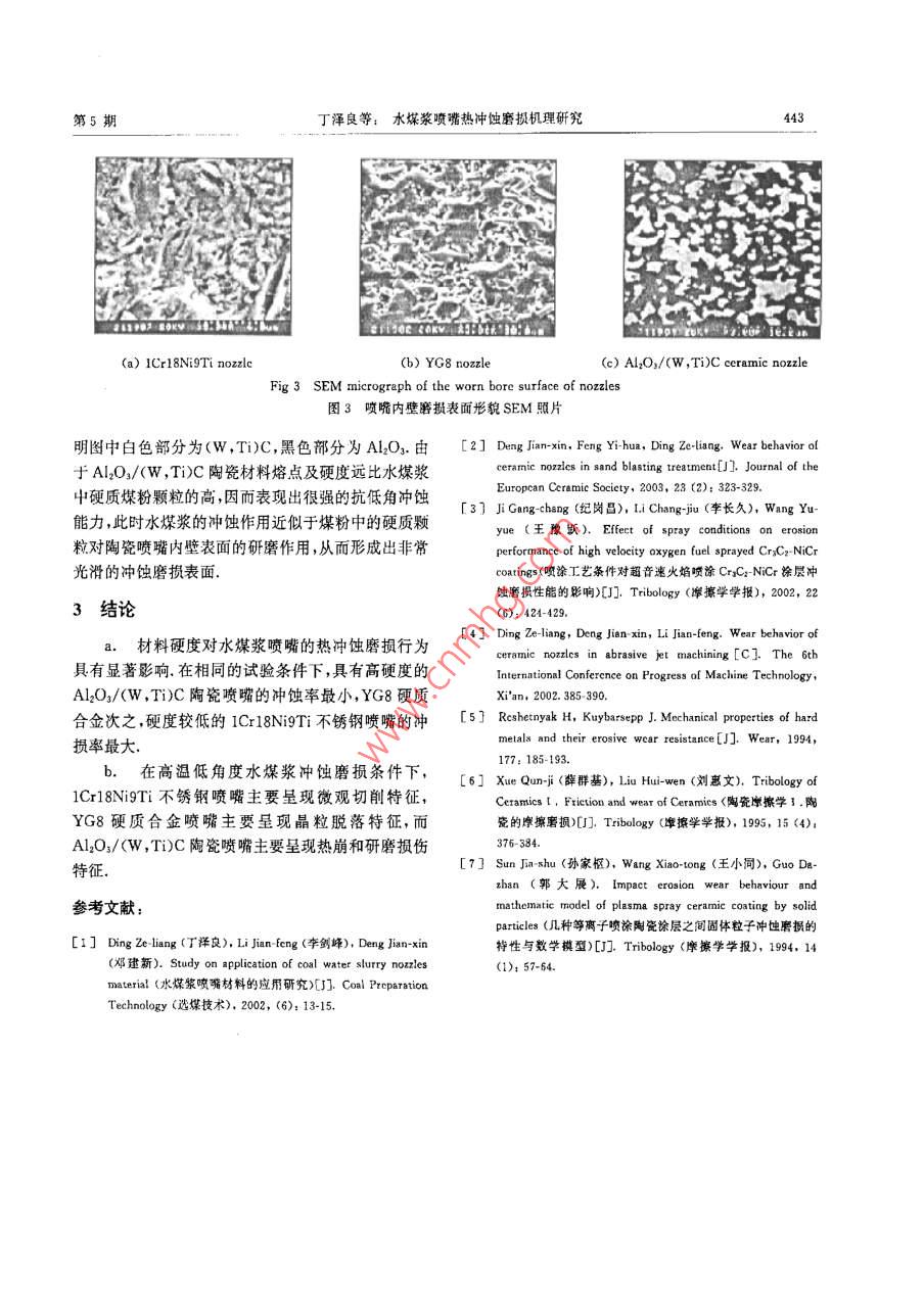 第23卷第5期摩擦學學報Vol 23, No 52003年9月TRIBOLOGYSep,2003水煤漿噴嘴熱沖蝕磨損機理研究丁澤良2,李劍峰1,鄧建新,艾興,張德威2(1.山東大學機被工程學院,山東濟南250061;2.株洲冼煤廠,湖南株洲412005)摘要:采用1Cr18NiTi不銹鋼、YG8硬質(zhì)合金和Al2O3/(W,Ti)C陶瓷3種材料制備了水煤漿噴嘴,考察了其在水煤漿霧化和燃燒過程中的熱沖蝕磨損機理結(jié)果表明:噴嘴材料的硬度對水煤漿噴嘴的熱沖蝕磨損行為具有重要影響在相同條件下,高硬度的A12O3/(W,TC陶瓷噴嘴的沖蝕率最低YG8硬質(zhì)合金次之,硬度較低的1cr18NTi不銹鋼噴嘴的沖蝕率最高;在熱沖蝕磨損工況下,Cr18Ni9Ti不銹鋼水煤漿噴嘴主要呈現(xiàn)微切削特征,YG8硬質(zhì)合金水煤漿噴嘴主要呈現(xiàn)晶粒剝落特征,而A2O3(W,Ti)C陶瓷水煤漿噴嘴主要呈現(xiàn)研磨損傷和熱崩特征,關(guān)鍵詞:水煤漿;噴嘴;沖蝕磨損中圖分類號:THl17.3文獻標識碼:A文章編號:104-0595(2003)05-044104水煤漿作為1種新型煤基代油液體燃料已廣泛2.52g/cm3,平均粒徑1m)和(W,T)C固溶體(株應用于我國電力、冶金和建材等行業(yè)的鍋爐和窯爐.洲硬質(zhì)合金廠提供,平均粒徑1.5m)按一定配比進噴嘴是水煤漿燃燒器的關(guān)鍵部件之一,在水煤漿的霧行混合強化球磨(球磨后粉末平均粒徑<0.8μm);化和燃燒過程中噴嘴發(fā)生嚴重熱沖蝕磨損~4,為將混合粉末干燥后在流動氮氣中過篩然后在氮氣氣了探索研制具有優(yōu)良抗熱沖蝕性能的水煤漿噴嘴,本氛中采用熱壓燒結(jié)工藝制備Al4O3/(W,Ti)C陶瓷材文作者分別選用Cr18NiTi不銹鋼、YG8硬質(zhì)合金料;燒結(jié)工藝參數(shù):溫度為1600~1800℃,壓力為和A2O3/(W,Ti)C陶瓷3種材料制作了水煤漿噴32MPa,保溫時間8~20min.同時采用標準YG型嘴,并對其進行了現(xiàn)場磨損試驗,進而分析了其損傷硬質(zhì)合金YG8和國際標準材質(zhì)1Cr8NiTi不銹鋼機理制備水煤漿噴嘴,其性能列于表1.1實驗部分1.2沖蝕磨損試驗在2t/h蒸汽鍋爐(型號為DNS2-1.0-SM)上進1.1噴嘴材料及試樣制備行沖蝕試驗噴嘴內(nèi)孔直徑4.5mm,長15mm.水煤以乙醇作為介質(zhì),將AO3粉末(該粉末密度為漿消耗量200kg/h,供漿壓力0.2MPa,霧化氣壓力表1水煤漿噴嘴材料的組成和性能Table 1sition and mDensity/gcm-1 Flexural strength/MPa Fracture toughness/MPa.m/2 Hardness/GPaI Cr18Ni9Ti75550(tensile strength)HB180~25011~1514.8Al O3/45%(W, Ti)C0.35~0.4MPa,爐膛最高溫度1300℃,水煤漿濃蝕率),以單位質(zhì)量的水煤漿所引起的噴嘴體積流失度65±2%發(fā)熱量為18.81~20.48MJ/kg、粘度為來表征沖蝕率W,W=m:/(d·m2)(其中m1為噴嘴1000~2500mPa,s、粒度40~120-m的沖蝕磨損質(zhì)量損失,d為噴嘴材料的密度,m2為燃采用萬分之一電子天平稱量沖蝕前后噴嘴的沖用水煤漿的質(zhì)量)采用掃描電子顯微鏡(SEM)觀察蝕磨損質(zhì)量損失進而確定沖蝕磨損率(以下簡稱沖分析噴嘴沖蝕磨損表面的形貌基金項目,國家自然科學基金資助項目(50275088)收稿日期:2002125修回日期:20030401/聯(lián)系人鄧建新,e-mail:jxdeng@sdu,edu.cn作者簡介鄧建新,男,1966年生,博士教授博導目前主要從事切削加工及可掌性陶瓷材料摩擦學及陶瓷刀具開發(fā)等研究摩擦學學報第23卷YG8等3種噴嘴的沖蝕率隨時間變化的關(guān)系曲線.可2結(jié)果與討論見,3種噴嘴的沖蝕率均隨沖蝕時間的增加而迅速增圖1示出了1Cr18Ni9Ti、AlO3/(W,TiC和大,當沖蝕試驗時間達到8h以后趨沖蝕率的變化244872120Erusinn time / at(a)1Cr18Ni9Ti nozzle(b)YG8 and Al O,/(W, Ti)C nozzlesFig 1 Variation of CWS nozzle erosion rates with the operation time圖1水煤漿噴嘴沖蝕率隨時間的變化于平穩(wěn).這主要是由于在磨損過程進入穩(wěn)定階段之前率較高,而高硬度陶瓷和硬質(zhì)合金材料在相同條件下存在明顯的快速磨損階段,在該階段沖蝕磨損率受到的沖蝕率很小.因此,高硬度的Al2O3/W,T)C表面平整度及表層材料在沖擊載荷作用下發(fā)生調(diào)整和YG8噴嘴的沖蝕率很小,而低硬度的1Cr8Ni9Ti等多種因素的顯著影響水煤漿對噴嘴的沖蝕屬于低噴嘴的沖蝕率很大.角度沖蝕,低硬度的韌性材料在低角度沖蝕下的沖蝕圖2為1Cr18Ni9Ti、Al2O3/(W,Ti)C和YG8等(a)1Crl8Ni9Ti nozzleCb)yG8 nozzle(c) Al,O,/(W, Ti)C nozzleFig 2 Optical photos of exit bore surfaces of the eroded nozzles圖2水煤漿噴嘴出口沖蝕磨損表面形貌金相照片3種噴嘴出口沖蝕磨損表面形貌金相照片,可見,比1Cr8Ni9Ti更硬的大量礦物質(zhì),其在噴嘴內(nèi)壁產(chǎn)1Crl8Ni9Ti噴嘴沖蝕后孔徑顯著增大,而YG8和生犁削作用,從而使噴嘴內(nèi)壁表面形成大量犁溝.因Al2O3/(W,Ti)C噴嘴沖蝕后的孔徑變化很小,但此,可以認為1Cr18N9Ti不銹鋼噴嘴的沖蝕磨損機Al2O3/(W,Ti)C噴嘴出口處出現(xiàn)了明顯的剝落現(xiàn)理主要表現(xiàn)為微觀切削象.由于在燃燒過程中水煤漿噴嘴內(nèi)部存在髙溫度梯由圖3(b)可見,YG8硬質(zhì)合金噴嘴磨損表面存度和熱應力,而陶瓷材料的抗熱沖擊性能遠不如金屬在許多凹坑這是由于YG8中含有熔點較低的金屬材料,因此,陶瓷噴嘴出口處的剝落現(xiàn)象主要歸因于粘結(jié)相Co,在水煤漿燃燒高溫作用下,粘結(jié)相Co變噴嘴內(nèi)部較大的熱應力這同圖1所示的陶瓷噴嘴在軟,很容易被煤粉中的硬質(zhì)顆粒沖蝕掉,從而在沖蝕初始階段較大的沖蝕率相一致磨損表面留下大量空洞凹坑以及凸起的wC顆粒圖3示出了3種噴嘴內(nèi)壁沖蝕磨損表面形貌從AloO3/(W,Ti)C陶瓷噴嘴內(nèi)壁磨損表面SEM照片.可見1Cr18NiTi不銹鋼噴