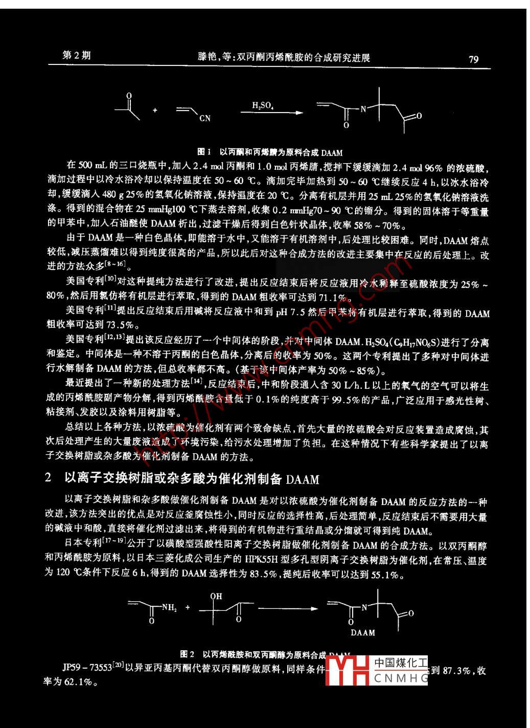 杓夕45534第16卷第2期膏島大學(xué)學(xué)報(bào)203年6月JOURNAL OF QINGDAO UNVERSITYJm.2003文章編號(hào):10061037(2003)02007804雙丙酮丙烯酰胺的合成研究進(jìn)展滕艷1,周曉東2,孫道興2,王鳳英(1.青島帝科精細(xì)化學(xué)有限公司,青島2661012青島科技大學(xué)化學(xué)與分子工程學(xué)院,青島266042)摘要:本文總結(jié)了雙丙酮丙烯酰胺的各種合成方法,比較了以濃硫酸、雜多酸、離子交換樹(shù)脂以及其它酸分別作為催化劑的合成方法的優(yōu)缺點(diǎn),并對(duì)雙丙酮丙烯酰胺的研究前景作了展望關(guān)鍵詞:雙丙酮內(nèi)烯酰胺;合成進(jìn)展;催化劑;濃硫酸;雜多酸;離子交換樹(shù)脂中圖分類號(hào):TQ24.1文獻(xiàn)標(biāo)識(shí)碼:A雙丙酮丙烯酰胺(簡(jiǎn)稱DAAM是一種重要的乙烯基單體,它的商品名是Lai,1965年由美國(guó)潤(rùn)滑油公司開(kāi)發(fā)成功。由于DAM的分子(圖1)的獨(dú)特構(gòu)型,使其具有許多優(yōu)良的性質(zhì)。例如:DAM含有兩個(gè)羰基使其可以發(fā)生交聯(lián)反應(yīng)。同曠羰基的a氫比較活潑也可以發(fā)生交聯(lián)反應(yīng)如醇醛縮合克腦文格反應(yīng)等。不僅如此,分子中的碳碳雙鍵的存在,使其易于進(jìn)行加成和聚合反應(yīng)。由于其具有胺基,使其顯示出獨(dú)特的反應(yīng)性和溶解性。DAAM單體易于采用本體聚合、溶液或乳液癜合的方式生成高分子棗合物,它作為種優(yōu)良的交聯(lián)劑在聚合物工業(yè)中已經(jīng)獲得了廣泛的應(yīng)用。DAAM可用于不飽和聚酯樹(shù)脂、鄰苯二甲酸二烯丙酯的交聯(lián)劑和紙張?jiān)鰪?qiáng)基等。DAAM還可以作為固化劑生產(chǎn)環(huán)氧樹(shù)脂和船底防銹漆等。DAAM的均聚和共聚物不溶于水,但具有水呼吸性,吸水率達(dá)自重的20%~30%。當(dāng)環(huán)境濕度小于60%時(shí),還能放出水分。利用這一特點(diǎn),DAAM可以用于發(fā)膠的固化劑和感光樹(shù)脂等。此外,DAM又可用于制備各種粘接劑、包裝材料、密封材料以及潤(rùn)滑劑等綜上所述,DAAM在化工領(lǐng)域中占有重要的地位。因此從1965年被首次合成以來(lái),受到了人們愈來(lái)愈多的重視,迄今每年仍有大量有關(guān)的文章發(fā)表。國(guó)內(nèi)目前對(duì)DAAM的合成研究仍然停留在以濃硫酸為催化劑的階段1-61,落后于國(guó)外的研究水平。本文總結(jié)了各種合成方法,根據(jù)催化劑的不同將其分為4類,即以大量濃硫酸、雜多酸和離子交換樹(shù)脂、以及少量酸分別為催化劑合成DAAM進(jìn)行了綜述,并指出了研究方向1以大量濃硫酸為催化劑制備DAAM1.1制備原理以濃硫酸為催化劑制備DAAM是一種傳統(tǒng)的合成方法,該合成方法的優(yōu)點(diǎn)是可以用比較便宜的丙酮和丙烯腈作為原料,成本比較低,缺點(diǎn)是需要大量的濃硫酸作催化劑(按摩爾比是丙烯腈的24倍),后處理造成了環(huán)境污染。最初的反應(yīng)流程見(jiàn)圖1。12制備方法中國(guó)煤化工收稿日期:20303-14CNMHG作者簡(jiǎn)介:滕艷(1971-),女,199年7月畢業(yè)于福州大學(xué)化工系,199年于青島海洋大學(xué)化學(xué)系環(huán)魔科學(xué)專業(yè)攻讀碩士學(xué)位,在職碩士?,F(xiàn)工作于背島帝科精細(xì)化學(xué)有限公司,工程師。研究方向液晶中間體和單體的合成。第2期滕艷,等:雙丙酮丙烯酰胺的合成研究進(jìn)展圖1以丙酮和丙烯腦為原料合成DAAM在500mL的三口燒瓶中,加入24mol丙酮和1.0mol丙烯腈,攪拌下緩緩滴加2.4m%%的濃硫酸滴加過(guò)程中以冷水浴冷卻以保持溫度在50~60℃。滴加完畢加熱到50~60℃繼續(xù)反應(yīng)4h,以冰水浴冷卻,緩緩滴入480g25%的氫氧化鈉溶液,保持溫度在20℃。分離有機(jī)層并用25m25%的氫氧化鈉溶液洗滌。得到的混合物在25mmHg100℃下蒸去溶劑,收集0.2mmHg70-90℃的鎦分。得到的固體溶于等重量的甲苯中,加入石油醚使DAM析出,過(guò)濾干燥后得到白色針狀晶體收率58%~70%。由于DAAM是一種白色晶體,即能溶于水中,又能溶于有機(jī)溶劑中,后處理比較困難。同時(shí),DAAM熔點(diǎn)較低,減壓蒸餾難以得到純度很高的產(chǎn)品,所以此后對(duì)這種合成方法的改進(jìn)主要集中在反應(yīng)的后處理上。改進(jìn)的方法眾多8-161。美國(guó)專利對(duì)這種提純方法進(jìn)行了改進(jìn),提出反應(yīng)結(jié)束后將反應(yīng)液用冷水稀釋至硫酸濃度為25%80%,然后用氯仿將有機(jī)層進(jìn)行萃取得到的DAM粗收率可達(dá)到71.1美國(guó)專利1提出反應(yīng)結(jié)束后用堿將反應(yīng)液中和到pH75然后甲苯將有機(jī)層進(jìn)行萃取,得到的DAAM粗收率可達(dá)到735%。美國(guó)專利13提出該反應(yīng)經(jīng)歷了一個(gè)中間體的階段,并對(duì)中間體 DAAM. H,SC4(CH1NOQS)進(jìn)行了分離和鑒定。中間體是一種不溶于丙酮的白色晶體,分離后的收率為50%。這兩個(gè)專利提出了多種對(duì)中間體進(jìn)行水解制備DAAM的方法,但總收率都不高。(基于該中間體產(chǎn)率為50%~85%)。最近提出了一種新的處理方法1,反應(yīng)結(jié)束后,中和階段通入含30L/h.L以上的氧氣的空氣可以將生成的丙烯酰胺副產(chǎn)物分解得到丙烯酰胺含量低于0.1%的純度高于99.5%的產(chǎn)品,廣泛應(yīng)用于感光性樹(shù)、粘接劑、發(fā)膠以及涂料用樹(shù)脂等??偨Y(jié)以上各種方法,以濃硫酸為催化劑有兩個(gè)致命缺點(diǎn),首先大量的濃硫酸會(huì)對(duì