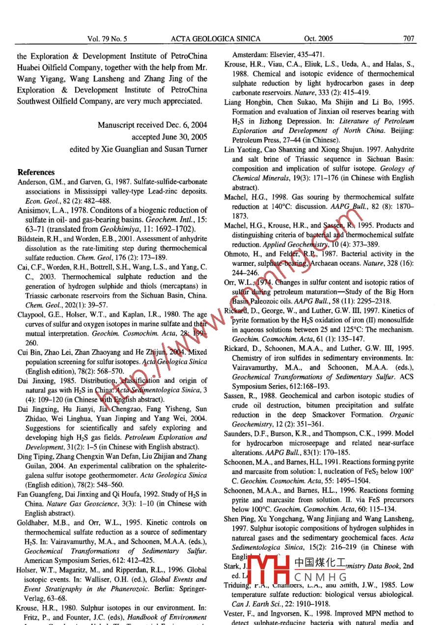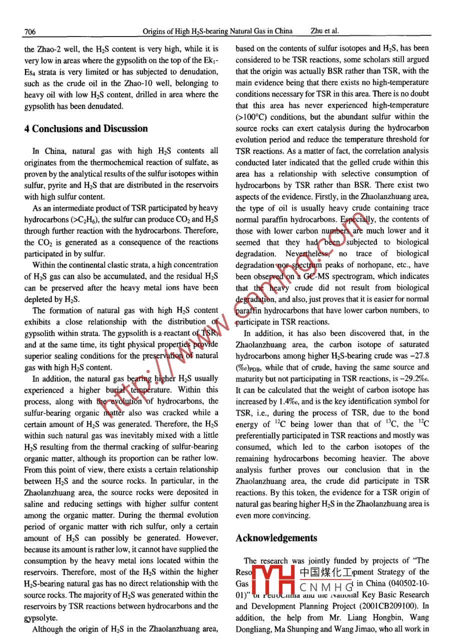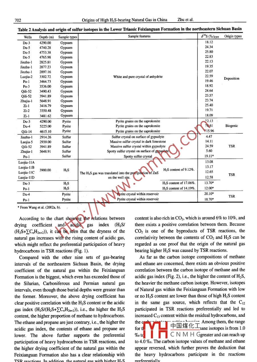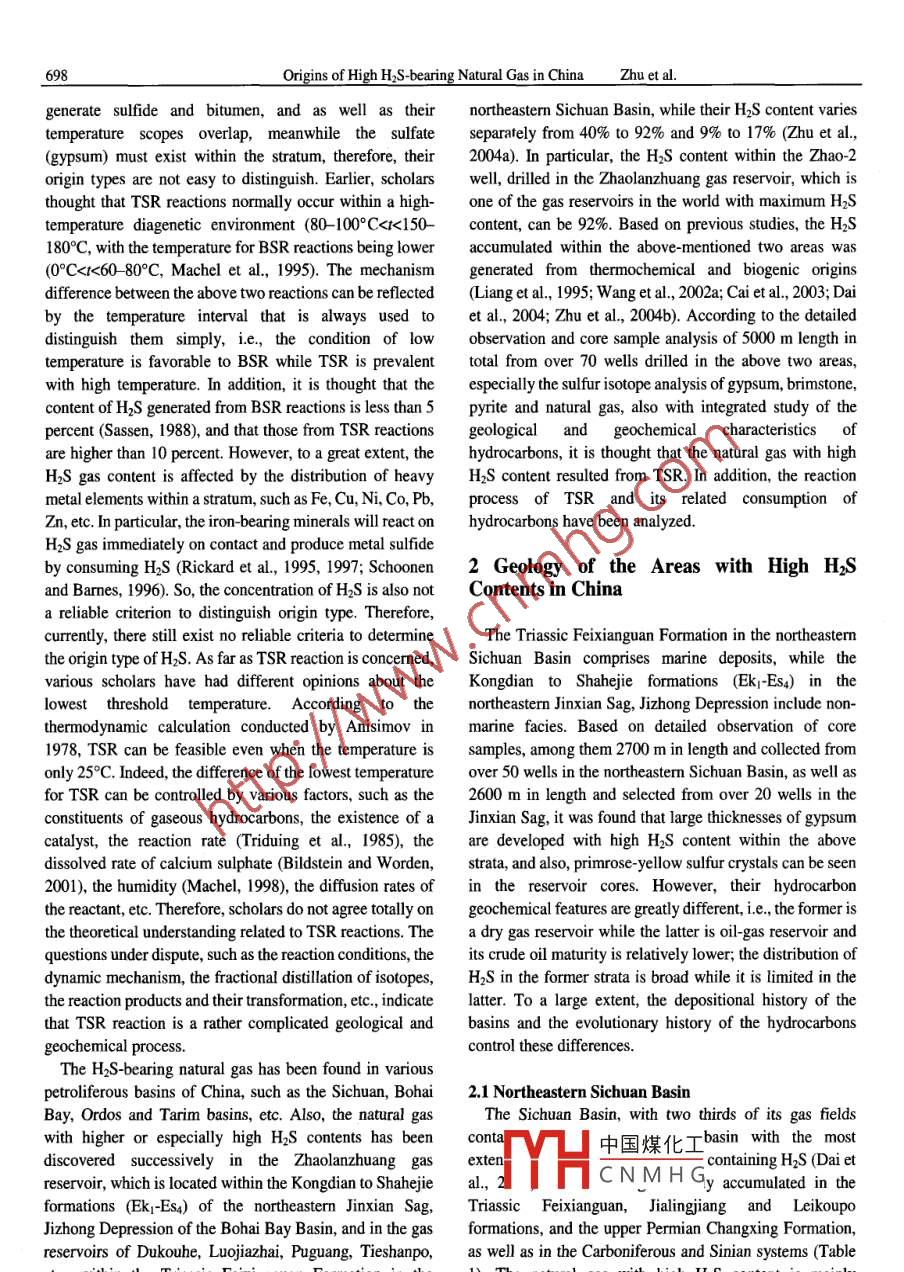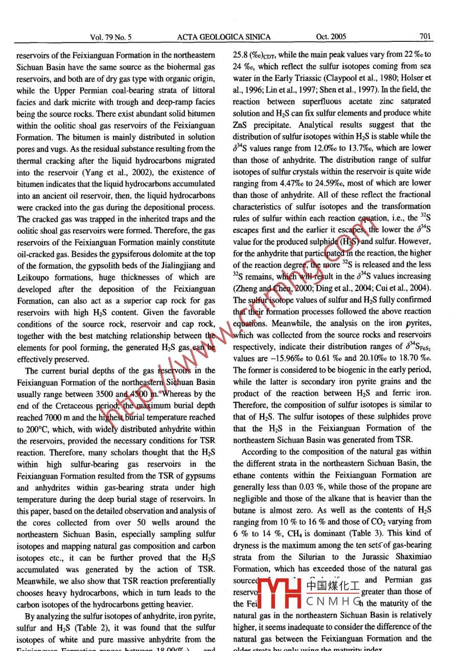 Vo.79No.5pp.697-708ACTA GEOLOGICA SINICAoct.2005Origins of High H2s-bearing Natural Gas in ChinaZHU Guangyou, ZHANG Shuichang, LIANG Yingbo, DAI Jinxing and Li JianResearch institute of Petroleum Exploration and Development, China National petroleumorporation,Beijing100083;E-mail:zhuguangyou@petrochina.com.cnAbstract Natural gas containing hydrogen sulphide(H2S)has been found in several petroliferous basins in China, suchas the Sichuan Basin, Bohai Bay Basin, Ordos Basin, Tarim Basin, etc. Natural gas with higher H2s contents(H2S >5%mol )is mostly distributed in both the gas reservoirs of Dukouhe, Luojiazhai, Puguang and Tieshanpo, which belong to theTriassic Feixianguan Formation in the northeastern Sichuan Basin and those of the Kongdian-Shahejie formations in thenortheastern Jinxian Sag of the Jizhong Depression, Bohai Bay Basin. In the Sichuan Basin, the H]S contents of naturalaverage over 9% and some can be 17 % while those of the Bohai Bay Basin range from 40 to 92 %, being then one ofthe gas reservoirs with the highest H]S contents in the world. Based on detailed observation and sample analysis results ofa total 5000 m of core from over 70 wells in the above-mentioned two basins, especially sulfur isotopic analysis of gypsumbrimstone, pyrite and natural gas, also with integrated study of the geochemical characteristics of hydrocarbons, it isthought that the natural gas with high H2S contents resulted from thermochemical sulfate reduction (TSR) reactions.Among them, the natural gas in the Feixianguan Formation resulted from TSR reactions participated by hydrocarbon gas,while that in the Zhaolanzhuang of the Jinxian Sag being the product of Tsr participated by crude oil. During theonsumption process of hydrocarbons due to TSR, the heavy hydrocarbons were apt to react with sulfate, whichaccordingly resulted in the dry coefficient of natural gas increasing and the carbon isotopes becoming heavierKey words: natural gas, hydrogen sulphide, gypsum, thermochemical sulfate reduction (TSR), northeastern SichuanBasin, Zhaolanzhuang1 Introduction(1999)separately conducted earlier studies on geologicalaspects of H]s and carried out pertinent research as well asAs one of the hazardous components of natural gas, the experimental analysis on its formation, reactionexistence of H2s not only decreases the percentage of temperature, reaction condition, reaction kinetics andhydrocarbon gas within the natural gas and thus its genetic features, etc. Many scholars thought that the highlyindustrial value, but also threatens each aspect of drilling concentrated H2s gas within petroliferous basins mainlyand exploitation. In addition, H2S may cause serious originated from either biogenic agency or thermochemicalaccidents because of its strong toxicity and causticity that reduction(Machel et al., 1995)). Among these, the h2saffects safety, which accordingly leads to higher resulting from biogenic sulfate reduction (BSr)wasexploration and production costs and the risk of natural gas generated by the dissimilation and reducing metabolism ofwith a higher H2S content. The contents of H2s within sulfate by sulfate-reducing bacteria. The reaction formula isnatural gas can be from 0 to 99%. Usually, natural gas with as followsits HS content being greater than 5% can be specified as Organic Matter +CaSO4 sulfate reducing bactena action,natural gas with a high H]S content(Dai, 1985 )and, withinCaCO3+h2S+H,Ocarbonate reservoirs, the H2s contents are comparativelyMoreover, the thermochemical origin of H2s mainlyhigher. Because the natural gas containing H2s is the refers to the generation of H2s due to the thermochemicalimportant part of the natural gas resources, and that the reduction of sulfate, i. e, the sulfate reacts with the organicnatural gas with high H2S content also being one of the key matter or hydrocarbons, and deoxidizes the sulfate mineralssources of sulfur, to a certain extent, the study of H2s has into H中國(guó)煤化工 The reaction formuldeoxidized while thebeen emphasized globally. Thereunto, scholars, such as Orr gase(1974), Stark and Wallace(1984), Ohmoto and Felder is asCNMHG( 1987), Anderson and Garven(1987), Krouse et al. ( 1988), Hydrocarbons+ CaSO4- CacO3+ H2s+Sassen(1988), Schoonen and Barnes(1991), Goldhaber CO+ S+ H20and Orr(1995), Machel et al. (1995), worden et al. ( 1995,Due to the actions of BsR and TSR, which both belong1996), Vester and Ingvorsen(1998)and Saunders et al. to the sulfate reduction of hydrocarbons and can both698Origins of High HS-bearing Natural Gas in Chinagenerate sulfide and bitumen, and as well as their northeastern Sichuan Basin, while their H2s content variestemperature scopes overlap, meanwhile the sulfate separately from 40% to 92% and 9% to 17%(Zhu et al(gypsum) must exist within the stratum, therefore, their 2004a). In particular, the H2s content within the Zhao-2origin types are not easy to distinguish. Earlier, scholars well, drilled in the Zhaolanzhuang gas reservoir, which isthought that TSR reactions normally occur within a high- one of the gas reservoirs in the world with maximum H2stemperature diagenetic environment(80-1000C<<<150- content, can be 92%. Based on previous studies, the H2S180 C, with the temperature for BSR reactions being lower accumulated within the above-mentioned two areas was(0CC2H6, the sulfur can produce CO2 and H2s normal paraffin hydrocarbons. Especially, the contents ofthrough further reaction with the hydrocarbons. Therefore, those with lower carbon numbers are much lower and itthe CO2 is generated as a consequence of the reactions seemed that they had been subjected to biologicalparticipated in by sulfurdegradation. Neverthelof biologicwithin the continental clastic strata, a high concentration degradation nor spectrum peaks of norhopane, etc, haveof H]S gas can also be accumulated, and the residual H2s been observed on a GC-MS spectrogram, which indicatescan be preserved after the heavy metal ions have been that the heav