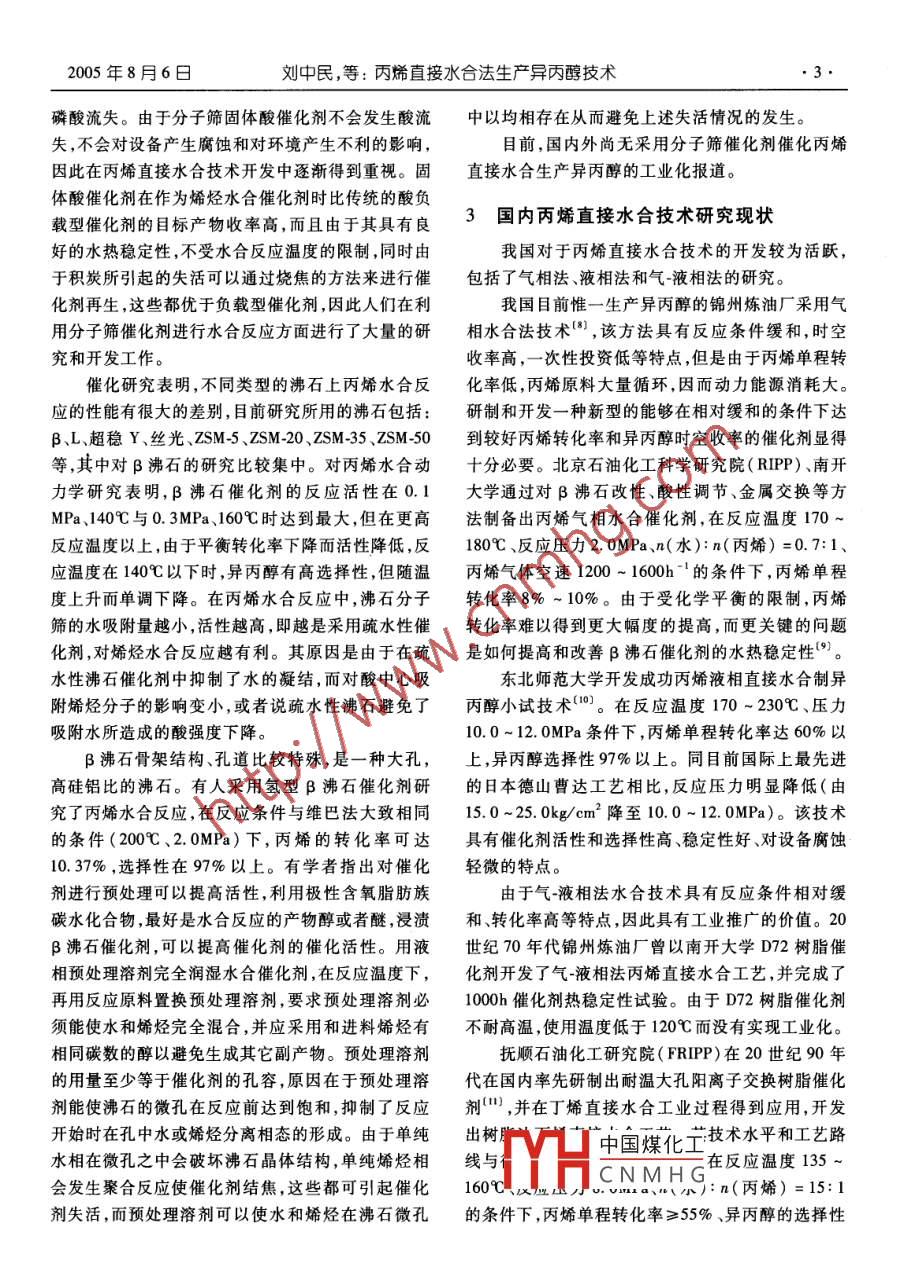 第13卷第15期精細與專用化學品Vol. 13. No. 12005年8月6日Fine and Specialty Chemicals專論與綜道丙烯直接水合法生產異丙醇技術劉中民朱書魁張世剛楊虹熠(中國科學院大連化學物理研究所,遼寧大連116023)要:介紹了氣相、液相、氣液相等3種丙烯直接水合制異丙醇的工業(yè)生產技術,并評述了各自的優(yōu)缺點。介紹了固體酸催化劑在丙烯直接水合制異丙醇催化反應中的應用研究進展及國內異丙醇的生產和研究現(xiàn)狀,并對國內異丙醇的生產前景進行了展望關鍵詞:異丙醇;直接水合;丙烯Progress on Production of Isopropanol by Direct Hydration of propyleneLIU Zhong-min, ZHU Shu-kui, ZHANG Shi-gang, YANG Hong-yi(Dalian Institute of Chemical Physics,The Chinese Academy of Sciences,Dalian116023,China)Abstract: Three different processes, i.e. the gas phase process, liquid phase process and process of gas-liquid mixedphase, for producing isopropanol used in industry and its advantages and disadvantages are introduced. Recent advances inusing solid acid catalyst in direct hydration of propylene for isopropanol production and current situation of research workand production of isopropanol are also introduced. Finally, development of producing isopropanol by direct hydration of pro-Key words: isopropanol; directing hydration; propylene yue researches at homepylene in China is forecasted based on the production and technique researches at home異丙醇是重要的基本有機化工原料之一,又是轉化率高達90%以上;不足之處是流程復雜,水解種性能優(yōu)良的溶劑被廣泛應用于溶解硝酸纖維酯類和硫酸再生需要消耗大量的蒸汽,設備腐蝕嚴素橡膠、油漆等。隨著應用領域的擴展異丙醇在重廢水和廢氣處理較為困難,對環(huán)境有嚴重污染,醫(yī)藥農藥、精細化工、環(huán)保、電子等行業(yè)亦有廣闊的20世紀80年代后該法逐漸被淘汰應用前景。1.2丙烯直接水合法異丙醇工業(yè)生產技術直接水合法是一種采用高活性催化劑和與環(huán)境保護相適應的新技術,該法克服了間接水合法的缺目前,國內外工業(yè)生產異丙醇的方法主要是丙烯水合法,其工藝路線又可分為丙烯間接水合法和點,具有高效、低耗、流程簡短等優(yōu)點,是當今水合生丙烯直接水合法2種)。產技術發(fā)展的主要方向。丙烯直接水合反應表達式1.1丙烯間接水合法如下:丙烯與濃硫酸反應生成硫酸二異丙酯,再水解CH, CH-CH2+ H,0-+(CH,), CHOH制得粗異丙醇,精制后可得到高純度的異丙醇產品。丙烯水合反應的放熱量約51.5kJ/mol,基礎理該法的優(yōu)點是可以利用低濃度的兩烯作原料,丙烯論研究結果表明:低溫、高壓、水過量較多有利于丙·收稿日期:20050603作者簡介:劉中民(1964-),男,國際分子篩會議第13、14屆學術mal of Natural Gas Conversion》雜志編委,吉林大學、鄭州大學客座教授,中科院研究生院教授中國煤化工士生導師。主持了“甲醇制取低碳烯烴(DMTO)”、“重油催化裂解制低碳烯烴(RSCC)”、“年CNMHG等重大科技項目的開發(fā),還承擔了國家973計劃基礎研究課題、中科院重大項目和知識創(chuàng)新課題、中國石油重大項目等多項課題和中法、中英、中美等國際合作課題。精細與專用化學品第13卷第15期烯水合反應的化學平衡。根據(jù)使用的催化劑不同,多的物料配比,因此能耗也較大。過高的反應壓力,已有氣相、液相和氣-液混相3種丙烯直接水合工藝造成了設備投資偏高,適合建設較大規(guī)模的生產裝應用于工業(yè)生產。置。德土古工藝采用低溫、中壓和滴流床工藝,水和1.2.1氣相直接水合法〔維巴(Veba)工藝〕丙烯的物質的量比一般為15左右,目的在于抑制丙氣相直接水合工藝使用磷酸載體催化劑,n(丙烯聚合等副反應和進行反應溫度控制,避免反應超烯):n(水)=1:0.6-0.8,在反應溫度180~260℃,溫造成樹脂催化劑分解失活。該工藝具有反應條件壓力2.0~2.5MPa條件下,進行氣相直接反應,生適宜,丙烯轉化率高,異丙醇選擇性好、能耗低等特成粗異丙醇溶液,丙烯單程轉化率為5%~7%,異點。缺點是樹脂催化劑不耐溫度沖擊,使用溫度不丙醇選擇性為98%。氣相水合法的優(yōu)點是:反應條宜超過175℃、樹脂催化劑存在磺酸基團流失的問件緩和,反應壓力低,流程簡單,設備投資較少,同時題。對設備腐蝕、環(huán)境污染問題較硫酸法有了很大的改從丙烯直接水合反應過程分析知道,在低溫、高善壓的條件下,丙烯的平衡轉化率高。然而,溫度較低1.2.2液相直接水合法〔德山曹達( Tokuyanla So-時反應速率太慢;提高反應溫度,雖可以加快反應速da)工藝〕度,但會對反應帶來不利影響:①丙烯平衡轉化率降液相直接水合工藝使用活性、選擇性都良好的低;②異丙醇選擇性降低。提高壓力,可以提高丙烯鎢系雜多酸催化劑,催化劑溶于來自精制工序的循轉化率,原因是只有溶解于水中的丙烯才能在催化環(huán)工藝水中,在反應溫度240~280℃,壓力劑表面起反應,壓力增高會增加丙烯在水中的溶解20.0MPa的條件下,原料丙烯進行接觸反應,生成的度,但壓力過高會增加設備投資和操作費用。因此異丙醇水溶液進人共沸塔進行分離提濃。液相直接在上述已經工業(yè)化的丙烯直接水合生產技術中,以水合法的優(yōu)點是:催化劑活性高,丙烯和雜多酸陰離氣-液相法生產技術反應條件緩和、丙烯轉化率高子能形成活性絡合物,與傳統(tǒng)的硫酸法相比,在相同異丙醇時空產率高等優(yōu)點受到人們的廣泛注意和使氫離子濃度的情況下,反應速度增大