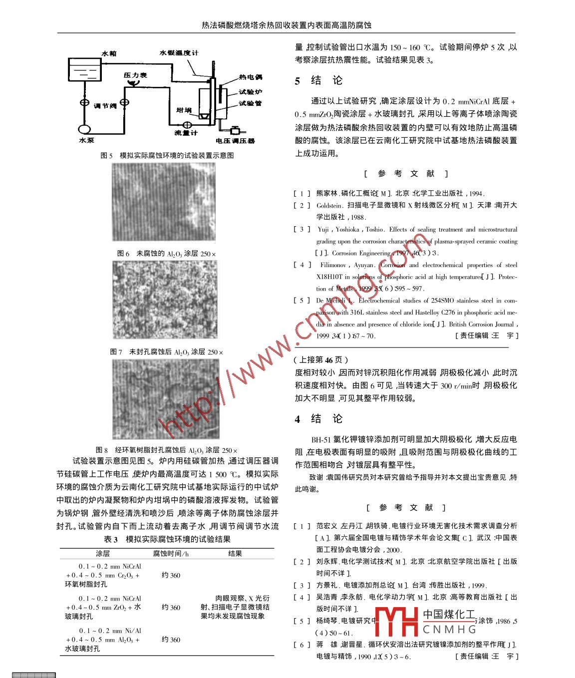 第35卷第12期材料保護(hù)Vol.35 No. 122002年12月MATERIALS PROTECTIONDec. 2002氯化鉀鍍鋅添加劑的電化學(xué)性能蒲海麗洪榕高中平(廣州市二輕研究所廣東廣州510170 )[摘要]對(duì)BH-51氯化鉀鍍鋅添加劑及其主要成分的極化性能微分電容、整平性、反應(yīng)電阻等進(jìn)行了初步研究結(jié)果表明氯化鉀鍍鋅添加劑可明顯加大陰極極化對(duì)鍍層具有整平性。[關(guān)鍵詞]氯化鉀鍍鋅 添加劑極化曲線微分電容整平性反應(yīng)電阻[中圖分類號(hào)] TQ153. 1[文獻(xiàn)標(biāo)識(shí)碼]A[文章編號(hào)] 1001 - 1560 2002 )12- 0045 - 02Electrochemical Behavior of Additive for Potassium Chloride Zinc PlatingPU Hai-li , HONG Rong , GAO Zhong _ping( Institute of Guangzhou 2nd Light Industry , Guangzhou 510170 , China )Abstract : The polarization , differential capacitance , flttening capability and reaction resistance of BH 51 zineplating additive and its main components were all studied. Results showed that the additive could increase the cathodicpolarization and thus had flattening effect for zine plating.Key words : potassium chloride zinc plating ; additive ; polarization curve ; dfferential capacitance ; fattening ca-pability ; reaction resistance甘汞電極測(cè)定微分電容交流信號(hào)的頻率取10 Hz測(cè)定反應(yīng)電阻1前言交流信號(hào)的頻率范圍為0.1 MHz~5.0Hz溫度26-~28 C ,pH 值無(wú)銨氯化物鍍鋅工藝具有環(huán)境污染小鍍層光亮度高沉積為5.5 開(kāi)路電位-1.044 V。速度快等特點(diǎn)因此在國(guó)內(nèi)外被廣泛應(yīng)用。目前我國(guó)氯化物鍍鋅(4)溶液配制采用分析純化學(xué)試劑、 去離子水配制。基礎(chǔ)已超過(guò)全部鍍鋅的45%[1。近年來(lái)鍍鋅多用于裝飾性鍍層要液配方 :Kal 200 g/L 2nCl; 6H20 60 g/L HBO3 30g/L。微分電容求鍍層有較高的光亮度和整平性。因此研制了-種全光亮、低脆底液配方 :KCl 200 g/L HBO3 30 g/Lo性、低消耗的氯化鉀鍍鋅新工藝。本文著重對(duì)其極化性能、整平3結(jié)果與討論性和吸附能力等進(jìn)行了初步的研究。3.1陰極極化2.試驗(yàn)與其他過(guò)渡金屬相比,Zn/Zn2+電極的電化學(xué)反應(yīng)速度常數(shù)2.1試驗(yàn)儀器很大因此在鋅離子無(wú)添加劑的無(wú)銨氯化物鍍液中只能得到粗糙所用儀器包括:美國(guó)PARC公司MODEL370-8電化學(xué)系統(tǒng)及無(wú)光的鍍鋅層。要降低鋅的電沉積速度鍍出細(xì)致光亮的鍍層,M378電化學(xué)阻抗系統(tǒng)美國(guó)PINE公司旋轉(zhuǎn)圓盤電極裝置上海常 采用添加強(qiáng)配位體或有機(jī)添加劑的方法。新研制的BH-51氯辰華儀器公司電化學(xué)工作站。化鉀鍍鋅添加劑由載體光亮劑、輔助光亮劑和主光劑組成,可獲2.2試驗(yàn) 條件得令人滿意的鍍鋅層。( 1)極化曲線參比電極為飽和甘 汞電極研究電極為鉑電載體光亮劑主要由表面活性劑組成在鍍液中主要起提高鍍極面積約為0.07 cn2 ,輔助電極為大面積鉑電極,掃描速度液的陰極極化 促進(jìn)主光劑在鍍液中均勻分布的作用。圖1為基20 mV/s溫度26~28 C。礎(chǔ)液中加入不同量載體光亮劑的陰極極化曲線。由圖1可知載(2)整平性研究電極、 輔助電極均為鉑電極,參比電極為體光亮劑的加入明 顯增大了鍍液的陰極極化,且陰極極化曲線的飽和甘汞電極研究電極面積為0.2 am2輔助電極為大面積鉑電形狀也發(fā)生 了較大的變化。在-1.13~ -1. 18 V( vs SCE )的電位極掃描速度10 mV/s,掃描 范圍- 1.5~ 0 V ,旋轉(zhuǎn)速度區(qū)間出現(xiàn)了 一個(gè)不隨電位變化的電流平臺(tái)此極限電流遠(yuǎn)小于極3 000 r/min溫度26~28 C。限擴(kuò)散電流。這表明鋅的電沉積過(guò)程出現(xiàn)了新的控制步驟。載(3)微分電容與反應(yīng)電阻選用交流阻抗法。 研究電極為體光亮劑在電 極表面吸中國(guó)煤化工Zn2+必須穿鉑上鍍鋅面積為0.2 cm?輔助電極為鉑電極參比電極為飽和過(guò)此吸附層 才能在電極MHCNMHG化能。由于Zn2+ 在電極上放電是-個(gè)快反應(yīng)但其穿越吸附層是一個(gè)慢反[收稿日期] 2002 -08-12.應(yīng)因此鋅的電沉積速度得到了有效抑制。隨著載體光亮劑濃度45氯化鉀鍍鋅添加劑的電化學(xué)性能的增大陰極極化也增大。當(dāng)載體光亮劑的濃度增大至一定量時(shí)陰極極化不再明顯增大。這是因?yàn)榛钚晕镔|(zhì)的吸附層往往只具有單分子濃度而載體光亮劑是一種大分 子的表面活性劑其C 8:51掭加劑空間位阻效應(yīng)較強(qiáng)導(dǎo)致了載體光亮劑的飽和現(xiàn)象。1.0 1.2 1.4 1.6 1.8E(vs SCE)/V圖4微分電容曲線3.3電極反 應(yīng)電阻本文測(cè)定電極反應(yīng)電阻選用交流阻抗法。鍍液含添加劑時(shí)E(vg SCE)/V電極反應(yīng)電阻達(dá)到100 2/em2左右,而鍍液不含添加劑時(shí)電極反圖1基礎(chǔ)液中加入不同量載體 光亮劑的陰極極化曲線應(yīng)電阻不到14 Q/cm2鍍液含添加劑比無(wú)添加劑電極反應(yīng)電阻增圖2為基礎(chǔ)液中加入不同量主光劑的陰極極化曲線。主光大幾倍。試驗(yàn)說(shuō)明此體系的載體光亮劑、主光劑和輔助光亮劑劑是用-定量的溶劑溶解而成的,由圖2可知主光劑的加入可共存時(shí)使鋅電極表面被添加劑分子所覆蓋放電離子只有穿透在一-定程度上增加鍍液的陰極極化井隨主光劑量的增加陰極極吸附層才 能在電極上放電。由于放電離子穿透吸附層需要較大化加大。主光劑是-種芳香醛酮類化合物可以在鋅電結(jié)晶生長(zhǎng)的活化能即電極
