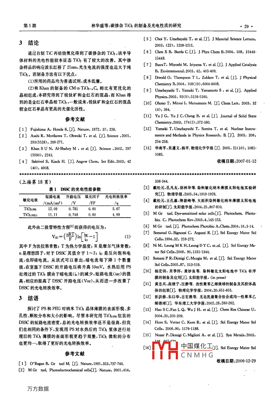 第35卷第5期化工新型材料Vol. 35 No. 52007年5月NEW CHEMICAL MATERIALS.●17新材料與新技術(shù)聚苯乙烯和聚乙二醇對TiO2薄膜微觀結(jié)構(gòu)及DSSC性能的影響韓鵬楊宏訓(xùn)吳季懷"姜奇?zhèn)ダ钇穼?華僑大學(xué)物理化學(xué)研究所,泉州362021)摘要用水熱法制備了多孔TiO2光電薄膜;分析了聚苯乙烯和聚乙二醇對納米TiO2晶體薄膜徽觀結(jié)構(gòu)的影響;用縈外可見-近紅外分光光度計(jì)和場發(fā)射掃描電鏡對納米TiOr薄膜進(jìn)行了表征;并對組裝的染料敏化太陽能電池進(jìn)行了光電性能測試,發(fā)現(xiàn)用聚苯乙烯處理后的TiO2薄膜提高了染料敏化太陽能電池(DSSC)的開路電壓、短路電流密度、填充因子和光電轉(zhuǎn)換效率。關(guān)鍵詞染料敏化太陽能電池, 納米Ti02薄膜,聚苯乙烯,聚乙二醇Effects of PS and PEG on microstructure of TiO2 thin filmand performance of dye-sensitized solar cellsHan Peng Yang Hongxun Wu Jihuai Jiang Qiwei Li Pinjiang(Physics- Chemistry Institute, Huaqiao University,Quanzhou 362021)Abstract We fabricated polyporous TiO2 photoelectricity thin film by using hydrothermal methods, analysed theeffects of polystyrene(PS) and polyethylene glycol(PEG) on the microstructure of nanocrystaline TiO2 thin films. TiO2particles and thin films were characterized with UV-Vis absorbance spectroscopy and FE SEM, The photoelectrochermicalproperties of the thin films and the performances of dye-sensitized solar cells were measured by photocurrent density andphotocurrent-voltage curves. We found that the thin film utilized PS treatment can improving open circuit photovoltage,short circuit photocurrent density, fill factor and energy conversion eficiency.Key words dye -sensitized solar cell, nanometer TiO2 thin fim, polystyrene, polyethylene glycol20世紀(jì)90年代發(fā)展起來的染料敏化太陽能電池(DSSC)隴化工廠;氫氧化鈉(AR),廣東西隴化工廠;鈦酸正丁酯與傳統(tǒng)的硅太陽能電池相比,具有廉價、高效、制作工藝要求(AR),. 上海國藥集團(tuán)化學(xué)試劑有限公司;透明導(dǎo)電玻璃(SmOr低、壽命長的優(yōu)點(diǎn),迅速成為研究的熱點(diǎn)和重點(diǎn)口一0。在膜,80/cm2),北京建筑材料研究院;聯(lián)吡啶釕化合物[cis-RuDSSC中,多孔TiO2薄膜是連接染料和導(dǎo)電玻璃的中間橋梁,(NCS)2(dcbpy)x 簡稱N.],瑞士Solarmix公司。起到固定染料、接受染料中的光生電子并傳遞到導(dǎo)電玻璃表儀器設(shè)備:超聲波清洗器,上海科導(dǎo)超聲儀器有限公司; .面的作用,要盡可能有效的和敏化劑結(jié)合,使電子空穴對發(fā)生磁力攪拌器(RCT basic), 德國IKA公司場發(fā)射掃描電鏡分離,快速的輸運(yùn)光生電子[0.0。研究表明, TiOr膜的晶型、(LE01530)、紫外可見近紅外分光光度計(jì)(Shimadzu UV-比表面積、粒子大小、膜厚度、膜的表面形貌等是影響電池光3100型),日本島津公司;100W氙燈(XQ-500W),上海電光器電轉(zhuǎn)換效率的重要因素[7間。近年來報道的有關(guān)以聚苯乙烯件有限公司;自己組裝的太陽能電池測試儀等。(PS)自組裝膠體晶體作為模板,來制備有序的TIOr薄膜,取1.2 PS 微球懸浮液的制備得了較高的開路電壓凹。本研究探討了PS 和聚乙二醇量取200mL二次去離子水加入到500mL四頸圓底燒瓶(PEG)對納米TiO2薄膜微觀結(jié)構(gòu)和染料敏化太陽能電池光中,水浴加熱至70C,在N2保護(hù)下,加人20mL苯乙烯單體電性能,據(jù)所知此方面相關(guān)的文章尚不多見。(用0.1%的NaOH溶液除去阻聚劑)和引發(fā)劑過硫酸銨溶液,在強(qiáng)列攪拌下(500r/min).持續(xù)反應(yīng)24h,得到PS懸浮1實(shí)驗(yàn)部分液中國煤化工斗過濾,以除去較大的1.1 主要試劑和儀器微YHCNMHG試劑:苯乙烯,廣東西隴化工廠;過硫酸銨(AR),廣東西基金項(xiàng)目:國家自然科學(xué)基金資助項(xiàng)目(No. :50372022,No. : 50572030);福建省自然科學(xué)基金資助項(xiàng)目(No. : E0210023,No. : E0110026)作者簡介:韓鵬(1982 -),男,碩士,從事功能材料研究。18●化工新型材料第35卷1.3染料敏化 TiO2薄膜的制備和電池的組裝將15mL鈦酸正丁酯逐滴加人到150mlL, pH=1的硝酸水溶液中并在80C的條件下不斷攪拌,直至形成半透明的溶膠;然后加入到高壓釜中,在200C下水熱12h10].將生成的TiO2漿體分為兩部分:一部分加入適量的PS懸浮液和乳化劑,磁力攪拌濃縮到-定黏度,用刮涂法進(jìn)行涂膜,標(biāo)記為TiOurs ;另一部分加入適量的PEG(Mw= 2000)和乳化劑,然后磁力攪拌濃縮到一定的黏度,用刮涂法涂膜,標(biāo)記為TiO