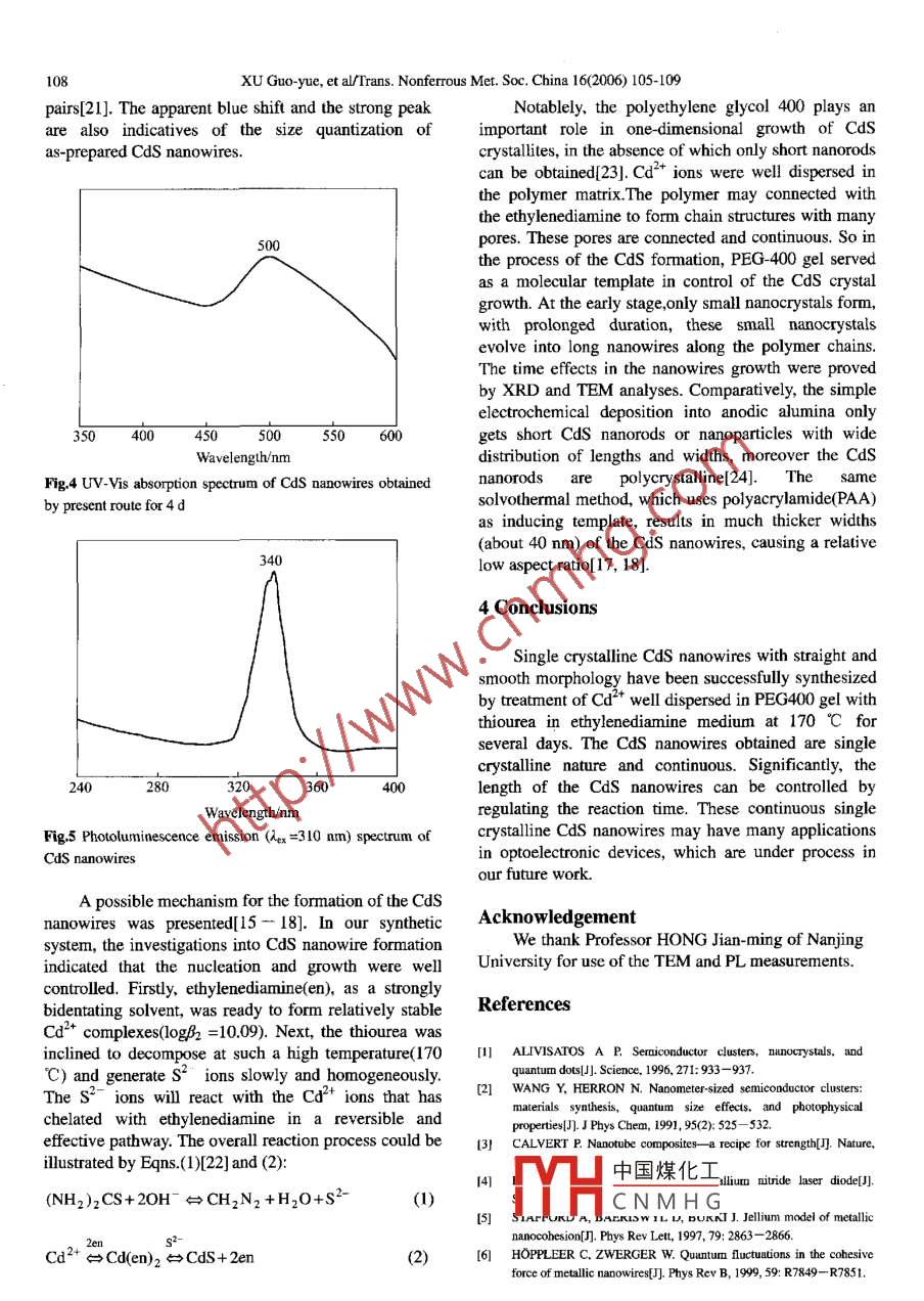 Available online at www.sciencedirect.comsO1ENCE@inEcT.Transactions ofNonferrous M etals罵PSociety of ChinaScienceTrans. Nonferrous Met. Soc. China 16(2006) 105-109Presswww. csu.edu.cn/ysxb/Synthesis of single crystalline CdS nanowires with polyethylene glycol 400 asinducing templateXU Guo-yue(徐國(guó)躍), WANG Han(王函), CHENG Chuan wei(程傳偉),ZHANG Hai-qian(張海黔), CAO Jie-ming(曹潔明), JI Guangbin(姬廣斌)Nanomaterials Research Institute, College of Materials Science and Technology,Nanjing University of Aeronautics and Astronautics, Nanjing 210016, ChinaReceived 8 May 2005; accepted 9 September 2005Abstraet: Solvothermal technique, an one- step soft solution. processing route was scessfully employed to synthesize single crystallineCdS nanowires in ethylenediamine medium at lower termperature (170 U) for 1-8 d. In this route, polyethylene glycol 400 (PEG400)was used a sufactant, which played a crucial role in preferentially oriented growth of semiconductor nanowires. Characterizations ofas-prepared Cas nanowires by X-ray powder diffraction(XRD), transmission electron microscopy(TEM) indicate that the naonowires,with typical diameters of 20nm and lengths up to several micrometers, have preferential [001] orientation. Also, investigations into thephysical properties of the Cds nanowires were conducted with UV-Vis absorption spectroscopy and photoluminescence emissionspectroscopy. The excitonic photo-optical phenomena of the nanowires shows the potential in the practical applications.Keywords: II -VIsemiconductor; cadmium sulfide; nanowires; single crystal; photoluminescence propertieshave stimulated much research and tecnological1 Introductioninterest[11 - 14]. QIAN's group developed a newchemical technique called solvothermal method toNanostructured materials are of much currentsynthesize CdS nanowires and nanorods[15- 18]. In .interest forextensive potentialapplication inthis communication, we modified the above route andelectronics,optics, catalysis, ceramics, magneticused a different polymer as the inducing template. Asstorage and mechanical devices or in mesoscopiccompared with the templates used in QIAN'sphysics[1l- 3]. In all these nanoscale materials, one-experiments, ours has obvious advantages as follows:dimensional semiconductors such as nanowires(NWs)1) PEG400 has thermnal stability and unhydrolyzationand nanorods(NRs), have demonstrated significantproperties, which makes it more environmentallypotential as fundamental building blocks forfriendly. In addition, PEG400 is more common, whichassembling a range of nanoelectronic and nano-could reduce the cost of experiments and simplify thephotonic device[4- 6] including room-temperatureexperiments process; 2) PEG 400 can be easilyfiel-effect transistor(FETs)[7, 8], p-n diodes[8, 9],separated from the products only by deioned water andbipolar junction transistor, and recently, complemen-absolute alcohol washing, so it is able to obtain hightary inverter[9] which represents a key component forpurity single crstalline CdS nanowires; 3) Thelogic. HU et al[10] also presented substantial promiseobtained CdS nanowires have much smaller diameters,for fabricating integrated nanosystems. CdS, as awhich is very important to the mesoscopic propertiestypical wide band-gap II - VI semiconductor, has aand fabrication of nanodevices[19]. Using cadmiumband-gap of 2.42 eV at room temperature. It has manynitrate and thiourea as starting material, we havecommercial or potential applications in light-emittingsuc中國(guó)煤化lell-dispersed singlediodes, solar cell, or other optoelectronic devices. ThecrysF/pical diameters of 20synthesis and study of CdS nanowires and nanorodsnmYHC N M H Grometers.Foundatfon item: Projcct(J1300A002) supported by the National Defense Fundamental Fund of China; Project(51410040305hk0214) supported by theWeaponry Equipmeot Pre-research Foundation of China; Prject(90505008) supported by the National Natural Science Foundation of ChinaCoresponding author: XU Guo-yue; Tel: +86-25-84894320; Fax: +86- 25-84892951; E-mail: xuguoy@ Dua.edu.cn106XU Guo yue, et al/Trans. Nonferrous Met. Soc. China 16(2006) 105-109XRD patterns of the products obtained at2 Experimentaldifferent reaction times are shown in Fig.1. In Fig.l,the curves from (a) to (d) represent the products2.1 Chemical reagent and reactorsprepared in varied reaction times: 1, 2, 4 and 8 d,All the chemicals used in this route were reagentrespectively, All the peaks could be indexed as agrade without further purification. Cd(NO3)●4H2Otypical hexagonal phase (wurtzite structure) Cds. Theand thiourea were provided as Cd and S source,calculated cons- tants a=4.136 A and c=6.713 A are .respectively. Polyethylene glycol 400 (PEG400) waswell consistent with the reported data for CdS (JSPDSused as the inducing soft template during the synthesisCard File No.06-0314). All the curves in Fig.1 showprocess. The bidentate ligand ethylenediamine oftenthat the (002) peak is comparatively sharper than thatused in solvothermal synthesis under supercriticalof the other peaks and has preferential [001]conditions was chosen as the reaction medium.orientation, which indicates these Cas nano-Commercial Teflon-lined stainless-steel autoclaves ofcrystallities grow along this direction.50 mL capacity were used as the reactor.3.2 Effects of reaction time on synthesis of CdS2.2 Synthesis procedurenanowires0.001 mol Cd(NO3)2 ●4H2O was dissolved intoFig.1 shows the XRD patterns of the products15.0 g polyethylene glycol 400 gel (PEG400, 5.0 g;obtained in varied reaction times from 1 d to 8 d. Itdeionized water, 10.0 g), kept at room temperature forcan be seen in Fig.1 that as the reaction time is24 h in order to achieve good dispersion of Cd+ in theprolonged from 1 d to 4 d, the (100) and (101) peakspolymer matrix. 0.001mol thiourea was dissolved inalmost keep unchanged, while the (002) peak becomes25 mL ethylenediamine, and then the PEG gel dosedsharper and sharper. This
