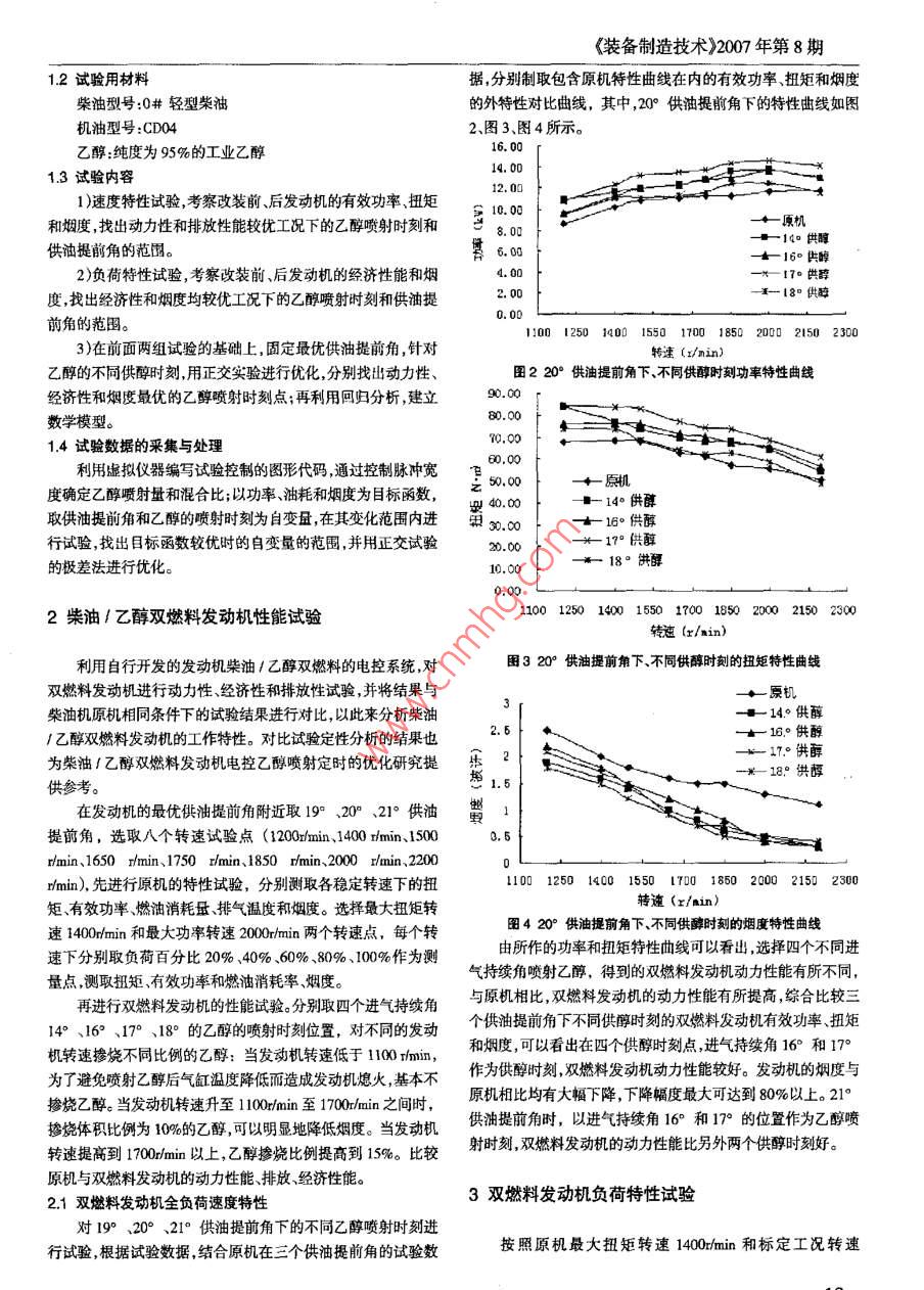 Equipment Manufactring Technology NO 8, 2007乙醇/柴油雙燃料發(fā)動機(jī)電控乙醇噴射正時試驗(yàn)與分析黃堅(廣西職業(yè)技術(shù)學(xué)院電機(jī)系,廣西南寧530226)摘要:使用傳感器、數(shù)揖采集卡和虛擬儀器軟件改進(jìn)柴油/乙醇雙燃料發(fā)動?xùn)i的乙醇噴射電子控制系統(tǒng),通過三個供油提前角、四個供醇時刻組合的全因素試驗(yàn),比較了雙燃料發(fā)動杌與原機(jī)相冏工況下的性能。結(jié)果表明,雙燃料發(fā)動機(jī)的動力性、經(jīng)濟(jì)性和煙度與原機(jī)相比均有不同程度的改善。關(guān)鍵詞:雙燃料;電控系統(tǒng);供油提前角;乙醇噴射時刻中圖分類號:TK46文獻(xiàn)標(biāo)識碼:A文章編號:1672-54080018傳統(tǒng)的內(nèi)燃機(jī),一方面作為汽車等的動力來源大量消耗11試驗(yàn)裝置與系統(tǒng)的改裝著非再生性能源——石油;另一方面,內(nèi)燃機(jī)燃燒產(chǎn)生的尾氣雙燃料發(fā)動機(jī)試驗(yàn)儀器設(shè)備及布置如圖1所示,其中發(fā)動中,碳煙、NO,、C0、CO2等排放物是造成嚴(yán)重環(huán)境污染的主要機(jī)的主要技術(shù)參數(shù)如表1根源。日益嚴(yán)峻的能源危機(jī)和環(huán)境惡化是當(dāng)今世界范圍內(nèi)的兩乙醇箱大難題。以可再生的清潔能源作為內(nèi)燃機(jī)的代用燃料的開發(fā)研究,目前已成為各國內(nèi)燃機(jī)研究的熱點(diǎn)。乙醇電子泵燃料乙醇是液體清潔燃料中一種極具潛力的生物型替代燃料。其生產(chǎn)用原材料較為普遍,成本低廉應(yīng)用在汽車發(fā)動機(jī)儲能罐、壓力表上,不但可以改善能源結(jié)構(gòu)還可以降低汽車有害物的排放,具有廣闊的發(fā)展前景,意義深遠(yuǎn)。生產(chǎn)燃料乙醇的項(xiàng)目已經(jīng)列人乙醇噴射器雙燃料電控單元國家“十五”示范工程重大項(xiàng)目。在廣西,大力發(fā)展乙醇燃料已提上了議事日程,用木薯作為原料生產(chǎn)燃料乙醇的項(xiàng)日也已上柴油箱乙醇噴射正時馬。推廣乙醇作為內(nèi)燃機(jī)的清潔代用燃料對于盛產(chǎn)木薯的廣西來講不僅可以增加農(nóng)民收人,改善農(nóng)產(chǎn)品結(jié)構(gòu)還有利于乙醇油耗儀轉(zhuǎn)速信號燃料技術(shù)的研究推廣,能夠收到較好的社會效益、經(jīng)濟(jì)效益和環(huán)境效益。水力測功機(jī)拉桿位移信號乙醇是富氧燃料,與汽油的密度相近,由于這兩種燃料能轉(zhuǎn)速表Y柴油發(fā)動機(jī)排氣溫度計直接混合、互溶,故可以在不改變發(fā)動機(jī)結(jié)構(gòu)的前提下,將添加定比例的乙醇汽油(又稱汽油醇)直接應(yīng)用于汽油機(jī)上,且能機(jī)油溫度進(jìn)氣壓力計夠保持原有發(fā)動機(jī)的性能。乙醇燃料在汽油機(jī)上的應(yīng)用技術(shù)已經(jīng)基本成熟煙度計排氣壓力計但是,乙醇在柴油機(jī)上的應(yīng)用要遠(yuǎn)遜于在汽油機(jī)上的應(yīng)用。其主要原因是柴油與乙醇不能互溶同時,由于柴油機(jī)本身圖1試驗(yàn)設(shè)備布置示意圖的結(jié)構(gòu)比較復(fù)雜,其雙燃料研究的進(jìn)程非常緩慢。本文結(jié)合廣表1發(fā)動機(jī)主要技術(shù)參數(shù)西的實(shí)際針對柴油機(jī)乙醇雙燃料研究的現(xiàn)狀利用自行開發(fā)型式立式雙缸四沖程、水冷的乙醇噴射控制系統(tǒng)研究噴油提前角、噴射時刻及噴射量等缸徑/行程[Y295D因素的改變對雙燃料發(fā)動機(jī)性能的影響,探索柴油/乙醇雙燃壓縮比料發(fā)動機(jī)的動力性、經(jīng)濟(jì)性和排放性能均較優(yōu)的工況下的乙醇標(biāo)定轉(zhuǎn)速噴射正時在此基礎(chǔ)上分別建立有效功率油耗率、煙度的數(shù)故/806N·m/1750 r min19°-23°學(xué)模型,為柴油/乙醇雙燃料發(fā)動機(jī)技術(shù)的研究與推廣應(yīng)用提配氣相位進(jìn)氣門開:上止點(diǎn)前8,進(jìn)氣門關(guān):下止點(diǎn)后52°供參考。排氣門開:下止點(diǎn)前52°,排氣門關(guān):上止點(diǎn)后8°本試驗(yàn)系統(tǒng)上加裝了乙醇噴射時刻的測量裝置并加以標(biāo)1試驗(yàn)方案定;確定供油拉桿位置與供油量之間的關(guān)系,噴醇脈沖寬度與噴醇量的關(guān)系。收稿日期:2007-06-06作者簡介:黃堅工作單位:廣西職業(yè)技術(shù)學(xué)院電子機(jī)械工程系《裝備制造技術(shù)》2007年第8期12試驗(yàn)用材料據(jù),分別制取包含原機(jī)特性曲線在內(nèi)的有效功率、扭矩和煙度柴油型號:0#輕型柴油的外特性對比曲線,其中,20°供油提前角下的特性曲線如圖機(jī)油型號:CD042、圖3、圖4所示。乙醇:純度為95%的工業(yè)乙醇16.0013試驗(yàn)內(nèi)容1)速度特性試驗(yàn),考察改裝前、后發(fā)動機(jī)的有效功率、扭矩和煙度找出動力性和排放性能較優(yōu)工況下的乙醇噴射時刻和8.0項(xiàng)機(jī)供油提前角的范圍2)負(fù)荷特性試驗(yàn),考察改裝前后發(fā)動機(jī)的經(jīng)濟(jì)性能和煙17·世醇度找出經(jīng)濟(jì)性和煙度均較優(yōu)工況下的乙醇噴射時刻和供油提,00一—18。供前角的范圍。110n125014001550170018502000215023003)在前面兩組試驗(yàn)的基礎(chǔ)上,固定最優(yōu)供油提前角,針對轉(zhuǎn)速(x/nin)乙醇的不同供醇時刻用正交實(shí)驗(yàn)進(jìn)行優(yōu)化,分別找出動力性圖220°供油提前角下、不同供醇時刻功率特性曲線經(jīng)濟(jì)性和煙度最優(yōu)的乙醇噴射時刻點(diǎn);再利