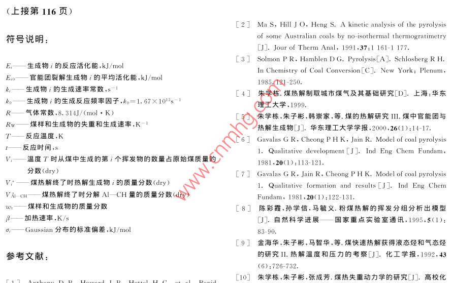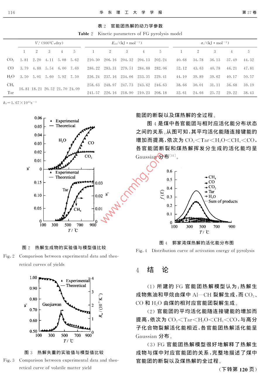 Vol. 27 No,2華東理工大學學報2001-04JournalEast China University of Science and Technology113文章編號:1006- 3080(2001 )02-0113-04煤的熱解研究IV.官能團熱解模型朱學棟,朱子彬”,張成芳,唐黎華(華東理工大學化工工藝研究所,上海200237)摘要:將煤的熱解視為煤中官能團的斷裂反應,從而建立FG官能團熱解模型。模型認為:熱解生成物焦油和甲烷由煤中脂肪-CH裂解生成,而CO2、CO和H2O由煤中相對應官能團裂解生成,反應的活化能呈Gaussian分布。模型很好地解釋了熱解生成物與煤中官能團的相應關系,完整地描述了煤的熱解生成物生成的全過程。關鍵詞:煤;熱解;官能團;模型;活化能分布中圖分類號:TQ533;TQ530.2文獻標識碼:AFundamental Study of Coal PyrolysisIV. Functional Group Pyrolysis ModelZHU Xue-dong,ZHU Zi-bin*,ZHANG Cheng-fang,TANG Li-hua(Institute of Chemical Technology ECUST, Shanghai 200237, China)Abstract: Considering the coal pyrolysis as its functional groups thermal decomposition, we foundedthe functional- group pyrolysis model. The model pointed out that the aliphatic- CH decomposition is thecompetition process between tar and CH。forming reaction, and CO2, CO and H2O evolve from carboxyl,ether and hydroxyl groups. All reactions are described by a large number of first order parallel reactionshaving a Gaussian distribution of activation energies. This model gave a good explanation of the relationbetween thermal decomposition products and functional groups of coal, and the whole process of coalpyrolysis was described thoroughly by this model.Key words: coal; pyrolysis; functional group; model; distribution of activation energies至今煤的熱解仍是能源領域中重要的研究課的含量相對應印]。然而Solomon模型未把氣體生成題。關于熱解速率的研究大多仍采用總揮發(fā)分模物和焦油與自由基基元反應相關聯(lián),導致官能團反型(~2],即由揮發(fā)分總失重表達煤的熱解行為。應活化能偏小[0~7]。揮發(fā)分組分析出模型[8]將煤的Solomon最早提出了官能團(FG)熱解模型的,認為熱解視為煤中官能團的平行反應,但模型過于復雜,煤的熱解主要是由煤中官能團的斷裂所引起。作者計入了7大類22個反應,且模型計算值與實驗值尚用紅外光譜(FT -IR)對我國18種煤的研究[],表明有相當大的偏差。了煤熱解生成物CO2、CO、H2O、CH,和焦油的生成本文將煤的官能團的斷裂描述為無數(shù)個一級平與煤中的羧基、醚鍵、酚羥基和脂肪- CH(AI- CH)行反應,反應的活化能呈Gaussian分布,由此建立了作者的FG官能團熱解模型。在郭家灣礦煤熱解E-mail :zhuxuedg@ ji public. sd. cninfo. net收稿日期:2000-03-01實驗研究的基礎上用本模型進行數(shù)學模擬。華東理工大學學報第27卷熱0.5h干燥,以充分除去水分,之后加熱至終溫1實驗部分900°C。以氮氣為載氣,載氣流率為160mL/min。由上海分析儀器廠的102G氣相色譜儀對熱解氣體進實驗選用我國碳含量介于69%~85%的5種行在線分析(EGA),在升溫過程中每間隔5min取煤作煤樣,其工業(yè)分析和元素分析見表1。樣一次,色譜儀能對CO、CO2和CH。氣體進行分煤樣熱解失重實驗在上海天平儀器廠的WRT-析。生成水的量由熱天平出口的冷凝液計算得到,而3P型熱天平上進行,自動采樣,由計算機繪出失重其他的熱解氣態(tài)生成物一并計入焦油,生成量由熱積分曲線和微分曲線。煤樣用量約10mg,粒度小于重曲線差減其他生成物獲得。0.125mm。實驗升溫速率為10*C/min,在120°C加表1煤樣的工業(yè)分析和元素分析數(shù)據(jù)表Table 1 Proximate analysis and ultimate analysis of samplesProximate analysis(%,dry )Ultimate analysis( % .daf )CoalVAFoODatong26. 338.7364.9482.794. 651. 752. 458. 36Guojlawan31.675. 6062.7381.125. 671.700. 2611.25Shenyang36. 9013.7449.3675.135.6(1.591.0016. 18Shenbei41.329.9048.7873. 686.241.550.4818.05Xiaolongtan44. 1744. 9669. 584. 891.480.7723. 281) By difference對非等溫過程以恒定的升溫速率(β=dT/dt)加熱,2FG官能團熱解模型將式(1)從0至V,相應溫度從0至T積分,并考慮(E/RT)>1,對每一個裂解生成物i的第j個反應,煤受熱,各種弱連接鍵和取代基斷裂分解,釋放式(1)的解近似為出各種煤的碎片(fragment),最終生成CO2、CO、V;- V;k,RT*H2O、CH、焦油和焦等,各種連接鍵的強度(鍵能的ViBE-exp大小)又決定了其裂解的先后順序。每一反應j對應E,的值須從實驗值估算。由假定知建立本FG官能團熱解模型時,作如下假設:任一官能團裂解反應的數(shù)目大到足以使活化能E;(1)焦油和甲烷由AI- CH裂解生成,而其他可連續(xù)分布,其函數(shù)為f(E),用f(E)dE;代表在生成物由煤中的官能團裂解生成。即煤中的羧基裂活化能E;和E,+dE;之間生成物V:的分率,則解釋放出CO2,羥基裂解生成水,CO是由醚鍵dV; = V; f(E,)dE;(4)O-連接(或醌、酮等其他含氧官能團)斷裂得到,其中f(E)dE;= 1Ar- CH的縮聚釋放出氫氣并形成半焦。(2)Al-CH裂解在生成焦油的同時生成甲生成物i的活化能為一個具有平均活化能E。和標準偏差σ;的Gaussian分布,即烷,反應為平行競爭反應。(3)忽略常壓下生成氫與活性半焦的甲烷化反f(E)= [(2n)*]~'exp-二(E,- Eo)g(5)2σ}應0。(4)官能團裂解為無數(shù)個一級平行反應,符合由式(3)代入式(5)得V;-V;k。RTP阿累尼烏斯方程,指前因子取k。=1.67X10*s-+,各V;σ,(2π)72Jo[exp(βE;)●反應的活化能呈Gaussian分布[10]。E;一(E;Ew)"dE,(6)根據(jù)上述假定,FG官能團熱解模型描述煤中2σ?官能團裂解生成物i的第j個反應的動力學表達式.V7為煤熱解終了時生成物i的質(zhì)量分數(shù)(dry),其為:值與官能團含量一-對應印,其中i分別表示了裂第2期朱學