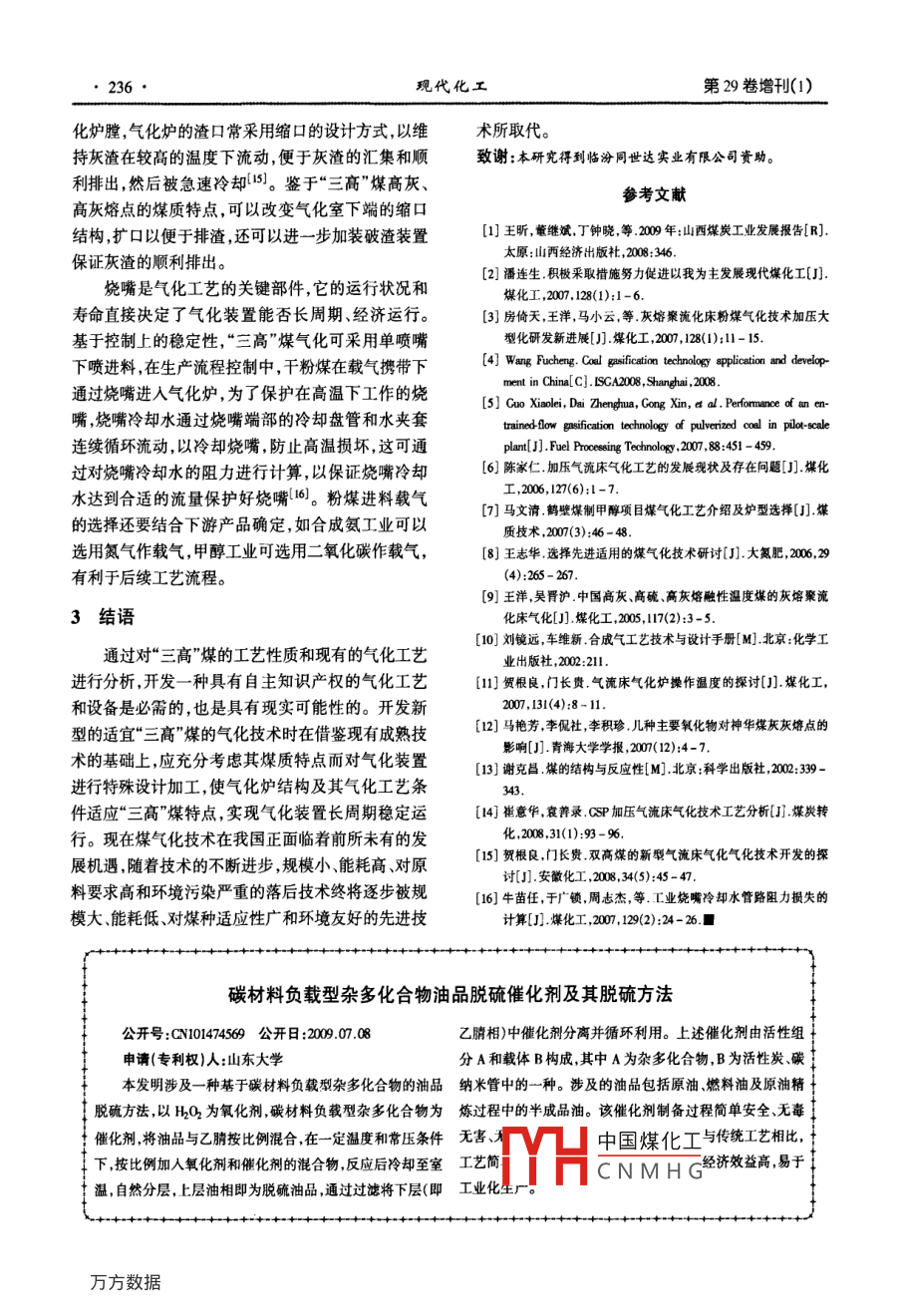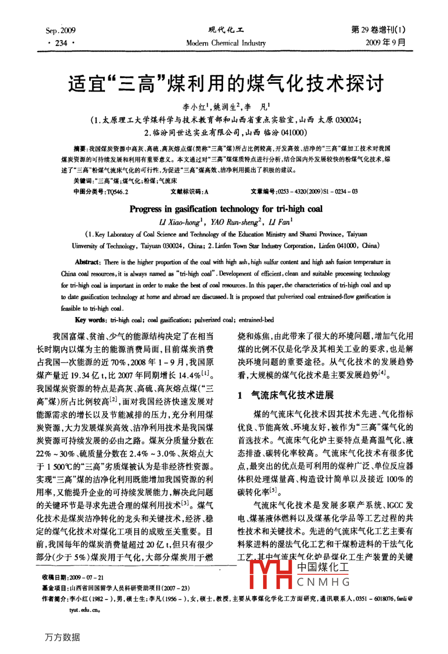 Sep. 2009現(xiàn)代化工第29卷增刊(1). 234Modem Chemical Industry2009年9月適宜“三高"煤利用的煤氣化技術(shù)探討李小紅',姚潤生",李凡'(1.太原理工大學(xué)煤科學(xué)與技術(shù)教育部和山西省重點(diǎn)實(shí)驗(yàn)室,山西太原030024;,2.臨汾同世達(dá)實(shí)業(yè)有限公司,山西臨汾041000)摘要:我國煤炭資源中高灰高硫高灰熔點(diǎn)煤(簡(jiǎn)稱"三高"煤)所占比例較高,開發(fā)高效、潔凈的“三商”煤加工技術(shù)對(duì)我國煤炭資源的可持續(xù)發(fā)展和利用有重要意義。本文通過對(duì)“三高’煤煤質(zhì)特點(diǎn)進(jìn)行分析,結(jié)合國內(nèi)外發(fā)展較快的粉煤氣化技術(shù),綜述了“三高”粉煤氣流床氣化的可行性,為促進(jìn)“三高”煤高效潔凈利用提出了積極的建議。關(guān)鍵詞:“三高"媒;煤氣化;粉媒;氣流床中圍分類號(hào):TQ546.2文獻(xiàn)標(biāo)識(shí)碼:A .文章編號(hào):0253 - 4320(2009)S1 - 0234 -03Progress in gasification technology for tri-high coalU Xiao-hong',YAO Run-sheng', U Fan'(1. Key Laboratory of Coal Science and Technology of the Education Ministy and Shanxi Povince, TaiyuanUinwensity of Technology , Taiyuan 030024, China; 2.Linfen Town Sar Indusry Corporaion, Linlen 041000, China)Abstract: There is the higher proportion of the coal with high ash, high sulfur content and high ash fusion temperalure inChina coal resources, it is always named as“ri-high cal”. Development of eficient, clean and suitable poesing tchnoloyfor ti-high coal is important in order to make the best of coal reources. In this paper, the characteristics of tri-high coal and upto date gsication technology at home and abroad are discussed. l is proposed that pulverized coal entrined-low gasification isfeasible to tri-high coal.Key words: ti-high coal; coal gaificatin; pulverized coal; entrained-bed我國富煤貧油、少氣的能源結(jié)構(gòu)決定了在相當(dāng)燒和煉焦,由此帶來了很大的環(huán)境問題,增加氣化用長時(shí)期內(nèi)以煤為主的能源消費(fèi)局面,目前煤炭消費(fèi)煤的比例不僅是化學(xué)及其相關(guān)工業(yè)的要求,也是解占我國- -次能源的近70% ,2008年1-9月,我國原決環(huán)境問題的重要途徑。從氣化技術(shù)的發(fā)展趨勢(shì)煤產(chǎn)量近19.34億t,比2007年同期增長14.4%1]。看,大規(guī)模的煤氣化技術(shù)是主要發(fā)展趨勢(shì)(4]。我國煤炭資源的特點(diǎn)是高灰、高硫高灰熔點(diǎn)煤(“三1 氣流床氣化技術(shù)進(jìn)展高”煤)所占比例較高[2] ,面對(duì)我國經(jīng)濟(jì)快速發(fā)展對(duì)能源需求的增長以及節(jié)能減排的壓力,充分利用煤煤的氣流床氣化技術(shù)因其技術(shù)先進(jìn)、氣化指標(biāo)炭資源,大力發(fā)展煤炭高效、潔凈利用技術(shù)是我國煤優(yōu)良、節(jié)能高效、環(huán)境友好,被作為“三高”煤氣化的炭資源可持續(xù)發(fā)展的必由之路。煤灰分質(zhì)量分?jǐn)?shù)在首選技術(shù)。氣流床氣化爐主要特點(diǎn)是高溫氣化、液22% ~ 30%、硫質(zhì)量分?jǐn)?shù)在2.4% ~3.0%、灰熔點(diǎn)大態(tài)排渣、碳轉(zhuǎn)化率較高。氣流床氣化技術(shù)有很多優(yōu)于1 500C的“三高”劣質(zhì)煤被認(rèn)為是非經(jīng)濟(jì)性資源。點(diǎn),最突出的優(yōu)點(diǎn)是可利用的煤種廣泛、單位反應(yīng)器實(shí)現(xiàn)“三高”煤的潔凈化利用既能增加我國資源的利體積處理煤量高、構(gòu)造設(shè)計(jì)簡(jiǎn)單以及接近100%的用率,又能提升企業(yè)的可持續(xù)發(fā)展能力,解決此問題碳轉(zhuǎn)化率[51。的關(guān)鍵環(huán)節(jié)是尋求先進(jìn)合理的煤利用技術(shù)3)。煤氣氣流床氣化技術(shù)是發(fā)展多聯(lián)產(chǎn)系統(tǒng)、IGCC發(fā)化技術(shù)是煤炭潔凈轉(zhuǎn)化的龍頭和關(guān)鍵技術(shù),經(jīng)濟(jì)穩(wěn)電、煤基液體燃料以及煤基化學(xué)品等工藝過程的共定的煤氣化技術(shù)對(duì)煤化工項(xiàng)目的成敗至關(guān)重要。目性技術(shù)和關(guān)鍵技術(shù)。先進(jìn)的氣流床氣化工藝主要有前,我國每年的煤炭消費(fèi)量超過20億t,但只有很少料漿進(jìn)料的濕法氣化工藝和干煤粉進(jìn)料的干法氣化部分(少于5% )煤炭用于氣化,大部分煤炭用于燃工藝其中氣流床氣化爐是煤化工生產(chǎn)裝置的關(guān)鍵中國煤化工收稿日期:2009-07-21基金項(xiàng)目:山西省回國留學(xué)人員科研資助項(xiàng)目(207 - 23)TYHCNMHG作者簡(jiǎn)介:李小紅(1982 -),男,碩士生;李凡(1956 - ),女,碩士,教授,主要從事煤化學(xué)化工方面研究,通訊聯(lián)系人,0351 - 6018076, fanli@tyut. edu. cm。.2009年9月李小紅等:適宜三高煤利用的煤氣化技術(shù)探討設(shè)備之- -。 現(xiàn)在國外新開發(fā)的氣化爐都采用加壓氣融性溫度FT(流動(dòng)溫度)50~ 100C[10] ,但氣化爐操化的工藝,其優(yōu)點(diǎn)是:提高氣化強(qiáng)度、增加單爐產(chǎn)量、作溫度過高會(huì)影響氣化爐的壽命,在其他操作條件節(jié)約壓縮能耗、減少帶出物損失。氣流床加壓氣化不變的情況下,氣流床氣化爐隨操作溫度的提高氧由于采用了高溫高壓純氧減小煤粒度等措施,因氣的消耗也增加。而達(dá)到加快氣-固兩相表觀動(dòng)力學(xué)反應(yīng)速度,進(jìn)而“三高”煤的灰熔融性溫度較高,煤灰的流動(dòng)溫強(qiáng)化氣化生產(chǎn)、顯著改善氣化技術(shù)經(jīng)濟(jì)指標(biāo)的目的。度大于1 500C,為了適應(yīng