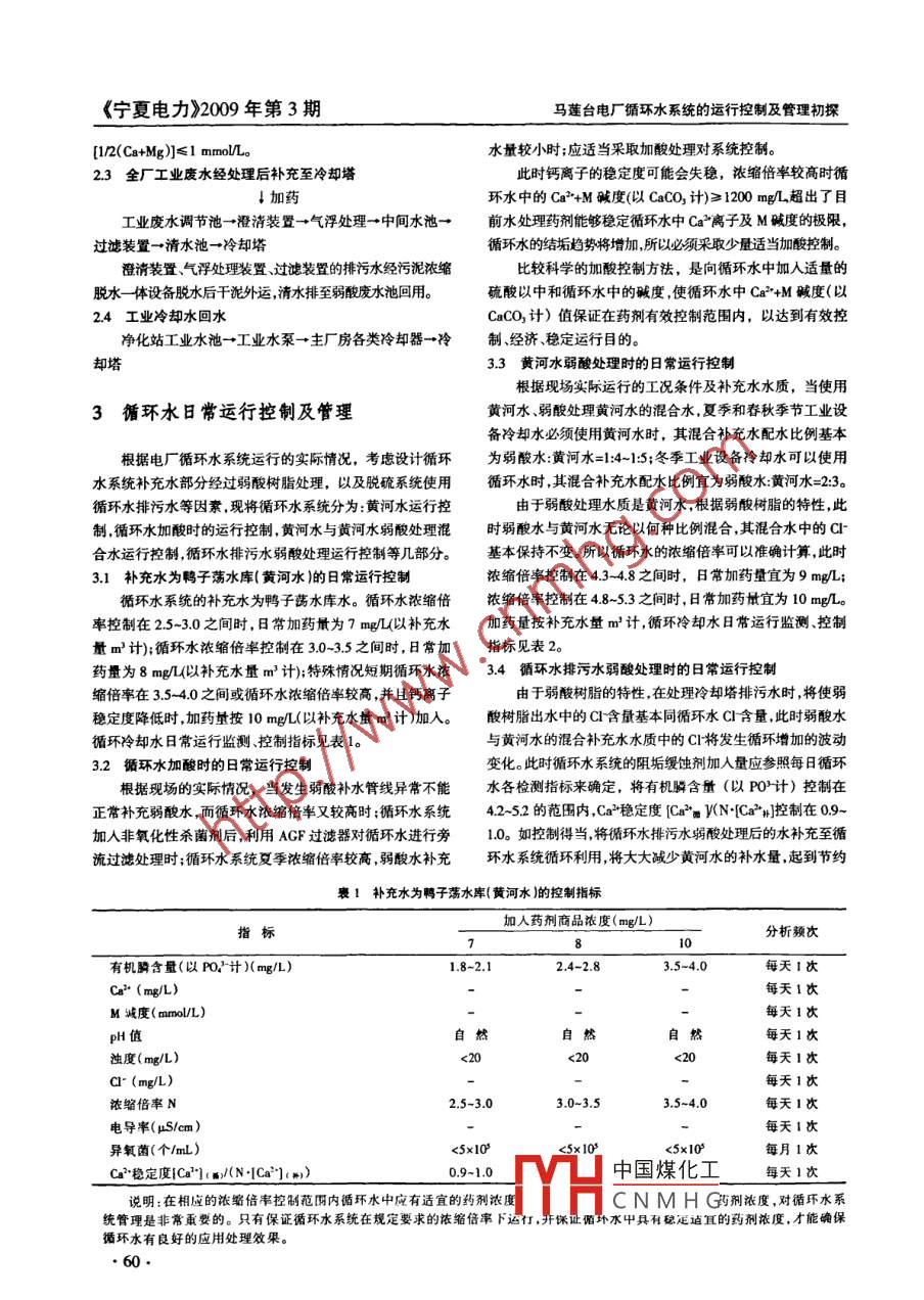 《寧夏電力》2009年第3期馬蓮臺電廠循環(huán)水系統(tǒng)的運行控制及管理初探武曉君(寧夏發(fā)電集團馬蓮臺發(fā)電廠,寧夏靈武市750411)摘要:循環(huán)冷卻水是火力發(fā)電廠用水量的主要組成部分,循環(huán)水水質的好壞關系到發(fā)電機組是否能夠滿負荷正常運行。循環(huán)水水質不好,會造成凝汽器銅管結垢及腐蝕,嚴重時影響機組的安全經(jīng)濟運行。水的循環(huán)利用.濃縮倍數(shù)的提高,要求必須采取適當?shù)乃幚硎侄?以解決熱力設備的結垢及腐蝕問題。關鍵詞:循環(huán)水系統(tǒng); 控制; 管理中圖分類號: TK223文獻標志碼: B文章編號: 1672- -3643(2009 )03-0059-03The operation control and management of cooling water cycle system in Maliantai PowerPlantwU Xiao-jun(Maliantai Power Plant of Ningxia Power Generaion Group Co., Lad, Lingwu, Ningia 750411)Abstract: The cooling water cycle system is the main part of using water in power plant. If the quality of coolingwaler cycle ystem were not well, copper pipes would caused the rustiness and corosion in condenser, and afectsthe sale and economic operation of the generator units. Using the water cycle and increasing the inspissation rate,requests taking a suitable realmenl method to solve the problems of rustiness and corrosion in the thermal powerequipmentKey words: water cycle syslem; control; management1概述2循環(huán)冷卻水補充水的4種來源馬蓮臺電廠2臺330 MW發(fā)電機組,循環(huán)冷卻水系.1 鴨子蕩水庫補充水統(tǒng)為敞開式冷卻系統(tǒng)。循環(huán)水系統(tǒng)的水量消耗取決于水鴨子蕩水庫→機械加速澄清池-工業(yè)水池→冷卻塔補質穩(wěn)定運行時的濃縮倍數(shù)、循環(huán)水系統(tǒng)的蒸發(fā)水量和排水泵-冷卻塔。污水量,循環(huán)水系統(tǒng)蒸發(fā)水量在同一季節(jié)基本為一固定2.2弱酸樹脂 處理后樸充水量,排污水量是決定循環(huán)水消耗水量的關鍵,循環(huán)水系循環(huán)水泵→原水箱-→+原水泵→A.G.F過濾器統(tǒng)日常運行控制及管理,主要是控制循環(huán)水系統(tǒng)的排污水量、補充水量以達到有效控制循環(huán)水濃縮倍數(shù)的目的;保持凝聚劑、助凝劑循環(huán)水中具有適宜的藥劑濃度、控制循環(huán)水系統(tǒng)微生物細→弱酸陽離子交換器-→鍋爐補給水處理菌繁殖,以達到減緩凝汽器銅管的腐蝕,實現(xiàn)安全經(jīng)濟運行的目的。拎卻塔弱酸陽離子交換器出口水質控制標準為碳酸鹽硬度中國煤化工收稿日期: 2008-12-28MHCNMHG作者簡介:武曉君(1971- ),女,工程師,從事電廠化學工作?!?9.《寧夏電力》2009年第3期馬蓮臺電廠循環(huán)水系統(tǒng)的運行控制及管理初探[1/2(Ca+Mg)]≤1 mmol/L。水量較小時;應適當采取加酸處理對系統(tǒng)控制。2.3金廠工業(yè) 廢水經(jīng)處理后補充至冷卻塔此時鈣離子的穩(wěn)定度可能會失穩(wěn),依縮倍率較高時循l 加藥環(huán)水中的Ca2*+M堿度(以CaCO,計)≥1200 mg/L超出了目工業(yè)廢水調節(jié)池-→澄清裝置- +氣浮處理-→中間水池+前水處理藥劑能夠穩(wěn)定循環(huán)水中Ca2離子及M堿度的極限,過濾裝置→清水池→冷卻塔循環(huán)水的結垢趨勢將增加,所以必須采取少量適當加酸控制。澄清裝置氣浮處理裝置、過濾裝置的排污水經(jīng)污泥濃縮比較科學的加酸控制方法,是向循環(huán)水中加入適量的脫水- -體設備脫水后千泥外運,清水排至弱酸廢水池回用。硫酸以中和循環(huán)水中的堿度,使循環(huán)水中Ca*+M堿度(以2.4 工業(yè)冷卻水回水CaCO, 計)值保證在藥劑有效控制范圍內,以達到有效控凈化站工業(yè)水池+工業(yè)水泵→廠房各類冷卻器- +冷制、經(jīng)濟、穩(wěn)定運行目的。卻塔3.3 黃河水 弱酸處理時的日常運行控制根據(jù)現(xiàn)場實際運行的工況條件及補充水水質,當使用3循環(huán)水日常運行控制及管理.黃河水、弱酸處理黃河水的混合水,夏季和春秋季節(jié)工業(yè)設備冷卻水必須使用黃河水時,其混合補充水配水比例基本根據(jù)電廠循環(huán)水系統(tǒng)運行的實際情況,考慮設計循環(huán)為弱酸水:黃河水=1:4~1:5;冬季工業(yè)設備冷卻水可以使用水系統(tǒng)補充水部分經(jīng)過弱酸樹脂處理,以及脫硫系統(tǒng)使用循環(huán)水時,其混合補充水配水比例宜為弱酸水:黃河水= 2:3.循環(huán)水排污水等因素,現(xiàn)將循環(huán)水系統(tǒng)分為:黃河水運行控由于弱酸處理水質是黃河水,根據(jù)弱酸樹脂的特性,此制,循環(huán)水加酸時的運行控制,黃河水與黃河水弱酸處理混時弱酸水與黃河水無論以何種比例混合,其混合水中的Cl-合水運行控制,循環(huán)水排污水弱酸處理運行控制等幾部分。基本保持不變。所以循環(huán)水的濃縮倍率可以準確計算,此時3.1補充水為鵜子蕩水庫( 黃河水)的日常運行控制濃縮倍率控制在43-4.8之間時,日常加藥量宜為9 mg/L;循環(huán)水系統(tǒng)的補充水為鴨子蕩水庫水。循環(huán)水濃縮倍濃縮倍率控制在4.8~5.3之間時,日常加藥最宜為10 mg/L。率控制在2.5-3.0之間時,日常加藥最為7 mg/L(以補充水加藥量按補充水量m2'計,循環(huán)冷卻水日常運行監(jiān)測.控制量m2計);循環(huán)水濃縮倍率控制在3.0~3.5之間時,日常加指標見表2。藥量為8 mg/L(以補充水量m'計);特殊情況短期循環(huán)水濃3.4循環(huán)水排污水弱酸處理時的日常運行控制縮倍率在3.5-4.0之間或循環(huán)水濃縮倍率較高,并且鈣離子由于弱酸樹脂