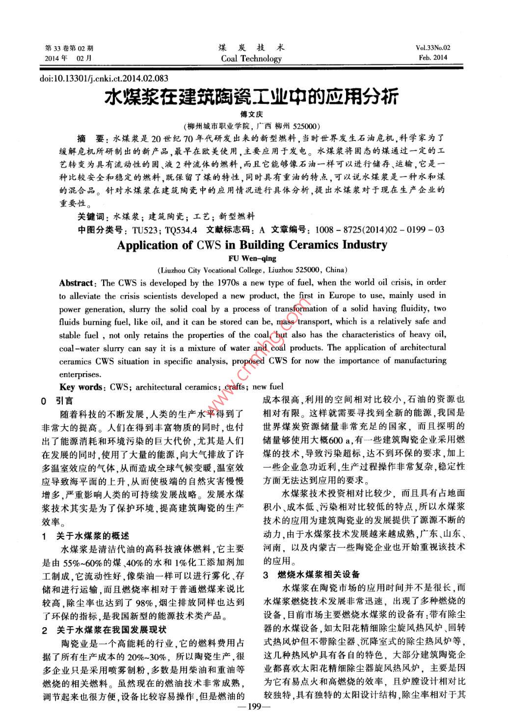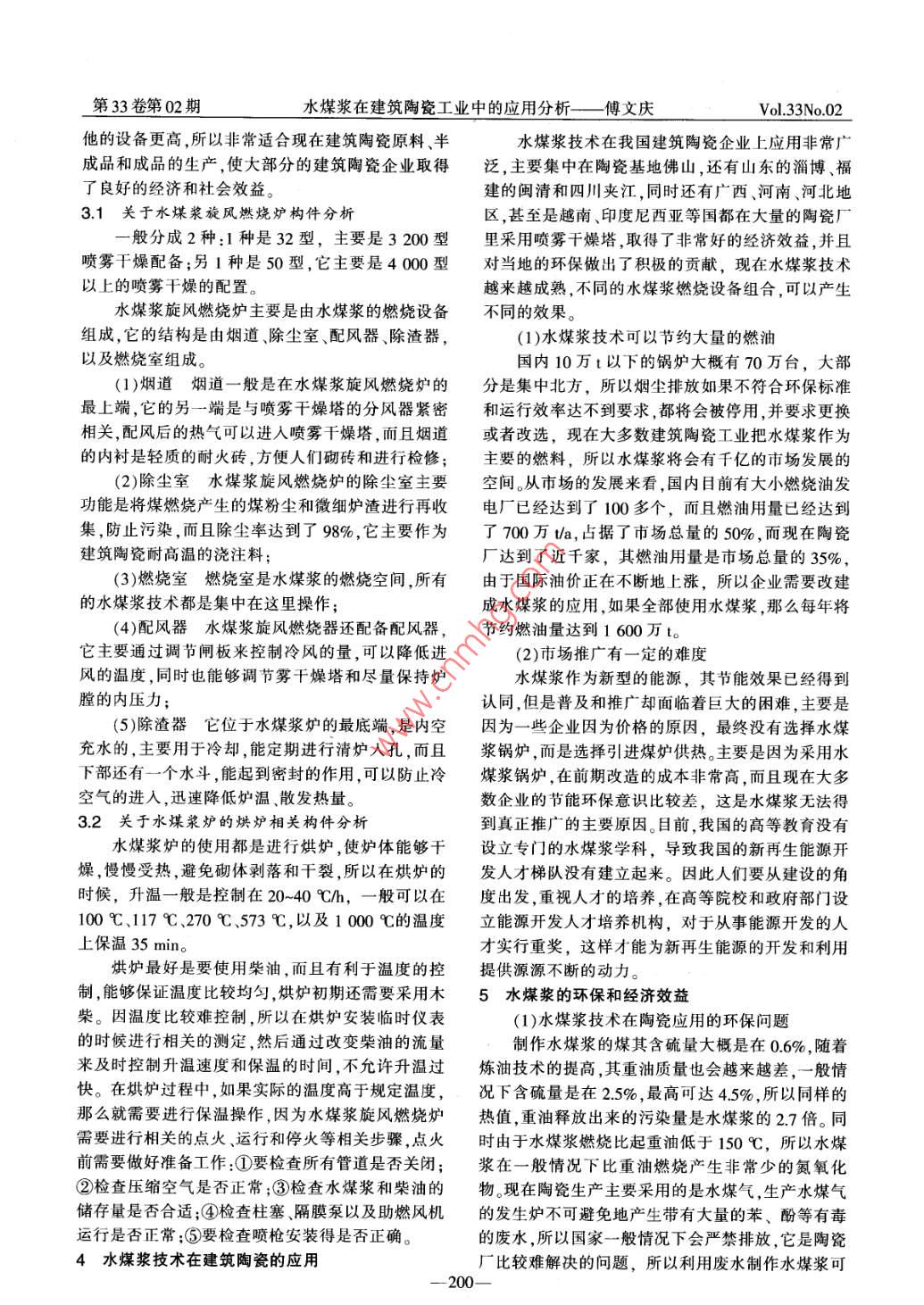第33卷第02期煤炭技術(shù)Vol. 33No 022014年02月Coal TechnologyFeb.2014doi:10.13301/cnki.ct2014.02.083水煤漿在建筑陶瓷工業(yè)中的應(yīng)用分折傅文慶(柳州城市職業(yè)學(xué)院,廣西柳州525000)摘要:水煤漿是20世紀(jì)70年代研發(fā)出來的新型燃料,當(dāng)時(shí)世界發(fā)生石油危機(jī),科學(xué)家為了緩解危機(jī)所研制出的新產(chǎn)品,最早在歐美使用,主要應(yīng)用于發(fā)電。水煤漿將固態(tài)的煤通過一定的工藝轉(zhuǎn)變?yōu)榫哂辛鲃有缘墓獭⒁?種流體的燃料,而且它能夠像石油一樣可以進(jìn)行儲存、運(yùn)輸,它是種比較安全和穩(wěn)定的燃料,既保留了煤的特性,同時(shí)具有重油的特點(diǎn),可以說水煤漿是一種水和煤的混合品。針對水煤漿在建筑陶瓷中的應(yīng)用情況進(jìn)行具體分析,提出水煤漿對于現(xiàn)在生產(chǎn)企業(yè)的重要性關(guān)鍵詞:水煤漿;建筑陶瓷;工藝;新型燃料中圖分類號:TU523;TQ5344文獻(xiàn)標(biāo)志碼:A文章編號:1008-8725(2014)02-0199-03Application of CWS in Building Ceramics IndustryFU Wen-qing(Liuzhou City Vocational College, Liuzhou 525000, China)Abstract: The CWS is developed by the 1970s a new type of fuel, when the world oil crisis, in orderto alleviate the crisis scientists developed a new product, the first in Europe to use, mainly used inpower generation, slurry the solid coal by a process of transformation of a solid having fluidity,twofluids burning fuel, like oil, and it can be stored can be, mass transport, which is a relatively safe andstable fuel, not only retains the properties of the coal, but also has the characteristics of heavy oil,coal-water slurry can say it is a mixture of water and coal products. The application of architecturalceramics CWS situation in specific analysis, proposed CWS for now the importance of manufacturingenterprises.Key words CWS; architectural ceramics; crafts; new fuel0引言成本很高,利用的空間相對比較小,石油的資源也隨著科技的不斷發(fā)展,人類的生產(chǎn)水平得到了相對有限。這樣就需要尋找到全新的能源,我國是非常大的提高。人們在得到豐富物質(zhì)的同時(shí),也付世界煤炭資源儲量非常充足的國家,而且探明的出了能源消耗和環(huán)境污染的巨大代價(jià),尤其是人們儲量夠使用大概600a,有一些建筑陶瓷企業(yè)采用燃在發(fā)展的同時(shí),使用了大量的能源,向大氣排放了許煤的技術(shù),導(dǎo)致污染超標(biāo),達(dá)不到環(huán)保的要求,加上多溫室效應(yīng)的氣體從而造成全球氣候變暖,溫室效些企業(yè)急功近利生產(chǎn)過程操作非常復(fù)雜,穩(wěn)定性應(yīng)導(dǎo)致海平面的上升,從而使極端的自然災(zāi)害慢慢方面無法達(dá)到應(yīng)用的要求。增多,嚴(yán)重影響人類的可持續(xù)發(fā)展戰(zhàn)略。發(fā)展水煤水煤漿技術(shù)投資相對比較少,而且具有占地面漿技術(shù)其實(shí)是為了保護(hù)環(huán)境,提高建筑陶瓷的生產(chǎn)積小、成本低、污染相對比較低的特點(diǎn),所以水煤漿效率。技術(shù)的應(yīng)用為建筑陶瓷業(yè)的發(fā)展提供了源源不斷的1關(guān)于水煤漿的概述動力,由于水煤漿技術(shù)發(fā)展越來越成熟,廣東、山東水煤漿是清潔代油的高科技液體燃料,它主要河南,以及內(nèi)蒙古一些陶瓷企業(yè)也開始重視該技術(shù)是由55%-60%的煤、40%的水和1%化工添加劑加的應(yīng)用。工制成,它流動性好,像柴油一樣可以進(jìn)行霧化存3燃燒水煤漿相關(guān)設(shè)備儲和進(jìn)行運(yùn)輸,而且燃燒率相對于普通燃煤來說比水煤漿在陶瓷市場的應(yīng)用時(shí)間并不是很長,而較高,除塵率也達(dá)到了98%,煙塵排放同樣也達(dá)到水煤漿燃燒技術(shù)發(fā)展非常迅速,出現(xiàn)了多種燃燒的了環(huán)保的指標(biāo),是我國新型的能源技術(shù)類產(chǎn)品。設(shè)備,目前市場主要燃燒水煤漿的設(shè)備有:帶有除塵2關(guān)于水煤漿在我國發(fā)展現(xiàn)狀器的水煤設(shè)備,如太陽花精細(xì)除塵旋風(fēng)熱風(fēng)爐、回轉(zhuǎn)陶瓷業(yè)是一個(gè)高能耗的行業(yè),它的燃料費(fèi)用占式熱風(fēng)爐但不帶除塵器、沉降室式的除塵熱風(fēng)爐等據(jù)了所有生產(chǎn)成本的20%-30%,所以陶瓷生產(chǎn),很這幾種熱風(fēng)爐具有各自的特色,大部分建筑陶瓷企多企業(yè)只是采用噴霧制粉,多數(shù)是用柴油和重油等業(yè)都喜歡太陽花精細(xì)除塵器旋風(fēng)熱風(fēng)爐,主要是因燃燒的相關(guān)燃料。雖然現(xiàn)在的燃油技術(shù)非常成熟,為它有易點(diǎn)火和高燃燒的效率,且爐膛設(shè)計(jì)相對比調(diào)節(jié)起來也很方便,設(shè)備比較容易操作,但是燃油的較獨(dú)特具有獨(dú)特的太陽設(shè)計(jì)結(jié)構(gòu),除塵率相對于其199第38卷第02期水煤漿在建筑陶瓷工業(yè)中的應(yīng)用分析—傅文慶Vo3N02他的設(shè)備更高,所以非常適合現(xiàn)在建筑陶瓷原料、半水煤漿技術(shù)在我國建筑陶瓷企業(yè)上應(yīng)用非常廣成品和成品的生產(chǎn),使大部分的建筑陶瓷企業(yè)取得泛,主要集中在陶瓷基地佛山,還有山東的淄博、福了良好的經(jīng)濟(jì)和社會效益。建的閩清和四川夾江,同時(shí)還有廣西、河南、河北地3.1關(guān)于水煤漿旋風(fēng)燃燒爐構(gòu)件分析區(qū),甚至是越南、印度尼西亞等國都在大量的陶瓷廠般分成2種:1種是32型,主要是3200型里采用噴霧干燥塔,取得了