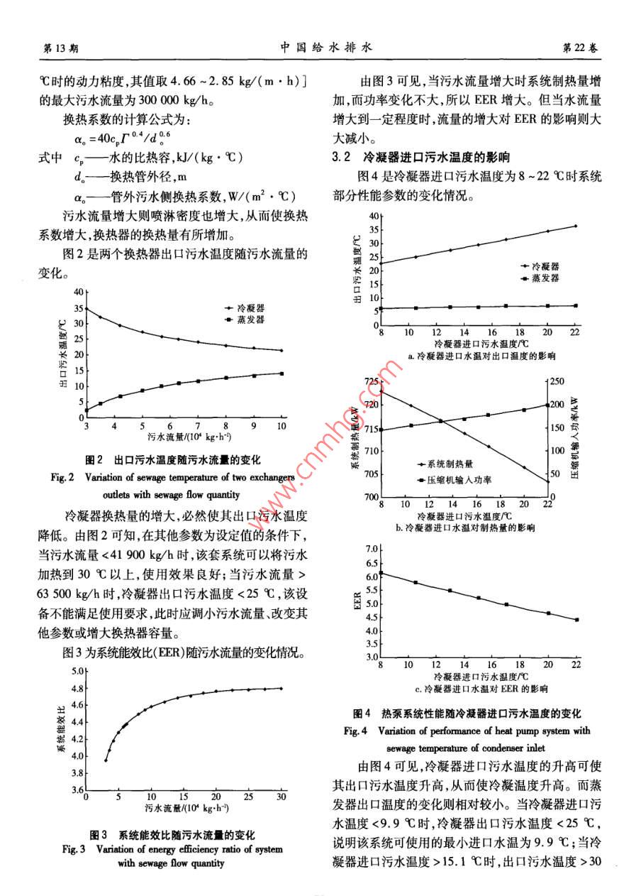 第22卷第13期中國給水排水Vol 22 No. 132006年7月CHINA WATER WaSTeWateRJul.2006污水源熱泵處理低溫污水的模擬分析姚楊,宋艷,那威(哈爾濱工業(yè)大學(xué)市政環(huán)境工程學(xué)院,黑龍江哈爾濱150090摘要:城市污水是一個優(yōu)良的低溫余熱源,為保證低溫污水生物處理的順利進(jìn)行,可考慮回收處理出水中的熱能并用其加熱原水以提高水溫,為此提出了以處理出水為熱源,以原水為熱匯的熱泵系統(tǒng),并根據(jù)污水水質(zhì)的特殊性和大溫差換熱的特點(diǎn),使用了多級淋激式冷凝器。建立了各部件的模型,并模擬計算了三級淋激式換熱器及整個熱泵系統(tǒng)的性能,分析了污水流量和進(jìn)口污水溫度等參數(shù)對系統(tǒng)性能的影響。模擬計算結(jié)果顯示,在設(shè)定的工況下出口污水溫度為29.569℃,能夠滿足生物處理的要求,說明系統(tǒng)具有可行性;同時其能效比為4.177,又具有節(jié)能性和經(jīng)濟(jì)性。關(guān)鍵詞:污水源熱泵;淋激式換熱器;性能模擬;生物處理中圖分類號:X706文獻(xiàn)標(biāo)識碼:C文章編號:1000-4602(2006)13-0070-04Simulation and Analysis of Sewage-source Heat Pump for LowTemperature Wastewater TreatmentYAO Yang, SONG Yan, NA WeiSchool of Municipal and Environmental Engineering, Harbin Institute of TechnologyAbstract: Sewage in urban areas can be a source of a low temperature heat energy due to the largeheat capacity. A sewage-source heat pump system using treated sewage as a heat source to heat raw sew-age was presented in order to ensure successful biological sewage treatment at a low temperature. Thehree-stage spray heat exchanger was introduced as the condenser in the heat pump. The performance ofthe system was simulated and analyzed with the change of environment parameters, such as the sewageflow quantity and the sewage temperature at the entrance of heat exchangers. The results show that thisnovel system can be utilized in biological wastewater treatment in cold climates because of its energy-saving and high efficient characteristics. Under the given condition, sewage temperature can be enhancedfrom 15C to 29. 569C, and the Energy Efficiency Ratio (EER)of the system can reach to 4.177Key words: sewage-source heat pump; spray heat exchanger; performance simulation; bio-logical treatment新系統(tǒng)的提出出用熱泵系統(tǒng)回收二級處理出水中的熱能并將其回目前,我國大多數(shù)污水處理廠所采用的工藝均用于處理前的污水(15℃),使水溫提高到30℃左為活性污泥法,其最適宜的溫度范圍是25~右,從而保證曝氣池中生化反應(yīng)的正常進(jìn)行2。該30℃。為保證低溫下污水處理過程的順利進(jìn)行,提熱泵系統(tǒng)的工作原理見圖1。第13期姚楊,等:污水源熱泵處理低溫污水的模擬分析第22卷預(yù)處理1模:采用系統(tǒng)辨識法和 DataFit數(shù)據(jù)分析軟件建立螺桿式壓縮機(jī)的模型;采用分區(qū)集中參數(shù)法建立三級淋激式冷凝器的模型;采用集中參數(shù)法建立電子膨約30℃脹閥和三級殼管式蒸發(fā)器的模型。然后以質(zhì)量守二級處理出水恒、能量守恒、動量守恒為約束條件,將各部件的模的10℃排型結(jié)合起來(不考慮系統(tǒng)循環(huán)各點(diǎn)狀態(tài)參數(shù)隨時間的變化)構(gòu)成整個系統(tǒng)的穩(wěn)態(tài)模型3。最后根據(jù)L淋激式冷凝器2節(jié)流機(jī)構(gòu)3殼管式蒸發(fā)器4壓縮機(jī)5污水泵6曝氣池計算機(jī)仿真原理,編制程序?qū)ο到y(tǒng)模型進(jìn)行求解2系統(tǒng)在設(shè)定工況下的模擬計算結(jié)果圖1污水源熱泵系統(tǒng)的原理簡圖在蒸發(fā)器出口過熱度(△t)和冷凝器出口過冷Fig. 1 Principle chart of sewage-Bource heat pump度(△a)一定的情況下,影響污水源熱泵系統(tǒng)運(yùn)行由于污水水質(zhì)的特殊性及結(jié)垢問題采用了淋工況的參數(shù)有污水的質(zhì)量流量(m,)、冷凝器進(jìn)口污激式換熱器作為冷凝器。根據(jù)工藝要求大溫差(15水溫度(t)、蒸發(fā)器進(jìn)口污水溫度()和污垢℃左右)換熱的特點(diǎn),采用了多級換熱的方式。熱阻(R1)等。所設(shè)定的工況如表1所示,該工況下首先對該污水源熱泵系統(tǒng)的四大部件各自建的模擬計算結(jié)果見表2。表1污水源熱泵模擬設(shè)定工況Tab. 1 Given condition of sewage-gource heat pump for simulation項(xiàng)目△M/m,(k44/R/(0·m,KW數(shù)值表2設(shè)定工況下的模擬計算結(jié)果Tab. 2 Simulated results of system under given condition名稱模擬計算結(jié)果壓縮機(jī)|壓縮比28#氣溫度:.80:排氣壓力11408縮人功率:17089W,人口制冷劑比4089級冷凝器出口污水溫度:19856℃;二級冷凝器出口污水溫度:24.713℃;三級冷凝器出口污水溫度:29569℃;冷凝器總換熱量:713.872kW;過熱區(qū)換熱系數(shù):389769W/(m2·℃);兩相區(qū)換熱系數(shù):95.81W/(m2冷凝器·℃);過冷區(qū)換熱系數(shù):464.245w/(m2·℃);-級過熱區(qū)長1.834m;級兩相區(qū)長:14.184m;一級過冷區(qū)長:1.522m;二級過熱區(qū)長:2399m;二級兩相區(qū)長:21.132m;二級過冷區(qū)長:1.708m;三級過熱區(qū)長:3.190;三級兩相區(qū)長:38.145m;三級過冷區(qū)長:10.564m膨脹網(wǎng)開啟面積:1.16103m2;進(jìn)出口壓差:72328P蒸發(fā)器一級蒸發(fā)器出口污水溫度:567℃二級蒸發(fā)器出口污水源度:1231℃:三級蒸發(fā)器出口污水溫度:682℃;換熱系數(shù):1045.368W/(m2℃);蒸發(fā)器總換熱量:57929 kW系統(tǒng)制冷劑質(zhì)量流量:6ks:蒸發(fā)溫度4171℃冷凝溫度:3.858℃:;系統(tǒng)能效比:4177建