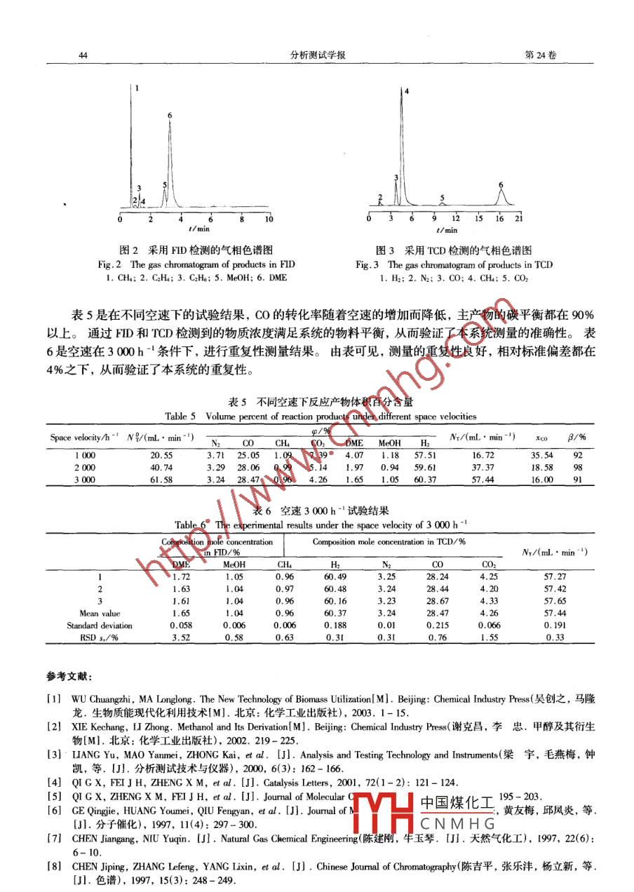 第24卷第3期分析測試學報Vol 24 No. 3005年5月ENXI CESHI XUEBAO(oumal of Instrumental analysis生物質合成氣一步法合成二甲醚的在線分析系統(tǒng)魯皓12,付嚴,常杰(1.中國科學院廣州能源研究所,廣東廣州510640;2.中國科學院研究生院,北京10009摘要:建立了一套由生物質合成氣一步法制取二甲醚的在線分析系統(tǒng)。針對生物質合成氣一步法合成二甲醚特征,采用兩臺分別裝有TC和FD檢測器的色譜儀分析反應產物。利用原料氣中N2作為內標物,來確定TCD上檢測到的水久性氣體組分濃度;通過CH4作內標物,來確定FID上檢測到的有機物組分濃度。T℃CD和FID之間通過CH4來關聯(lián),從而確定反應產物中主要組分的濃度。該系統(tǒng)在壓力3MPa,溫度250℃,空速(流速與催化劑體積的比值分別為1000、2000、3000h的條件下用C306和HZSM5催化劑進行評價測試,發(fā)現(xiàn)系統(tǒng)分析效果好,重復性高,并且反應前后主產物碳平衡到達90%以上。關鍵詞:生物質;二甲醚;合成;在線分析系統(tǒng);氣相色譜中圖分類號:0657.71;0658文獻標識碼:A文章編號:1004-4957(2005)03-0041-04An Online Analysis System for Direct Synthesis of Dimethyl Ether fromBiomass SyngasLU Hao. 2. FU Yan. CHANG Jie(1. Guangzhou Institute of Energy Conversion, Chinese Academy of Sciences, Guangzhou 510640.China2. Graduate School of the Chinese Academy of Sciences, Beijing 100039, China)Abstract: An online analysis system was established for direct synthesis of dimethyl ether(DME)frombiomass syngas that contains N2 and CHa besides CO, H2 and CO2. Two gas chromatographs(GCs)connectedquentially were used for online analysis. One gC was equipped with a tcd detector and a TDX-01 columnused to separate N2, CO, CH4, and CO2. The other GC was equipped with an Fid detector and a PorapakQ column used to separate CH4, CHOH, DME and light hydrocarbons. N2 and CH in the syngas were useas intemal standard in TCD and FID, respectively. The data from two GCs were related by CHa. The tubingfrom the catalyst bed to the GCs was heated at 120C so as to avoid any condensation of the products. Thesystem was tested, and the industrial methanol catalyst C306 and dehydration catalyst HZSM-5 were used inthe experiments. With a temperature of 250C, pressure of 3 MPa, and GHSV of 1 000, 2 000, and 3000h", the carbon balance of main components between the reactants and products were 92%,98% and919, respectively. At GHSV of 3 000 -, the relative standard deviation was less than 4%Key words: Biomass; Dimethyl ether; Synthesis; Online analysis system; Gas chromatograph生物質是一種重要的可再生能源,而且在其生產和利用過程中可以降低大氣中溫室氣體二氧化碳的積累。隨著石油天然氣儲量的逐漸減少以及近年來環(huán)境保護的壓力,利用熱化學方法從生物質中獲得液體燃料的研究日益受到重視。二甲醚(DME)是一種重要的化工產品,可作為發(fā)泡劑、制冷劑、民用潔凈燃料和發(fā)動機燃料以及重要的化工中間產品。目前二甲醚生產工藝一般有兩步法和一步法兩種。一步法合成具有流程短、投資少、能耗低的優(yōu)點,而且可以獲得較高的單程轉化率,因而越來越受到重視2我國是一個農業(yè)大國,通過生物質氣化合成氣一步法制取二甲醚具有高效率、低成本等優(yōu)點。其主要過程如下:生物質預處理、熱處理、氣體凈化、氣體重整、一步法二甲醚合成以及分離等。在二甲醚合成研究中,產物的檢測至關重要。梁宇等3提出一種用串接反應色譜法來研究甲醇氣相脫水制取二甲醚的色譜分析流程,可以一次性定量分析氣V山中國煤化工用并行的PplQ和TDX-01色譜柱來分離CO2加氫制取二甲醚的產物,分CNMHGCO加氫制取二甲醚的檢測,用單一的 Porapak-Q分離和TCD檢測。葛慶杰等利用mx01色譜柱分離并用TCD來檢收稿日期:2004-05-21;修回日期:2005-01-25基金項目:廣東省科技計劃項目(200383083);國家“863”計劃項目(2002AA51400)芳秀數(shù)擂(9=,.男,湖北孝感人,土研究生:常杰,聯(lián)系人,1:0280ym,E-m由mmp分析測試學報第24卷測永久性氣體,用GDX-01色譜柱分離甲醇、二甲醚等有機物質并用FID檢測。陳建剛等”用CDX-403色譜柱分離并用FID檢測有機物之后,通過冷凝器分離,然后再用碳分子篩分離永久性氣體并用TCD檢測,兩色譜之間用CH4來關聯(lián)根據(jù)生物質合成氣合成二甲醚的最佳氣化工藝,生物質合成氣含有N2和有少量CH4針對生物質合成氣的特性,作者建立了一套由生物質合成氣一步法合成二甲醚的在線分析系統(tǒng)。利用N2作TCD內標,兩臺色譜之間不經冷凝,并用CH4作關聯(lián),既可以解決TCD檢測有機物不理想的情況,也可以簡化外標法嚴格的定量取樣。1實驗部分1.1測量裝置裝置如圖1所示,當反應氣經過催化劑反應之后,尾氣經過穩(wěn)壓閥分成兩路,一路進入色譜分析,另一路進入尾氣流速測量。其中尾氣出口到色譜分析六通閥之間的管線保持在120℃(圖中虛線部分)。③當系統(tǒng)反應進入穩(wěn)定階段之后,使尾氣通過FID和TCD六通閥(尾氣流速測量部分關閉),將六通閥扳至采樣檔,然后扳回分析檔,對尾氣進行分圖1在線分析系統(tǒng)示意圖析。再將尾氣切換到流速測Fig 1 Schematic diagram of the online analysis system量部分(色譜分析部分關閉),1.反應氣( eed syngas):2.熱電偶( ( thermal cor);3.微型反應管( microreactor);4用乙醇和蒸餾水洗滌出去甲加熱爐( heater);5.穩(wěn)壓閥( pressure regulator);6.六通閥( six-way valve);7.FID8.TCD;9.冷凝器( condenser);10.吸收器(乙醇)( absorber( alcohol);1l.吸收器醇、二甲醚,經過干燥器之后(水)( absorber(wlr);12.