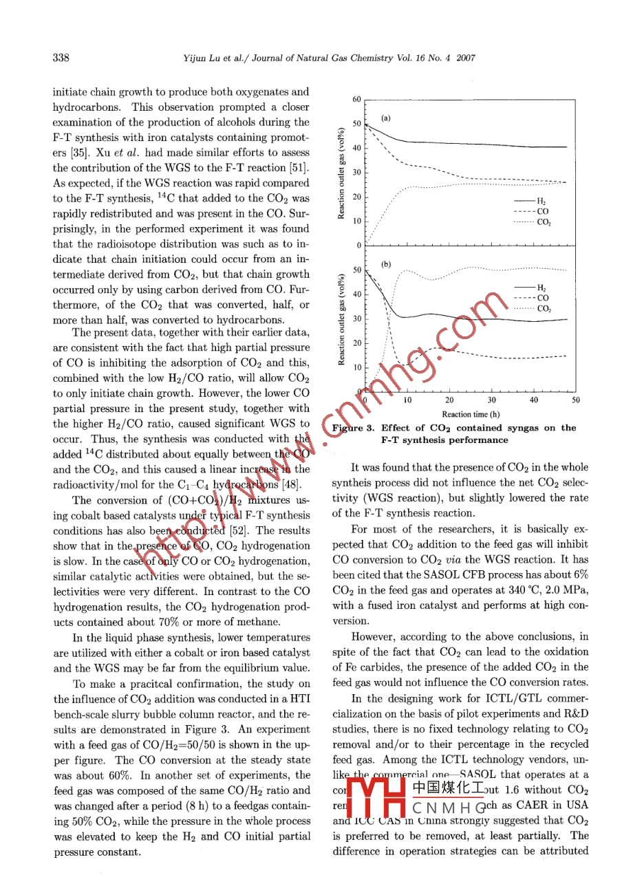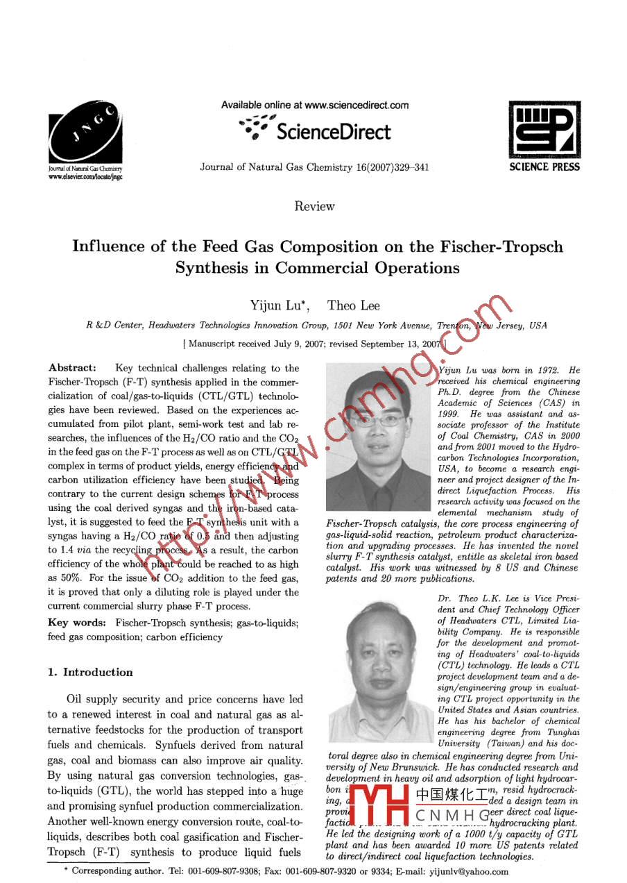 Availableonlineatwww.sciencedirect.comScienceDirect圖Journal of Natural Gas Chemistry 16(2007)329-341SCIENCE PRESSReviewInfluence of the Feed Gas Composition on the Fischer-TropschSynthesis in Commercial OperationsYijun lu’, Theo LeeR&D Center, Headwaters Technologies Innovation Group, 1501 New York Avenue, Trenton, New Jersey, USAI Manuscript received July 9, 2007; revised September 13, 2007 1Abstract: Key technical challenges relating to theYijun Lu was born in 1972. HeFischer-Tropsch(F-T)synthesis applied in the commer-received his chemical engineering/gas-to-liquids(CTL/GTL)teademic of Sciences(CAS) ingies have been reviewed. Based on the experiences ac-1999. He was assistant and ascumulated from pilot plant, semi-work test and lab re-sociate professor of the Institutesearches, the influences of the H2/Co ratio and the cOof Coal Chemistry, CAS in 2000in the feed gas on the F-T process as well as on CTL/GTLand from 2001 moved to the hydrorbon Technologies Incorporation,complex in terms of product yields, energy efficiency andUSA, to become a research engi-carbon utilization efficiency have been studied. Beingneer and project designer of the In-contrary to the current design schemes for F-T processusing the coal derived syngas and the iron-based cata-esearch activity was focused on thelyst, it is suggested to feed the F-T synthesis unit with a Fischer- Tropsch catalysis, the core process engineering ofsyngas having a H2/CO ratio of 0.5 and then adjusting gas-liquid-solid reaction, petroleum product characterizato 1. 4 via the recycling process. As a result, the carbontion and upgrading processes. He has invented the novelslurry F-T synthesis catalyst, entitle as skeletal iron basedefficiency of the whole plant could be reached to as highcatalyst. His work was witnessed by 8 US and Chinese50%. For the issue of CO2 addition to the feed gaspatents and 20 more publicationsit is proved that only a diluting role is played under theDr. Theo L.k. Lee is vice presicurrent commercial slurry phase F-T processdent and Chief Technology oficerKey words: Fischer-Tropsch synthesis; gas-to-liquidfeed gas composition; carbon efficienbility Company. He is responsiblefor the development and promoting of Headwaters'coal-to-diquids1. Introduction(CTL) technology. He leads a CTLproject development team and a de-sign/engineering group in evaluatOil supply security and price concerns have leding CTL project opportunity in theto a renewed interest in coal and natural gas as alUnited States and asian countriesHe has his bachelor of chemicalternative feedstocks for the production of transportfuels and chemicals. Synfuels derived from naturalUniversity (Taiwan) and his doctoral degree also in chemical engineering degree from Uni-gas, coal and biomass can also improve air quallty. versity of New Brunswick. He has conducted research andto-liquids(GTL), the world has stepped into a huge bon zi opment in heavy oil and adsorption of light hydrocar-By using natural gas conversion technologies, gas-中國(guó)煤化工mre8ddm水a(chǎn)nd promising synfuel production commercializationAnother well-known energy conversion route, coal-to- facticCNMHGeer direct kcna liquequids, describes both coal gasification and Fischer- He led the designing work of a 1000 t/y capacity of gtlTropsch(F-T) synthesis to produce liquid fuels to direct/indirect coal liquefaction techiCorrespondingauthorTel:001-609-807-9308;Fax:001-609-807-9320or9334;E-mail:yijunlv@yahoo.comYijun Lu et al. Journal of Natural Gas Chemistry Vol. 16 No. 4 2007(indirect CTL). And there are also the less developed, owned 2000 more patentsdirect coal liquefaction technologies. As has been pub-In the race of alternative energy commercializa-lished, the world s vast coal resources could become an tion, apparently the countries that have owned hugeimportant alternative to crude oil via the CTL routes. coal or natural gas resources are in the technologyThe F-T synthesis, first developed in Germany dur- frontiers. According to the published data, it can being the early decades of the 20th century, has been listed briefly here for the current status of the F-Tfurther developed and improved in South Africa by technology development as well as for the ICTL/GTLSASOL. Since the 1950,'s, 40 million tons of coal per commercial projects world widerear have been converted into 160,000 barrels per day . Chinaor crudeoil equivalent [1]Starting from the biggest investor, China(theFor any conversion routes, including the indirect ShenHua Group) is constructing a 60,000 bpd(di-coal-to-liquid(ICTL)and GTL technologies, the first rect)CTl plant and, with plans for further projects,step is to generate cleaned synthesis gas and followed aims to produce one million barrels per day by 2020by F-T synthesis, in which the two main characteris- China also has signed MOU with SASOL for a simi-tics are the unavoidable production of a wide range lar scaled ICTL plant in northwest China. SASOL isof hydrocarbon products and the liberation of a large considering the building of two CTL plants in Chinaamount of heat from the highly exothermic synthesis at a total cost of S14 billion. As a domestic repre-reactions. Product selectivities are influenced by tem- sentative technology vendor, the Shanxi Institute ofperature, feed gas composition(H2/Co), pressure, Coal Chemistry, Chinese Academy of Sciences(ICCand catalyst type 2CAS) dominates most of the F-T process researchersOver the years, four types of F-T reactors have and pilot plant experiences, covering from the fixedbeen designed and used commercially. The fixed bed bed reactor technology to the slurry ones [101tubular reactor, known as the ARGe reactor, oper-. USAates at 220-260C and 2-3 MPa. The high tempera-In the US, new incentives have been introducedture circulating fluidized bed reactors, known as Syn- for coal-based transport fuels, and coal companiesthol reactors, have been developed for gasoline andlight olefin production. Decades ago, 