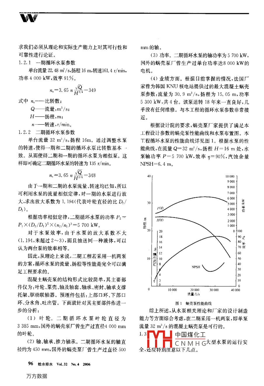Av施工、材料與設(shè)備·某核電站循環(huán)水泵的選擇及配置王東海(核工業(yè)第二研究設(shè)計院,北京100840)摘要如何選擇水泵形式并對其數(shù)量進行配置,是核電站設(shè)計中一個比較關(guān)鍵的問題。國內(nèi)某濱海核電站為百萬千瓦級壓水堆核電站,單臺杋組的循環(huán)水流量達(dá)64m3/s。介紹了該核電站循環(huán)水泵在選擇中的思路和重點應(yīng)考慮的問題,比如選用一機兩泵還是一機四泵,特大型混凝土蝸殼泵的可行性、可靠性,驅(qū)動方式采用直接連接還是間接連接等。經(jīng)過分析論證,最終確定采用一機兩泵的方案,水泵形式為混凝土蝸殼泵,驅(qū)動方式采用間接連接方式。關(guān)鍵詞核電站循環(huán)水系混凝土蝸殼泵驅(qū)動方式在大型濱海核電站中,利用循環(huán)水系統(tǒng)對二回得知如果按照一機兩泵,即每臺循環(huán)水泵的流量路進行冷卻,其循環(huán)水泵的流量和功率均非常大,在32m3/s,揚程16m,廠家有能力生產(chǎn)單臺水泵流量設(shè)計時如何選擇水泵的形式和較好地對其數(shù)量進行32m3/s,揚程16m的混凝土蝸殼泵;個別廠家已經(jīng)配置,是一個非常重要的問題。有和二期循環(huán)水泵參數(shù)非常接近的供貨業(yè)績,但是如某核電站二期工程為百萬千瓦級壓水堆核電如此大參數(shù)的混凝土蝸殼泵應(yīng)用還不夠廣泛。如果站,其循環(huán)水系統(tǒng)的設(shè)計參數(shù)為:每臺機組的循環(huán)水按照一機四泵,即每臺循環(huán)水泵的流量16m3/s,揚流量為64m3/s,揚程為16m。而參考電站即一期程16m,上述三個廠家都具備生產(chǎn)能力,而且在國工程亦是百萬千瓦級核電站循環(huán)水系統(tǒng)的參數(shù)為:內(nèi)外同類丁程中有供貨業(yè)績和成熟經(jīng)驗每臺機組的循環(huán)水流量為45m23/s,水泵配置為一機另外,根據(jù)向法國專家咨詢的結(jié)果,法國電力公兩泵司(EDF)設(shè)計的最大循環(huán)水泵為 CATTENOM核國內(nèi)百萬千瓦級核電站的循環(huán)水泵形式一般為電站(4×1300MW)的循環(huán)水泵,其參數(shù):流量混凝土蝸殼泵,常規(guī)配置為一機兩泵;一般單泵流量24m/s揚程30m,轉(zhuǎn)速230r/min,功率為8175k為22.5m3/s揚程為16m,電機功率為4500kW在法國,其標(biāo)準(zhǔn)配置為一機兩泵國內(nèi)60萬kW級核電站的循環(huán)水泵形式亦為混凝從與參考電站即一期工程的配套性來看,一機土蝸殼泵,常規(guī)配置為一機兩泵;一般單泵流量為兩泵的方案如果可行,應(yīng)是首選方案。因為,這種14-~19m3/s,揚程為15~19m,電機功率為300~方案和參考電站相比最為接近,從工藝布置、系統(tǒng)5000kW。設(shè)計、溝道接口、設(shè)計采購、工程進度、運行維護管參考國內(nèi)外核電站的情況,并考慮到與一期理的方便性等方面都有很大的優(yōu)勢。從經(jīng)濟性來程的配套性,對本工程的循環(huán)水泵,擬選用混凝土蝸說,根據(jù)廠家的初步報價,若用兩臺流量16m3/s殼泵。國外的混凝土蝸殼泵供貨商有:法國Asom的小混凝土蝸殼泵代替單臺流量32m2/s的混凝Burgeon、英國weir、美國 Flowserve等。國內(nèi)目土蝸殼泵,在設(shè)備造價上兩臺小泵要比一臺大泵前尚不具備制造這種特大型蝸殼泵的能力。貴50%~60%,而且土建投資也要明顯增加1混凝土蝸殼泵方案1.2機兩泵方案的可行性和可靠性1.1機兩泵方案的確定對于單臺流量32m3/s的特大型混凝土蝸殼在方案設(shè)計階段,為∫確定在本工程的循環(huán)水泵中國煤化工較匱乏。而在核電系統(tǒng)中究竟采用一機兩泵還是一機四泵通過與國站過CNMHG工程進度,技術(shù)經(jīng)外幾家混凝土蝸殼泵生產(chǎn)廠家進行接觸和技術(shù)交流濟做到最優(yōu)化,又要確保電站的安全運行。這就要給水排水Vo.32Y4200695求我們必須從理論和實際生產(chǎn)能力上對其可行性和mm的軸可靠性進行論證(3)功率。二期循環(huán)水泵的軸功率為5700kW1.2.1一期循環(huán)水泵參數(shù)國外的蝸殼泵廠曾生產(chǎn)過單臺功率達(dá)8000kW的單臺流量2248m3/s,揚程16m轉(zhuǎn)速161.4r/min,電機。功率4000kW,效率91%。(4)業(yè)績方面。根據(jù)日前掌握的情況,法國廠n=3.65n4=349家曾為韓國KNU核電站提供過的最大混凝土蝸殼泵參數(shù):流量為30.9m3/s,揚程為15.05m,功率式中n—比轉(zhuǎn)數(shù);5300kW,共4臺。該泵運轉(zhuǎn)18年來一直良好,幾Q—流量,m3/乎沒有任何維修。與本工程的循環(huán)水泵參數(shù)非常接H—揚程,m;近n——轉(zhuǎn)速,r/min根據(jù)設(shè)計院的要求,蝸殼泵廠家提供了滿足本期循環(huán)水泵參數(shù)L程設(shè)計參數(shù)的蝸殼泵性能曲線和水泵布置圖。本單臺流量32m/s,揚程16m。通過調(diào)整水泵程循環(huán)水泵的性能曲線詳見圖1。根據(jù)水泵的性的轉(zhuǎn)速,使得一期和二期的循環(huán)水泵比轉(zhuǎn)數(shù)基本能曲線,在流量Q=32m3/s,揚程H=16m處,水致。從而使得二期和一期的循環(huán)水泵為相似泵。這泵軸功率P=5700kW,效率n=90%,汽蝕余量樣即可確定二期循環(huán)水泵的轉(zhuǎn)速為135r/minNPSH=6. 4mn=3.65348由丁一期和二期的水泵流量、轉(zhuǎn)速均已知,所以可利用水泵的流量相似定律,對一期的水泵進行放大,求出放大系數(shù)為1.194(代表葉輪直徑的比D2/D1)。根據(jù)功率相似定律,二期循環(huán)水泵的功率P2H(9P1×(D2/D1)5×(n2/m1)3=5700kW。對于水泵效率,由于水泵的放大系數(shù)不大(1.194,未超過2~