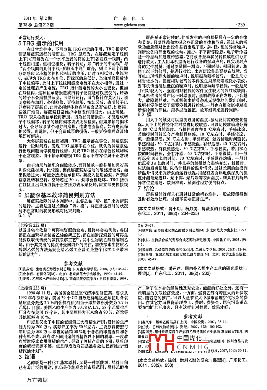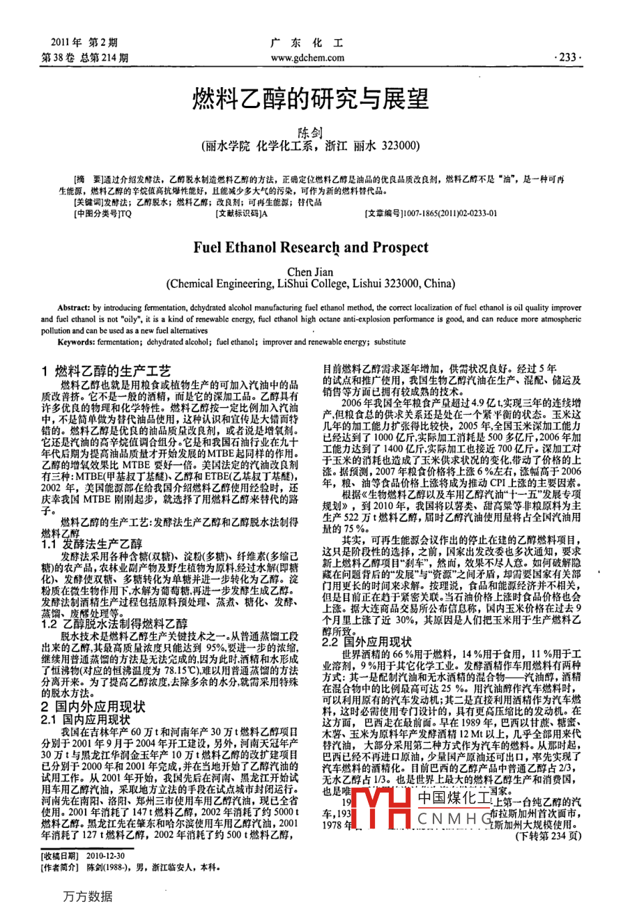 201l年第2期廣東化工第38卷總第214期vww.gdchem.com233燃料乙醇的研究與展望陳劍(麗水學(xué)院化學(xué)化工系,浙江麗水323000摘要J通過(guò)介紹發(fā)酵法,乙醉脫水制造燃料乙醇的方法,正確定位燃料乙醇是油品的優(yōu)良品質(zhì)改良劑,燃料乙醇不是“油",是一種可膺生能源,燃料乙醇的辛烷值高抗爆性能好,且能減少多大氣的污染,可作為新的燃料替代品。[關(guān)鍵詞]發(fā)酵法;乙醇脫水;燃料乙醇;改良劑;可再生能源;替代品[中圖分類號(hào)TQ獻(xiàn)標(biāo)識(shí)碼]A文章編號(hào)]1007-1865(2011)02023301Fuel Ethanol Research and prospectChen jianChemical Engineering, LiShui College, Lishui 323000, China)Abstract: by introducing fermentation, dehydrated alcohol manufacturing fuel ethanol method, the correct localization of fuel ethanol is oil quality improverand fuel ethanol is not"oily", it is a kind of renewable cnergy, fucl ethanol high octane anti-explosion performance is good, and can reduce more atmospheriollution and can be used as a new fuel alternativesKeywords: fermentation; dehydrated alcohol; fuel ethanol; improver and renewable energy; substitute燃料乙醇的生產(chǎn)工藝目前燃料乙醇需求逐年增加,供需狀況良好。經(jīng)過(guò)5年燃料乙醇也就是用糧食或植物生產(chǎn)的可加入汽油中的品的試點(diǎn)和推廣使用,我國(guó)生物乙醇汽油在生產(chǎn)、混配、儲(chǔ)運(yùn)及質(zhì)改善擠。它不是一般的酒精,而是它的深加工品。乙醇具有的技術(shù)。許多優(yōu)良的物理和化學(xué)特性。燃料乙醇按一定比例加入汽油2006年我國(guó)全年糧食產(chǎn)量超過(guò)49億t實(shí)現(xiàn)三年的連續(xù)增中,不是簡(jiǎn)單做為替代油品使用,這種認(rèn)識(shí)和宣傳足大錯(cuò)而特產(chǎn),但糧食總的供求關(guān)系還是處在一個(gè)緊平衡的狀態(tài)。玉米這的加工能力擴(kuò)張得比較快,2005年全國(guó)玉米深加工能力它還是汽油的高辛烷值調(diào)合組分。它是和我國(guó)石油行業(yè)在九十已經(jīng)達(dá)到了100億廳實(shí)際加工消耗是500多億斤,200年加年代后期為提高油品質(zhì)量才開(kāi)始發(fā)展的MTBE起同樣的作用乙醇的增氧效果比MTBE要好一倍。美國(guó)法定的汽油改良劑于玉米的消耗也造成了玉米供求狀況的變化,帶動(dòng)了價(jià)格的漲。據(jù)預(yù)測(cè),2007年糧食價(jià)格將上漲6%左右,漲幅高于200620年,美國(guó)能源部在給我國(guó)介紹燃料乙醉使用經(jīng)驗(yàn)時(shí),還年,糧,油等食品價(jià)格上漲將成為推動(dòng)CP上漲的主要因素慶幸我國(guó)MTBE剛剛起步,就選擇了用燃料乙醇來(lái)替代的路根據(jù)《生物燃料乙醇以及車用乙醇汽油“十一五”發(fā)展專項(xiàng)規(guī)劃》,到2010年,我國(guó)將以薯類、甜高粱等非糧原料為主燃料乙醇的生產(chǎn)工藝發(fā)酵法生產(chǎn)乙醇和乙醇脫水法制得量生產(chǎn)522萬(wàn)t燃料乙醇,屆時(shí)乙醇汽油使用量將占全國(guó)汽油用1發(fā)酵法生產(chǎn)乙醇其實(shí),可再生能源會(huì)議作出的停止在建的乙醇燃料項(xiàng)目發(fā)酵法采用各種含糖(雙糖)、淀粉(多糖纖維素(多縮己這只是階段性的選擇,之前,國(guó)家出發(fā)改委也多次通知,要求糖)的農(nóng)產(chǎn)品,農(nóng)林業(yè)副產(chǎn)物及野生植物為原料經(jīng)過(guò)水解(即糖新上燃料乙醇項(xiàng)目“剎車”,然而,效果不盡人意。如何破解隱化)發(fā)酵使雙糖、多糖轉(zhuǎn)化為單糖并進(jìn)步轉(zhuǎn)化為乙醇。淀藏在問(wèn)題背后的發(fā)展與資源”之間矛盾,卻需要國(guó)家有關(guān)部粉質(zhì)在微生物作用下水解為葡萄糖,再進(jìn)一步發(fā)酵生成乙醇門用更長(zhǎng)的時(shí)間來(lái)求解。按理說(shuō),食品和能源經(jīng)濟(jì)并不相關(guān)發(fā)酵法制酒精生產(chǎn)過(guò)程包括原料預(yù)處理、蒸煮、糖化、發(fā)酵但是目前正在趨于緊密關(guān)聯(lián)。當(dāng)石油價(jià)格上漲時(shí)食品價(jià)格也會(huì)蒸餾、廢酸處理上漲。據(jù)大連商品交易所公布信息稱,國(guó)內(nèi)玉米價(jià)格在過(guò)去912乙醇脫水法制得燃料乙醇個(gè)月里上漲了近30%,其原因是人們把玉米用于生產(chǎn)燃料乙脫水技術(shù)是燃料乙醇生產(chǎn)關(guān)鍵技術(shù)之一。從普通蒸餾工段醇所致出來(lái)的乙醇其最高質(zhì)量濃度只能達(dá)到95%要進(jìn)一步的濃縮,22國(guó)外應(yīng)用現(xiàn)狀r物越的方法是先充的,理為用時(shí)通才萬(wàn)法業(yè)溶劑9%用于其它化學(xué)工業(yè)發(fā)陪酒作車用燃料有兩種分離開(kāi)來(lái)。為了提高乙醇濃度去除多余的水分,就需采用特殊方式:其一是配制汽油和無(wú)水酒精的混合物一一汽油醇,酒精2國(guó)內(nèi)外應(yīng)用現(xiàn)狀在品合用原有的汽車發(fā)動(dòng)機(jī)其二是直按利用酒柿作為汽車燃21國(guó)內(nèi)應(yīng)用現(xiàn)狀料,這時(shí)必需使用專門設(shè)計(jì)的,具有更高壓縮比的發(fā)動(dòng)機(jī)。在我國(guó)在古林年產(chǎn)60萬(wàn)t和河南年產(chǎn)30萬(wàn)t燃料乙醇項(xiàng)日木薯、玉米為原料年產(chǎn)發(fā)酵酒精12M以上,幾乎全部用來(lái)代量國(guó)產(chǎn)原油還可出口,率已分別于2000年82001年完成,并在當(dāng)?shù)亻_(kāi)始了乙醇汽油的汽車燃料的酒精化。目前巴西的乙醇產(chǎn)品中普通乙醇占232001年開(kāi)始,我國(guó)先后在