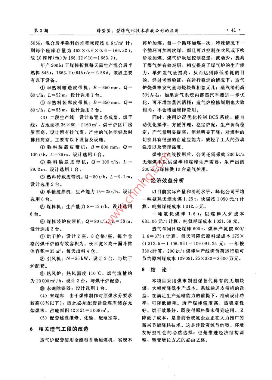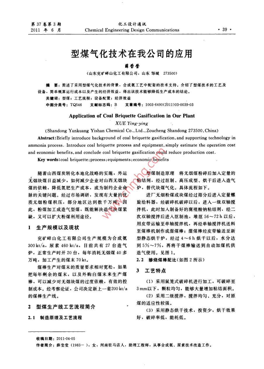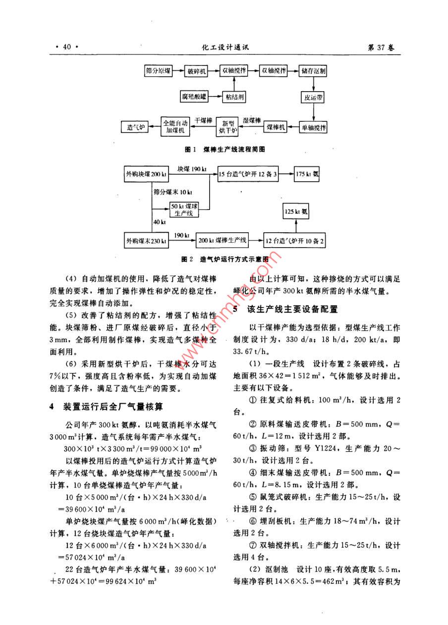 第37卷第3期化工設計通訊2011年6月Chemical Engineering Design Communications型煤氣化技術在我公司的應用薛瑩瑩(山東兗礦峰山化工有限公司,山東鄒城273500)摘要:簡述了采用型煤氣化技術的背景,合成氨工藝中配套的技術支持。介紹了型煤技術的工藝及設備,簡單概算運行成本以及產生的經濟效益,得出該技術能夠降低生產成本的結論。關鍵詞:型煤;工藝流程:設備配置;經濟效益中圖分類號: TQ546文獻標志碼: B文章編號: 1003-6490(2011)03-0039-03Application of Coal Briquette Gasification in Our PlantXUE Ying-ying(Shandong Yankuang Yishan Chemical Co., Ltd., Zoucheng Shandong 273500, China)Abstract: Briefly introduce background of coal briquette gasification, and supporting technology inammonia process. Introduce coal briqutte process and equipment, simply estimate the operation costand economic benefits, and conclude coal briquette gasification could reduce production cost.Key words:coal briquette ;process ;equipments;economic benefits隨著山西煤炭轉化本地化戰(zhàn)略的實施,外運型煤制造原理將無煙煤粉碎后加人定量的無煙塊煤日益減少,如何減少企業(yè)對山西無煙塊粘結劑,經過漚制、高壓成型、烘干后進入造氣煤的依賴,降低氮肥生產成本,成為制約企業(yè)命爐,替代塊煤氣化。具體流程如下。脈的關鍵問題。經過市場調研,發(fā)現(xiàn)有大量的優(yōu)進廠無煙粉煤或塊煤經過篩分后進人定量螺質無煙粉煤積壓,部分地區(qū)達到數(shù)千萬噸。因旋給料器,經破碎機破碎以后,進入一級雙軸攪此,粉煤加工成造氣型煤,既能解決造氣塊煤緊拌機,此時加人制備好的腐殖酸鈉粘結劑,經二缺,又可以擴大粉煤利用途徑。次雙軸攪拌后進入漚制池,堆漚56~72h以后,用皮帶運輸至單軸攪拌機,再經單軸攪拌機送料1生產 規(guī)模以及現(xiàn)狀至煤棒機制作成濕煤棒;濕煤棒經皮帶輸送至新兗礦嶧山化工有限公司生產規(guī)模為合成氨型靜態(tài)烘干爐,經過4~6h烘干以后,水分達300kt/a,尿素460kt/a, 目前共有27臺造氣到5%~7%,再將干煤棒輸送到自動加煤機供爐,正常生產時開20臺,每年消耗無煙煤40多造氣使用。見圖1.萬噸,加工產生的煤末70 kt。2.2 摻燒煤棒配比(如圖2所示)煤棒生產對煤末的質量要求相對寬松。如果3工藝特點把每年剩余的煤末,以及外購白煤末來生產煤棒,可以減少對無煙塊煤的過度依賴,有效的控(1)采用鼠籠式破碎機進行加工,可破碎至制成本。經考察論證,公司決定新上一套200kt/a 3 mm以下,顆粒均勻,能夠大量增加粘結面積。的煤棒生產線。(2)采用二級攪拌,攪拌均勻、充分,對原煤的適應性較強。2型煤生產線工藝流程簡 介(3)采用靜態(tài)烘干技術,投資少,烘干效果2.1 制造原理及工藝流程好,破碎率低,能耗低。.收稿日期: 2011-04-05作者簡介:薛瑩瑩(1983- )。女,河南駐馬店人,助理工程師,從事合成氨、尿素技術改造工作?!?0●化工設計通訊第37卷飾分的煤)破碎機一一雙軸攪排]一僅軸境擁一儲存漚制網(wǎng)殖酸罐]→粘結閘皮運帶全能自動干煤棒「郭濕煤棒C 造氣爐一加煤機新型[媒棒機一單鈾攪押圖1煤棒生產線流程簡圖外購塊煤200kt塊煤190h 15臺流氣爐開12備3一-17512篩分媒末 I0kt50ki煤球L生產線」| 125kt氨| 外購煤末230ki190kt .| 200煤梆生產線一一12臺造”[爐開10備2|團2造氣爐運行方式示意圖(4)自動加煤機的使用,降低了造氣對煤棒由以上計算可知,這種摻燒的方式可以滿足質量的要求,增加了操作彈性和爐況的穩(wěn)定性,嶧化公司年產300kt氨醇所需的半水煤氣量。完全實現(xiàn)煤棒自動添加。(5)改善了粘結劑的配方,增強了粘結性5該生產線主要設備配置能。塊煤篩粉、進廠原煤經破碎后,直徑小于以干煤棒產能為選型依據(jù):型煤生產線工作3mm,全部利用制作煤棒,實現(xiàn)造氣多煤種全制度設計為,330 d/a; 18 h/d, 200 kt/a,即面利用。33. 67 t/h.(6)采用新型烘干爐后,干煤棒水分可達(1)一段生產線 設計布置2條破碎線,占7%以下,強度高且含粉率低,為實現(xiàn)自動加煤地面積36X42=1512m',氣體能夠及時排出。創(chuàng)造了條件,滿足了造氣生產的需要。主要有以下設備。①往復式給料機: 100 m'/h,設計選用24裝置運行后全廠氣量核算臺。公司年產300kt氨醇,以噸氨消耗半水煤氣②原料煤輸送皮帶機: B= 500 mm, Q=3000m’計算,造氣系統(tǒng)每年需產半水煤氣:60t/h,L=12m.設計選用2部。300X10* tX3 300 m2/t= 99000X 10* m'③振動篩:型號Y1224,生產能力20~以煤棒投用后的造氣爐運行方式計算造氣爐30t/h, 設計選用2臺。年產半水煤氣量。單爐燒煤棒產氣量按5000m2/h④細末煤輸送皮帶機: B= 500 mm, Q=計算,10 臺單燒煤棒造氣爐年產氣量:60t/h, L=8. 15m,設計選用2部。10臺X5000m/(臺●h)X24 hX330d/a⑤鼠籠式破碎機:生產能力15~25t/h,設= 39600X10* m'/a計選用2臺。單爐燒塊煤產氣量按6000m2/h(嶧化數(shù)據(jù))⑥埋刮板機:生產能力18~74m2/h,設計計算,12 臺燒塊煤造氣爐年產氣量:選用2臺。12臺X6000m2/(臺●h)X24 hX 330d/a⑦雙軸攪拌機:生產能力15~25t/h,設計=57024X10* m2/a選用4臺。22臺造氣爐年產半水煤氣量: 39 600X 10(2)漚制池設計10座,有效高度取5. 5m,+57 024X10*=99624X10* m3每座凈容積14X6X5.5=462m2;其有效容積為第3期薛瑩瑩:型煤氣化技術在我公司的應用.●41.60%.混合后半熟料的堆積密度按0.6t/m’計,停爐加煤, 每一個循環(huán)加煤-一次,特殊情況下一一則每個座庫存量為462X0.6X0.6= 166.32 t。個循環(huán)可加兩次煤,而且可以控制在吹風或下吹故10座庫(池)為