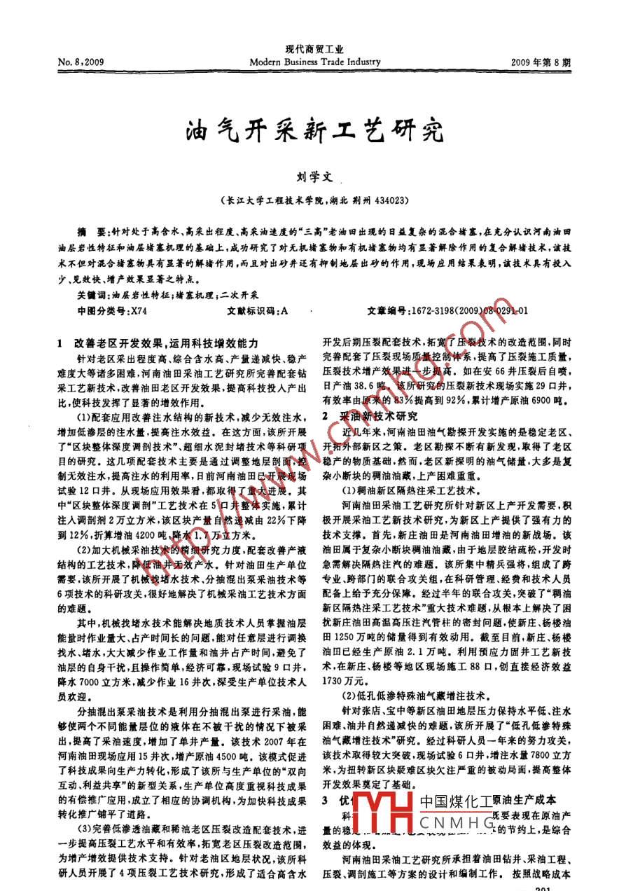 現(xiàn)代商貿(mào)工業(yè)No.8,2009Modern Business Trade Industry2009年第8期油氣開采新工藝研究劉學(xué)文長江大學(xué)工程技術(shù)學(xué)院,湖北荊州434023)摘要:針對處于高含水、高采出程度、高采油速度的“三高”老油田出現(xiàn)的日益復(fù)雜的混合豬塞,在充分認(rèn)識河南油田油層巖性特征和油層豬塞機(jī)理的基礎(chǔ)上,成功研究了對無機(jī)堵塞物和有機(jī)櫧塞物均有顯著解除作用的復(fù)合解堵技術(shù),該技術(shù)不但對混合堵塞物具有顯著的解堵作用,而且對出砂井還有抑制地層出矽的作用,現(xiàn)場應(yīng)用結(jié)果表明,該技術(shù)具有投入少,見效快、增產(chǎn)效果顯著之特點(diǎn)關(guān)鍵詞;油層巖性特征;豬塞機(jī)理;二次開采中圖分類號:X74獻(xiàn)標(biāo)識碼:A文章編號:1672-3198(2009)080291-01改善老區(qū)開發(fā)效果,運(yùn)用科技增效能力開發(fā)后期壓裂配套技術(shù),拓寬了壓裂技術(shù)的改造范圍,同時(shí)針對老區(qū)采出程度高、綜合含水高、產(chǎn)量遞減快、穩(wěn)產(chǎn)完善配套了壓裂現(xiàn)場質(zhì)量控制體系提高了壓裂施工質(zhì)量難度大等諸多困難河南油田采油工藝研究所完善配套鉆壓裂技術(shù)增產(chǎn)效果進(jìn)一步提高,如在安66井壓裂后自噴,采工藝新技術(shù)改善油田老區(qū)開發(fā)效果提高科技投入產(chǎn)出日產(chǎn)油386噸。該所研究的壓裂新技術(shù)現(xiàn)場實(shí)施29口井比,使科技發(fā)揮了顯著的增效作用有效率由原來的83%提高到92%累計(jì)增產(chǎn)原油6900噸(1)配套應(yīng)用改善注水結(jié)構(gòu)的新技術(shù),減少無效注水,2采油新技術(shù)研究增加低滲層的注水量,提高注水效益,在這方面,該所開展近幾年來,河南油田油氣勘探開發(fā)實(shí)施的是穩(wěn)定老區(qū)、了“區(qū)塊整體深度調(diào)剖技術(shù)”超細(xì)水泥封堵技術(shù)等科研項(xiàng)開拓外部新區(qū)之策。老區(qū)勘探不斷有新發(fā)現(xiàn)取得了老區(qū)目的研究,這幾項(xiàng)配套技術(shù)主要是通過調(diào)整地層剖面,控穩(wěn)產(chǎn)的物質(zhì)基礎(chǔ),然而,老區(qū)新探明的油氣儲量,大多是復(fù)制無效注水,提高注水的利用率,日前河南油田已開展現(xiàn)場雜小斷塊的稠油油藏,上產(chǎn)困難重重試驗(yàn)12口井。從現(xiàn)場應(yīng)用效果看,都取得了重大進(jìn)展。其(1)稠油新區(qū)隔熱注采工藝技術(shù)。中“區(qū)塊整體深度調(diào)剖”工藝技術(shù)在5口井整體實(shí)施,累計(jì)河南油田采油工藝研究所針對新區(qū)上產(chǎn)開發(fā)需要,積注入調(diào)剖劑2萬立方米,該區(qū)塊產(chǎn)量自然遞減由22%下降極開展采油工藝新技術(shù)研究,為新區(qū)上產(chǎn)提供了強(qiáng)有力的到12%,折算增油4200噸降水17萬立方米。技術(shù)支撐。首先,新莊油田是河南油田增油的新戰(zhàn)場,該(2)加大機(jī)械采油技術(shù)的精細(xì)研究力度,配套改善產(chǎn)液油田屬于復(fù)雜小斷塊稠油油藏,由于地層膠結(jié)疏松開發(fā)時(shí)結(jié)構(gòu)的工藝技術(shù),降低油井無效產(chǎn)水。針對油田生產(chǎn)單位急需解決隔熱注汽的難題,該所集中精兵強(qiáng)將,組成了跨需要該所開展了機(jī)械找堵水技術(shù)、分抽混出泵采油技術(shù)等專業(yè)、跨部門的聯(lián)合攻關(guān)組,在科研管理、經(jīng)費(fèi)和技術(shù)人員6項(xiàng)技術(shù)的科研攻關(guān),很好地解決了機(jī)械采油工藝技術(shù)方面配備上給予充分保障。經(jīng)過半年的聯(lián)合攻關(guān),突破了“稠油的難題新區(qū)隔熱注采工藝技術(shù)”重大技術(shù)難題,從根本上解決了困其中,機(jī)械找堵水技術(shù)能解決地質(zhì)技術(shù)人員掌握油層擾新莊油田高溫高壓注汽管柱的密封問題使新莊、楊樓油能量時(shí)作業(yè)量大、占產(chǎn)時(shí)間長的問題能對任意層進(jìn)行調(diào)換田1250萬噸的儲量得到有效動用。截至目前新莊、楊樓找水、堵水,大大減少作業(yè)工作量和油井占產(chǎn)時(shí)間避免了油田已經(jīng)生產(chǎn)原油2.1萬噸,利用預(yù)應(yīng)力固井工藝新技油層的自身干擾,且操作簡單經(jīng)濟(jì)可靠,現(xiàn)場試驗(yàn)9口井,術(shù)在新莊、楊樓等地區(qū)現(xiàn)場施工88口,創(chuàng)直接經(jīng)濟(jì)效益降水7000立方米減少作業(yè)16井次深受生產(chǎn)單位技術(shù)人1730萬元員歡迎。(2)低孔低滲特殊油氣藏增注技術(shù)分抽混出泵采油技術(shù)是利用分抽混出泵進(jìn)行采油,能針對張店、寶中等新區(qū)油田地層壓力保持水平低、注水夠使兩個(gè)不同能量層位的液體在不被干擾的情況下被采困難油井自然遞減快的難題該所開展了“低孔低滲特殊出,提高了采油速度,增加了單井產(chǎn)量。該技術(shù)2007年在油氣藏增注技術(shù)”研究。經(jīng)過科研人員一年來的努力攻關(guān),河南油田現(xiàn)場應(yīng)用15井次,增產(chǎn)原油4500噸。該模式促進(jìn)該技術(shù)取得較大突破現(xiàn)場試驗(yàn)6口井,增注水量7800立方了科技成果向生產(chǎn)力轉(zhuǎn)化形成了該所與生產(chǎn)單位的“雙向米為扭轉(zhuǎn)新區(qū)塊疑難區(qū)塊欠注嚴(yán)重的被動局面,提高整體互動、利益共享”的新型關(guān)系,生產(chǎn)單位高度重視科技成果開發(fā)效果奠定了