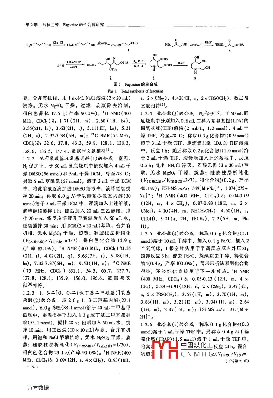 第23卷第2期汕頭大學(xué)醫(yī)學(xué)院學(xué)報(bào)Vol.23 No.22010Journa of Shantou Univesity Medical College500 ”2010___Fagomine的全合成研究呂秋蘭|,王果2),肖緒枝2), 陳河如1.2.3), 葉文才2.3)(1汕頭大學(xué)醫(yī)學(xué)院化學(xué)教研室,廣東汕頭515041;2牲南大學(xué)中藥及天然藥物研究所;3暨南大學(xué)中藥藥效物質(zhì)基礎(chǔ)及創(chuàng)新藥物研究所,廣東省商校重點(diǎn)實(shí)驗(yàn)室,廣東廣州510632)[摘要]目的:研究fagomine的最佳化學(xué)合成路線。方法:以3-氨基丙醇和1, 3-二羥基丙酮為原料,通過Swem氧化、Aldal反應(yīng)、還原胺化及催化氫化合成fagonineo 結(jié)果: Fagonine 經(jīng)四步反應(yīng)合成。產(chǎn)物結(jié)構(gòu)經(jīng)核磁共振、質(zhì)譜確證。結(jié)論:以便的四步反應(yīng)合成了fagonine,產(chǎn)物將用于進(jìn)-步的結(jié)構(gòu)修飾。[關(guān)鍵詞]合成; fagonine; 含氮糖[中圖分類號(hào)] R914; R927[文獻(xiàn)標(biāo)識(shí)碼] A[文章編號(hào)] 107-74620102-00730-03Study on the Total Synthesis of FagomineL0 Qiu-lan', WANG Gu2, XIAO Xu-zhi?, CHEN He-ru1.2.3, YE Wen-cai2. 3(1 Depurtment of Chenistry, Shanlou Uniersity Medical College, Shantou 515041, China, 2 Isiute of Traditional Chinese Medicine &Natwral Products, Jinan Univrsity, Guanghou 510632, China, 3 Cuangdong Proine Key Laboratory of Plumacodynanic Consituentsof TCM and Nev Drugs Research,Jinan Unirersity, Guanghou 510632, China)[Abstract] Objective: To study the optimal synthetic route for fagonine. Mehod: The target conpound was synthe-sized via multiple steps including Swern oxidation, Aldol reaction and reduced amination by applying 3- aminopropyl alco-hol and 1, 2-dihyroxyacetone as starting malerials. Resuls: Fagomine had been synthesized by four-step process. Thestructure was confimed by nuclear magnetic resonance and eletrospray ionizaion mass spectrometry. Conclusion: Four-step process has been developed for the syntbesis of fagonine. The product will be used in the further structural modifica-ion.[Key Words] synthesis, fagonine, azasugar多羥基哌啶化合物(含氮多羥基糖)由于具有顯核磁共振儀(Brucker Biospin公司,瑞士。TMS為內(nèi)著的糖苷酶抑制活性而備受合成化學(xué)家所關(guān)注。近標(biāo)); Finnigan LCQ Advantage MAX質(zhì)譜儀(Themo年來,通過抑制a-糖苷酶活性,開展II型糖尿病Finigan公司,美國);柱色譜用硅膠(青島海洋化的治療已成為藥物研究領(lǐng)域的一個(gè)熱點(diǎn)"。1, 2-工廠,中國);硅膠GF254薄層預(yù)制板(煙臺(tái)化學(xué)工二去氧氮糖是一小類但相當(dāng)重要的糖苷酶抑制.業(yè)研究所,中國);所用市售國產(chǎn)AR試劑都經(jīng)過劑[2],fagomine 就是其中一員。研究表明, fagonine干燥、純化處理。是桑葉中起降糖作用的主要成分之一_[3-5]。 它的全1.2 合成方法合成已發(fā)展了多個(gè)策略。SUGIYAMA 等(6]利用化學(xué)Fagomine合成路線見圖1。酶法合成fagomine,方法看似簡單,產(chǎn)率也較高,1.2.1 N芐氧羰基3~氨基丙醇的合成 冰浴下,但所用的羥醛縮合酶很不穩(wěn)定,需要在使用前通過.取6.1 g 3-氨基丙醇(80.1 mmol)溶于10 mL 1 mol/L大腸桿菌(E. coli)表達(dá),一般實(shí)驗(yàn)室難以做到。在NaOH水溶液中;冰浴下,用針孔注射器取15 mL已經(jīng)報(bào)道的多個(gè)化學(xué)合成法中,普遍存在步驟繁芐氧羰基氯( 100 mmol)逐滴加入,滴畢,逐漸升至.多、總產(chǎn)率不高的缺點(diǎn)門。因此,本文設(shè)計(jì)了一套室溫,攪拌1h。用二氮甲烷(DCM)(3x 30 mL)萃簡便、快捷的方法,完成了fagomine 的全合成。收稿日期: 2010-03-111材料與方法基金項(xiàng)目:國家杰出青年基金資助項(xiàng)目(30625039);教育邰戰(zhàn)1.1 儀器與試劑中國煤化工樂省陽春市人,山頭大JASCO FT/IR 480 Plus Fourier Transformn 紅外光學(xué)區(qū)學(xué)0HCNMHG通謂F有:你間如上-nwl: thrchen@ jmu. edu. cn譜儀(Jasco公司,日本。KBr壓片); Bruker AV 400●73●第2期且秋蘭等。 Fagonine 的全合成研究H,NM ~oH Ch-C1. CbHNN oH Swern .. CbHNNCHOHo_i ,oH +7Bs-a DME rsois OTBS2OH 9H2, PdC0FOTBS!+2 -LDATHF- Cb2HNMeOH,orBs - TBAF-78C_OH圖1 Fagonine 的全合成Fig. 1 Total synthesis of fagonine取,合并有機(jī)相,用1 mol/L NaCl溶液(2 x 20 mL)s,2xCMe3), 4.42(4H, s, 2x TBSOCH2)。數(shù)據(jù)與洗滌。無水MgSO4干燥,過濾,旋蒸除去溶劑,文獻(xiàn)相符[9。得白色晶體17.5 g(產(chǎn)率90.0%)。H NMR (4001.2.4 化合物(3)的合成 N2保護(hù)下,于50 mL圓MHz, CDCl3)δ: 1.71 (2H, m), 2.60(1H,bs),底燒瓶中分別加入0.6mL二異丙基氨基鋰(LDA)的3.35(2H,br), 3.68(2H, t), 5.11(1H, bs), 5.31四氫呋喃(THF)溶液(2 mol/L, 1.2 mmol)、4 mL干(2H, s), 7.32-7.38(5H, m); BC NMR(75 MHz,燥THF,冷至-78 C;稱取0.3 g化合物2(0.9 mmol)CDCl3)8: 32.6, 37.8, 46.3, 59.8,128.1, 128.2,溶于3mL干燥THF,逐滴滴加到LDA的THF溶液128.6, 136.5, 157.4。 數(shù)據(jù)與文獻(xiàn)相符[8。中,反應(yīng)1h;隨后稱取0.2 g化合物!(1.0 mmol)溶1.2.2 N_芐氧羰基3-氨基丙醛(1)的合成.室溫、于2mL干燥THF,緩慢滴加入上述溶液中,反應(yīng)N2保護(hù)下,于50mL圓底燒瓶中依次加入4mL千0.5h;飽和NHCl淬滅,乙酸乙酯(3 x 30 mL)萃燥DMS0(56 mmol)和5mL干燥DCM,冷至-78 C;取,無水MgSO4干燥,旋蒸;硅膠柱層析純化另取5 mL草酰氯(57 mmol),溶于3 mL干燥DCM .(V(z酸乙鷹)/ V(正己燒)=3/7),得化合物3(0.2g, 產(chǎn)率中,將此溶液逐滴加進(jìn)DMSO溶液中,滴畢繼續(xù)攪40.1%); ESI-MS m/z: 549[M +Na]+, 1074[2M+拌20min;再取6.0g N-芐氧羰基-3-氨基丙醇(30Na]*; 'H NMR (400 MHz,CDCI3) δ: 0.04-0.09mmol)溶于5mL干燥DCM中,逐滴加入上述溶液,(12H, m, 4 x 