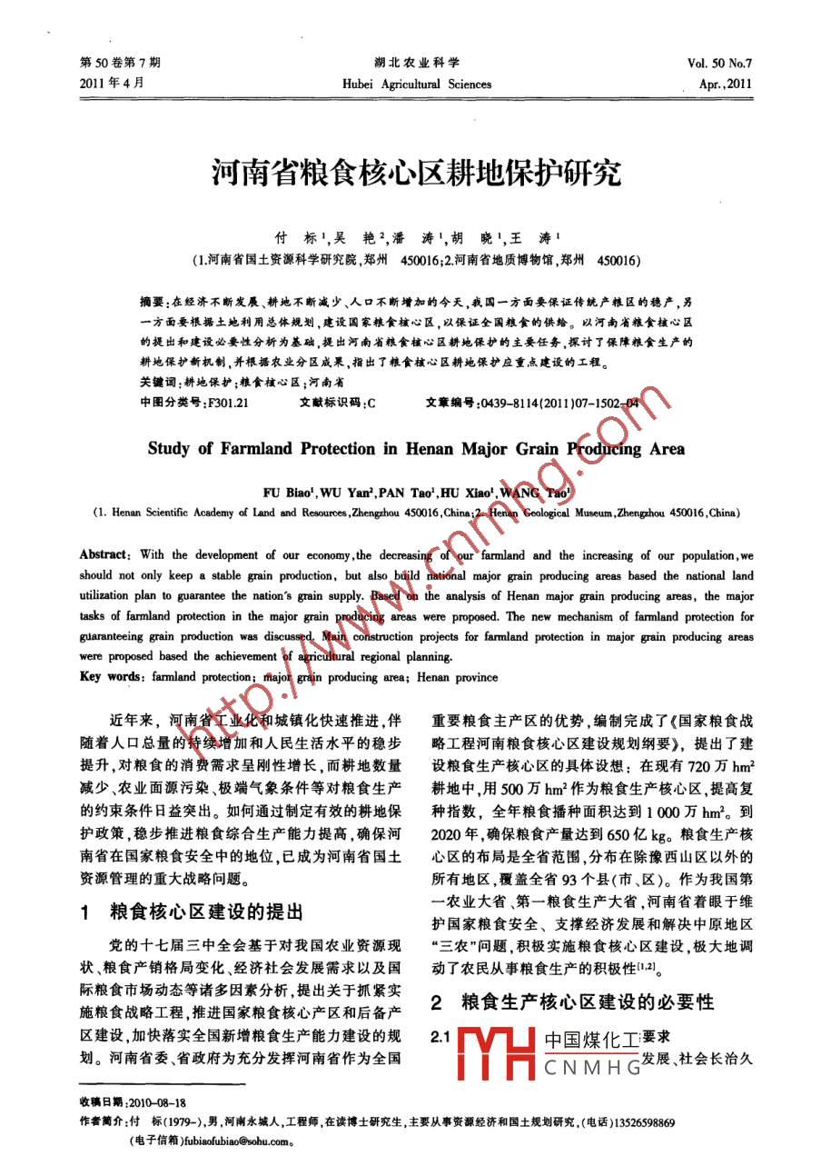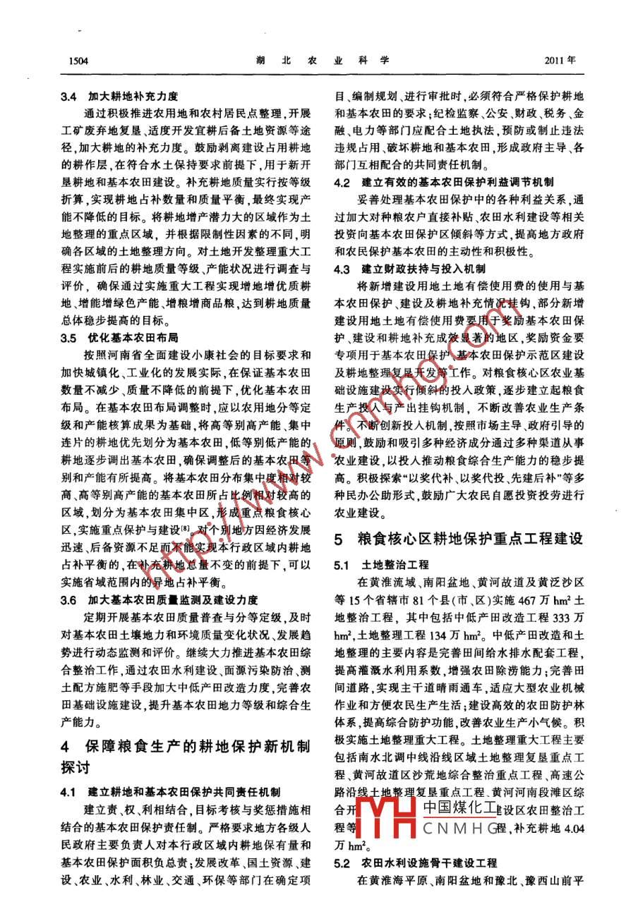 第50卷第7期湖北農(nóng)業(yè)科學(xué)Vol. 50 No.72011年4月Hubei Agricultural SciencesApr. ,2011河南省糧食核心區(qū)耕地保護研究付標(biāo)1,吳艷,潘濤',胡曉|,王濤(1.河南省國土資源科學(xué)研究院,鄭州450016;2.河南省 地質(zhì)博物館,鄭州450016)摘要:在經(jīng)濟不斷發(fā)展、耕地不斷減少、人口不斷增加的今天,我國一方面要保證傳統(tǒng)產(chǎn)糧區(qū)的穩(wěn)產(chǎn),另一方面要根據(jù)土地利用總體規(guī)劃,建設(shè)國家糧食核心區(qū),以保證全國糧食的供給。以河南省糧食核心區(qū)的提出和建設(shè)必要性分析為基礎(chǔ),提出河南省糧食核心區(qū)耕地保護的主要任務(wù),探討了保障糧食生產(chǎn)的耕地保護新機制,并根據(jù)農(nóng)業(yè)分區(qū)成果,指出了糧食核心區(qū)耕地保護應(yīng)重點建設(shè)的工程。關(guān)鍵詞;耕地保護;糠食核心區(qū);河南省中圖分類號:F301.21文獻標(biāo)識碼:C文章編號:0439. -8114(2011)07- -1502-04Study of Farmland Protection in Henan Major Grain Producing Area(1. Henan Scientific Academry of Land and Resources ,Zhengzhou 450016,China;2. Henan Goological Museum,Zhengzhou 450016,China)Abstract: With the development of our economy ,the decreasing of our farmland and the increasing of our population,weshould not only keep a stable grain production, but also build national major grain producing areas based the national landutilization plan to guarantee the nation's grain supply. Based on the analysis of Henan major grain producing areas, the majortasks of farmland protection in the major grain producing areas were proposed. The new mechanism of farmland protection forguaranteeing grain production was discussed. Main construction projects for farmland protection in major grain producing areaswere proposed based the achievement of agricultural regional planning.Key words: farmland protection; major grain producing area; Henan province近年來,河南省工業(yè)化和城鎮(zhèn)化快速推進,伴重要 糧食主產(chǎn)區(qū)的優(yōu)勢,編制完成了《國家糧食戰(zhàn).隨著人口總量的持續(xù)增加和人民生活水平的穩(wěn)步略工程河南糧食核心區(qū)建設(shè)規(guī)劃綱要》,提出了建提升,對糧食的消費需求呈剛性增長,而耕地數(shù)量設(shè)糧食生產(chǎn)核心區(qū)的具體設(shè)想:在現(xiàn)有720萬hm2減少、農(nóng)業(yè)面源污染、極端氣象條件等對糧食生產(chǎn)耕地中,用500萬hm2作為糧食生產(chǎn)核心區(qū),提高復(fù)的約束條件日益突出。如何通過制定有效的耕地保種指數(shù),全年糧食播種面積達到1000萬hm2。到護政策,穩(wěn)步推進糧食綜合生產(chǎn)能力提高,確保河2020年,確保糧食產(chǎn)量達到650億kg。糧食生產(chǎn)核南省在國家糧食安全中的地位,已成為河南省國土心區(qū)的布局是全省范圍,分布在除豫西山區(qū)以外的資源管理的重大戰(zhàn)略問題。所有地區(qū),覆蓋全省93個縣(市、區(qū))。作為我國第-農(nóng)業(yè)大省第一糧食生產(chǎn)大省,河南省著眼于維1糧食核心區(qū)建設(shè)的提出護國家糧食安全、支撐經(jīng)濟發(fā)展和解決中原地區(qū)黨的十七屆三中全會基于對我國農(nóng)業(yè)資源現(xiàn)“三農(nóng)"問題,積極實施糧食核心區(qū)建設(shè),極大地調(diào)狀、糧食產(chǎn)銷格局變化、經(jīng)濟社會發(fā)展需求以及國動了農(nóng)民從事糧食生產(chǎn)的積極性1.2]。際糧食市場動態(tài)等諸多因素分析,提出關(guān)于抓緊實2糧食生產(chǎn)核心區(qū)建設(shè)的必要性施糧食戰(zhàn)略工程,推進國家糧食核心產(chǎn)區(qū)和后備產(chǎn)區(qū)建設(shè),加快落實全國新增糧食生產(chǎn)能力建設(shè)的規(guī)2.中國煤化工要求劃。河南省委、省政府為充分發(fā)揮河南省作為全國發(fā)展、社會長治久MYHCNMHG收稿日期:2010-08-18作者簡介:付標(biāo)(1979-),男 ,河南永城人,工程師,在讀博士研究生.主要從事資源經(jīng)濟和國土規(guī)劃研究,(電話)13526598869(電子信箱)ubiafubiao@ohu.co第7期付標(biāo)等:河南省糧食核心區(qū)耕地保護研究1503安的基礎(chǔ)。河南省是全國重要的農(nóng)業(yè)大省和糧食主和提高糧食綜合生產(chǎn)能力,實現(xiàn)由一般化抓糧食生產(chǎn)區(qū),經(jīng)過長期的建設(shè),全省農(nóng)業(yè)的基礎(chǔ)條件得到產(chǎn)向重點抓糧食核心區(qū)和優(yōu)勢區(qū)轉(zhuǎn)變,把保護耕了很大改善。2006 -2009年連續(xù)4年糧食產(chǎn)量超過地、培肥地力、依靠科技、提高單產(chǎn)作為保護和提高500億kg。農(nóng)業(yè)的發(fā)展、土地資源的保護和高效利糧食綜合生產(chǎn)能力的重點。發(fā)展連片種植,不斷提用,使河南省用占全國1.74%的國土面積,養(yǎng)育了占高核心區(qū)內(nèi)基本農(nóng)田的糧食產(chǎn)出、農(nóng)業(yè)基礎(chǔ)設(shè)施的全國7.47%的人口;用占全國6.49%的耕地,生產(chǎn)了抗災(zāi)減災(zāi)、糧食生產(chǎn)的科技進步、商品糧的保障供占全國9.47%的糧食。除滿足自身生存發(fā)展用糧外,給、優(yōu)質(zhì)專用糧食的市場競爭.糧食加工轉(zhuǎn)化的增河南省常年糧食及制成品的調(diào)出量都在150億kg值和糧食生產(chǎn)的可持續(xù)發(fā)展等能力,最終實現(xiàn)核心以上,為國家的糧食安全做出了不可替代的貢獻。區(qū)內(nèi)農(nóng)業(yè)綜合生產(chǎn)能力的提高,從而提升河南省農(nóng)因此,加強河南省糧食核心區(qū)耕地保護,加快河南