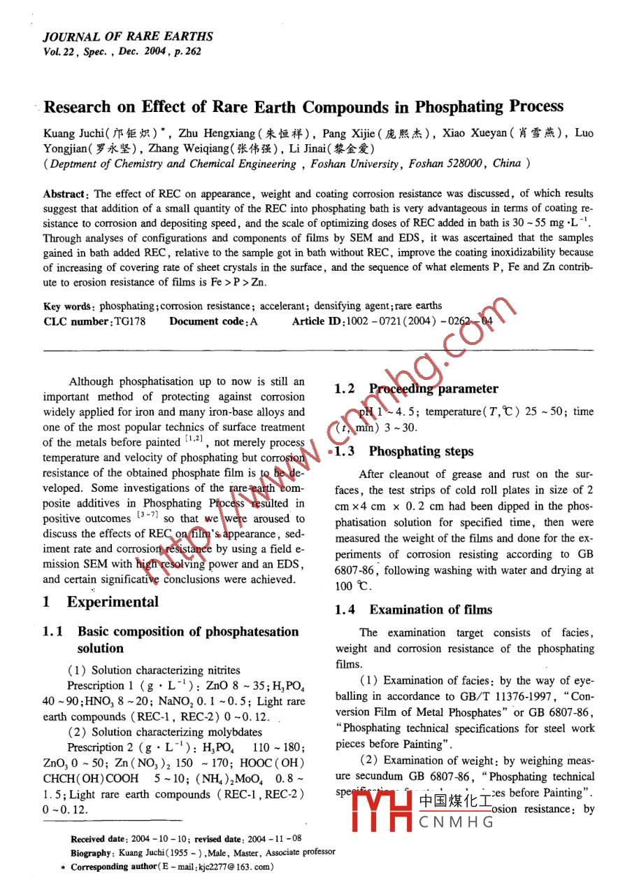 JOURNAL OF RARE EARTHSVol.22, Spec. , Dec. 2004, p.262.Research on Effect of Rare Earth Compounds in Phosphating ProcessKuang Juchi(鄺鉅熾)*,Zhu Hengxiang(朱恒祥),Pang Xijie(龐熙杰), Xiao Xueyan( 肖雪燕), LuoYongjian(羅永堅(jiān)), Zhang Weiqiang(張偉強(qiáng)),Li Jinai(黎金愛(ài))( Deptment of Chemistry and Chemical Engineering,F(xiàn)oshan Universirty, Foshan 528000, China )Abstract: The effect of REC on appearance,weight and coating corrosion resistance was discussed, of which resultssuggest that addition of a small quantity of the REC into phosphating bath is very advantageous in terms of coating re-sistance to corrosion and depositing speed, and the scale of optimizing doses of REC added in bath is 30 ~55 mg L~ '.Through analyses of configurations and components of films by SEM and EDS, it was ascertained that the samplesgained in bath added REC, relative to the sample got in bath without REC, improve the coating inoxidizability becauseof increasing of covering rate of sheet crystals in the surface, and the sequence of what elements P, Fe and Zn contib-ute to erosion resistance of films is Fe>P>Zn.Key words: phosphating ;corrosion resistance; accelerant; densifying agent;rare earthsCLC number :TG178Document code:AArticle ID :1002 - 0721 (2004) -0262 -04.Although phosphatisation up to now is still an1.2Proceeding parameterimportant method of protecting against corrosionwidely applied for iron and many iron-base alloys andpH 1 ~4. 5; temperature(T,C) 25 ~ 50; timeone of the most popular technics of surface treatment(t, min) 3~30.of the metals before painted (1.2not merely process1.3 Phosphating stepstemperature and velocity of phosphating but corrosionresistance of the obtained phosphate film is to be de-After cleanout of grease and rust on the sur-veloped. Some investigations of the rare-earth com-faces, the test strips of cold roll plates in size of 2posite additives in Phosphating Process resulted incmx4 cm x 0.2 cm had been dipped in the phos-positive outcomes 13-71 so that we were aroused tophatisation solution for specified time, then werediscuss the effects of REC on film's appearance, sed-measured the weight of the films and done for the ex-iment rate and corrosion resistance by using a field e-periments of corrosion resisting according to GBmission SEM with high resolving power and an EDS ,6807 -86,following washing with water and drying atand certain significative conclusions were achieved.100 C.1 Experimental1.4 Examination of films1.1 Basic composition of phosphatesationThe examination target consists of facies,solutionweight and corrosion resistance of the phosphatingfilms.(1) Solution characterizing nitritesPrescription1 (g●LI): ZnO 8 ~ 35;H,PO,,(1) Examination of facies: by the way of eye-40 ~ 90;HNO38~20; NaNO2 0.1 ~0.5; Light rareballing in accordance to GB/T 11376-1997,“Con-earth compounds (REC-1, REC-2) 0 ~0.12.version Film of Metal Phosphates" or GB 6807-86,“Phosphating technical specifications for steel work(2) Solution characterizing molybdatesPrescription2 (g. L"'): HyPO. 110 ~ 180;pieces before Painting”.ZnO,0 ~ 50; Zn(NO3)2 150 ~ 170; HOOC( 0H)(2) Examination of weight: by weighing meas-CHCH(OH)COOH 5~ 10; (NH4)2MoO4 0.8 ~Ire secundum GB 6807 -86,“Phosphating technical1.5; Light rare earth compounds ( REC-1 , REC-2 )中國(guó)煤化工es before Painting”.0~0.12._osion resistance: byTYHCNMHGReceived date; 2004 - 10- 10; rerised date: 2004-11 -08Biography: Kuang Juchi( 1955 - ) ,Male , Master,Associate professor* Corresponding author(E - mail:kjc2277@ 163. com)KuangJ Cetal. Research on Effeet of Rares Earth Compounds in Phosphating Process263dropping solution of copper sulfates according to GB6807- 86,“ Phosphatingtechnical specifications forsteel workpieces before Painting”.1.5 Parsing of configurations and2ABcomponents of filmsZn(1) The extermal configurations of the films口3-C__18.2____ 31.93__ 49.872A818.43 34. 7346. 84were observed and parsed with JSM- -6330 scanningelectron microscope ( SEM) made by JEOL ( Ja-Fig. 1 Changes of various elements in flm versus RECpan).3-C: without REC;2AB;with mix of RECs(2) The components of the flms were analyzed(REC-1: REC-2=1:3)with OXFORD Incar energy dispersive spectrometer(EDS) made by 0XFORD (U. K).102 Results and Discussion2.1 Effect of REC on phosphating2.1. 1 Varieties of appearance and components of0 3.97 8.07 15.9 23.7 31.5 41.4 51.3 61.2coatings Addition of RECs induces evident varie-Conentraion ofREC (mg:L")ties of the phosphatisation coatings not only in facie-Fig.2 Change of film weights versus RECs contentsses but in components of RECs.( condition:pH=2.5, T=40 C, 15 min)(1 )Change of aspects It has been found in theexperiments that conversion of the bulky asymmetryphosphate coating, for example, in the condition ofcrystals on the plans gained in the solution withoutlower temperature T( T≤30C) and 5 min operationRECs into the even, close deep-color hopeites pro-time, a full even coating not to be able gained in theduced in the solution with RECs can take place repure nitrite-phosphate bath can be smoothly producedposefully, which affects the micro-aspect of nitrite-by adding the RECs to the bath ( Table 1).phosphate solution more greatly than that of molyb-More information about it shown in Fig. 2 re-date- phosphate solution( Table 1).veals clearly that the films grow fast till the adding a-Table 1 Change of flm faces versus REC contentsmount of the RECs reaches4 mg●L 1 , and then doSolutionthey somewhat slowly up to 30~55 mg .L- of theREC-2/(mg.[")characterizingRECs concentration accompanying in the meanwhileitritesmolybdatesformation of the closest films, after this, do theyFail to film fullyAsymmetry lightmore tardily not to change almost the coating weightsblue flmversus increase of the RECs amount instead of symp-Even light grey flm Even rainbow flmtom of film's faces going bad inchmeal, which is32Even and close grey Even and closefilmrainbow flmcharacteriz