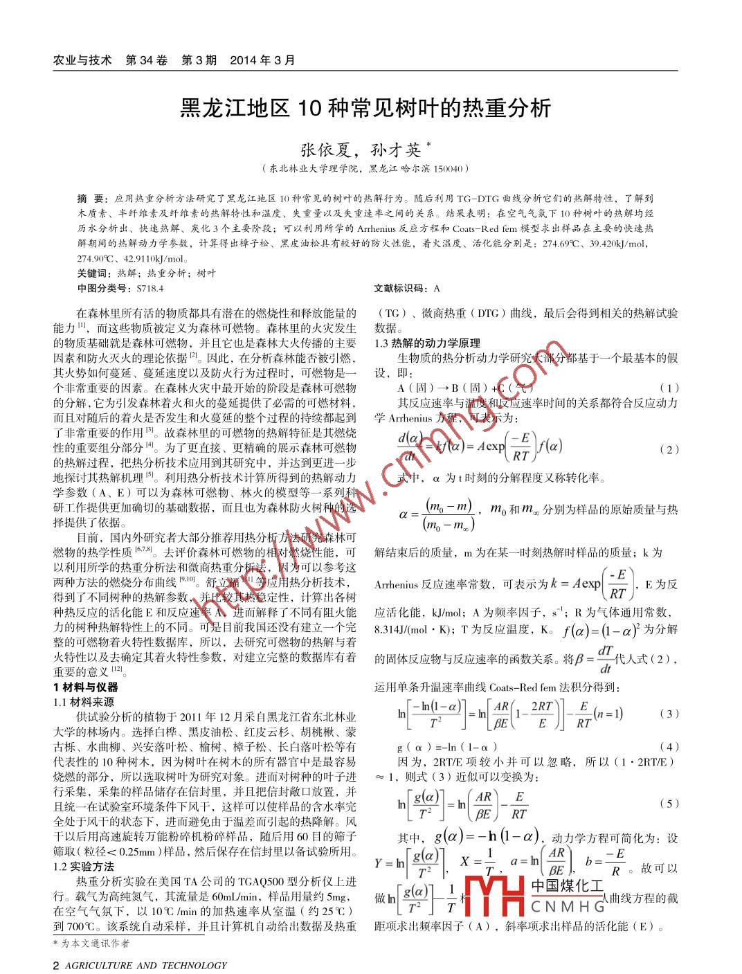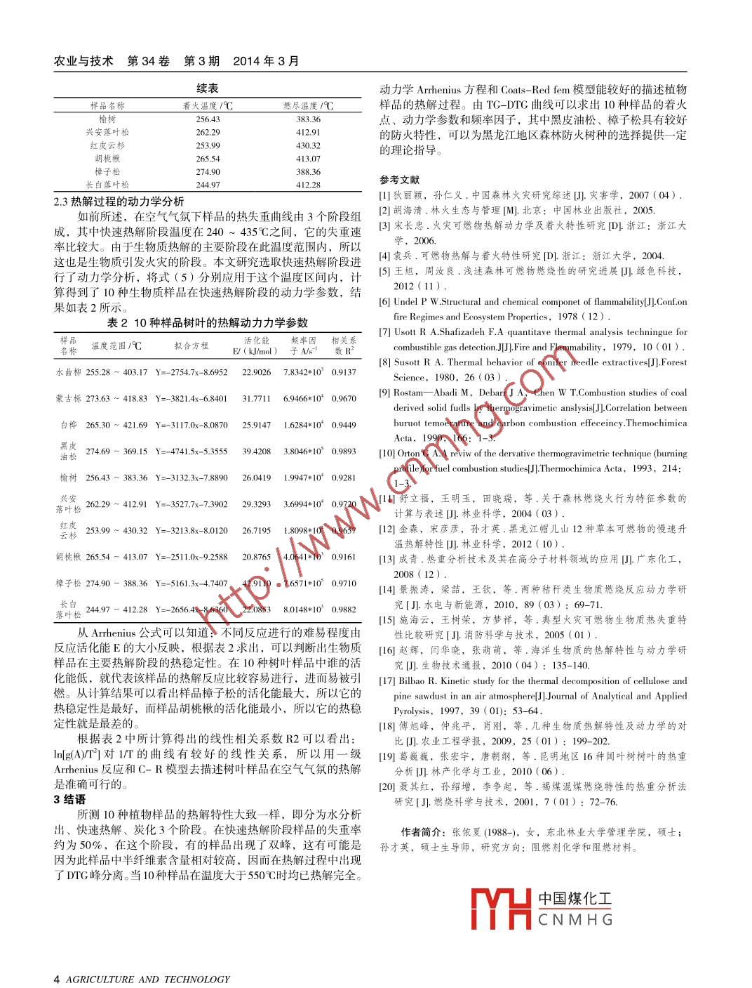 農(nóng)業(yè)與技術(shù)第34卷第3期2014年3月黑龍江地區(qū)10種常見樹葉的熱重分析張依夏,孫才英(東北林業(yè)大學(xué)理學(xué)院,黑龍江哈爾濱150040)摘要:應(yīng)用熱重分析方法研究了黑龍江地區(qū)1θ種常見的樹葉的熱解行為。隨后利用TG;-DIG曲線分析它們的熱解特性,了解到木質(zhì)素、半纖維素及纖維素的熱解特性和溫度、失重量以及失重速率之間的關(guān)系。結(jié)果表明:在空氣氣氛下10種樹葉的熱解均經(jīng)歷水分析出、快速熱解、炭化3個(gè)主要階段;可以利用所學(xué)的 Arrhenius反應(yīng)方程和 Coats- Red fen模型求出樣品在主要的快速熱解期間的熱解動(dòng)力學(xué)參教,計(jì)算得出樟子松、黑皮油松具有較好的防火性能,著火溫度、活化能分別是:274-69℃、3.42kJ/mol,27490℃、429110kJ/mol關(guān)鍵詞:熱解;熱重分析;樹葉中圖分類號(hào):S718.4文獻(xiàn)標(biāo)識(shí)碼:A在森林里所有活的物質(zhì)都具有潛在的燃燒性和釋放能量的(TG)、微商熱重(DTG)曲線,最后會(huì)得到相關(guān)的熱解試驗(yàn)?zāi)芰?而這些物質(zhì)被定義為森林可燃物。森林里的火災(zāi)發(fā)生數(shù)據(jù)。的物質(zhì)基礎(chǔ)就是森林可燃物,并且它也是森林大火傳播的主要1.3熱解的動(dòng)力學(xué)原理因素和防火滅火的理論依據(jù)。因此,在分析森林能否被引燃生物質(zhì)的熱分析動(dòng)力學(xué)研究大部分都基于一個(gè)最基本的假其火勢如何蔓延、蔓延速度以及防火行為過程時(shí),可燃物是一設(shè),即非常重要的因素。在森林火災(zāi)中最開始的階段是森林可燃物A(固)→B(固)+C(氣分解,它為引發(fā)森林著火和火的蔓延提供了必需的可燃材料其反應(yīng)速率與溫度和反應(yīng)速率時(shí)間的關(guān)系都符合反應(yīng)動(dòng)力而且對(duì)隨后的著火是否發(fā)生和火蔓延的整個(gè)過程的持續(xù)都起到學(xué) Arrhenius方程,可表示為了非常重要的作用。故森林里的可燃物的熱解特征是其燃燒性的重要組分部分。為了更直接、更精確的展示森林可燃物kf(a)=Aexp n f(a)(2)的熱解過程,把熱分析技術(shù)應(yīng)用到其研究中,并達(dá)到更進(jìn)一步地探討其熱解機(jī)理的。利用熱分析技術(shù)計(jì)算所得到的熱解動(dòng)力式中,α為t時(shí)刻的分解程度又稱轉(zhuǎn)化率。學(xué)參數(shù)(A、E)可以為森林可燃物、林火的模型等一系列科研工作提供更加確切的基礎(chǔ)數(shù)據(jù),而且也為森林防火樹種的選擇提供了依據(jù)。二m,m和m分別為樣品的原始質(zhì)量與熱目前,國內(nèi)外研究者大部分推薦用熱分析方法研究森林燃物的熱學(xué)性質(zhì)6。去評(píng)價(jià)森林可燃物的相對(duì)燃燒性能,可解結(jié)束后的質(zhì)量,m為在某一時(shí)刻熱解時(shí)樣品的質(zhì)量;k為以利用所學(xué)的熱重分析法和微商熱重分析法,因?yàn)榭梢詤⒖歼@兩種方法的燃燒分布曲線。舒立福等應(yīng)用熱分析技術(shù)Arrhenius)應(yīng)速率常數(shù),可表示為k=Aeyp/得到了不同樹種的熱解參數(shù),并比較其熱穩(wěn)定性,計(jì)算出各樹B7E為反種熱反應(yīng)的活化能E和反應(yīng)速率A,進(jìn)而解釋了不同有阻火能應(yīng)活化能,k/mol;A為頻率因子,s;R為氣體通用常數(shù),力的樹種熱解特性上的不同??墒悄壳拔覈€沒有建立一個(gè)完8314/md1·k);T為反應(yīng)溫度,k。f(a)=(1-a)2為分解整的可燃物著火特性數(shù)據(jù)庫,所以,去研究可燃物的熱解與著火特性以及去確定其著火特性參數(shù),對(duì)建立完整的數(shù)據(jù)庫有著的固體反應(yīng)物與反應(yīng)速率的函數(shù)關(guān)系。將B=,代人式(2),重要的意義11材料與儀器運(yùn)用單條升溫速率曲線 Coats- Red fem法積分得到1.1材料來源hnaRT供試驗(yàn)分析的植物于2011年12月采自黑龍江省東北林業(yè)E)(3)E大學(xué)的林場內(nèi)。選擇白樺、黑皮油松、紅皮云杉、胡桃楸、蒙古櫟、水曲柳、興安落葉松、榆樹、樟子松、長白落葉松等有g(shù)(a)=-ln(1-a)代表性的10種樹木,因?yàn)闃淙~在樹木的所有器官中是最容易因?yàn)?2RTE項(xiàng)較小并可以忽略,所以(1·2RT/E)燒燃的部分,所以選取樹葉為研究對(duì)象。進(jìn)而對(duì)樹種的葉子進(jìn)≈1,則式(3)近似可以變換為:采集,采集的樣品儲(chǔ)存在信封里,并且把信封敞口放置,并AR E且統(tǒng)一在試驗(yàn)室環(huán)境條件下風(fēng)干,這樣可以使樣品的含水率(5)全處于風(fēng)干的狀態(tài)下,進(jìn)而避免由于溫差而引起的熱降解。風(fēng)T干以后用髙速旋轉(zhuǎn)萬能粉碎機(jī)粉碎樣品,隨后用60目的篩子其中,g(a)=-h(1-a),動(dòng)力學(xué)方程可簡化為:設(shè)篩取(粒徑<0.25mm)樣品,然后保存在信封里以備試驗(yàn)所用g(a) xE1.2實(shí)驗(yàn)方法R。故可以熱重分析實(shí)驗(yàn)在美國TA公司的TGAQ500型分析儀上進(jìn)載氣為高純氮?dú)?其流量是6mm,樣品用量約5m,做面ga在空氣氣氛下,以10℃/min的加熱速率從室溫(約25℃)學(xué)YH中國煤化工CNMH曲線方程的截到π00℃。該系統(tǒng)自動(dòng)采樣,并且計(jì)算機(jī)自動(dòng)給出數(shù)據(jù)及熱重距項(xiàng)求出頻率因子(A),斜率項(xiàng)求出樣品的活化能(E)。*為本文通訊作者2 AGRICULTURE AND TECHNOLOGY黑龍江地區(qū)10種常見樹葉的熱重分析張依夏,孫才英2結(jié)果與分析在不同樹種的樹葉中,纖維素、半纖維素