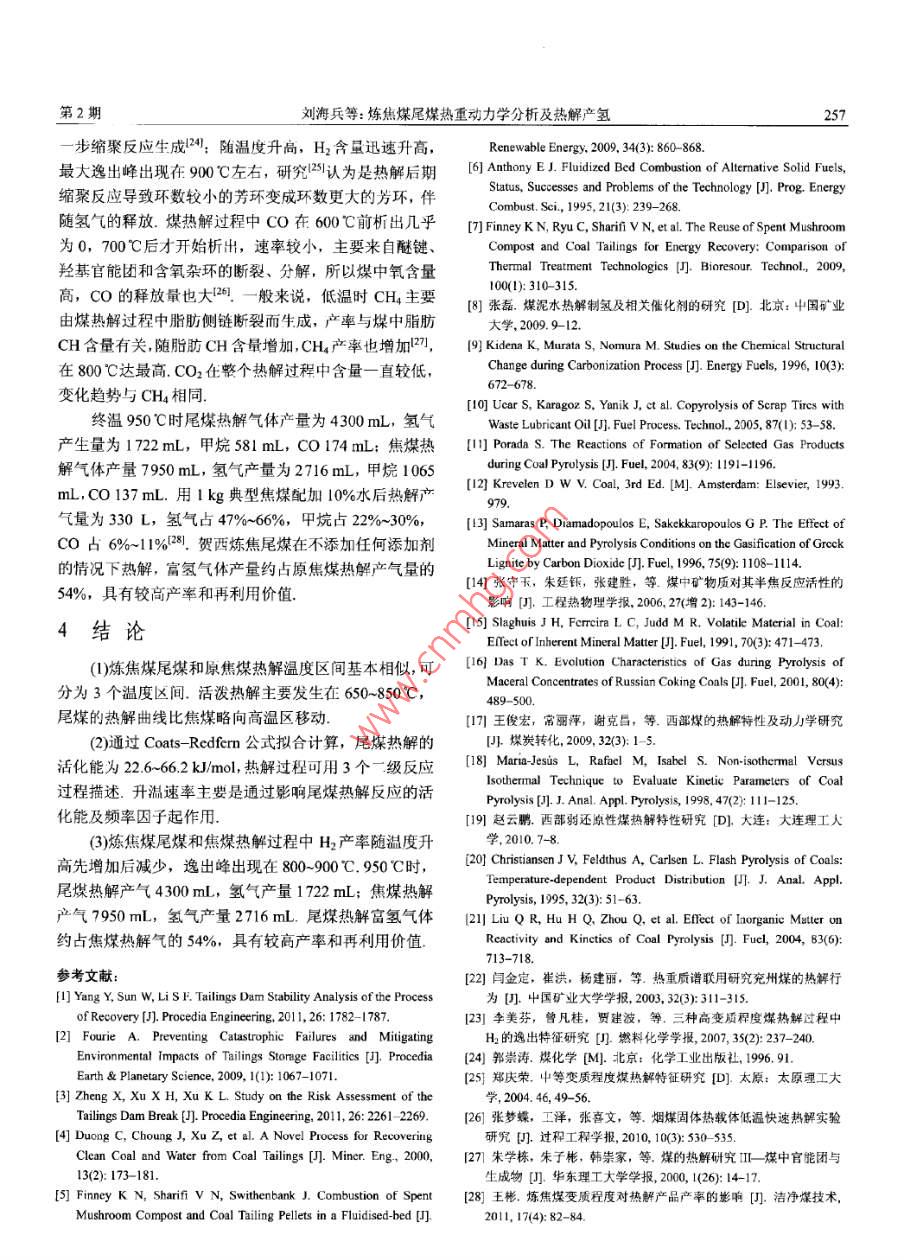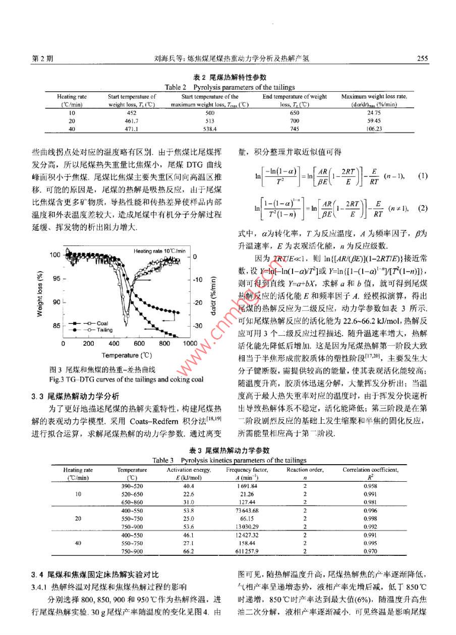 第12卷第2期過(guò)程工程學(xué)報(bào)Vol.12 No.22012年4月The Chinese Joumal of Process EngineeringApe 2012煉焦煤尾煤熱重動(dòng)力學(xué)分析及熱解產(chǎn)氫劉海兵,郭戰(zhàn)英, 惠賀龍, 付興民,柳樹(shù)成,李成,舒新前[中國(guó)礦業(yè)人學(xué)(北京)化學(xué)與環(huán)境工程學(xué)院,北京000830]摘要:基于熱重分析和固定床熱解實(shí)驗(yàn),研究了升溫速率和溫度對(duì)商礦物質(zhì)含量的煉焦煤尾煤熱解特性的影響.尾煤熱解過(guò)程可分為室溫至400, 400-600及600~950C三個(gè)階段.尾煤與焦煤熱解曲線基本吻合,尾煤熱解特征溫度略向高溫區(qū)推移、采用Coats- Redfemn積分法擬合計(jì)算了尾煤熱解的動(dòng)力學(xué)參數(shù),得出反應(yīng)活化能為2.6-66.2 k/mol.熱解過(guò)程可用3個(gè)二級(jí)反應(yīng)描述30g尾煤固定床實(shí)驗(yàn)結(jié)果表明,氫氣在低于400C析出很少,400-600C緩慢析出,之后隨溫度升高析出增加,600后大量析出,900C左右達(dá)到最大析出量.終溫950C時(shí), 30 g尾煤熱解產(chǎn)氣4300 mL,氫氣產(chǎn)量1722 mL;焦煤產(chǎn)氣7950 mL,氫氣產(chǎn)量2716 mL.居煤熱解富氫氣體產(chǎn)量達(dá)焦煤熱解氣產(chǎn)量的54%,具有較高的再利用價(jià)值.關(guān)鍵詞:煉焦煤尾煤:焦煤;熱解;動(dòng)力學(xué):氫氣析出中圖分類(lèi)號(hào): X705文獻(xiàn)標(biāo)識(shí)碼: A文章編號(hào): 1009 606X(2012)02 -0253 061前言認(rèn)為在煤熱解轉(zhuǎn)化過(guò)程中煤中無(wú)機(jī)礦物質(zhì)和有機(jī)物質(zhì)煤炭約占我國(guó)一-次能源消費(fèi)的70%,隨著煤炭工業(yè)轉(zhuǎn)化存在一定聯(lián)系.國(guó)內(nèi)外一些研究4.15)認(rèn)為煤中礦的迅速發(fā)展,煤炭洗選廢棄物處理已成為制約選煤工業(yè)物質(zhì)對(duì)熱解過(guò)程有抑制作用,且隨石物質(zhì)增加而增加.國(guó)內(nèi)尚未見(jiàn)對(duì)煉焦煤尾煤熱解的研究報(bào)道,木工作可持續(xù)性發(fā)展的重大課題。月前平均原煤入洗率已達(dá)結(jié)合熱天平實(shí)驗(yàn)和固定床管式爐熱解實(shí)驗(yàn)裝置,考察了50.9%,尾煤產(chǎn)生量約占入洗原煤量的2.5%~3%.如按山西汾西焦煤集團(tuán)尾煤熱解的動(dòng)力學(xué)和熱解過(guò)程,并與2010年煤炭開(kāi)采量32.4 億噸計(jì)算,目前每年產(chǎn)生尾煤原焦煤熱解過(guò)程及產(chǎn)率進(jìn)行了比較,探討了高灰煉焦煤為4000~4800萬(wàn)噸.按49%灰分折算,折合標(biāo)煤近1800尾煤的熱解特性和產(chǎn)氫規(guī)律,為下-步高灰尾煤熱化學(xué)萬(wàn)噸.尾煤的存放與閑置不僅對(duì)環(huán)境造成破壞、帶來(lái)安轉(zhuǎn)化制備富氫氣體和尾煤資源化利用提供理論基礎(chǔ).全隱患,也是對(duì)尾煤中有價(jià)資源的浪費(fèi)-4.焦煤尾煤具有高灰、顆粒細(xì)、具有粘結(jié)性的特點(diǎn),其熱解特性是燃2實(shí)驗(yàn)燒設(shè)備設(shè)計(jì)和可靠運(yùn)行的重要影響因素,常規(guī)處理方法2.1實(shí)驗(yàn)原料是摻到煤中燃燒[5-7],產(chǎn)生二次污染,對(duì)尾煤的形態(tài)、實(shí)驗(yàn)原料采用山西焦煤集團(tuán)汾西礦業(yè)公司賀西煤輸送、燃燒裝置等技術(shù)要求較高. Finney等!"對(duì)尾煤進(jìn)行礦主焦煤和洗選后尾煤,原料粒徑為150 μm,自然干了熱處理比較,發(fā)現(xiàn)熱解可得到低熱值產(chǎn)品,氣化實(shí)驗(yàn)燥后備用.尾煤和焦煤的工業(yè)分析與元素分析見(jiàn)表1,結(jié)果不理想可見(jiàn)焦煤尾煤具有高灰、低硫、低HC和低熱值的特點(diǎn),- -般認(rèn)為,氫氣小僅是化學(xué)工業(yè)的基礎(chǔ)原料,也是原焦煤具有低灰、低硫及高熱值特點(diǎn).尾煤比焦煤灰分一種清潔燃料.相對(duì)于常規(guī)制氫技術(shù)的高成本,可探索高,揮發(fā)分較低.采用非傳統(tǒng)的廢棄物熱解技術(shù)制備氫氣(8-10),制備合成2.2實(shí)驗(yàn)儀器氣原料或潔凈燃料。Porall對(duì)熱解H2的生成速率曲線熱重分析實(shí)驗(yàn)采用Thermo Plus EVO TG-DTA型熱進(jìn)行分峰擬合發(fā)現(xiàn),H2的生成是5個(gè)基元反應(yīng)的結(jié)果,重分析儀(日本理學(xué)公司);熱解實(shí)驗(yàn)裝置采用SK2-2-12低溫時(shí)H2主要來(lái)自氫化芳香結(jié)構(gòu)脫氫,而芳香結(jié)構(gòu)縮型電加熱固定床管式爐(天津中環(huán)實(shí)驗(yàn)電爐有限公司),:聚脫氫是高溫時(shí)H2的主要來(lái)源. Krevelen!2認(rèn)為煤熱解由一根直徑30 mm、長(zhǎng)1200 mm的石英管和一個(gè)帶程中H2在低加熱速率下生成溫度范圍較寬,主要是因?yàn)樾驕乜貎x的電加熱裝置及一個(gè)D07-1IC型累積積分質(zhì)大量重疊的一階反應(yīng)結(jié)合導(dǎo)致.熱解初期產(chǎn)品中氫氣形量流量計(jì)(北京七星華創(chuàng)電子股份有限公司)組成;熱解成是由脂環(huán)族脫氫形成,在高溫階段,熱解產(chǎn)品中氫來(lái)氣采用GC-2014C型氣相色譜儀(H本島津公司)分析,源于縮聚反應(yīng)和其他反應(yīng)中的脫氫環(huán)化. Samaras 等四原料的工業(yè)分析采用XL-1型箱式電阻爐(天津中環(huán)實(shí)驗(yàn)收稿日期: 2012-03- 07,修回日期: 2012-04-05基金項(xiàng)目:國(guó)家自然科學(xué)基金資助項(xiàng)日(編號(hào): 90610014; 51108453)作者簡(jiǎn)介:劉海兵(1975-).男,內(nèi)蒙古包頭市人,博上研究生,環(huán)境工程專(zhuān)業(yè),E-mail: Ihblr@126. com:舒新前,通訊聯(lián)系人,F(xiàn).mail: shuxinqin@e 126. com.2