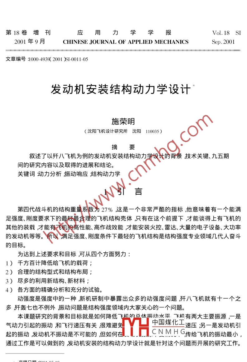 第18卷增刊應(yīng)用力學(xué)學(xué)報(bào)Vol 1 8 SI2001年9月CHINESE JOURNAL OF APPLIED MECHANICSSep.2001文章編號:000-49392001X001105發(fā)動機(jī)安裝結(jié)構(gòu)動力學(xué)設(shè)計(jì)施榮明(沈陽飛機(jī)設(shè)計(jì)研究所沈陽110035)摘要敘述了以殲八飛機(jī)為例的發(fā)動機(jī)安裝結(jié)構(gòu)動力學(xué)設(shè)計(jì)的背景技術(shù)關(guān)鍵、九五期間的研究內(nèi)容以及取得的進(jìn)展和結(jié)論。關(guān)鍵詞動力分析振動響應(yīng)結(jié)構(gòu)動力學(xué)第四代戰(zhàn)斗機(jī)的結(jié)構(gòu)重量系數(shù)為27%這是一個非常嚴(yán)酷的指標(biāo)他意味著有一個能滿足強(qiáng)度、剛度要求下的最輕最合理的飛機(jī)結(jié)構(gòu)殼體只有在這個前提下才能談得上有飛機(jī)的其他的裝載才能有飛機(jī)的高性能、高作戰(zhàn)效能才能安裝火控、雷達(dá)、大量的電子設(shè)備、大功率的發(fā)動機(jī)等等。所以滿足強(qiáng)度、剛度條件下最輕的飛機(jī)結(jié)構(gòu)是結(jié)構(gòu)強(qiáng)度專業(yè)領(lǐng)域幾代人奮斗的目標(biāo)為達(dá)到上述要求和目標(biāo)可從四個方面努力1)千方百計(jì)降低給飛機(jī)的載荷2)合理的結(jié)構(gòu)型式和結(jié)構(gòu)布局3)盡多的利用新結(jié)構(gòu)、新材料4)各方面的精確分析和充分的試驗(yàn)。動強(qiáng)度是強(qiáng)度中的一種新機(jī)研制中暴露出眾多的動強(qiáng)度問題殲八飛機(jī)就有十一個之多殲轟七也不例外振動問題是結(jié)構(gòu)強(qiáng)度領(lǐng)域內(nèi)大家關(guān)心的一個問題。本課題研究的背景和目標(biāo)就是如何降低飛相的總休振動水亞K相有兩大主要振源,是氣動力引起的振動和飛行速壓有關(guān)很難避免中國煤化工上速壓另一是發(fā)動機(jī)引起的振動發(fā)動機(jī)不振動是不可能的但如何在CNMHG傳給飛機(jī)的振動最小通過工作是可以做到的發(fā)動機(jī)安裝的結(jié)構(gòu)動力學(xué)設(shè)計(jì)就是針對這個問題而開展的研究工作。*來稿旦邦3作者1男1940年生博導(dǎo)研究員12應(yīng)用力學(xué)學(xué)報(bào)2技術(shù)關(guān)鍵如何在發(fā)動機(jī)振動不變的前提下,使其傳給飛機(jī)的振動量最小這就需要通過發(fā)動機(jī)傳給飛機(jī)振動的發(fā)動機(jī)安裝結(jié)構(gòu)的結(jié)構(gòu)動力學(xué)設(shè)計(jì)來解決這個問題。1)發(fā)動機(jī)安裝是一個桿系結(jié)構(gòu)以殲八飛機(jī)為例它有兩臺發(fā)動機(jī)每臺發(fā)動機(jī)在兩個橫截面上共有五根支杄支撐和飛機(jī)結(jié)構(gòu)相連這就是所謂的發(fā)動機(jī)安裝結(jié)構(gòu)”簡稱為發(fā)動機(jī)安裝發(fā)動機(jī)飛機(jī)結(jié)構(gòu)安裝結(jié)構(gòu)一定強(qiáng)度結(jié)構(gòu)動力學(xué)振動響應(yīng)的振動源設(shè)計(jì)工作最小若振動載荷下降客觀存在主觀努力工作達(dá)到預(yù)期目標(biāo)10%則結(jié)構(gòu)動強(qiáng)度的壽命增加782)為達(dá)到上述目標(biāo)要解決4個技術(shù)關(guān)鍵①如何得到發(fā)動機(jī)的振動載荷②如何解決阻尼結(jié)構(gòu)系統(tǒng)的減振優(yōu)化設(shè)計(jì)問題以及如何研制岀能安裝在發(fā)動機(jī)支桿上的減振構(gòu)件。③結(jié)構(gòu)動力學(xué)設(shè)計(jì)的方法和手段的研究④如何在試驗(yàn)室進(jìn)行驗(yàn)證試驗(yàn)試驗(yàn)段設(shè)計(jì)驗(yàn)證試驗(yàn))3研究內(nèi)容為了解決上述四個技術(shù)關(guān)鍵共研究了以下十項(xiàng)工作3.1在試驗(yàn)件的研制和載荷研究方面中國煤化工①GSW1型減振構(gòu)件的設(shè)計(jì)與研制CNMHG通過課題組的努力設(shè)計(jì)并研制岀了能適合在發(fā)動機(jī)支架上安裝阻尼減振構(gòu)件。根據(jù)發(fā)動機(jī)載荷大的特點(diǎn)采用了鋼絲網(wǎng)減振購件。設(shè)計(jì)很巧妙解決了雙向受力和雙向減振的問②阻尼構(gòu)驗(yàn)段的設(shè)計(jì)與研制施榮明發(fā)動機(jī)安裝結(jié)構(gòu)動力學(xué)設(shè)計(jì)13全體參研人員共同努力創(chuàng)造性地設(shè)計(jì)岀與飛杋實(shí)物基本為1∶的模擬試驗(yàn)段。在保證與真實(shí)飛機(jī)的動力特性基本一致的前提下進(jìn)行分析、試驗(yàn)研究③動載荷識別的研究與應(yīng)用要在試驗(yàn)段上施加模擬的動載荷才能看岀堿振前后的對比與效果。而載荷又不能完全靠實(shí)測獲得。因此如何研究動載荷的載荷識別技術(shù)并加以實(shí)際應(yīng)用在本課題中走了一個全過程3.2在阻尼結(jié)構(gòu)試驗(yàn)段的驗(yàn)證試驗(yàn)方面④非線性響應(yīng)分析與試驗(yàn)在粘彈性阻尼減振和隔振設(shè)計(jì)中主要研究了粘彈性阻尼材料的動力學(xué)性能、本構(gòu)關(guān)系的描述方法、試驗(yàn)測試和參數(shù)擬合方法等研究了粘彈性阻尼減振、隔振和配置方案、特性分析方法、非線性響應(yīng)分析與試驗(yàn)以及減振的優(yōu)化設(shè)計(jì)技術(shù)。⑤試驗(yàn)件的模態(tài)分析與一致性評估⑥發(fā)動機(jī)安裝的有限元建模與分析工作為研究發(fā)動機(jī)的減振問題必須把發(fā)動機(jī)及發(fā)動機(jī)安裝進(jìn)行有限元離散化才能進(jìn)行分析和研究而且理論建模和實(shí)際試件的一致性評估與分析也是本課題的重要工作內(nèi)容之一。3.3在全