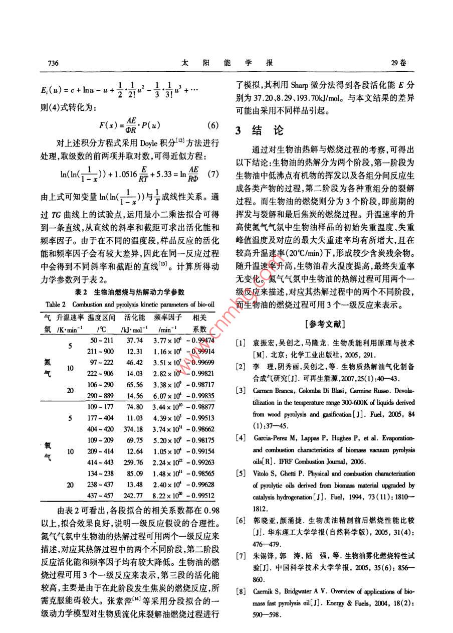 第29卷第6期太陽能學(xué)報Vol 29. No 62008年6月ACTA ENERGLAE SOLARIS SINICAJmn.,206文章編號:0254006073305生物油熱解及燃燒特性分析李理12,陰秀麗,吳創(chuàng)之!,馬隆龍1,周肇秋(1中國科學(xué)院廣州能源研究所中國科學(xué)院可再生能源與天然氣水合物重點實驗室,廣州510640;2中國科學(xué)院研究生院,北京10009)摘要:對由木粉熱解所得的生物油樣品分別進行了氮氣與氧氣氣氛下不同升溫速率的熱重分析試驗。結(jié)果表明:生物油的熱解分為兩個階段第一階段為生物油中低沸點有機物的揮發(fā)以及各組分間反應(yīng)生成各類產(chǎn)物的過程第二階段為各種重組分的裂解過程;生物油的燃燒分為3個階段,即前期的揮發(fā)與裂解和最后焦炭的燃燒過程。提高升溫速率使氮氣氣氛中生物油樣品的初始失重溫度、失重峰值溫度及對應(yīng)的最大失重速率均有所增大且在較高升溫速率(20℃/min)下,較少含炭殘余物形成。隨升溫速率升高生物油著火溫度提高最終失重率無變化。最后根據(jù)熱重數(shù)據(jù)對熱解與燃燒各段反應(yīng)進行了動力學(xué)擬合。關(guān)鍵詞:生物油;熱解;燃燒;動力學(xué)中圖分類號:TK6文獻標(biāo)識碼:A0前言種生物質(zhì)熱解油(軟木與硬木熱解油)分別在空氣氣氛與氮氣氣氛中的熱重反應(yīng)過程。woo和 Ghetti1生物油是生物質(zhì)在中溫(500-600℃)、高加熱進行了生物油在氮氣氣氛中室溫-1000c的熱重試速率(10~10°℃/)和極短氣體滯留時間(約2s)下驗微商熱重曲線上表現(xiàn)出兩個較為明顯的失重速快速熱解所得到的液體產(chǎn)物"。同生物質(zhì)相比生率峰。郭曉亞等在氧氣氣氛中對精制前后的生物油能量密度高便于儲存、運輸,既可以在鍋爐中物油進行了TDA分析,對生物質(zhì)油精制前后的直接燃燒使用,也可用于熱解氣化制備合成氣再合燃燒性能和動力學(xué)進行了分析和比較。成為高品質(zhì)的液體燃料2。本文對木屑生物油分別進行了氧氣與氮氣氣氛為更好地處理生物油燃燒與熱解過程中出現(xiàn)的下的熱重試驗,研究了其燃燒與熱解過程,并考察了問題并為燃燒與熱解反應(yīng)裝置的設(shè)計及優(yōu)化提供升溫速率對熱解與燃燒性能的影響,最后根據(jù)熱重必要數(shù)據(jù)利用熱重技術(shù)了解生物油的燃燒與熱解數(shù)據(jù)對熱解與燃燒各段反應(yīng)進行了動力學(xué)擬合。特性顯得尤為重要。目前,國內(nèi)外已開展了相關(guān)研究工作。 Carmen Branca3利用自改裝的熱重系統(tǒng)研1試驗究了櫸木熱解油在空氣氣氛中的反應(yīng)過程熱重曲11原料線反映了兩個主要的反應(yīng)階段,并采用3個平行的試驗所用生物油由木屑在自熱式生物質(zhì)熱解液級反應(yīng)對油的熱解揮發(fā)過程進行了模擬擬和曲化裝置中熱解得到,裂解溫度550℃,蒸汽停留時線與試驗曲線吻合較好。 Garcia-Perez M“研究了兩間1-2,其主要性質(zhì)如表1所示。表1生物油的物性分析收到基)Table 1 Properties of bio-oil元素分析/%工業(yè)分析/%熱值樣品[c][H][o][N揮發(fā)份固定炭灰含量水分生物油3288529541909102061.1113.210.725.618,91收稿日期:2001-16基金項目:國家自然科學(xué)基金(50576100);廣東省自然科學(xué)基金團隊項目(0045通訊作者:陰秀麗(1968-),女博士、研究員主要研究方向為生物質(zhì)熱化學(xué)轉(zhuǎn)化。功yin@ msgec.ac.am734太陽能學(xué)報12儀器與條件試驗儀器采用德國耐馳公司的STA409綜合熱分析儀,分別在氧氣氣氛與氮氣氣氛下以5、1020℃/mn的升溫速率對生物油從室溫~1000℃進行了熱重分析試驗。氧氣流量30mL/min,氮氣流量40mL/min。試驗樣品質(zhì)量控制在約1020040060080010002結(jié)果與討論TAC21生物油熱重反應(yīng)分析SC生物油在氧氣氣氛與氮氣氣氛下的TG與DSC、DTG曲線(5℃/mn)分別如圖1~圖3所示。T/C圖3生物油氧氣氣氛中的TG、DrG及DSC曲線T/CFig 3 Bio-oil TG, DtG& DSc curves in O或氧氣氣氛對失重影響不明顯,這主要是由于生物圖1生物油氮氣氣氛與氧氣氣氛中的TG曲線油含氧量較高(54%)的緣故。而在400℃以后,由Fig 1 Bio-oil TG curves in 0& n2于生物油在氧氣中發(fā)生燃燒而迅速失重,燃燒曲線偏離熱解曲線。由圖2氮氣氣氛下生物油熱重曲線可以看出,其在氮氣氣氛中的失重過程分為兩個階段,初始階段主要為生物油中低沸點有機物(蟻醛、丙酮、甲醇、乙醇及自由水等)的揮發(fā)及各組分間反應(yīng)生成各種產(chǎn)物(如生物油中的醇類與有機酸發(fā)生酯化反應(yīng)2004006008001000生成易揮發(fā)的酯和水9、一些不穩(wěn)定的二羧酸分解T/C產(chǎn)生的CO2氣體等)的過程。另外,此階段生物油不同成分間還可能反應(yīng)生成一些大分子化合物(如酚與醛水合物反應(yīng)生成分子量在500~500間的酚醛樹脂、各種醛類間反應(yīng)生成的低聚物等)。由于此過程中揮發(fā)組分揮發(fā)吸熱,在DSC曲線上對應(yīng)為一小吸熱峰。由DTG曲線可以看出,失重速率在180℃時達到最大,釋放揮發(fā)性組分約占整個生4006008001000物油的35%。200℃以后,生物油中的重組分(糖T/C類、寡聚酚醛等)開始發(fā)生裂解反應(yīng),此過程失重圖2生物油氮氣氣氛中的TG、DG及DSC曲線主要是由于裂解反應(yīng)釋放氣體所致。由于裂解反應(yīng)Fig 2 Bio-oil TG, DtG& DSC curves in N,吸熱,在DSC曲線上表現(xiàn)為一大的吸熱峰。此過程從圖1可以看出,在400℃以前,生物油在氧氣一直持續(xù)到約