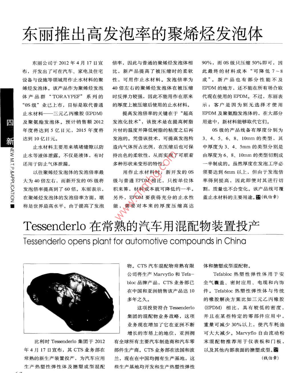 東麗推出高發(fā)泡率的聚烯烴發(fā)泡體東麗公司于2012年4月17日宜倍率,因此與普通的聚烯烴發(fā)泡體相90%, 而0S級(jí)只壓縮50%即可,因布,開發(fā)出了可在汽車、家電及住宅比,新產(chǎn)品提高了被壓縮時(shí)的柔軟此最終 的材料成本“可降低7~8設(shè)備與設(shè)施等領(lǐng)域用作止水材料的聚性,可用作止水材料。發(fā)泡倍率為成”。新產(chǎn)品也有部分性能不及.烯烴發(fā)泡體。該產(chǎn)品作為聚烯烴發(fā)泡40倍左右的聚烯烴發(fā)泡體在被壓縮EPDM的地方,還不能在所有場(chǎng)合取體產(chǎn)品群“TORAYPEF”系列的時(shí)反彈力較強(qiáng),因此不能用作在原來代現(xiàn)在使用的EPDM。不過,東麗表“0S級(jí)”業(yè)已上市,目標(biāo)是取代普通,的厚度上被壓縮后使用的止水材料。示:客戶是因?yàn)閯e無選擇才使用止水材料一三三元乙丙橡膠(EPDM)提高發(fā)泡倍率的關(guān)鍵在于“超高EPDM及聚氨酯發(fā)泡體的,在大部分四及聚氨酯發(fā)泡體。預(yù)計(jì)銷售額2012發(fā)泡化技術(shù)”,該技術(shù)是在提高樹脂用途中,新材料能夠取代它們。年度將達(dá)到5億日元,2015 年度將片材的溫度并降低樹脂的粘度之后再OS級(jí)的產(chǎn)品線備有厚度分別為新達(dá)到10億日元。發(fā)泡的。憑借該技術(shù),可提高發(fā)泡構(gòu)3、4.5、6.8、10mm的類型,其止水材料主要用來填堵縫隙以防造內(nèi)氣體所占比例,在壓縮后也可保中厚度為3、4、5mm的類型分別是止水等液體泄露。不僅是液體,有時(shí)持出色的柔軟性,從而實(shí)現(xiàn)了可順著由厚度為6、8、10mm的類型切割成還用于防止氣體泄漏。多種形狀來變形的特性。一半制成的。雖然厚度在發(fā)泡工序必以往聚烯烴發(fā)泡體的發(fā)泡倍率最用作止水材料時(shí),新開發(fā)的OS須要達(dá)到6mm以上,但由于發(fā)泡倍多大為40倍左右,而新開發(fā)的0S級(jí)將級(jí)與普通EPDM相比,只按單位體率得到提高,因此即便對(duì)其進(jìn)行切B發(fā)泡倍率提高到了60倍。東麗表示,積來算,材料成本就可降低約一半。割,質(zhì)量也不會(huì)變化。該產(chǎn)品線可覆g在聚烯烴發(fā)泡體的發(fā)泡倍率方面,堪另外,EPDM要獲得充分的止水性蓋止水材料的主要用途。(錢伯章)■稱是世界最高水平。 由于提高了發(fā)泡能,需要對(duì)本來的厚度壓縮高達(dá)Tessenderlo在常熟的汽車用混配物裝置投產(chǎn)Tessenderlo opens plant for automotive compounds in China物。CTS汽車混配物常熟有限體和搪塑成型混配物。公司將生產(chǎn)Marvyflo和Tefa-Tefabloc熱塑性彈性體用于安bloc品牌產(chǎn)品,CTS業(yè)務(wù)部已全氣囊蓋、密封應(yīng)用、電纜和內(nèi)飾在中國(guó)和亞洲銷售該產(chǎn)品達(dá)10件。Tefabloc熱塑性彈性體與傳統(tǒng)多年之久。的橡膠解決方案比如三元乙丙橡膠這項(xiàng)投資符合Tessenderlo(EPDM)相比,具有較低的密度,集團(tuán)的混配物業(yè)務(wù)戰(zhàn)略,這項(xiàng)并且在某些特定的零部件應(yīng)用中,業(yè)務(wù)現(xiàn)在增加了它在亞洲不斷重量可減少30%以上,使汽車耗油增長(zhǎng)的市場(chǎng)上的地位,亞洲擁可大大減少。Marvyflo 自由流動(dòng)粉比利時(shí)Tessenderlo集團(tuán)于2012有全球所有主要汽車制造商和汽車零末混配物推薦用于儀表板和門板,年4月17日宣布,其CTS業(yè)務(wù)部在部件生產(chǎn)商。CTS 業(yè)務(wù)部在法國(guó)和波以及其他內(nèi)部表面的搪塑成型。匱常熟的新生產(chǎn)裝置投產(chǎn),為汽車應(yīng)用蘭,現(xiàn)在在中國(guó)均擁有生產(chǎn)基地,這(錢伯章)生產(chǎn)熱塑性彈性體及搪塑成型混配些生產(chǎn)基地均開發(fā)和生產(chǎn)熱塑性彈性
