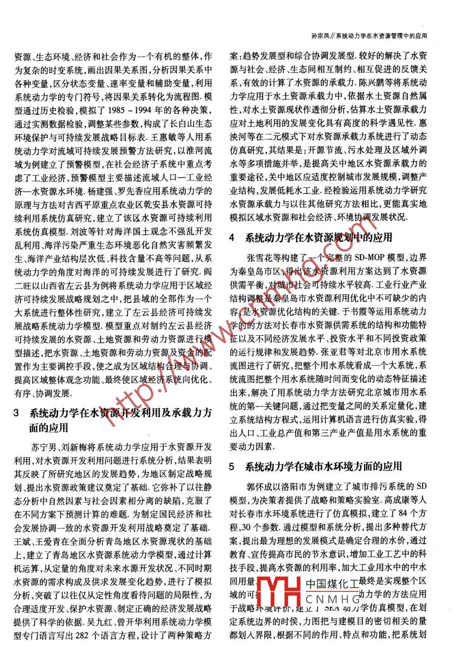 水利水電技術(shù)第36卷2005年第6期系統(tǒng)動(dòng)力學(xué)在水資源管理中的應(yīng)用孫宗鳳(河海大學(xué)水資源環(huán)境學(xué)院,江蘇南京210098)【摘要】系統(tǒng)動(dòng)力學(xué)是以反饋控制理論為基礎(chǔ),以仿真技術(shù)為手段,研究復(fù)雜社會(huì)經(jīng)濟(jì)系統(tǒng)的定量方法,目前已廣泛地應(yīng)用于可持續(xù)發(fā)展研究、水資源開發(fā)利用及承載力方面、水資源規(guī)劃、城市水環(huán)境和環(huán)境經(jīng)濟(jì)中等方面的研究.文中在對(duì)系統(tǒng)動(dòng)力學(xué)應(yīng)用有關(guān)文獻(xiàn)閱讀的基礎(chǔ)之上,對(duì)系統(tǒng)動(dòng)力學(xué)應(yīng)用的領(lǐng)域和方法進(jìn)行了分類、歸納和整理,為系統(tǒng)動(dòng)力學(xué)的進(jìn)一步應(yīng)用提供信息【關(guān)鍵詞】系統(tǒng)動(dòng)力學(xué);應(yīng)用;啟中圖分類號(hào):TV21文獻(xiàn)標(biāo)識(shí)碼:A文章編號(hào):1000860(2005)06-0014-04Application of System Dynamics to water resources managementSun Zong-fengCollege of Water Resources and Environment, Hohai University, Nanjing 210098, Jiangsu, ChinaAbstract: System Dynamics(SD), based on the theory of feedback control, is a quantitative method to study the coreconomic system by means of emulation technology. SD method has a broad application field including sustainable development, utilization and development of water resources, water resources planning, city water enmethods and applications of SD are classified and summarized herein, and then theive of the sd method is made as wellKey words: System Dynamics; application; revelation引言市動(dòng)力學(xué)模型的仿真時(shí)間均在100年;系統(tǒng)動(dòng)力學(xué)在數(shù)據(jù)缺少的條件下仍可以進(jìn)行研究,數(shù)據(jù)不足及某些系統(tǒng)動(dòng)力學(xué)( System Dynamics,簡稱SD)是由美國參量難以量化時(shí),SD模型以反饋環(huán)為基礎(chǔ)依然可以做麻省理工學(xué)院的福瑞斯特教授于1956年創(chuàng)立的它是一些研究;SD模型還擅長處理高階次、非線性、時(shí)變的以反饋控制理論為基礎(chǔ),以仿真技術(shù)為手段的研究復(fù)復(fù)雜問題雜社會(huì)經(jīng)濟(jì)系統(tǒng)的定量方法,專門分析研究復(fù)雜系統(tǒng)問題的科學(xué)系統(tǒng)動(dòng)力學(xué)利用系統(tǒng)流圖表示系統(tǒng)內(nèi)部2系統(tǒng)動(dòng)力學(xué)對(duì)可持續(xù)發(fā)展的研究各種流,其仿真模型用 DYNAMO語言編程系統(tǒng)動(dòng)力陳成鮮、嚴(yán)廣樂對(duì)我國水資源可持續(xù)發(fā)展進(jìn)行了學(xué)建模本著目的就簡、用戶有效的原則,采取定性與定系統(tǒng)動(dòng)力學(xué)模型研究,它從描述1987-1997年這一時(shí)量相結(jié)合的系統(tǒng)分析和綜合推理的方法建模有以下域內(nèi)的復(fù)雜系統(tǒng)行為借助計(jì)算機(jī)對(duì)11年內(nèi)全國水資幾個(gè)步驟:系統(tǒng)辯識(shí)與問題的分析、系統(tǒng)的結(jié)構(gòu)分析、源可持續(xù)發(fā)展進(jìn)行定性和定量情形的仿真,并預(yù)測了建立規(guī)范的數(shù)學(xué)模型,模型模擬與政策分析、模型的檢2010年的水資源情況.肖廣嶺結(jié)合10多年從事系統(tǒng)驗(yàn)與評(píng)估.系統(tǒng)動(dòng)力學(xué)擅長處理周期性問題,西方經(jīng)濟(jì)動(dòng)力學(xué)研究經(jīng)驗(yàn)和體會(huì)對(duì)長白山生態(tài)環(huán)境保護(hù)與可持出現(xiàn)各種周期性的波動(dòng)4年左右的短周期,15年的中續(xù)發(fā)屬泄亻了項(xiàng)實(shí)把≠白山地區(qū)的人口、自然周期,40~80年左右的長周期,已有不少的SD模型對(duì)上述各種周期形成的機(jī)制作出解釋;SD模型是一種因CNMHG收稿日期果杋理性模型,它強(qiáng)調(diào)系統(tǒng)行為主要是由系統(tǒng)內(nèi)部的作者簡介:孫宗風(fēng)(1963-),女,博士研究生,江蘇省連云港市水利機(jī)制決定的,因此它的系統(tǒng)仿真時(shí)間可以比較長,如城局副局長14Water Resoures and Hydropower Engineering Vol 36 No 6孫宗風(fēng)∥統(tǒng)動(dòng)力學(xué)在水資源管理中的應(yīng)用資源、生態(tài)環(huán)境、經(jīng)濟(jì)和社會(huì)作為一個(gè)有機(jī)的整體,作案:趨勢發(fā)展型和綜合協(xié)調(diào)發(fā)展型較好的解決了水資為復(fù)雜的時(shí)變系統(tǒng),畫出因果關(guān)系圖,分析因果關(guān)系中源與社會(huì)、經(jīng)濟(jì)、生態(tài)間相互制約相互促進(jìn)的反饋關(guān)各種變量,區(qū)分狀態(tài)變量速率變量和輔助變量,利用系,有效的計(jì)算了水資源的承載力陳興鵬等將系統(tǒng)動(dòng)系統(tǒng)動(dòng)力學(xué)的專門符號(hào),將因果關(guān)系轉(zhuǎn)化為流程圖模力學(xué)應(yīng)用于水土資源承載力中,依據(jù)水土資源自然屬型通過歷史檢驗(yàn)?zāi)M了1985-1994年的各種決策,性對(duì)水土資源現(xiàn)狀作透徹分析,估算水土資源承載力通過實(shí)測數(shù)據(jù)檢驗(yàn)調(diào)整某些參數(shù)構(gòu)成了長白山生態(tài)應(yīng)對(duì)土地利用的發(fā)展變化具有高度的科學(xué)遇見性惠環(huán)境保護(hù)與可持續(xù)發(fā)展戰(zhàn)略目標(biāo)表.王惠敏等人用系泱河等在二元模式下對(duì)水資源承載力系統(tǒng)進(jìn)行了動(dòng)態(tài)統(tǒng)動(dòng)力學(xué)對(duì)流域可持續(xù)發(fā)展預(yù)警方法研究,以淮河流仿真研究,其結(jié)果是:開源