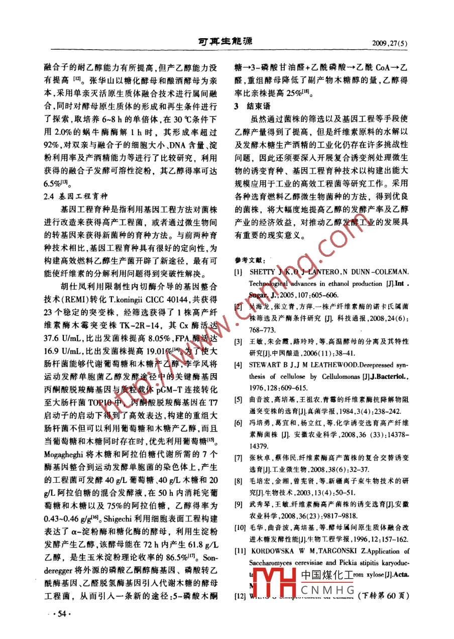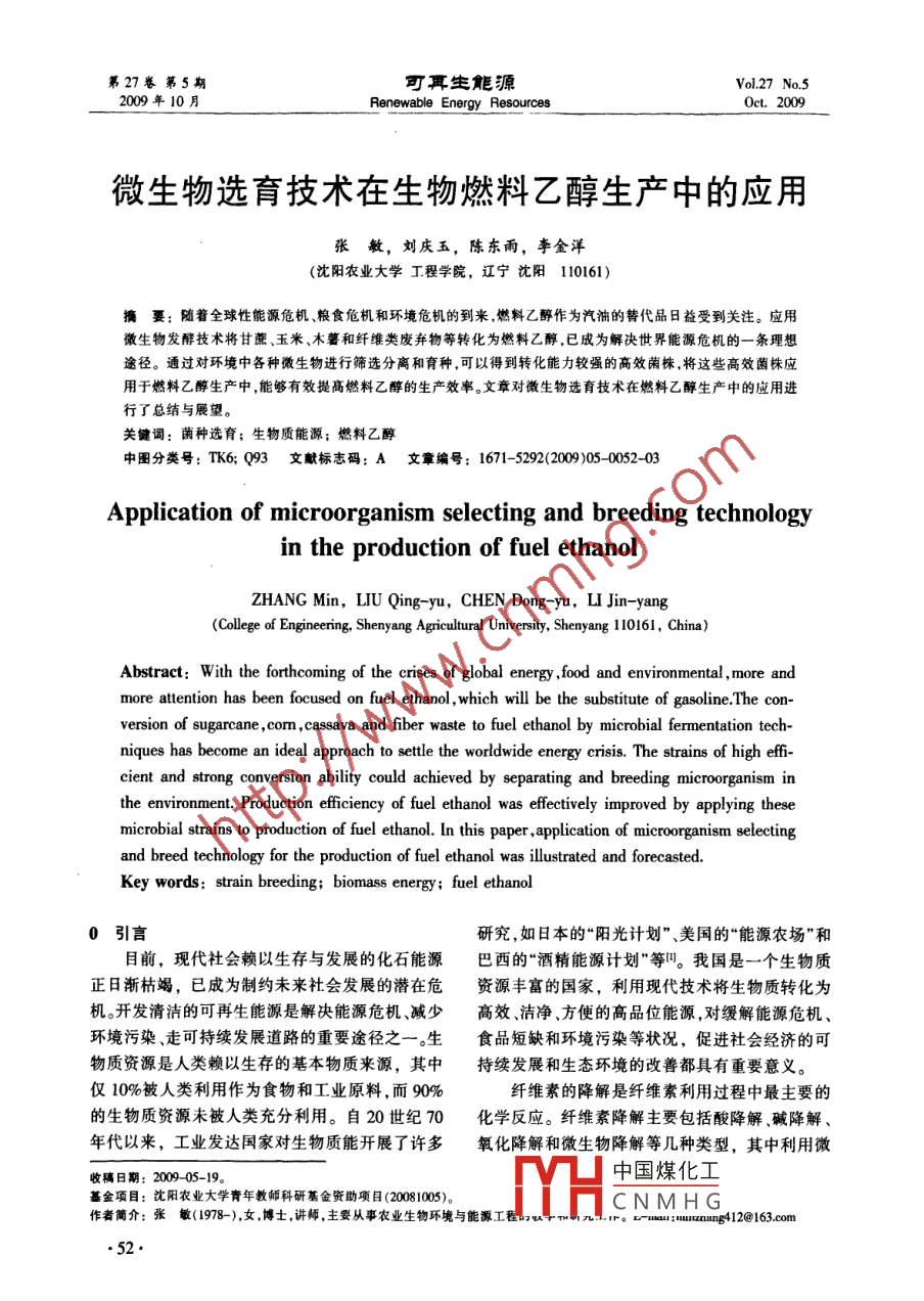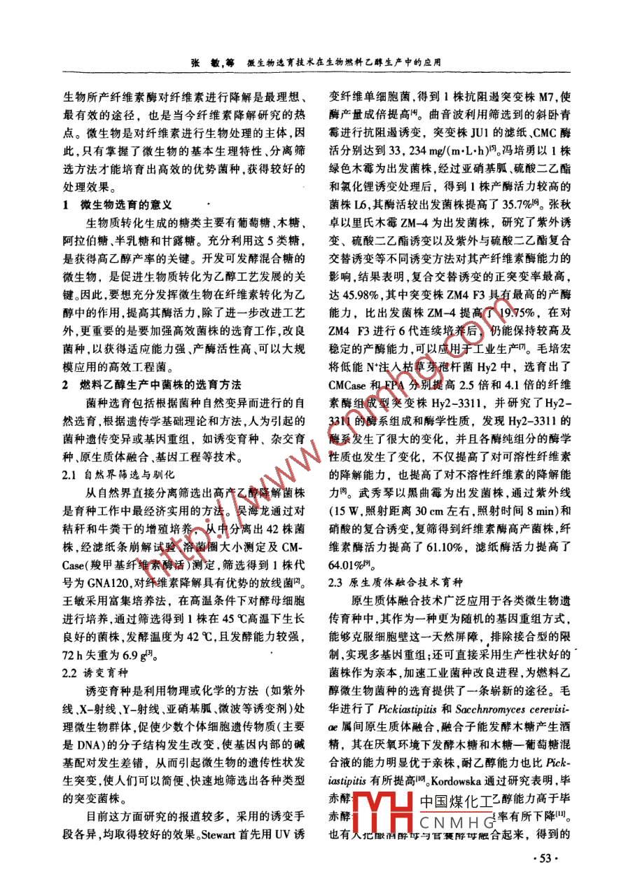 第27卷第5期可耳生能Vol 27 No 5009年10月renewable Energy Resources0ct.2009微生物選育技術(shù)在生物燃料乙醇生產(chǎn)中的應(yīng)用張敏,劉慶玉,陳東雨,李金洋(沈陽農(nóng)業(yè)大學(xué)丁程學(xué)院,遼寧沈陽110161)摘要:隨著全球性能源危機(jī)、糧食危機(jī)和環(huán)境危機(jī)的到來燃料乙醇作為汽油的替代品日益受到關(guān)注。應(yīng)用微生物發(fā)酵技術(shù)將甘蔗、玉米、木薯和纖維類廢棄物等轉(zhuǎn)化為燃料乙醇已成為解決世界能源危機(jī)的一條理想途徑。通過對環(huán)境中各種微生物進(jìn)行篩選分離和育種,可以得到轉(zhuǎn)化能力較強(qiáng)的高效菌株,將這些高效菌株應(yīng)用于燃料乙醇生產(chǎn)中,能夠有效提高燃料乙醇的生產(chǎn)效率。文章對微生物選育技術(shù)在燃料乙醇生產(chǎn)中的應(yīng)用進(jìn)行了總結(jié)與展望。關(guān)鍵詞:菌種選育;生物質(zhì)能源;燃料乙醇中圖分類號:TK6;Q93文獻(xiàn)標(biāo)志碼:A文章編號:1671-5292(2000050052-03Application of microorganism selecting and breeding technologyin the production of fuel ethanolZHANG Min, LIU Qing-yu, CHEN Dong-yu, LI Jin-yangCollege of Engineering, Shenyang Agricultural University, Shenyang 110161, China)Abstract: With the forthcoming of the crises of global energy, food and environmental, more andmore attention has been focused on fuel ethanol, which will be the substitute of gasoline. The con-version of sugarcane, com, cassava and fiber waste to fuel ethanol by microbial fermentation techniques has become an ideal approach to settle the worldwide energy crisis. the strains of high efficient and strong conversion ability could achieved by separating and breeding microorganism inthe environment. Production efficiency of fuel ethanol was effectively improved by applying theseand breed technology for the production of fuel ethanol was illustrated and forecasted selectingmicrobial strains to production of fuel ethanol. In this paper, application of microorganiKey words: strain breeding: biomass energy; fuel ethanol0引言研究,如日本的“陽光計劃”、美國的“能源農(nóng)場”和目前,現(xiàn)代社會賴以生存與發(fā)展的化石能源巴西的“酒精能源計劃”等。我國是一個生物質(zhì)正日漸枯竭,已成為制約未來社會發(fā)展的潛在危資源豐富的國家,利用現(xiàn)代技術(shù)將生物質(zhì)轉(zhuǎn)化為機(jī)。開發(fā)清潔的可再生能源是解決能源危機(jī)、減少高效潔凈方便的高品位能源,對緩解能源危機(jī)環(huán)境污染、走可持續(xù)發(fā)展道路的重要途徑之一。生食品短缺和環(huán)境污染等狀況,促進(jìn)社會經(jīng)濟(jì)的可物質(zhì)資源是人類賴以生存的基本物質(zhì)來源,其中持續(xù)發(fā)展和生態(tài)環(huán)境的改善都具有重要意義。僅10%被人類利用作為食物和工業(yè)原料,而90%纖維素的降解是纖維素利用過程中最主要的的生物質(zhì)資源未被人類充分利用。自20世紀(jì)70化學(xué)反應(yīng)。纖維素降解主要包括酸降解堿降解年代以來,工業(yè)發(fā)達(dá)國家對生物質(zhì)能開展了許多氧化降解和微生物降解等幾種類型,其中利用微收稿日期:200905-19中國煤化工基金項(xiàng)目:沈陽農(nóng)業(yè)大學(xué)青年教師科研基金資助項(xiàng)目(20081005)。CNMHG作者簡介:張敏(1978-),女博士,講師,主要從事農(nóng)業(yè)生物環(huán)境與能源ror-mau:uuunung412@163.com5敏,等微生物選育技術(shù)在生物然料乙醇生產(chǎn)中的應(yīng)用生物所產(chǎn)纖維素酶對纖維素進(jìn)行降解是最理想、變纖維單細(xì)胞菌,得到1株抗阻遏突變株M7,使最有效的途徑,也是當(dāng)今纖維素降解研究的熱酶產(chǎn)量成倍提高。曲音波利用篩選到的斜臥青點(diǎn)。微生物是對纖維素進(jìn)行生物處理的主體,因霉進(jìn)行抗阻遏誘變,突變株JU1的濾紙CMC酶此,只有掌握了微生物的基本生理特性、分離篩活分別達(dá)到33,234mg/(mLh門。馮培勇以1株選方法才能培育出髙效的優(yōu)勢菌種,獲得較好的綠色木霉為出發(fā)菌株,經(jīng)過亞硝基胍、硫酸二乙酯處理效果。和氯化鋰誘變處理后,得到1株產(chǎn)酶活力較高的1微生物選育的意義菌株L6,其酶活較出發(fā)菌株提高了35.7%。張秋生物質(zhì)轉(zhuǎn)化生成的糖類主要有葡萄糖、木糖、卓以里氏木霉ZM-4為出發(fā)菌株,研究了紫外誘阿拉伯糖、半乳糖和甘露糖。充分利用這5類糖,變、硫酸二乙酯誘變以及紫外與硫酸二乙酯復(fù)合是獲得高乙醇產(chǎn)率的關(guān)鍵。開發(fā)可發(fā)酵混合糖的交替誘變等不同誘變方法對其產(chǎn)纖維素酶能力的微生物,是促進(jìn)生物質(zhì)轉(zhuǎn)化為乙醇工藝發(fā)展的關(guān)影響,結(jié)果表明,復(fù)合交替誘變的正突變率最高,鍵。因此,要想充分發(fā)揮微生物在纖維素轉(zhuǎn)化為乙達(dá)45.98%,其中突變株ZM4F3具有最高的產(chǎn)酶醇中的作用,提高其酶活力,除了進(jìn)一步改進(jìn)工藝能力,比出發(fā)菌株ZM-4提高了1975%,在對外,更重要的是要加強(qiáng)高效菌株的選育工作,改良ZM4F3進(jìn)行6代連續(xù)培養(yǎng)后,仍能保持較髙及菌種,以獲得適應(yīng)能力強(qiáng)、產(chǎn)酶活性高、可以大規(guī)穩(wěn)定的產(chǎn)酶能力,可以應(yīng)用于工業(yè)生產(chǎn)。毛培宏模應(yīng)用的高效工程菌將低能N注入枯草芽孢桿菌Hy2中,選育出了2燃料乙醇生產(chǎn)中菌株的選育方法CMCase和FPA分別提高25倍和41倍的